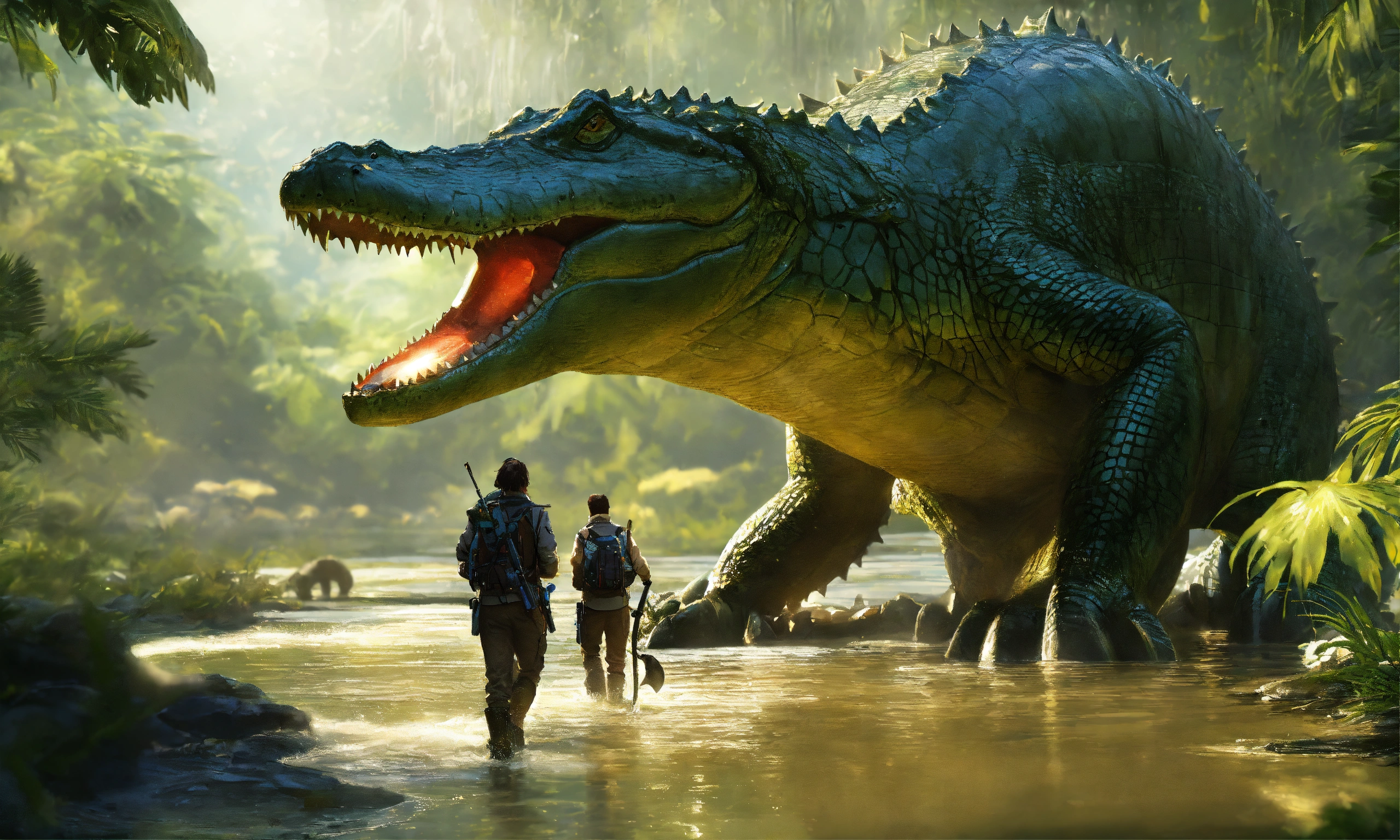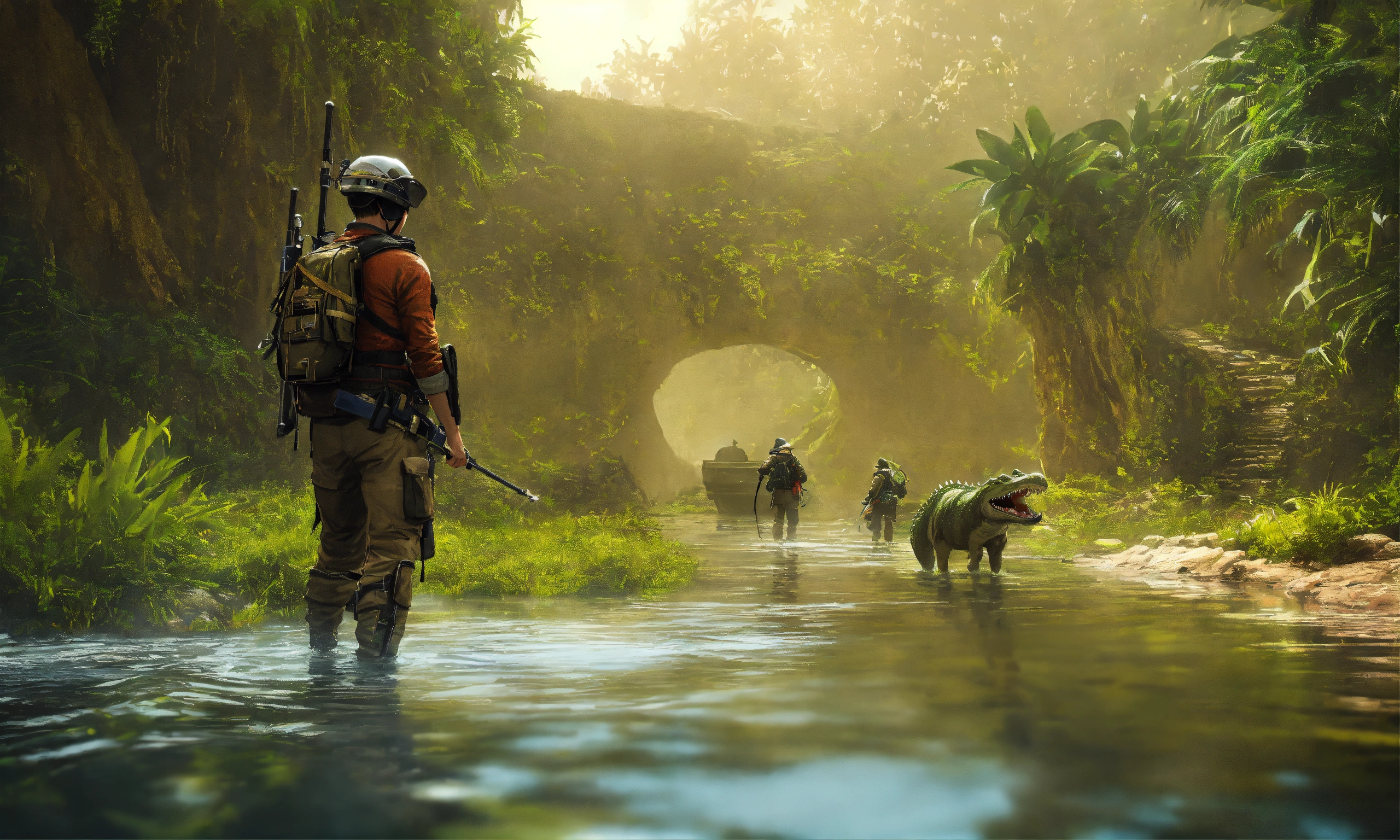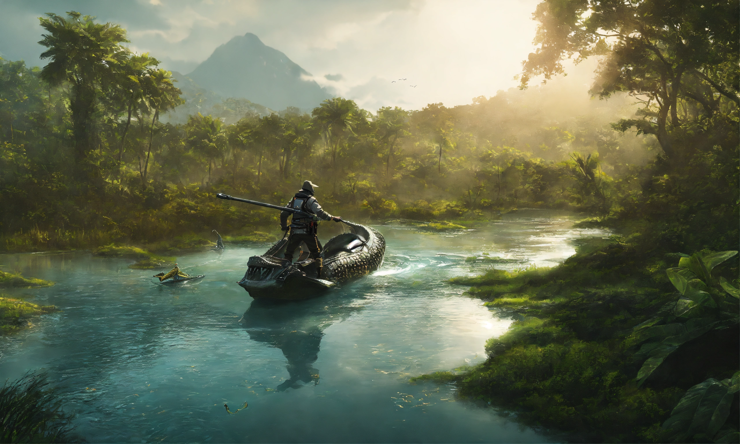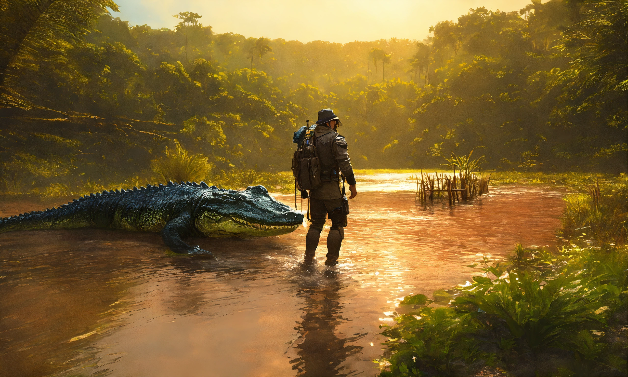 Mdjrny-v4 style, highly detailed image, 1 adventurer crossing a river, filled with alligators subtle futuristic elements