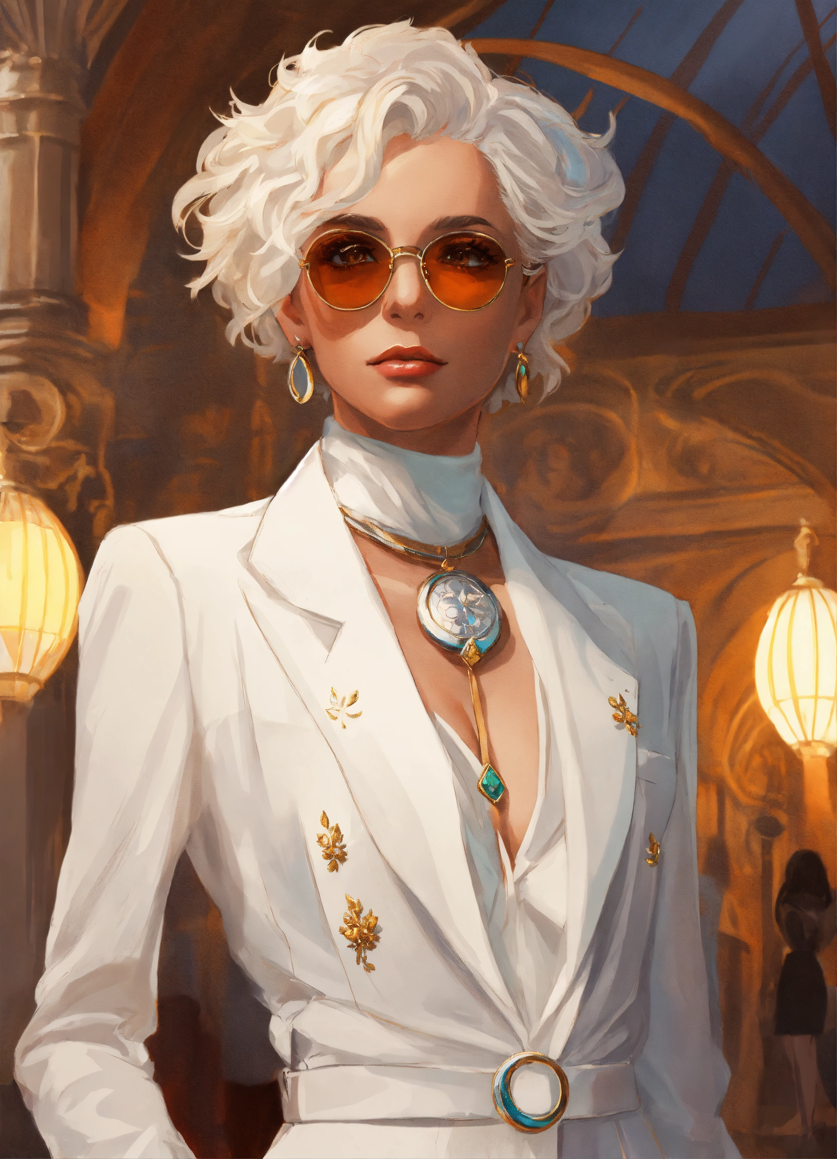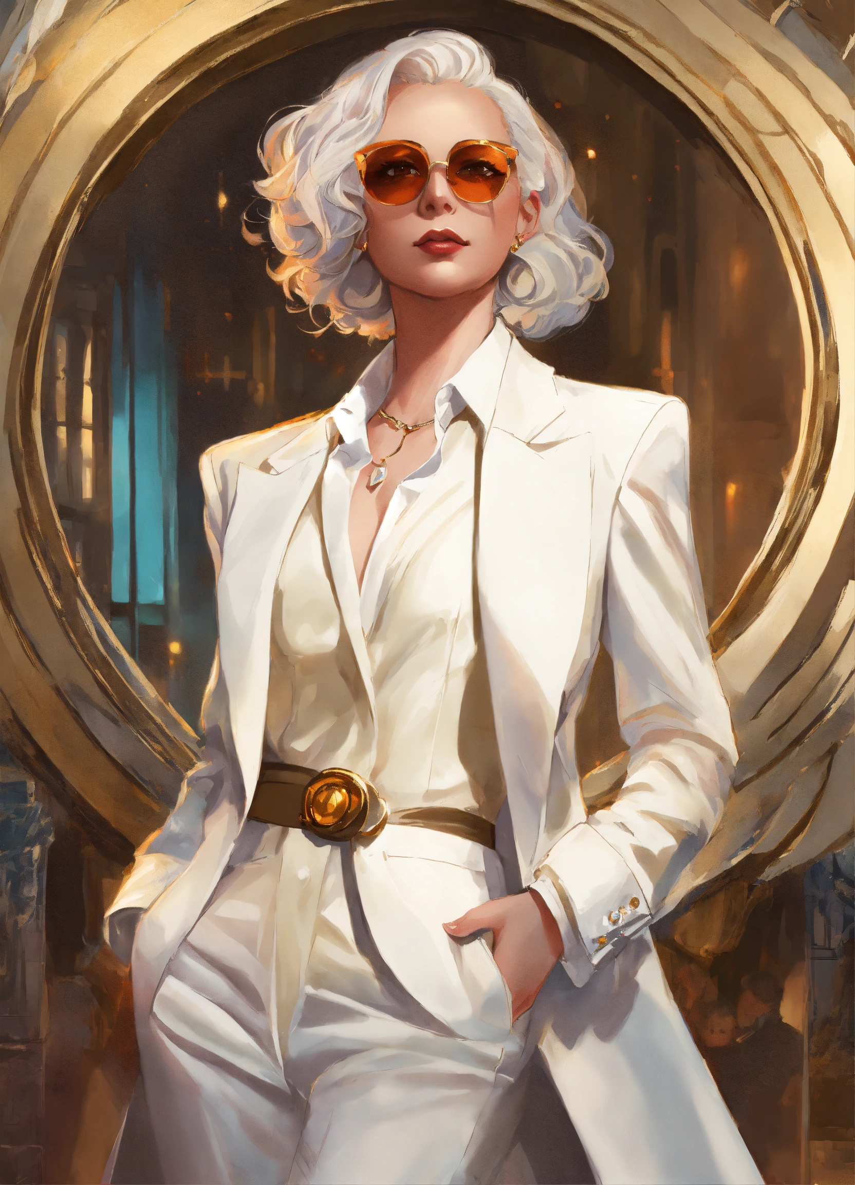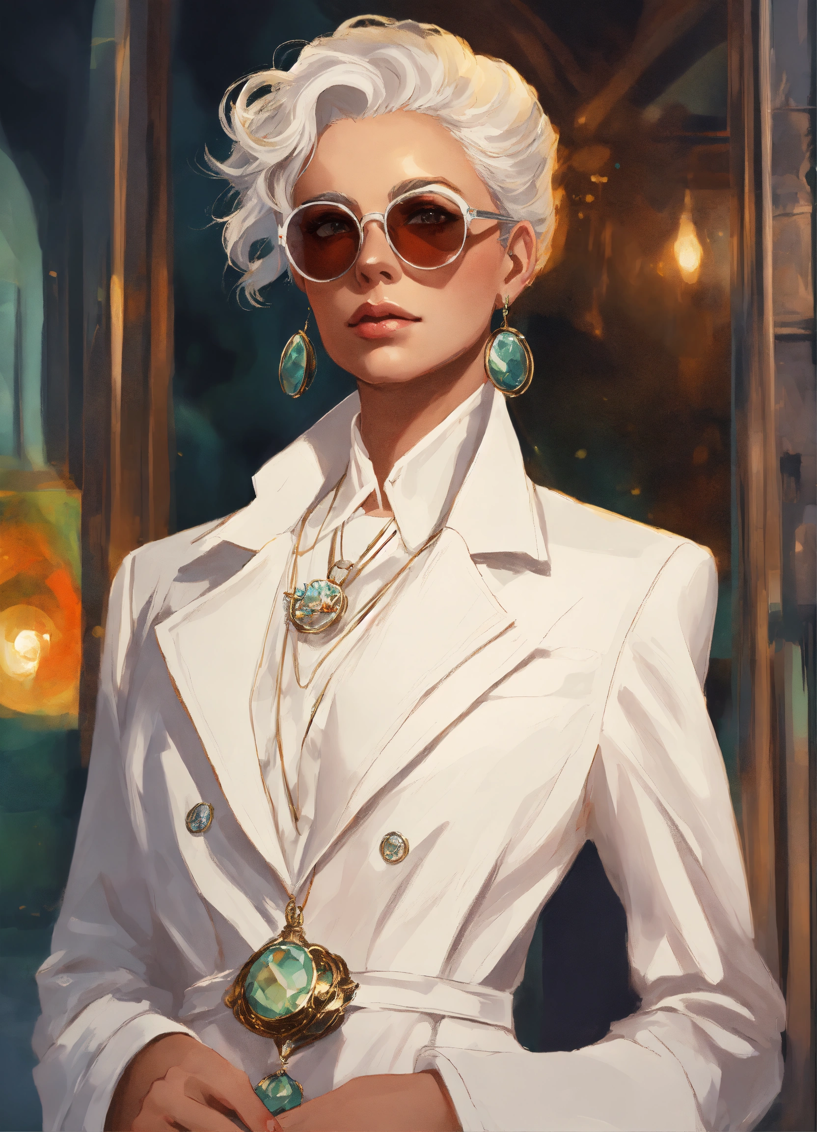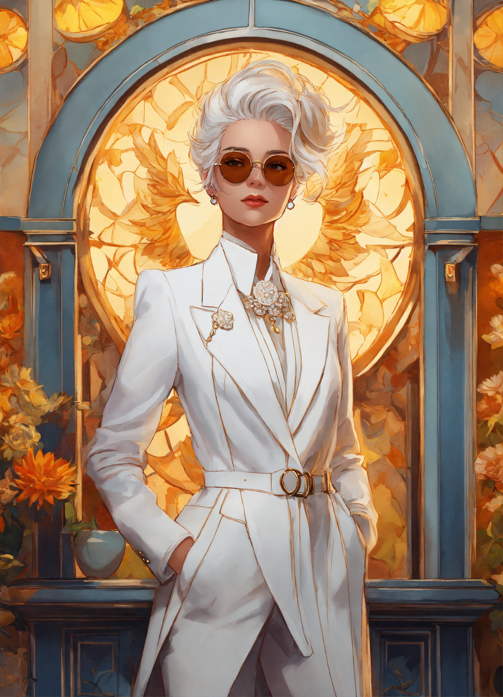 Good omens as woman, female aziraphale wearing white clothes suit, silver jewelry, character design, fashion illustration.