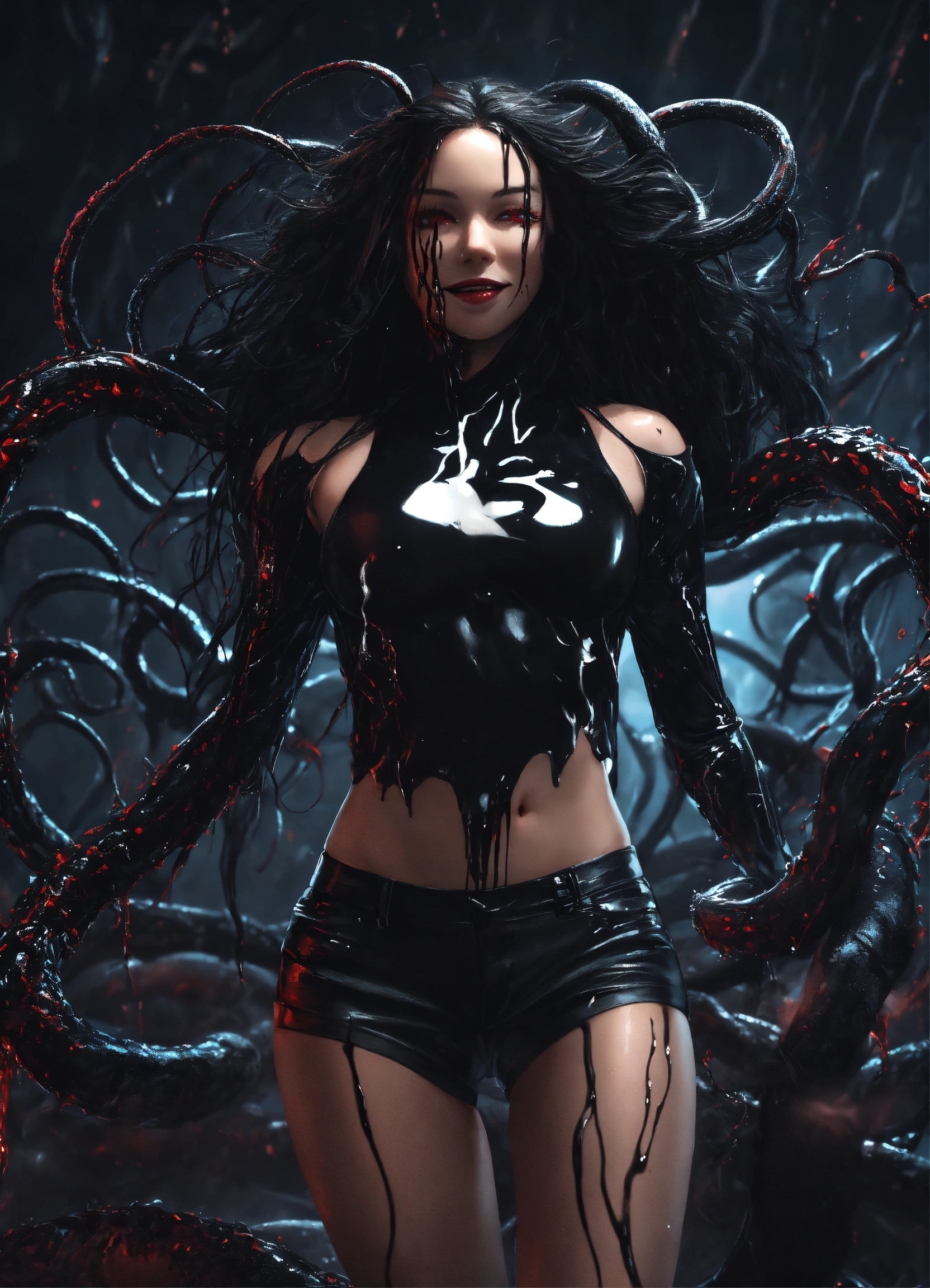 An ultrarealistic full body photo of woman in liquid short pants fighting venom symbiote, black venom symbiote tentacles, laying deep in dark black liquid, long hair, short liquid sports top, evil smile, evil glowing eyes, black drops skin, showing belly and thighs, hyper realistic, 8k