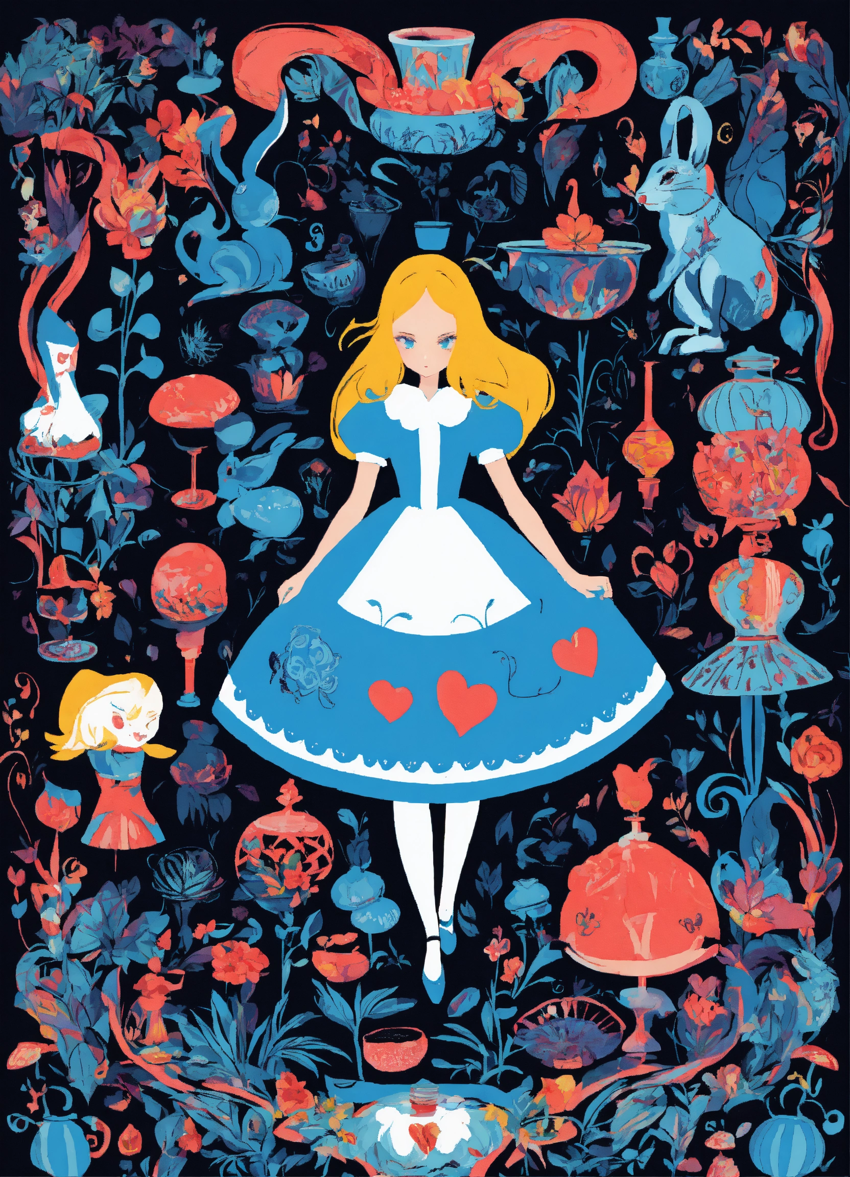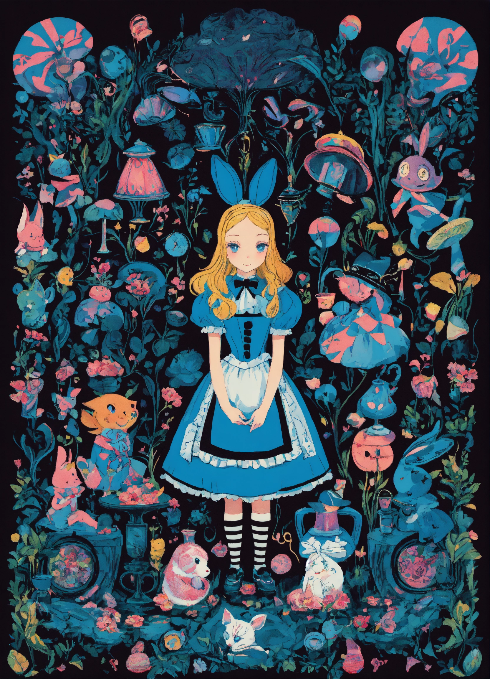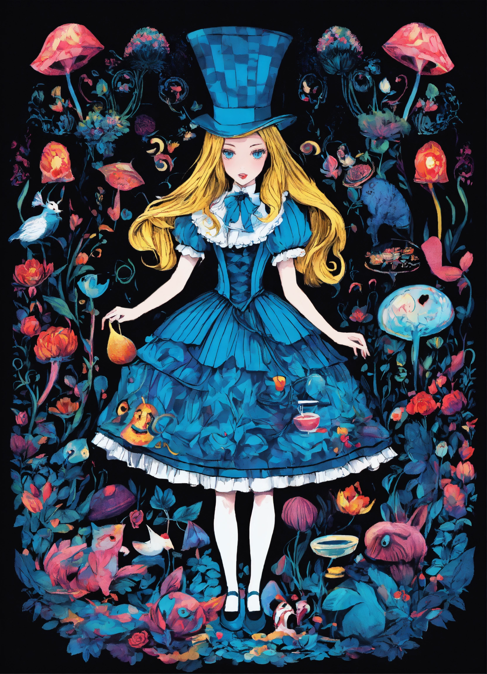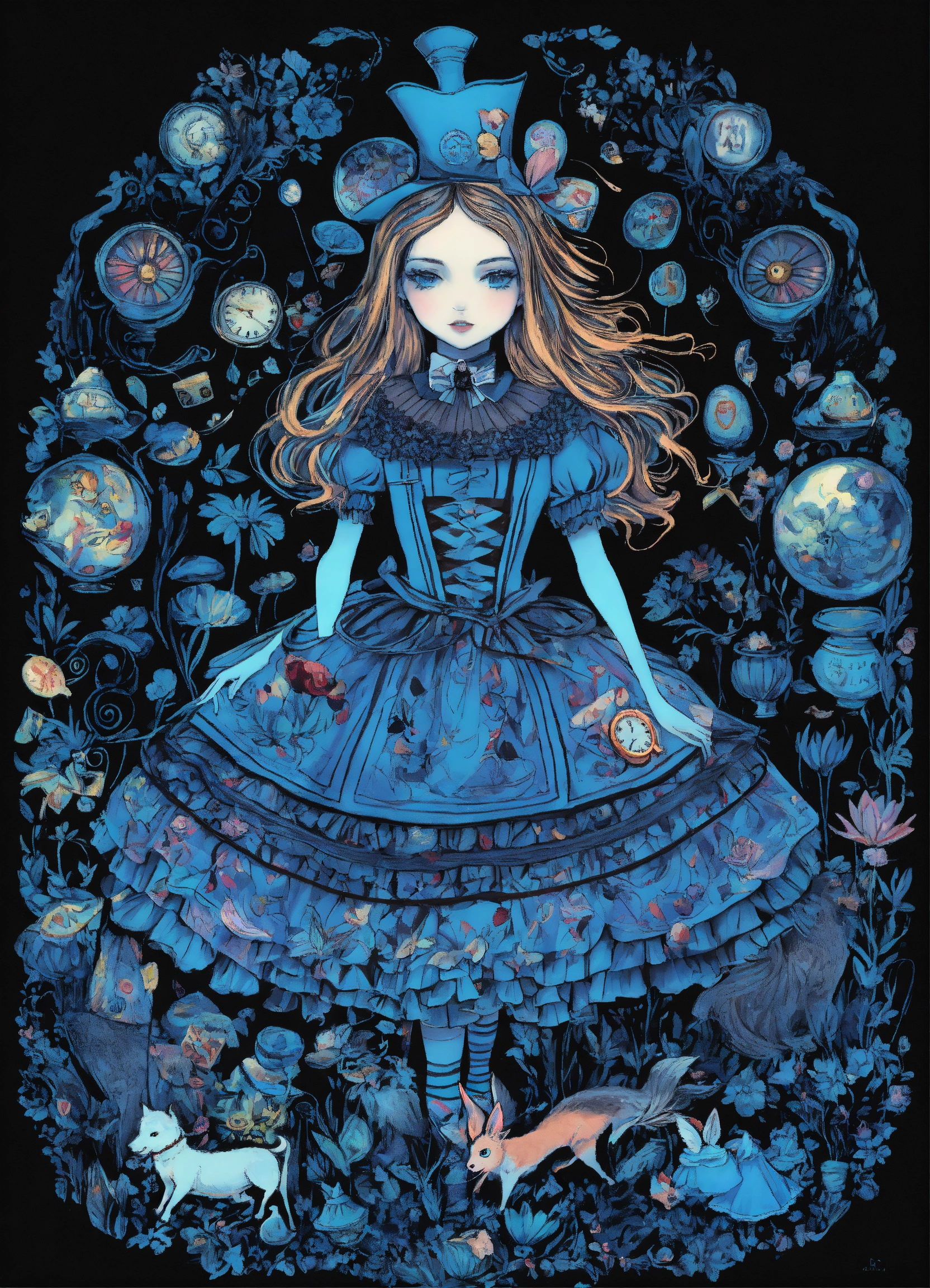 Trippy alice and wonderland characters black background dominant black and blue colors