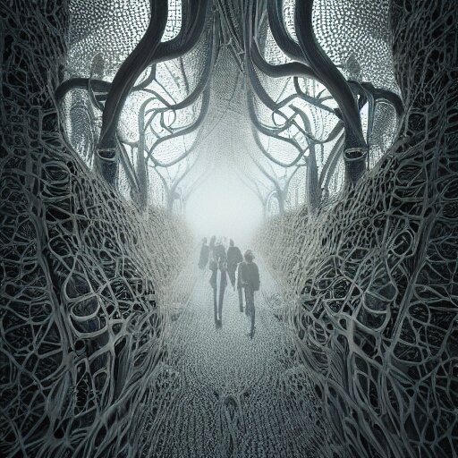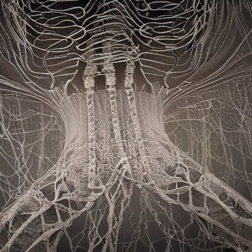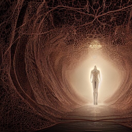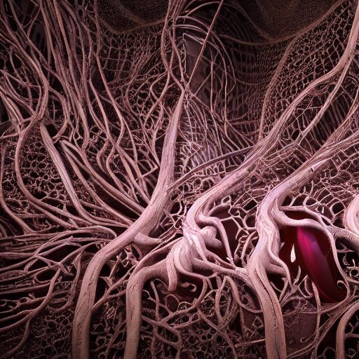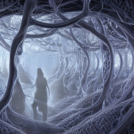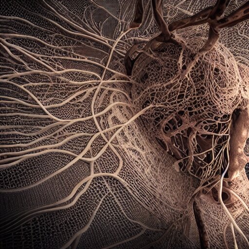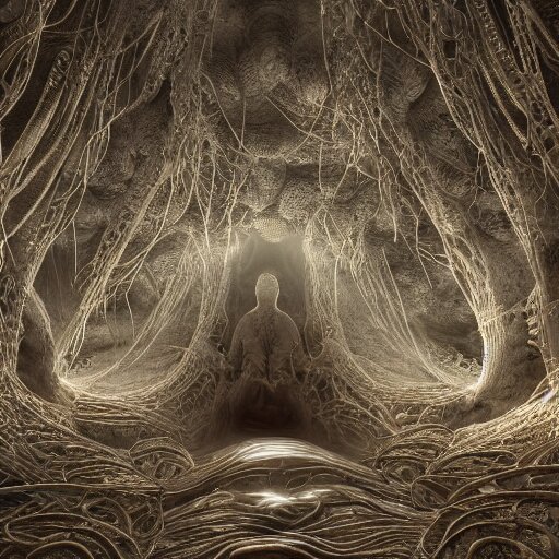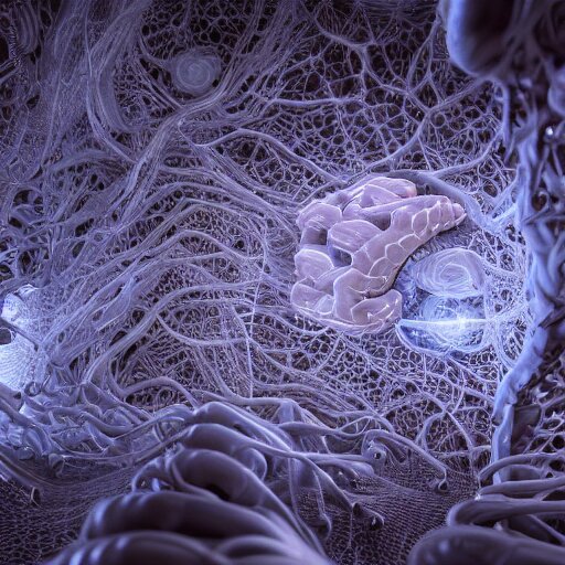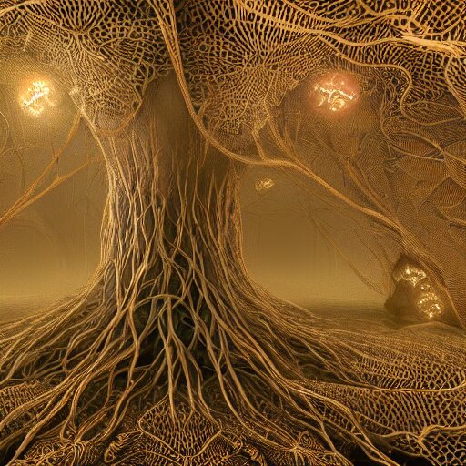 Biocomputer human organ inside a neural network made like antique lace in a biomechanical cave forest, intricate environment, matte painting, diffused lighting, highly detailed cinematic, atmosphere, diffused lighting, highly detailed digital art, trending on artstation, depth of field, wide angle