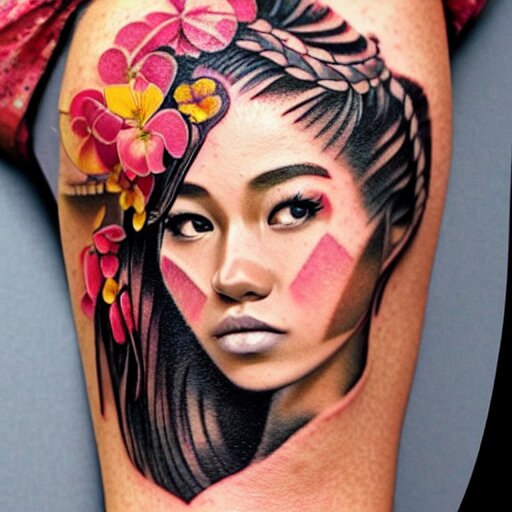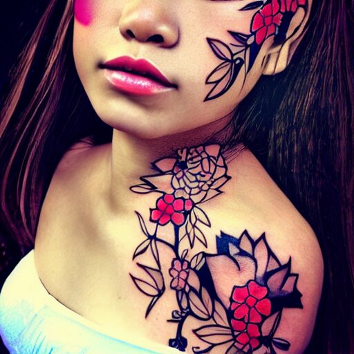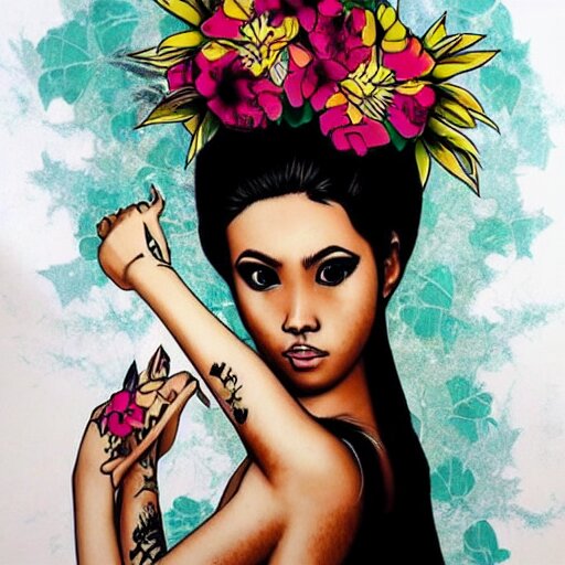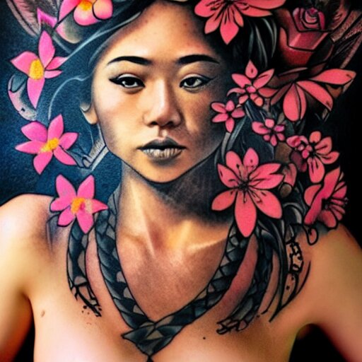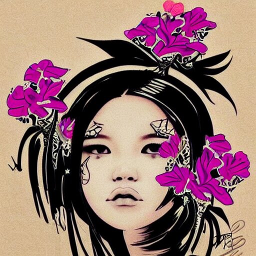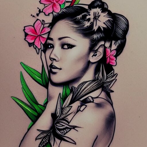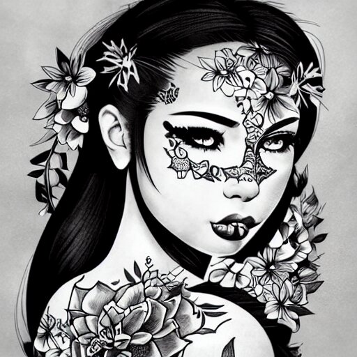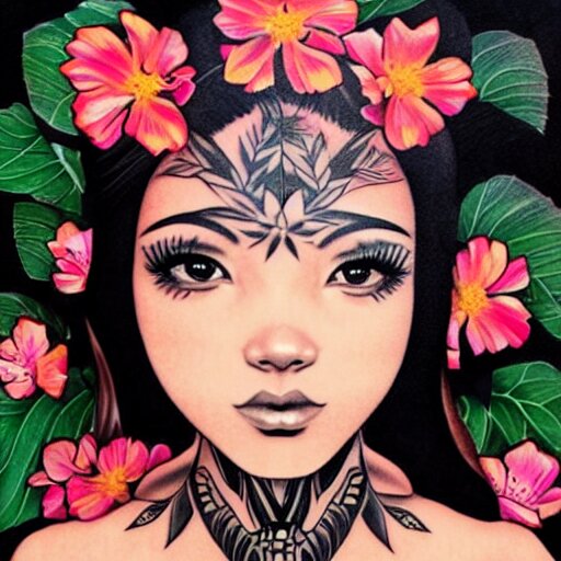 Tattoo design, stencil, photography, tattoo stencil, traditional, beautiful portrait of a traditional hawaiian girl with flowers in her hair, upper body, by artgerm, artgerm, artgerm, digital art, cat girl, anime eyes, anime, sexy, super model-s 100