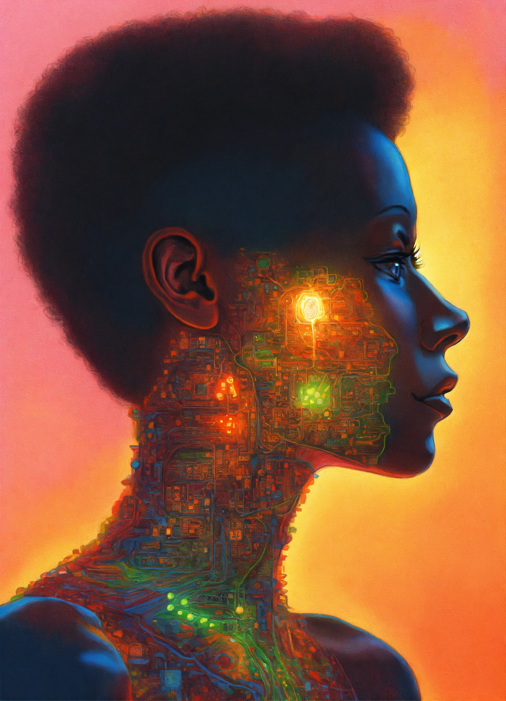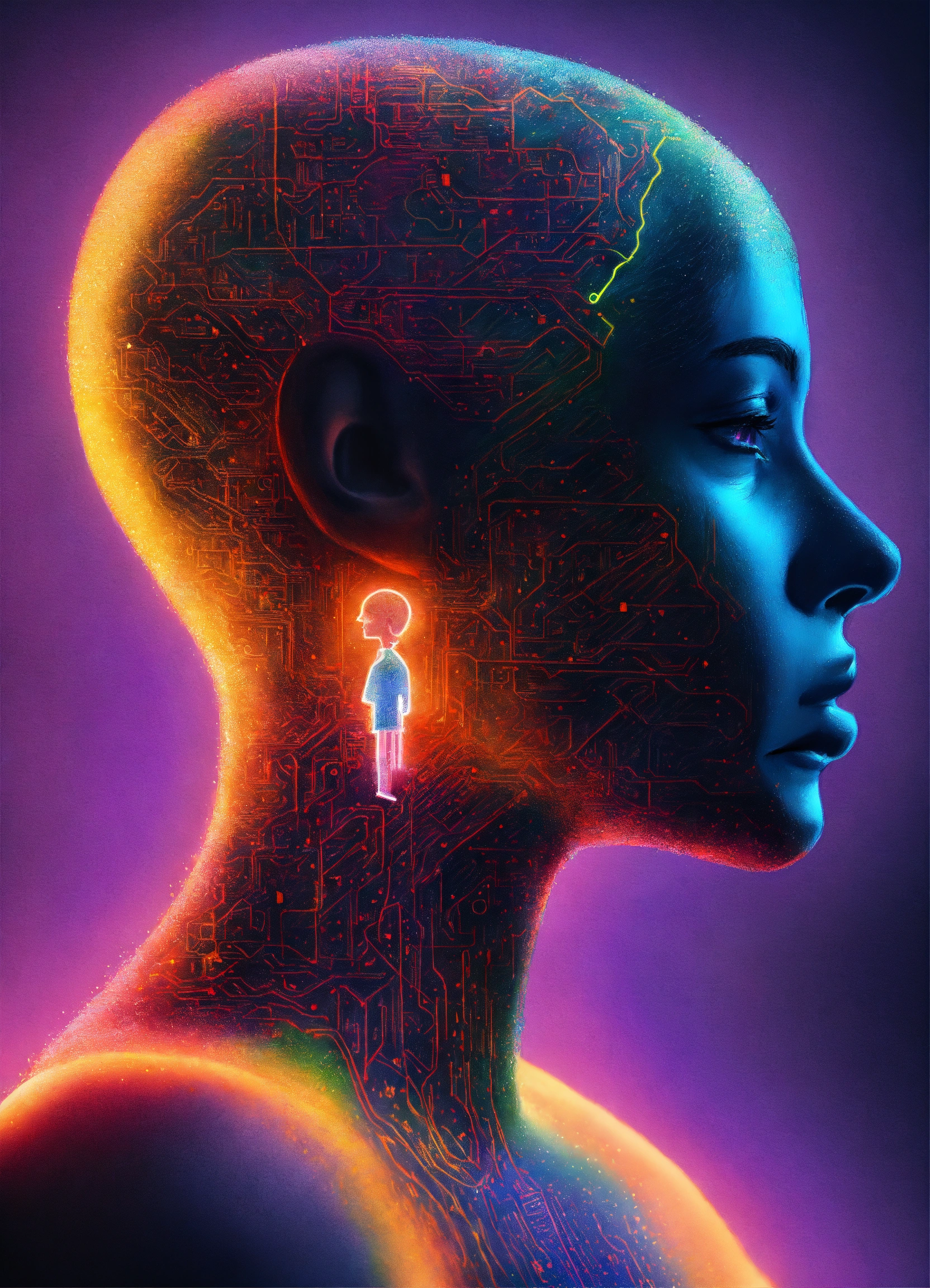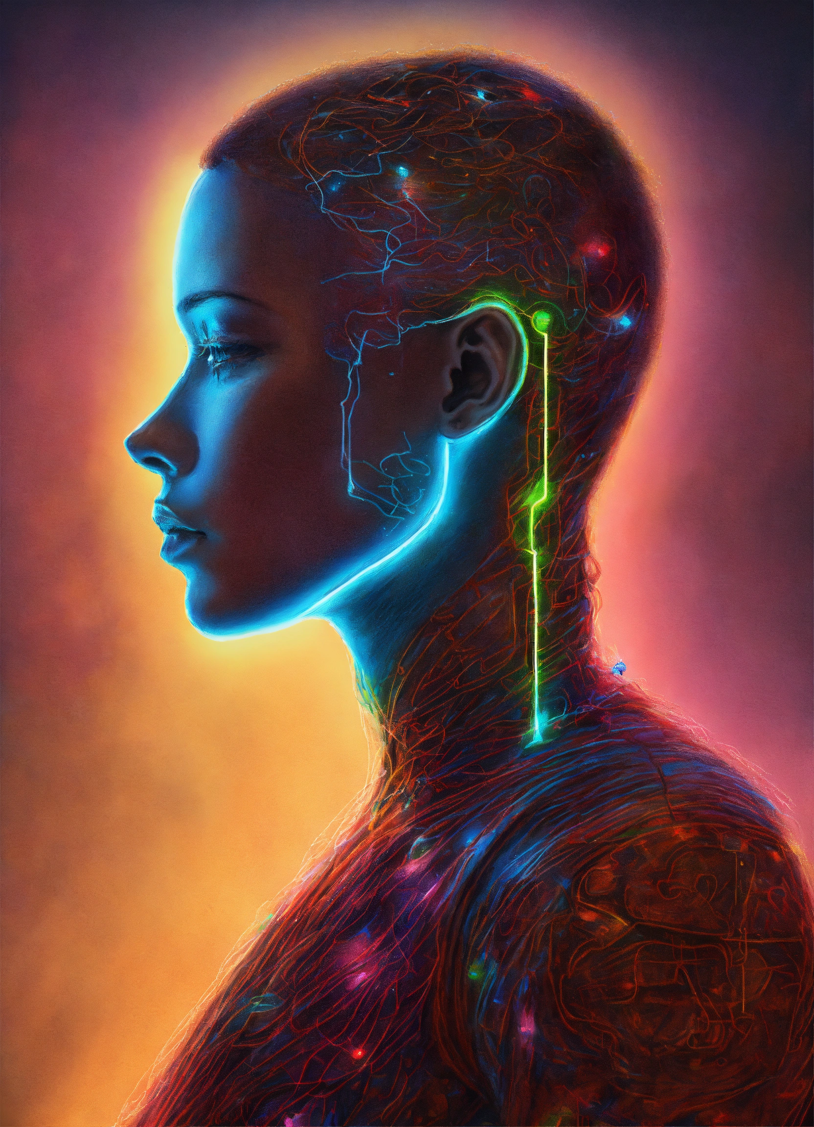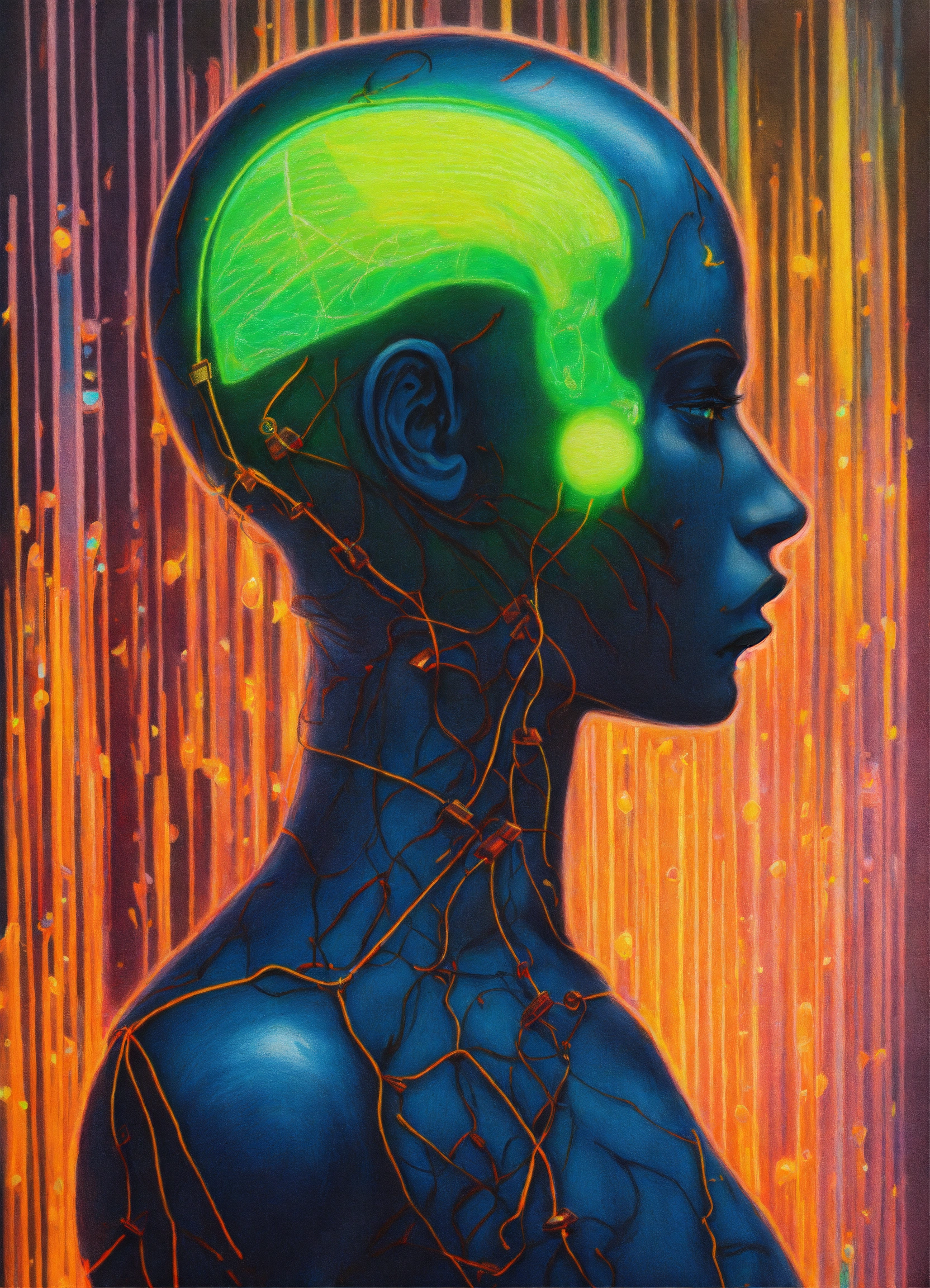 Colored pencil drawing of a human silhouette with one neon small chip attached to its neck, fantastic science fiction art