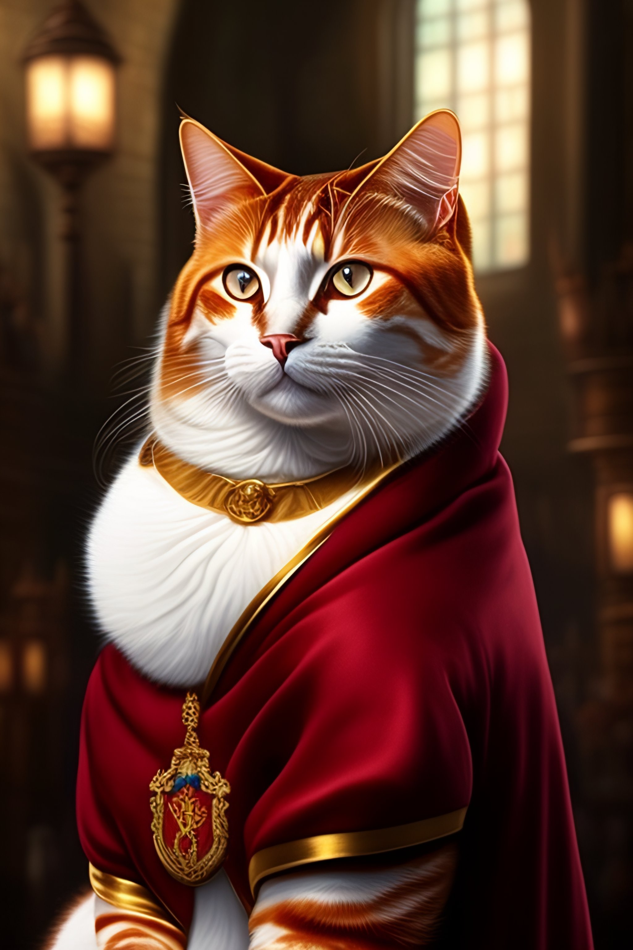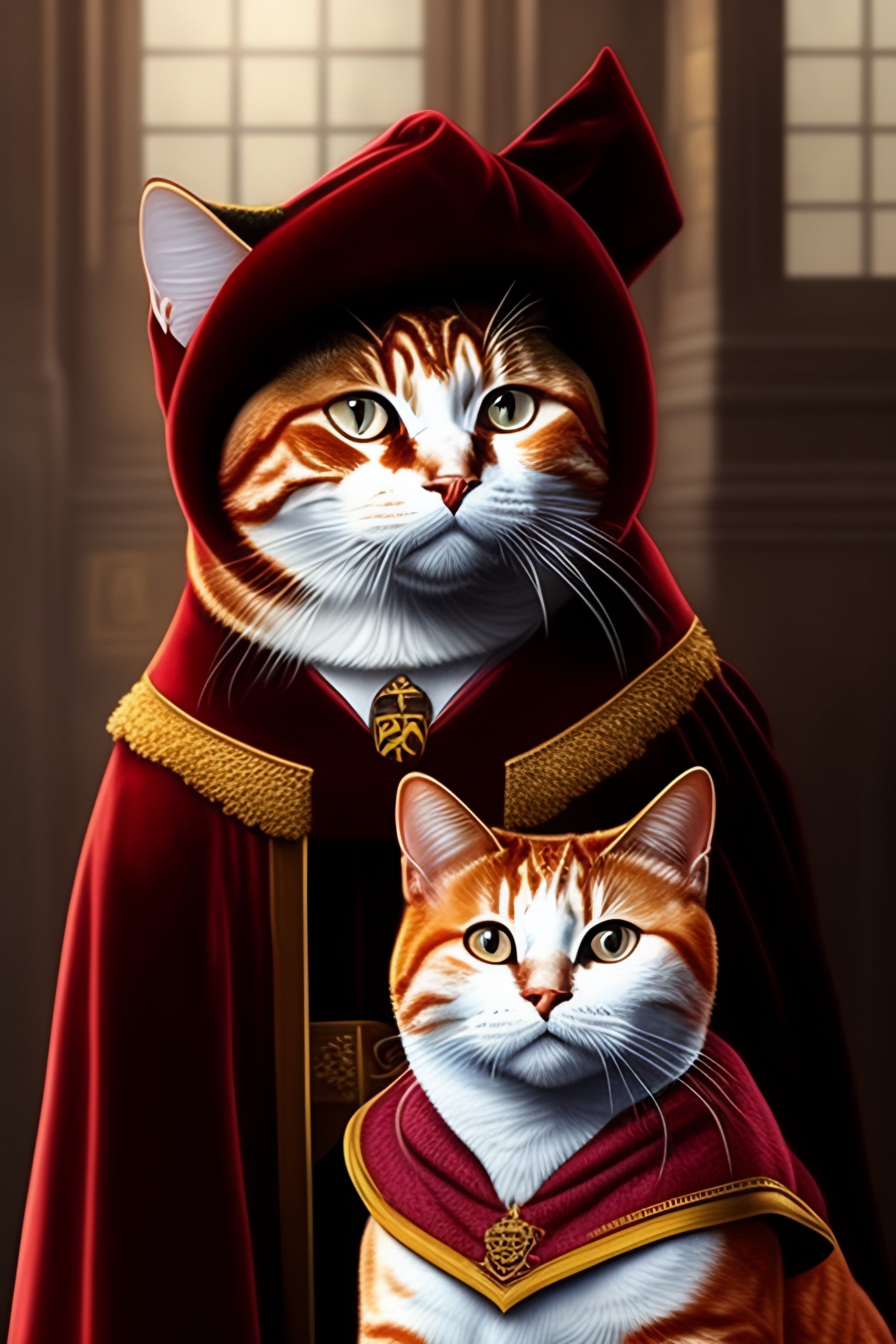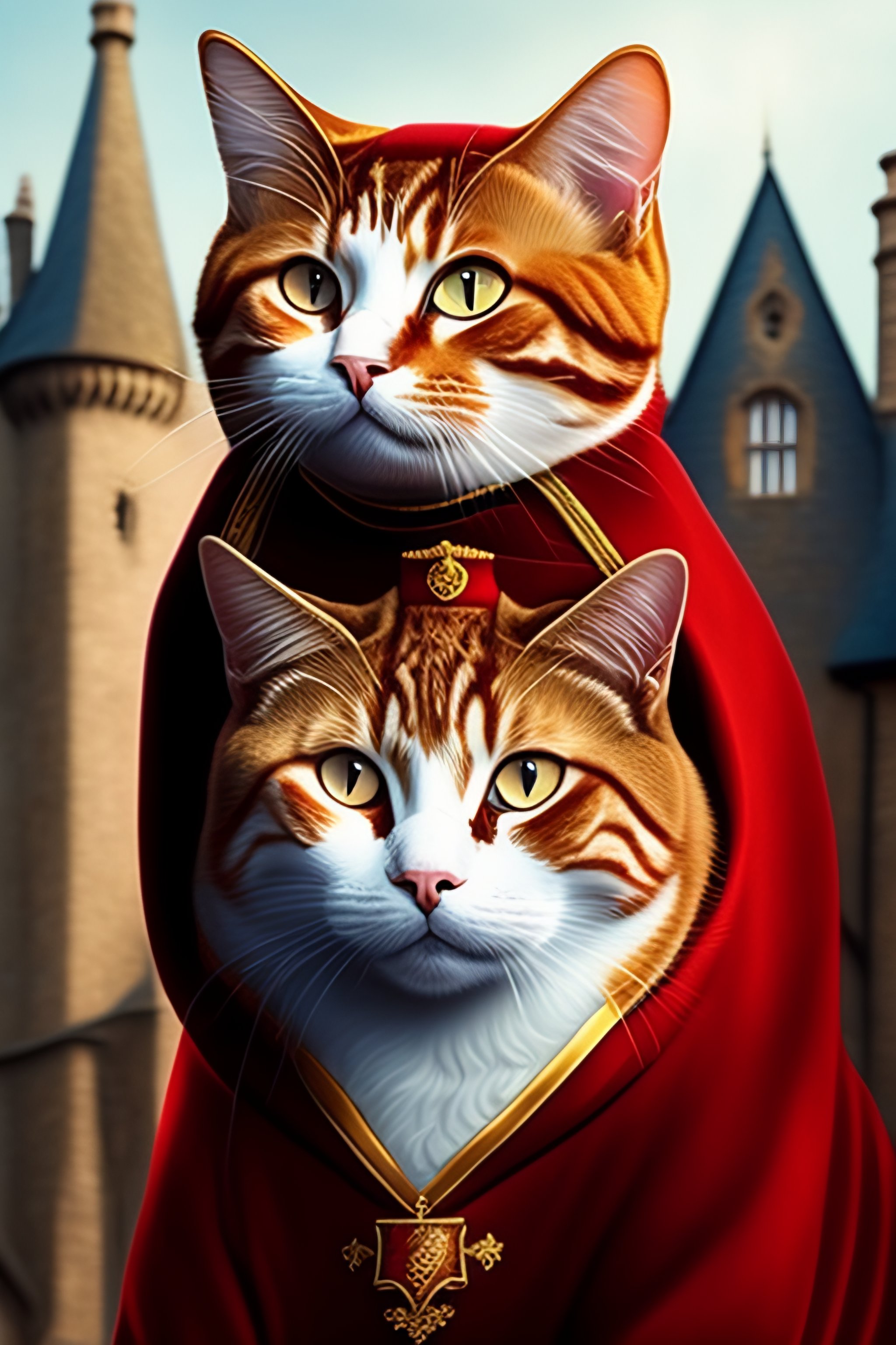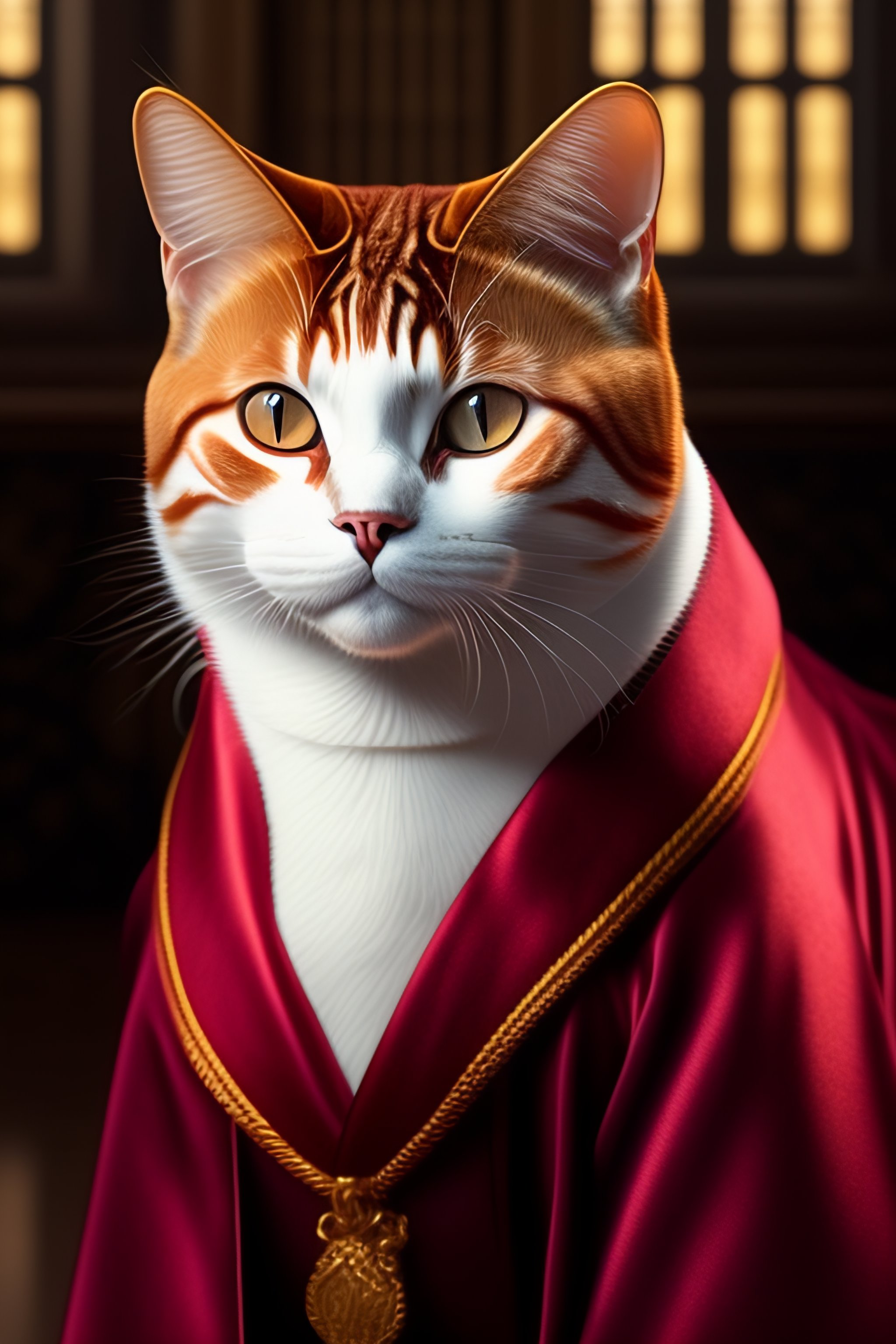 Sailor ginger cat with gryffindor robe and the cat is in hogwarts