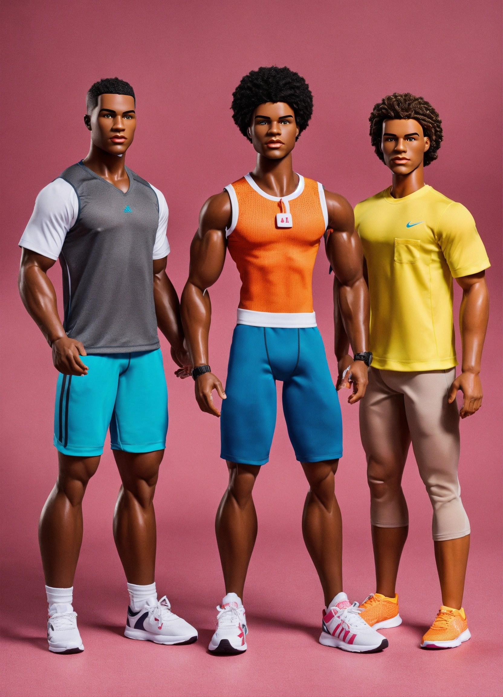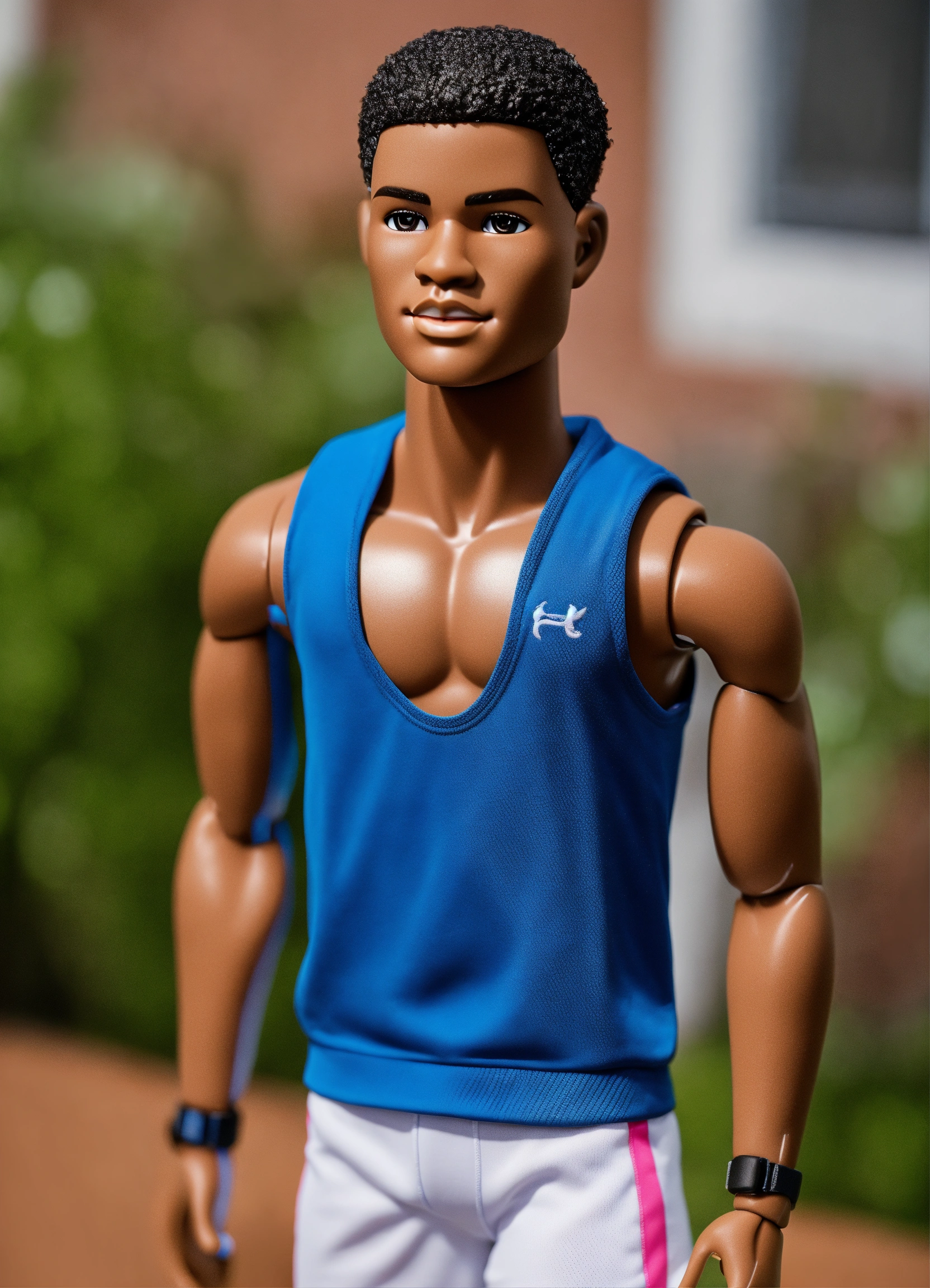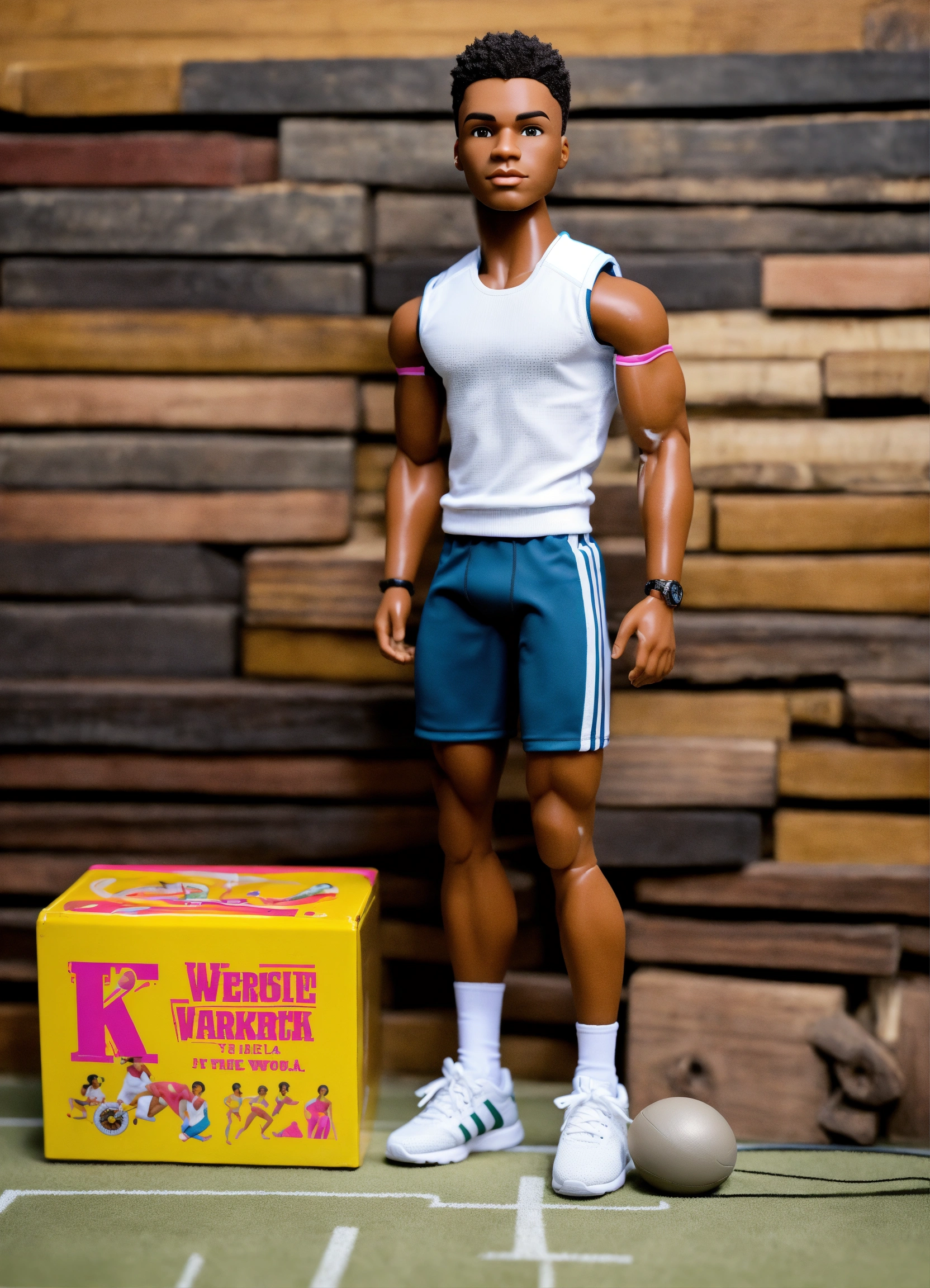 Design an athletic african american ken doll in workout clothes in a barbie box. the doll should have a lean build and be wearing a stylish and functional workout outfit. the outfit should include a sweat-wicking shirt, running shorts, modern sneakers, white crew socks, and any additional accessories that would enhance the doll's athletic appearance. please ensure that the doll's features and clothing accurately represent and celebrate the diversity and athleticism of african american individuals.