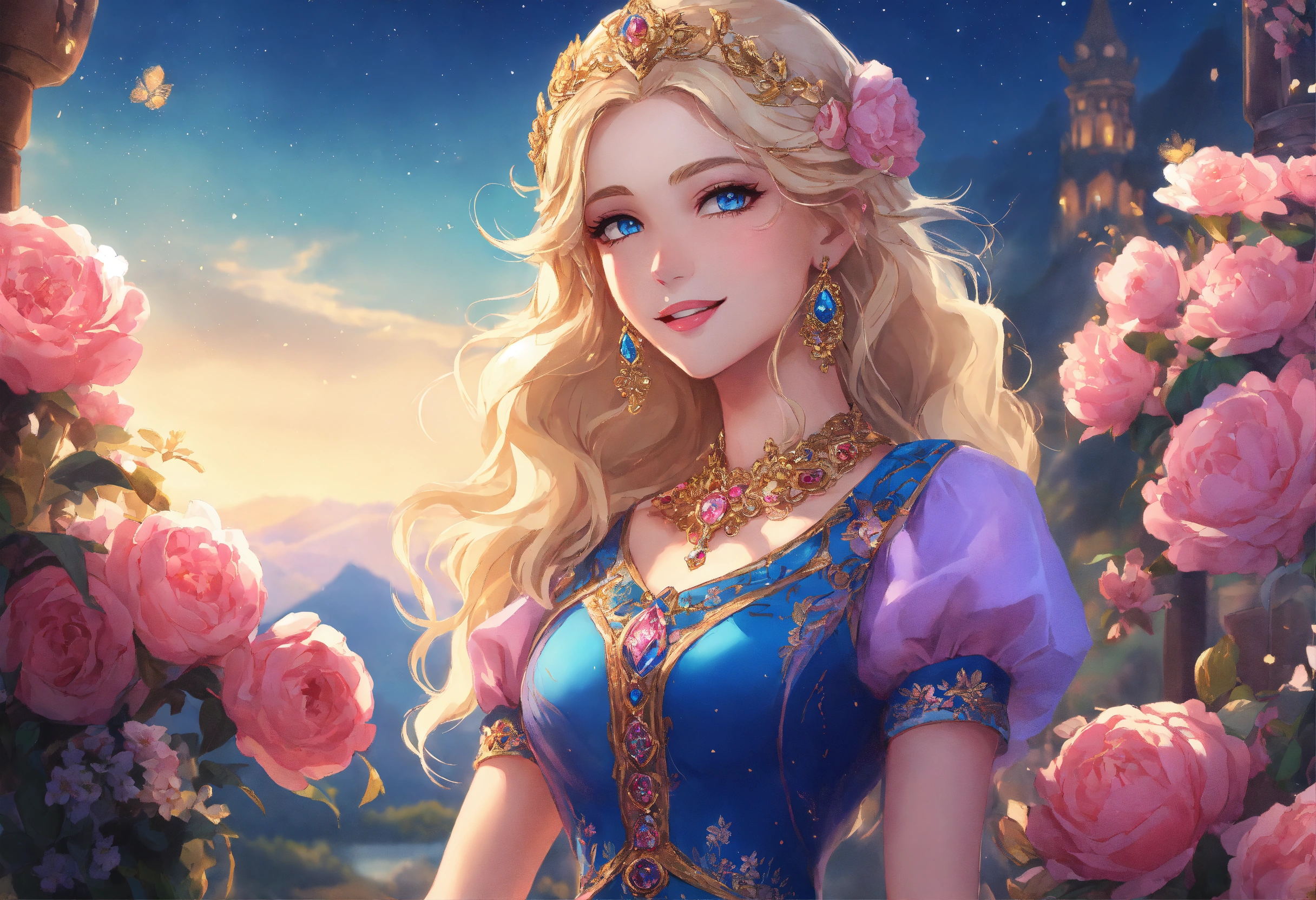 Sueden, russian, femme blonde yeux bleu, glamour, a detailed intricate pink and black dress, bleu, gold, pink, smiles, beautiful artwork, breath of the wild, 8k retro anime art, beautiful princess of the stars smiling blonde with blue eyes of the stars with rich color clothes and precious stones with gold fabrics and silks of soft colors, brocade, very sharp images 16k and environment of flowers, waterfalls and mountains