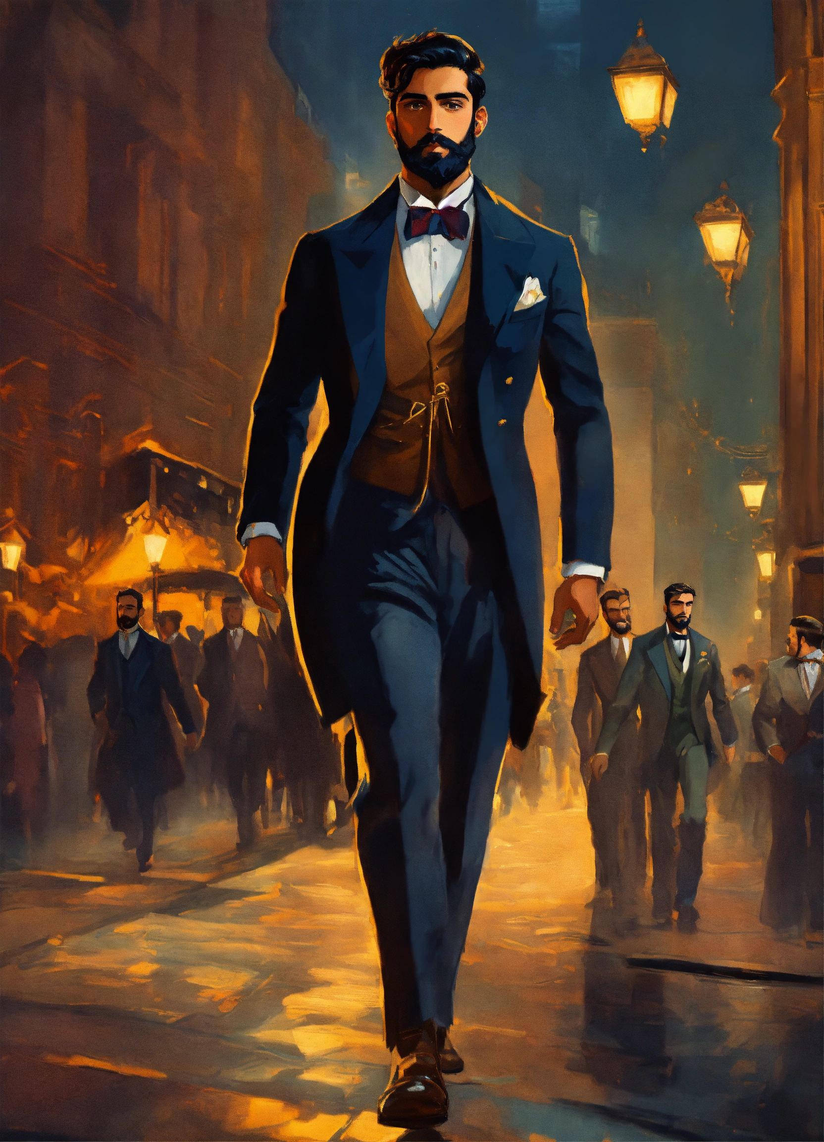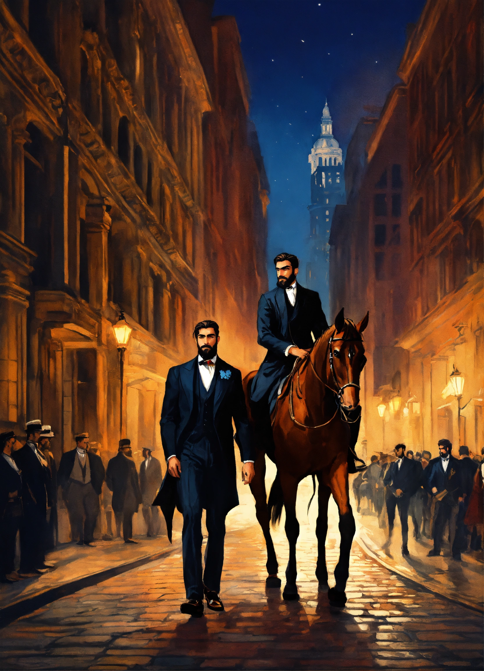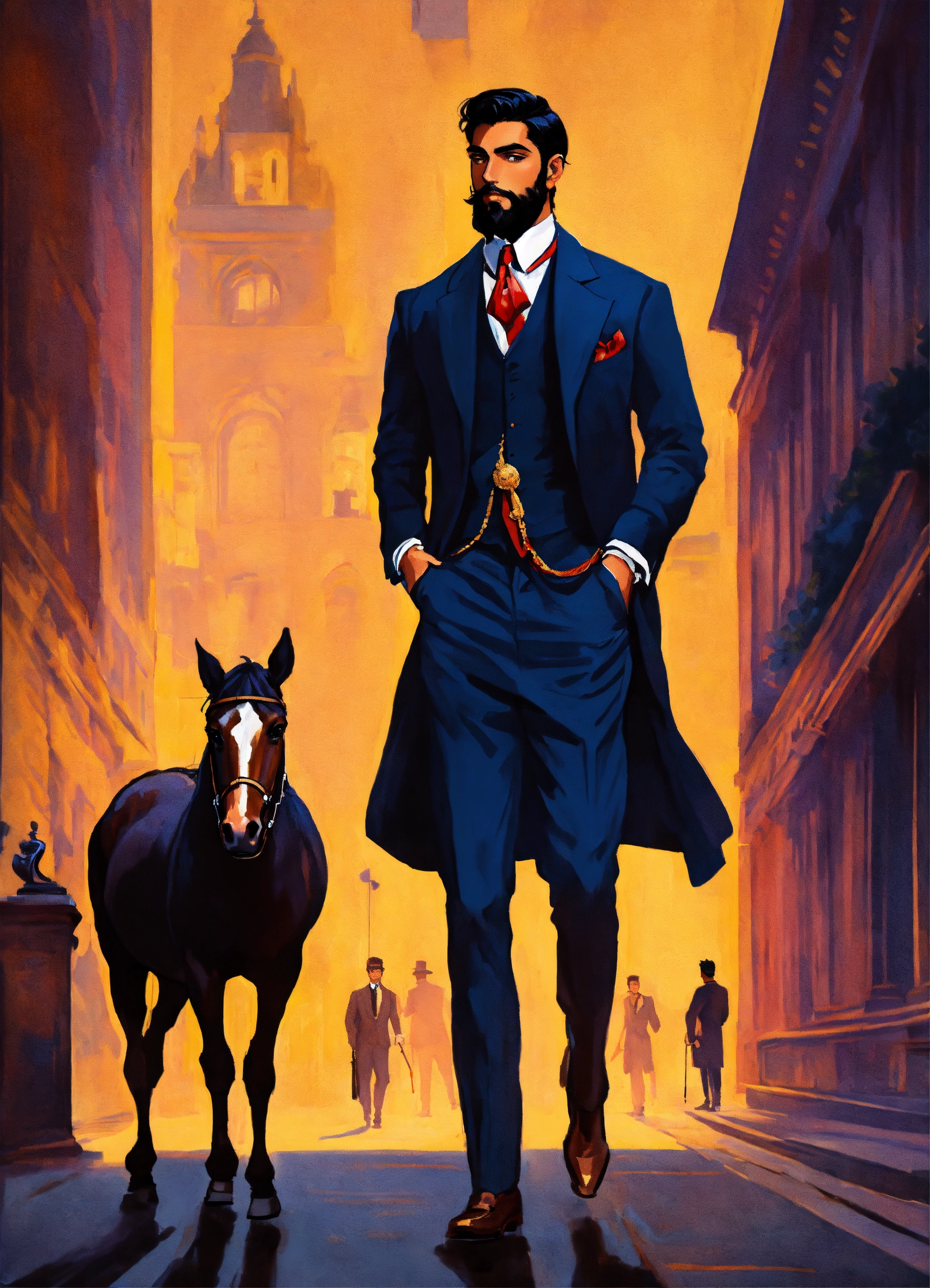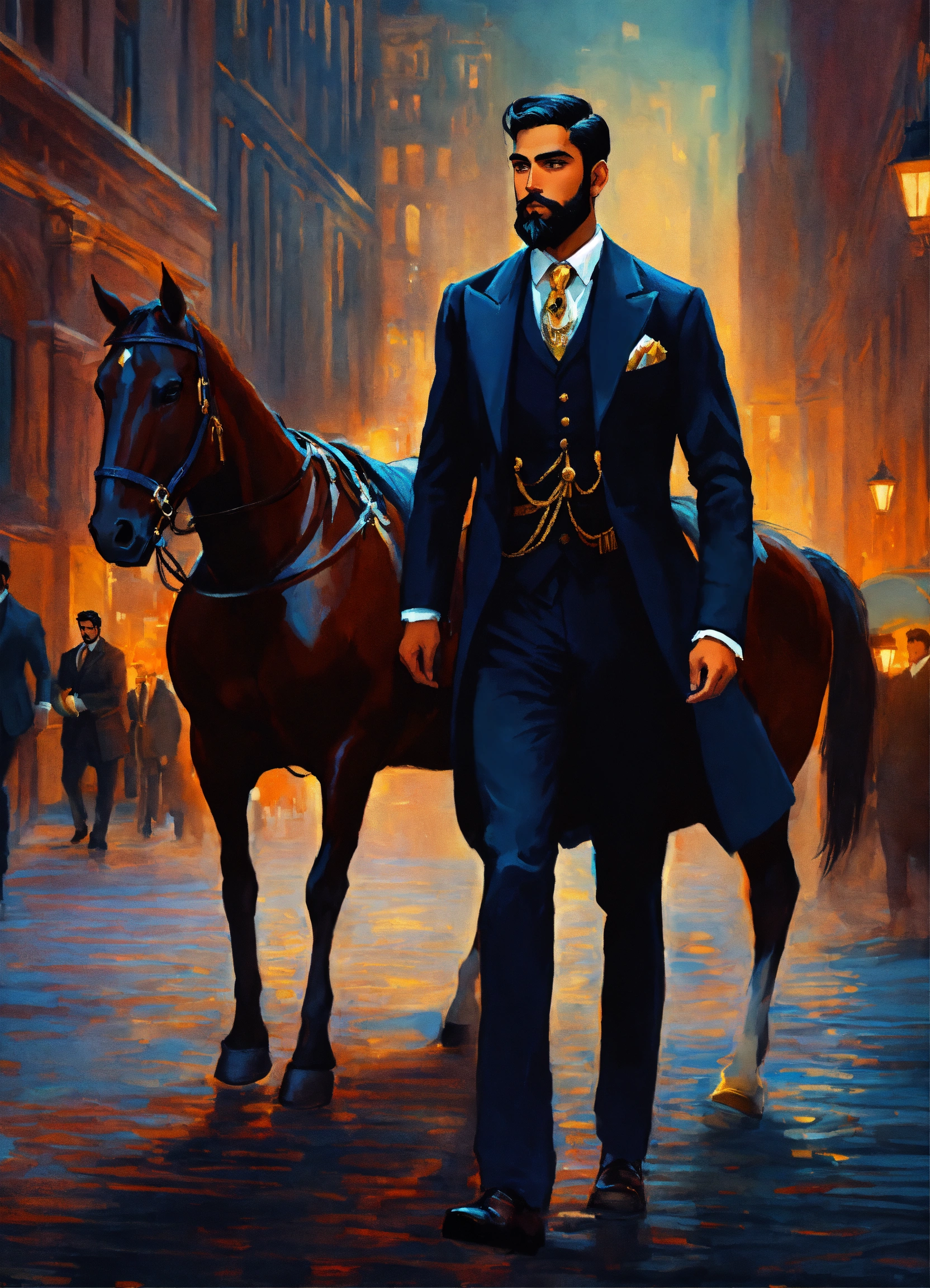Animated aristocrat from 1910 who is indian young handsome with beard, dark suit, walking with horse that is tall strong, wall street, night, digital art