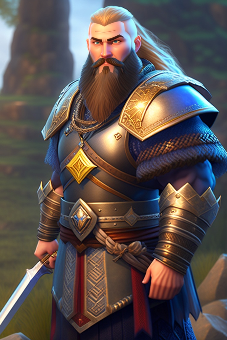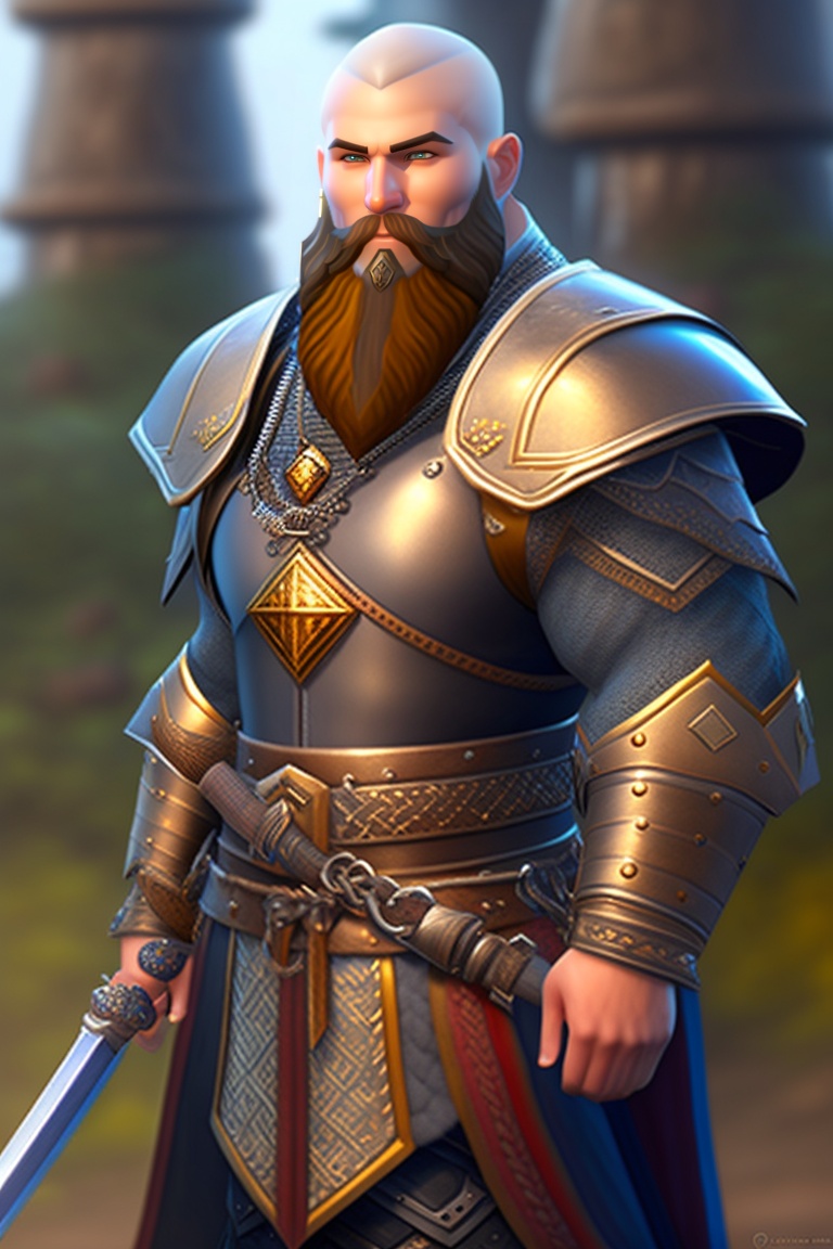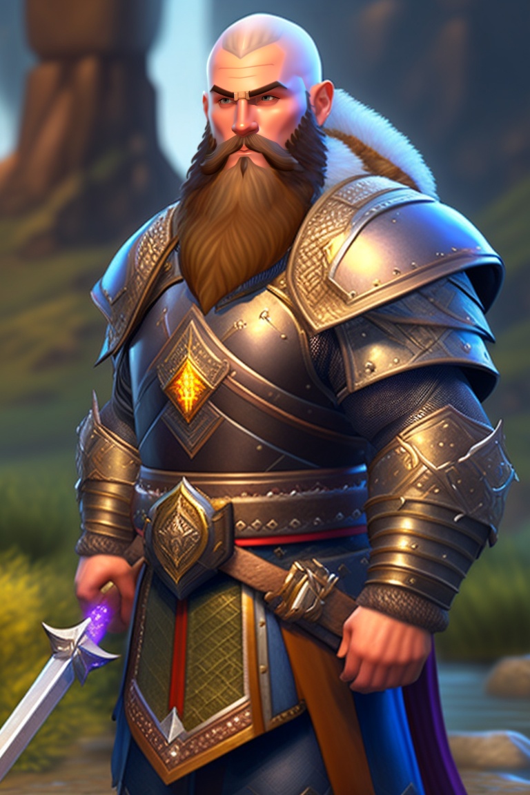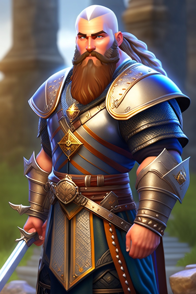 A dwarven cleric with half plate armor and a polearm in his hand with a long braided beard and short buzz cut hair with a stone necklace that glows very softly, greg rutkowski, ultra detailed, volumetric lighting