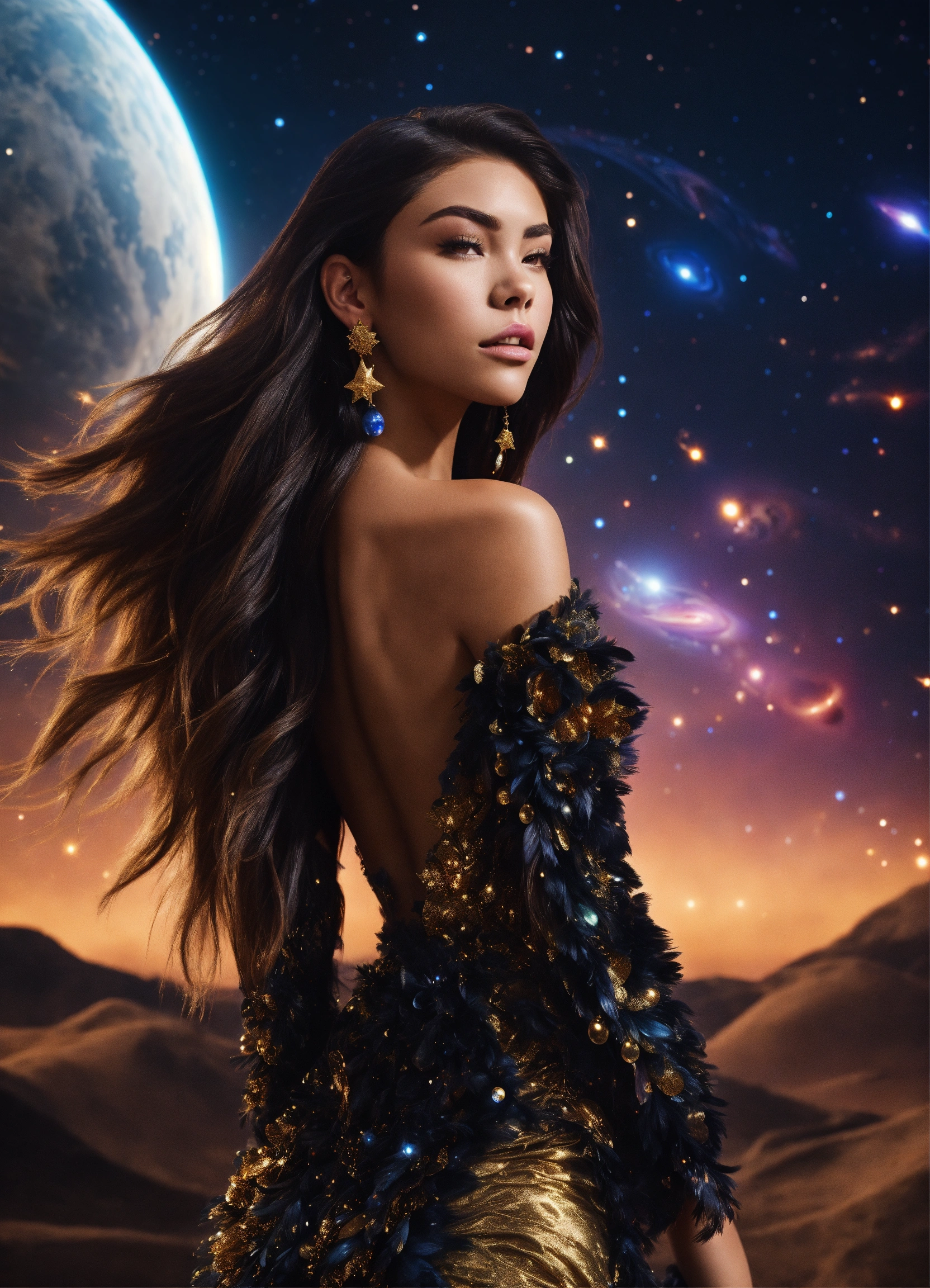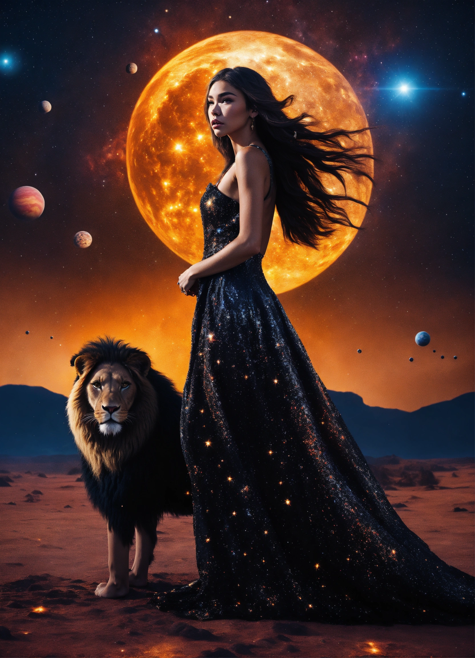 Madison beer in a feathered cocktail dress, black, on an isolated planet, back turned. stars raining down, a majestic lion with golden mane watching her. galaxy filled with planets, realistic. full body. 4k real photoshoot.