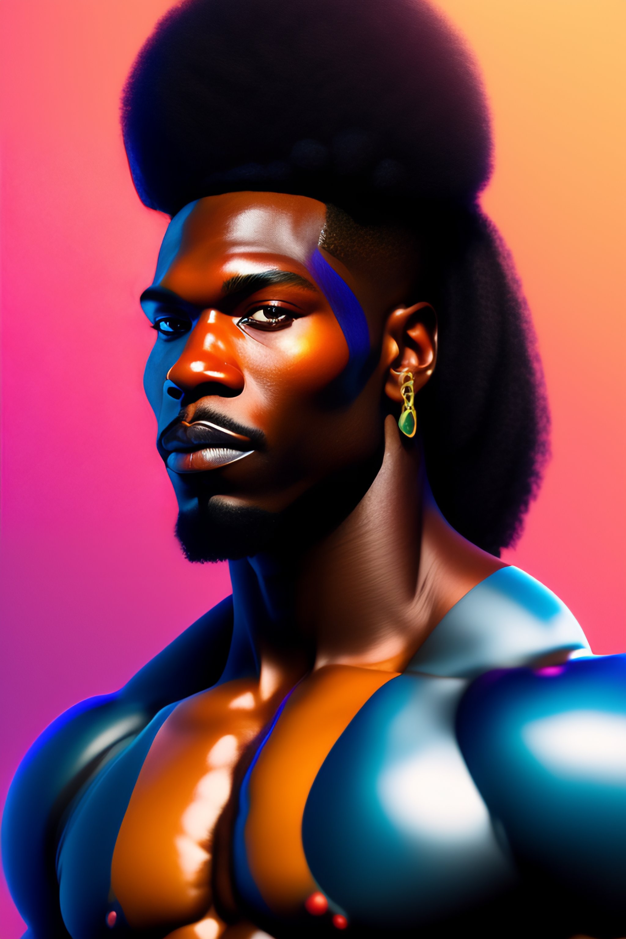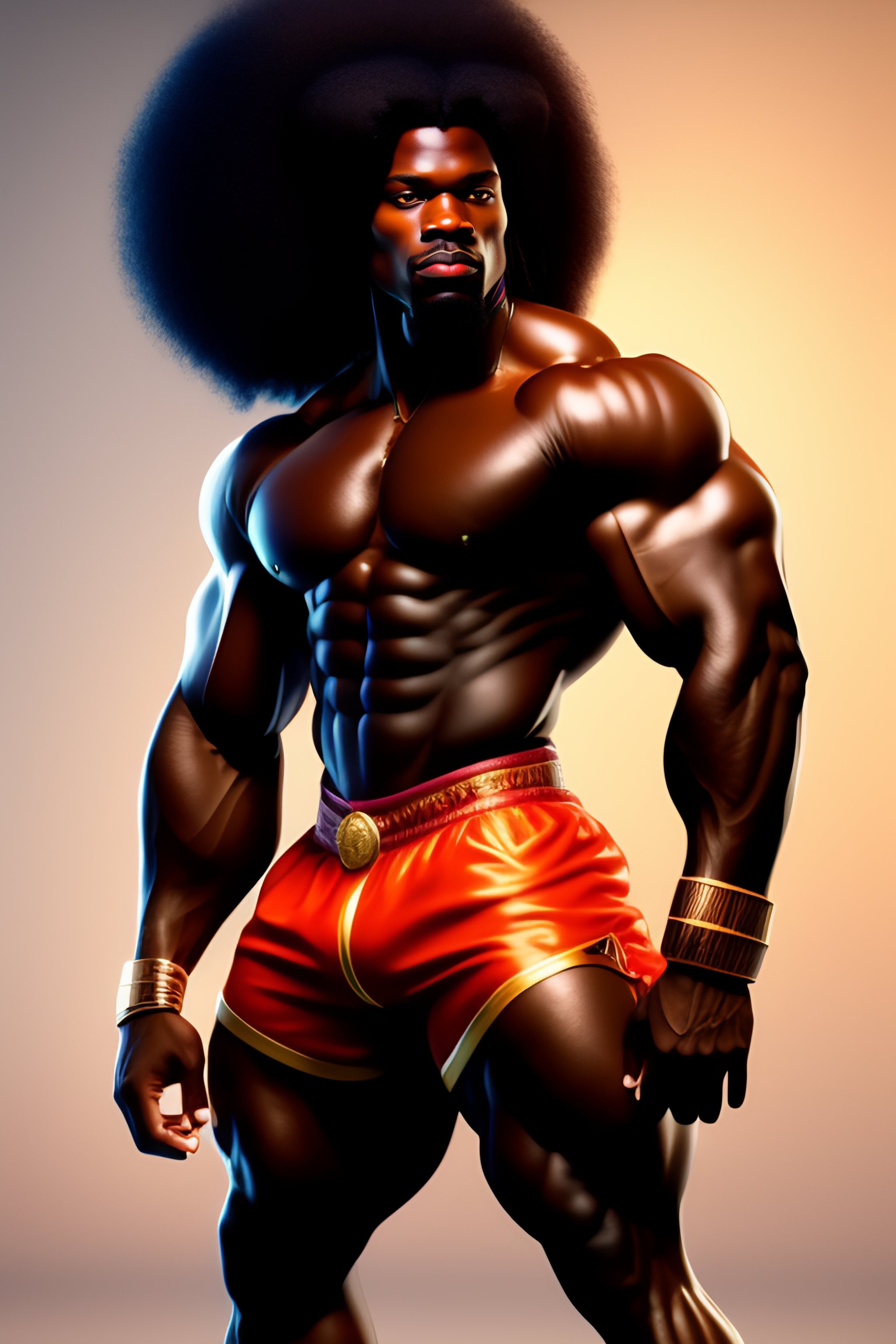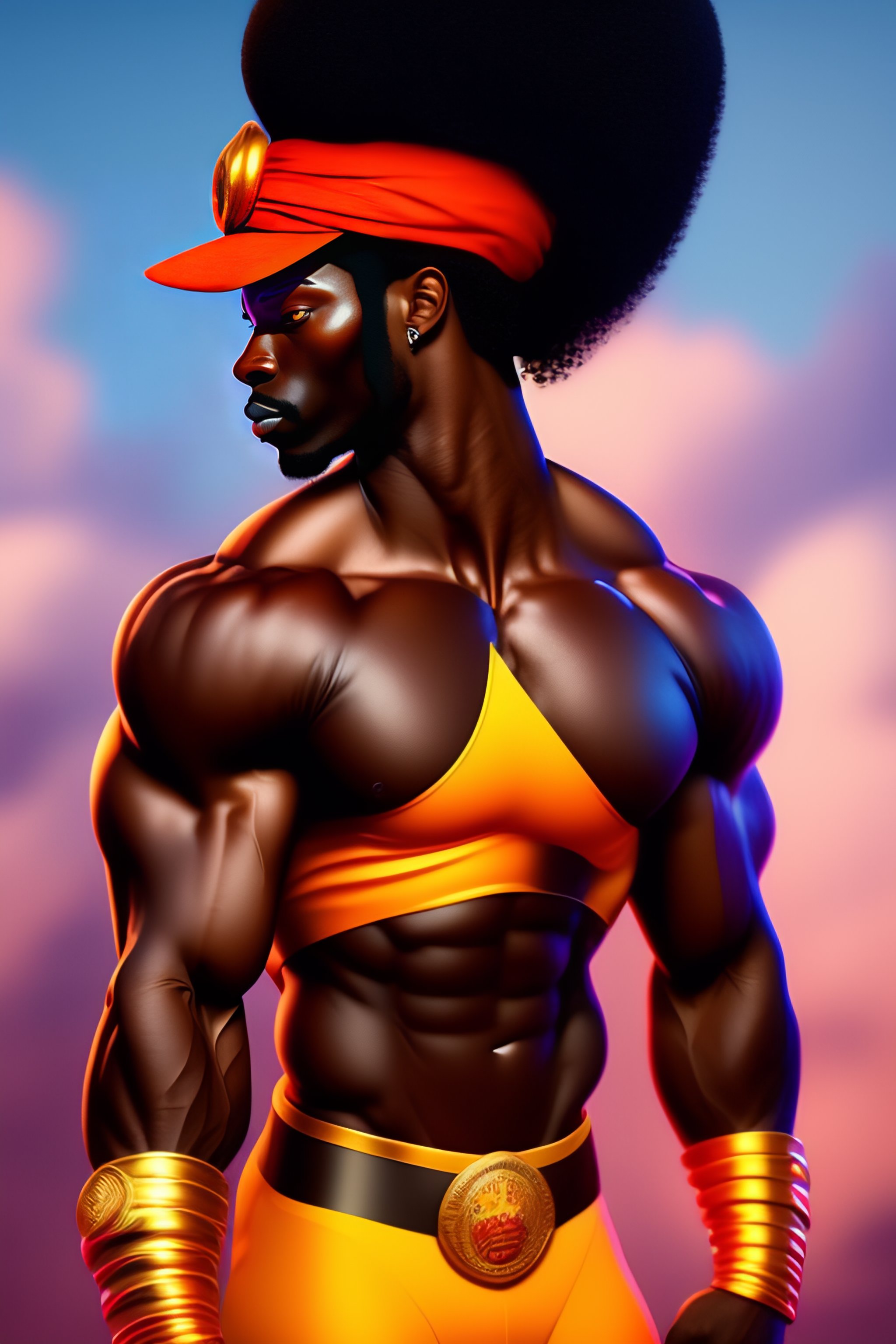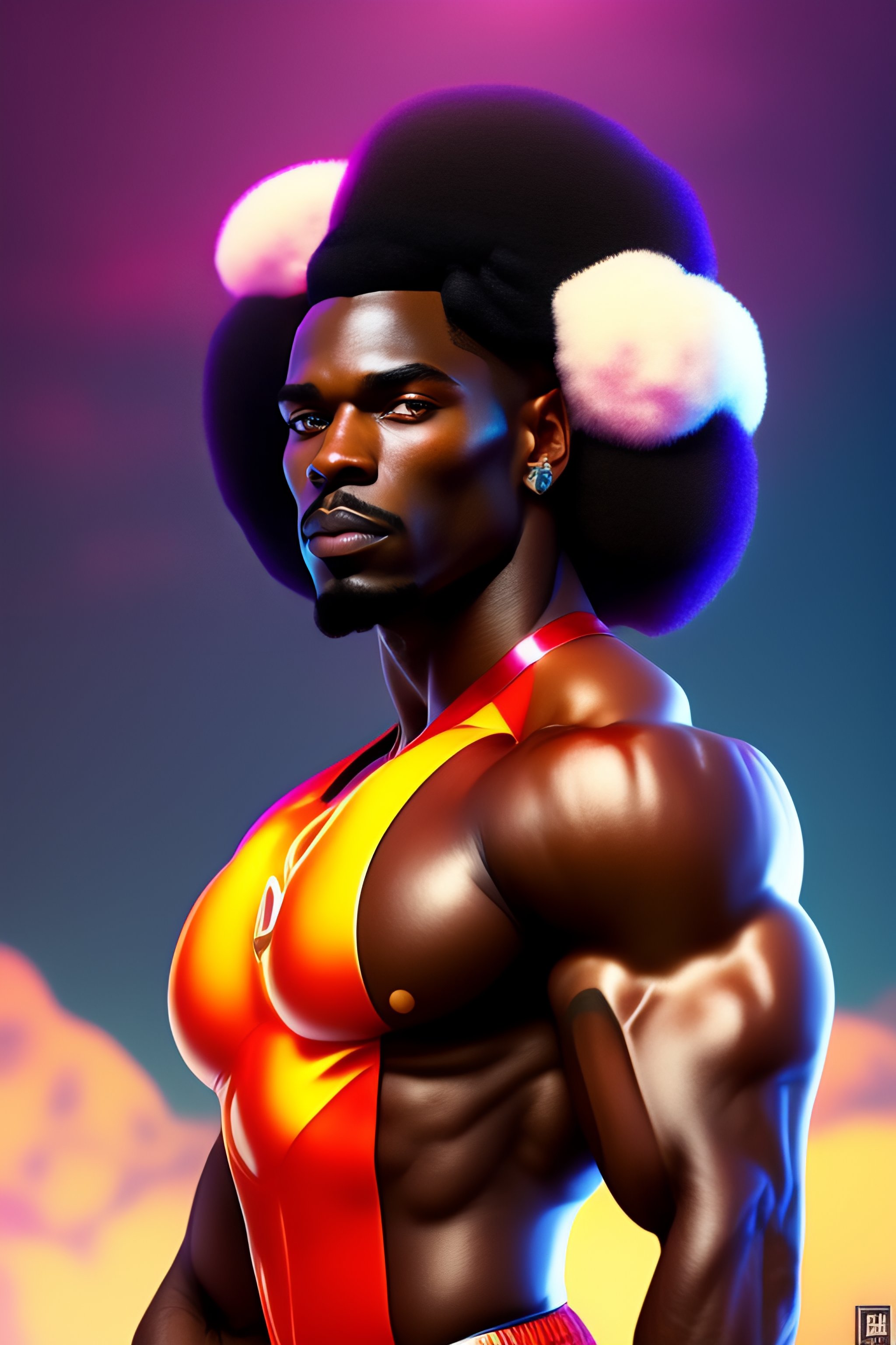 Lean and muscular cartoon it black afro man, fantasy, dreamlike, surrealism, super hot, trending on artstation