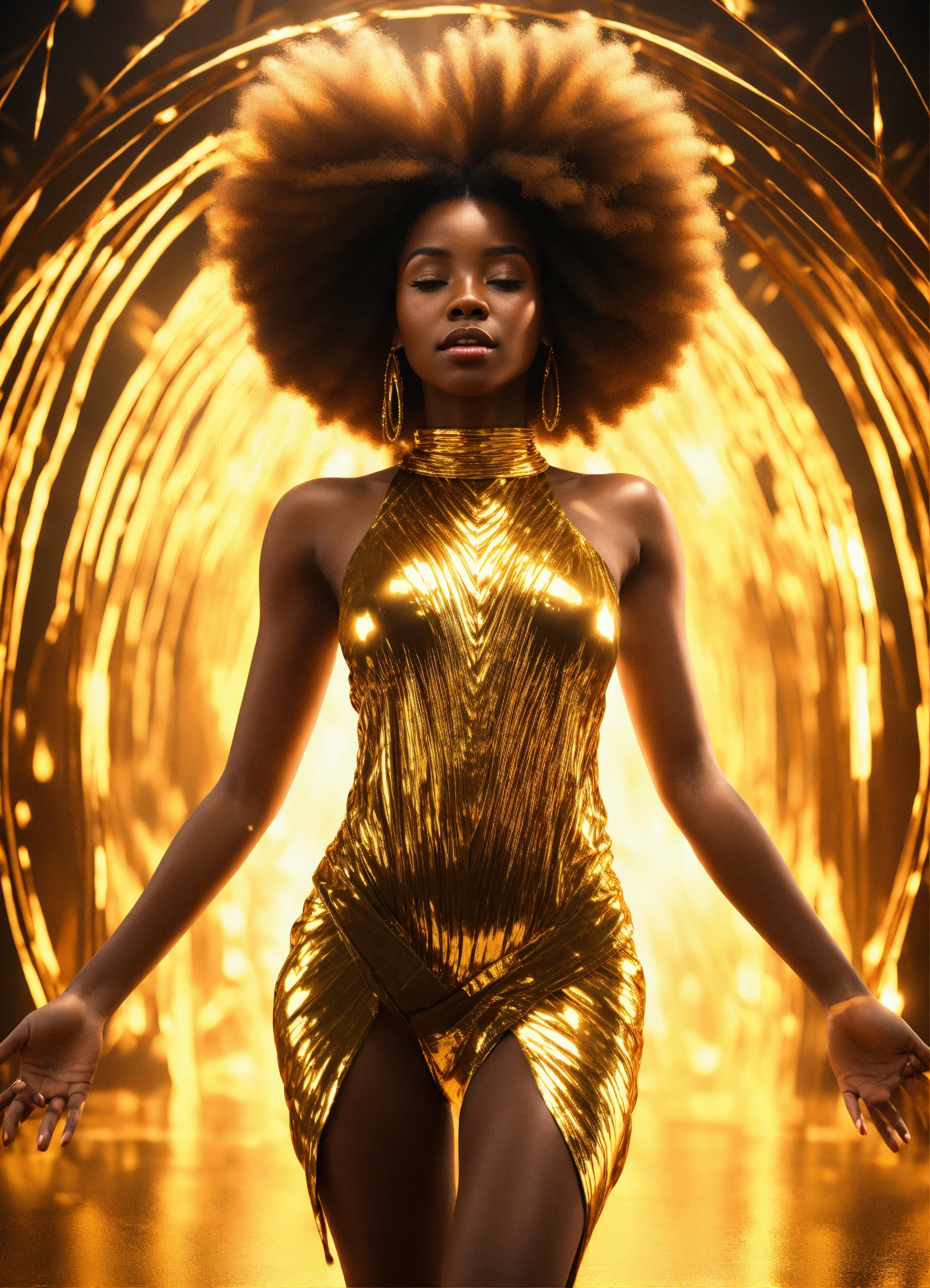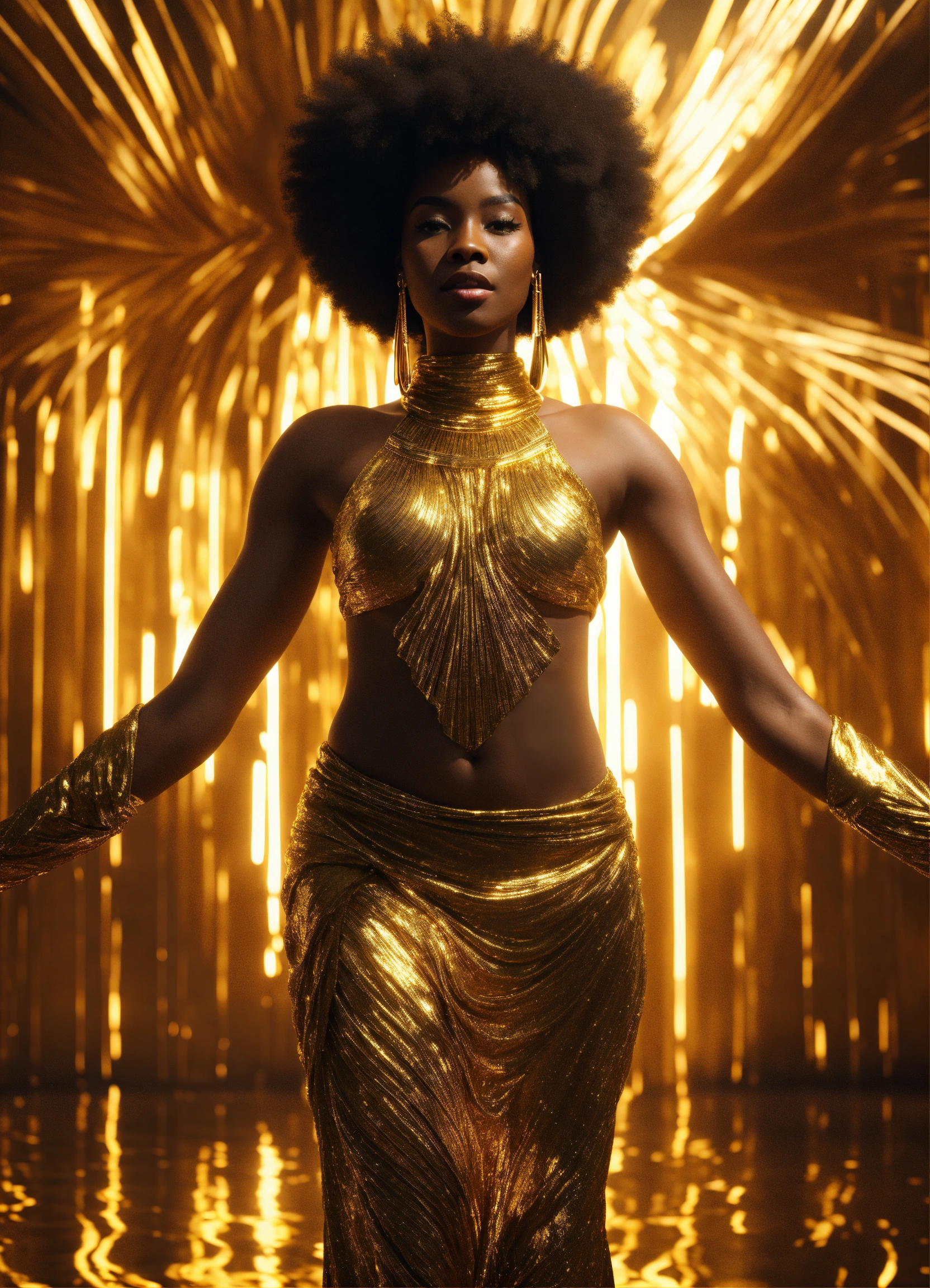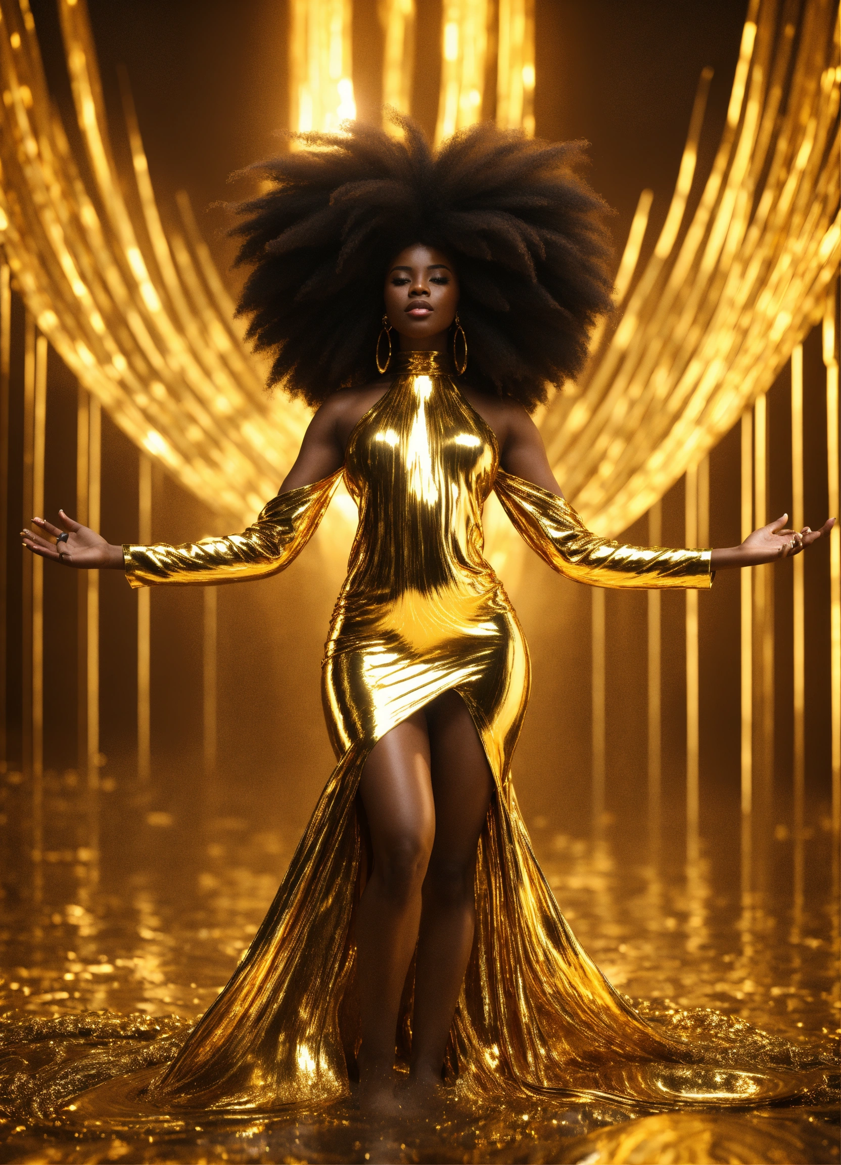 3d render of black woman with afro, full body shot, standing, arms outstretched to sides palms up, eyes open looking directly into camera, liquid gold flows through her entire face and body, illuminating her form from within, wearing long, flowing gold african style clothing
