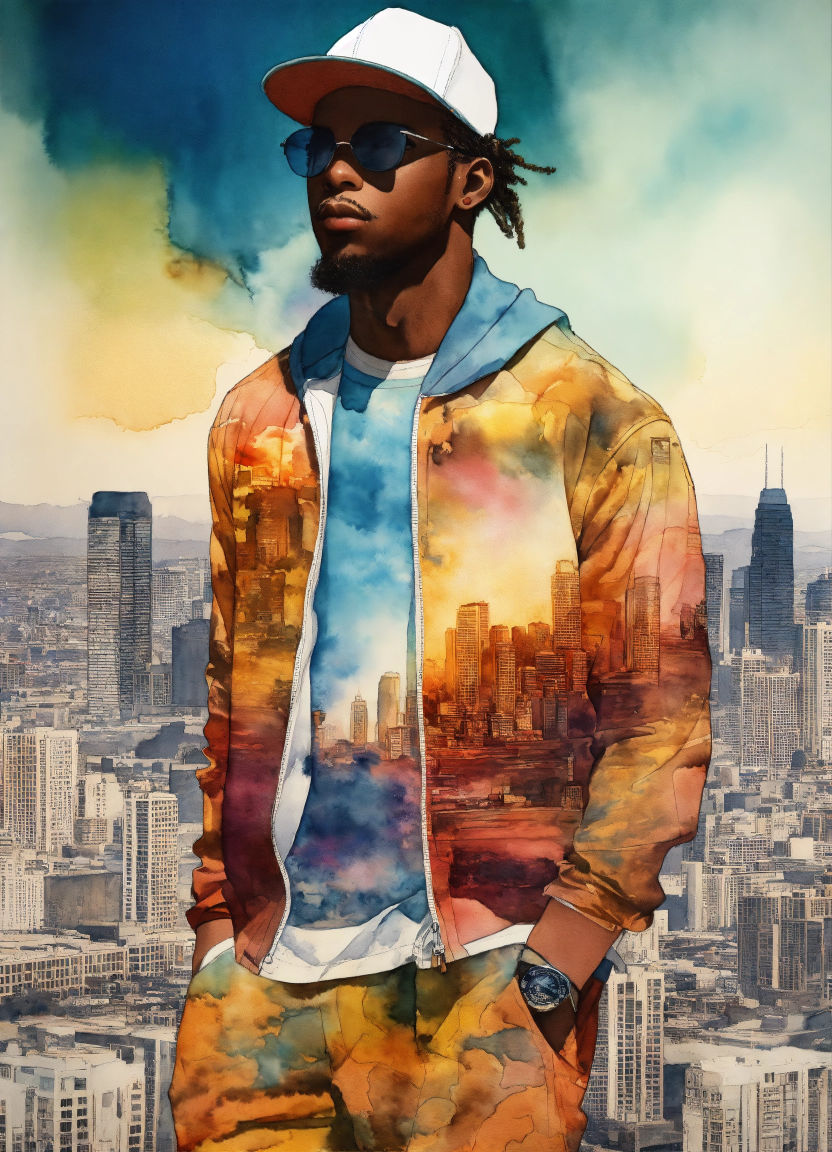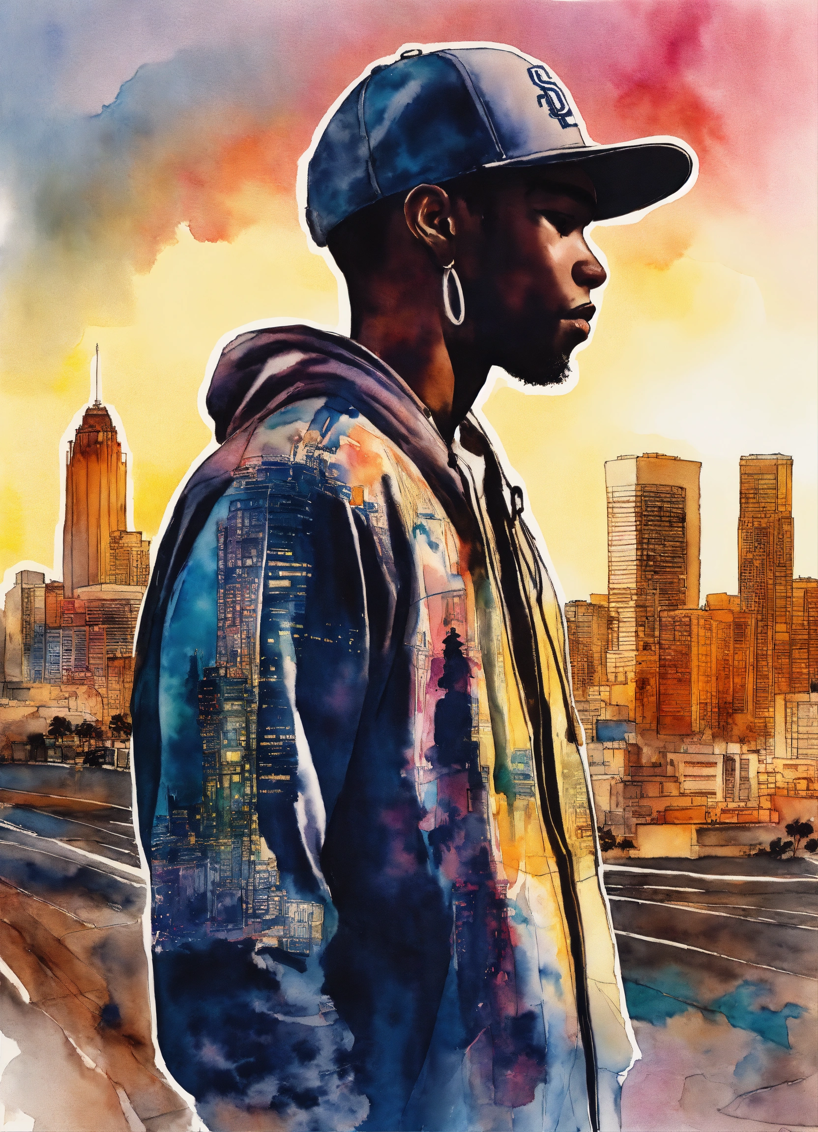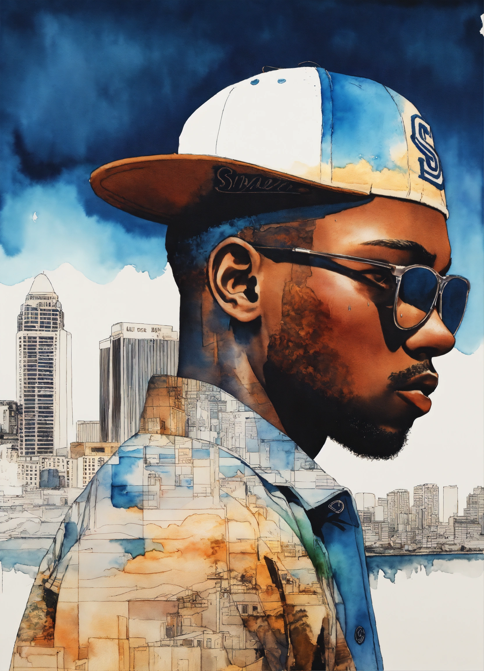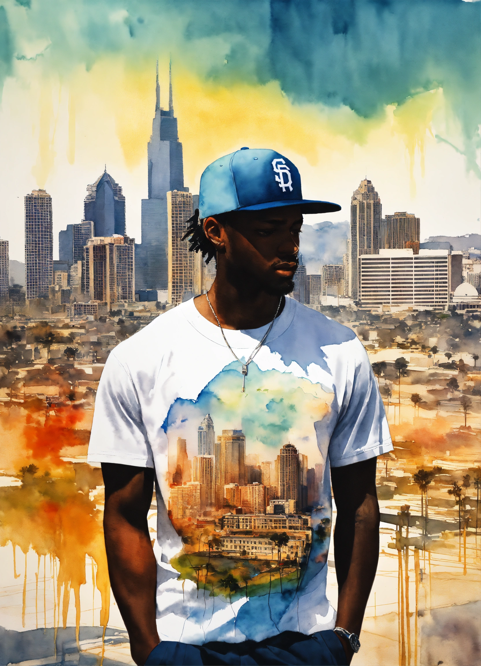 Exquisite watercolor with detailed pen and ink line drawing accents on a pure white paper background, where a faceless african american man, his attire is a double exposure of the san diego, ca sunny skyline. with a snapback baseball hat on over a mid length locs hairstyle, the city's landmarks become his sweat suit, merging beautifully double exposed with his clothing with his silhouette at 50% opacity. silhouette is half the opacity of the background to allow the skyline to be highlighted. the artwork's charm is further enhanced by ethereal colors of the padres current at home uniform represented in the smoke and a dramatic paint splash. double exposure overlay. manga kewpie faceless cartoon style