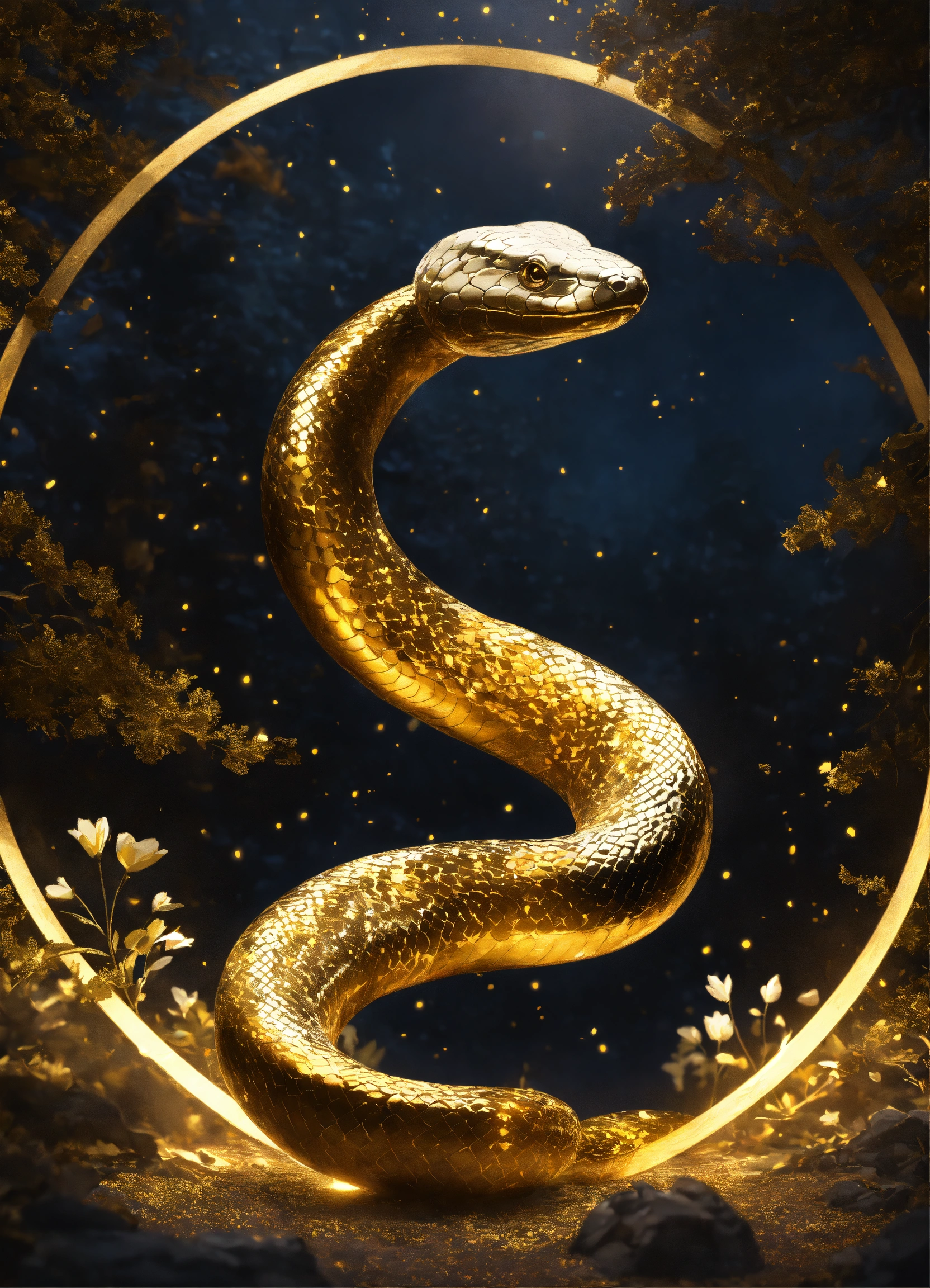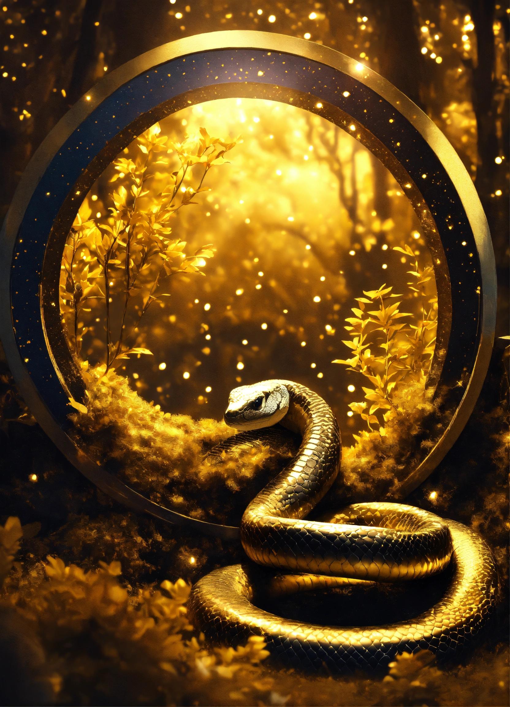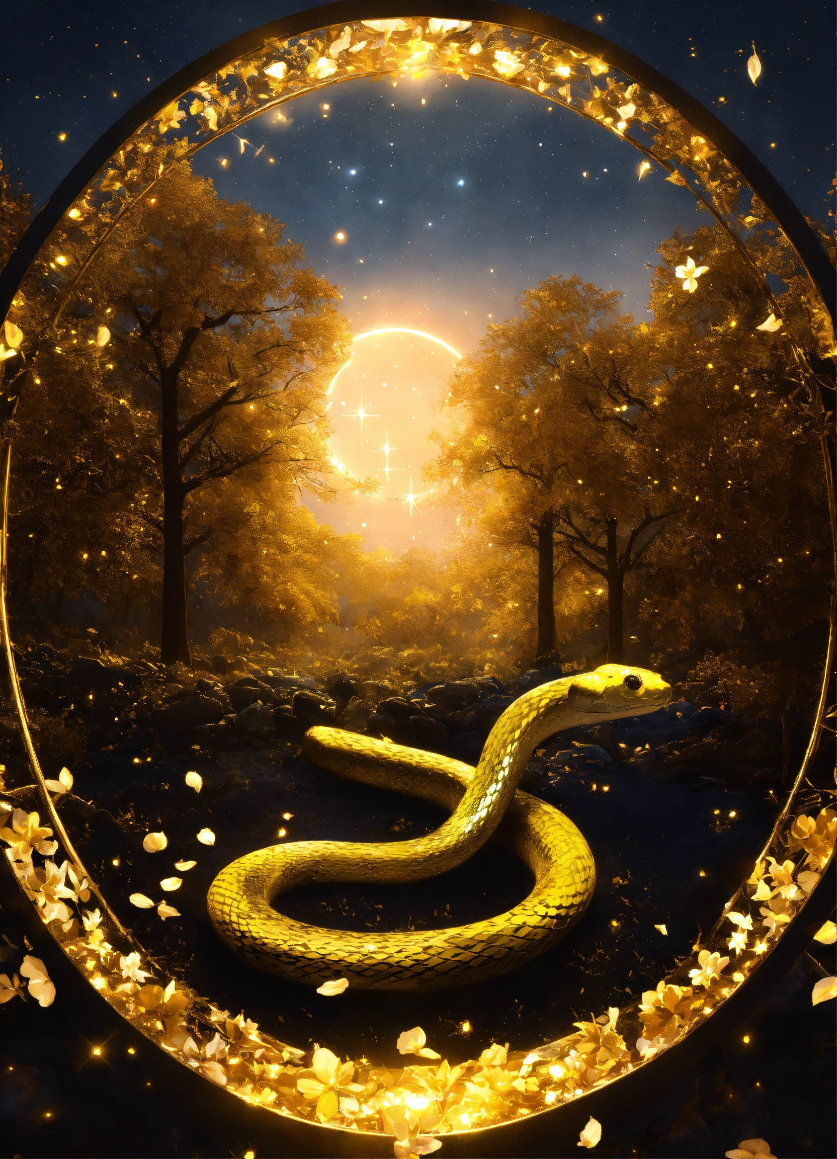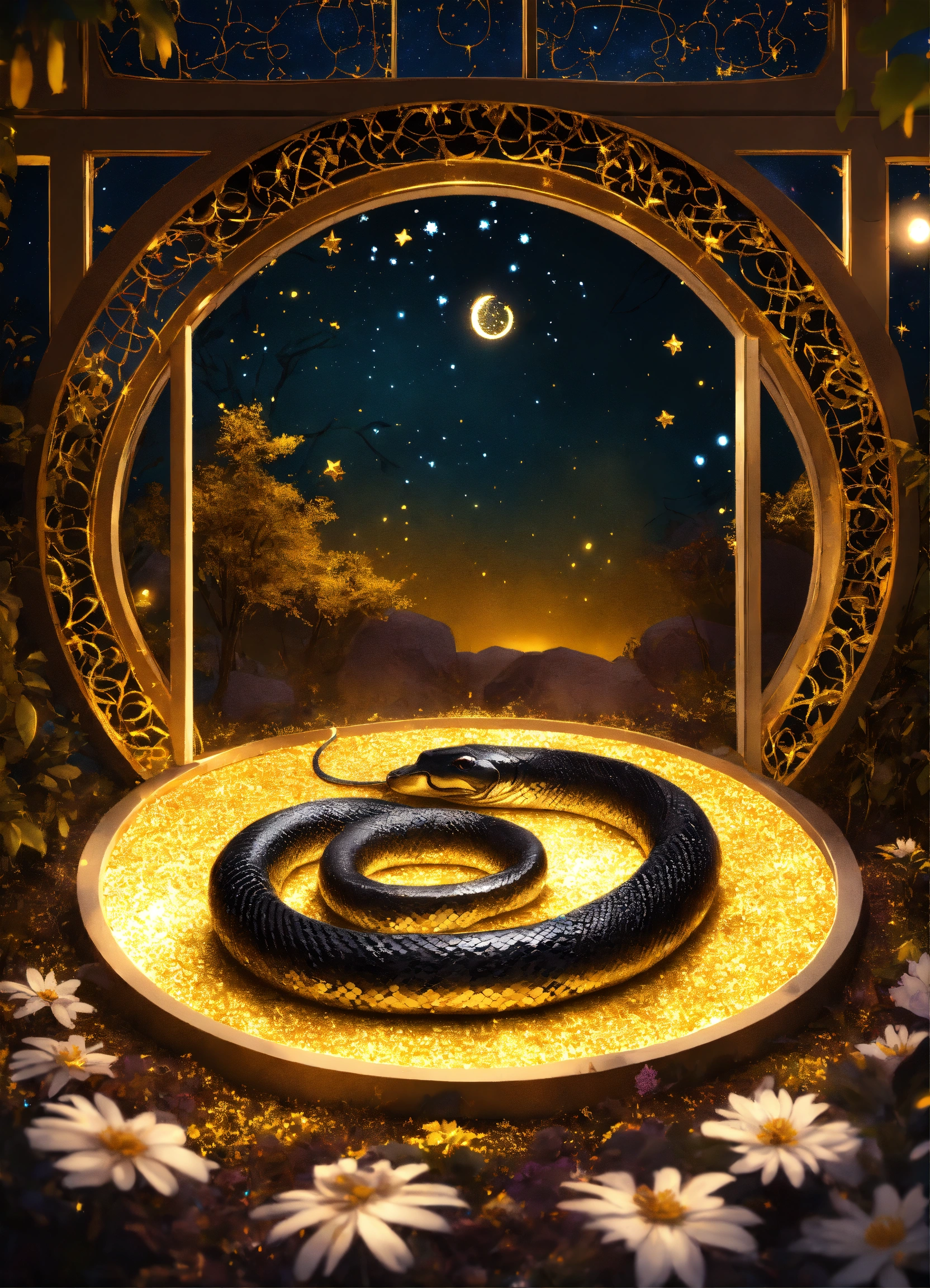 Blooming white-black-golden snake in gold forest with sprinkles in ground, inside a glowing circle fond window frame in gold and black, magic starry cosmos, glowing night, starry sky in moonlight sparkle magic trait, hyper detail and hyper quality, hyper detail equipment, 32k, accurate anatomy, enchant color, dynamic lighting