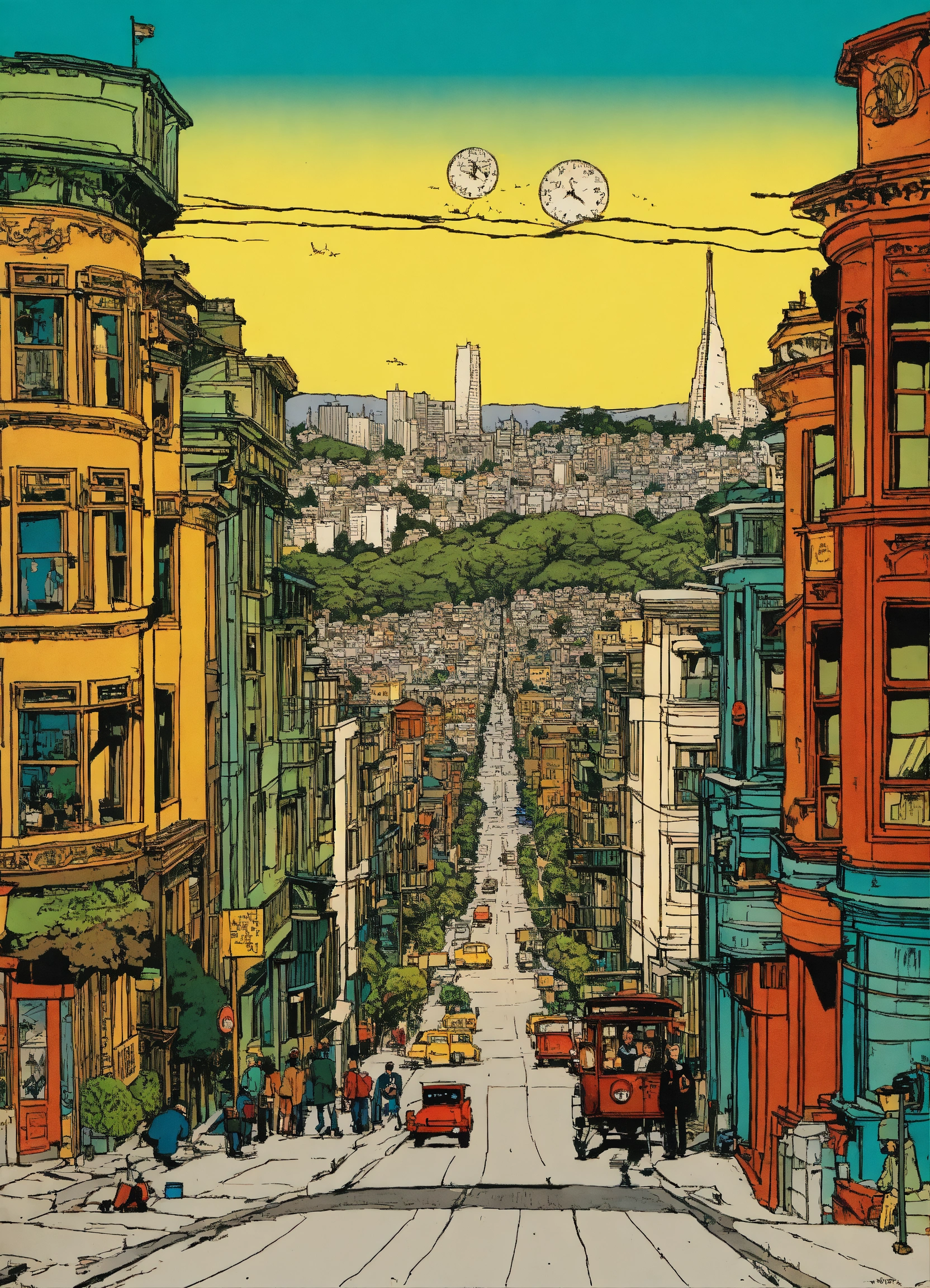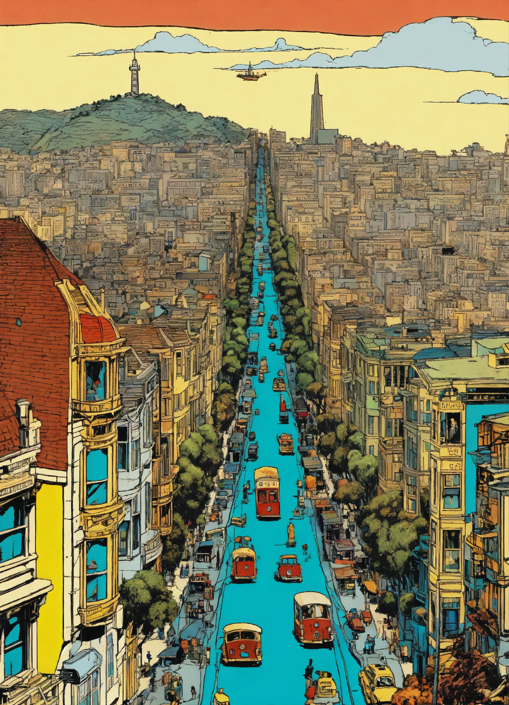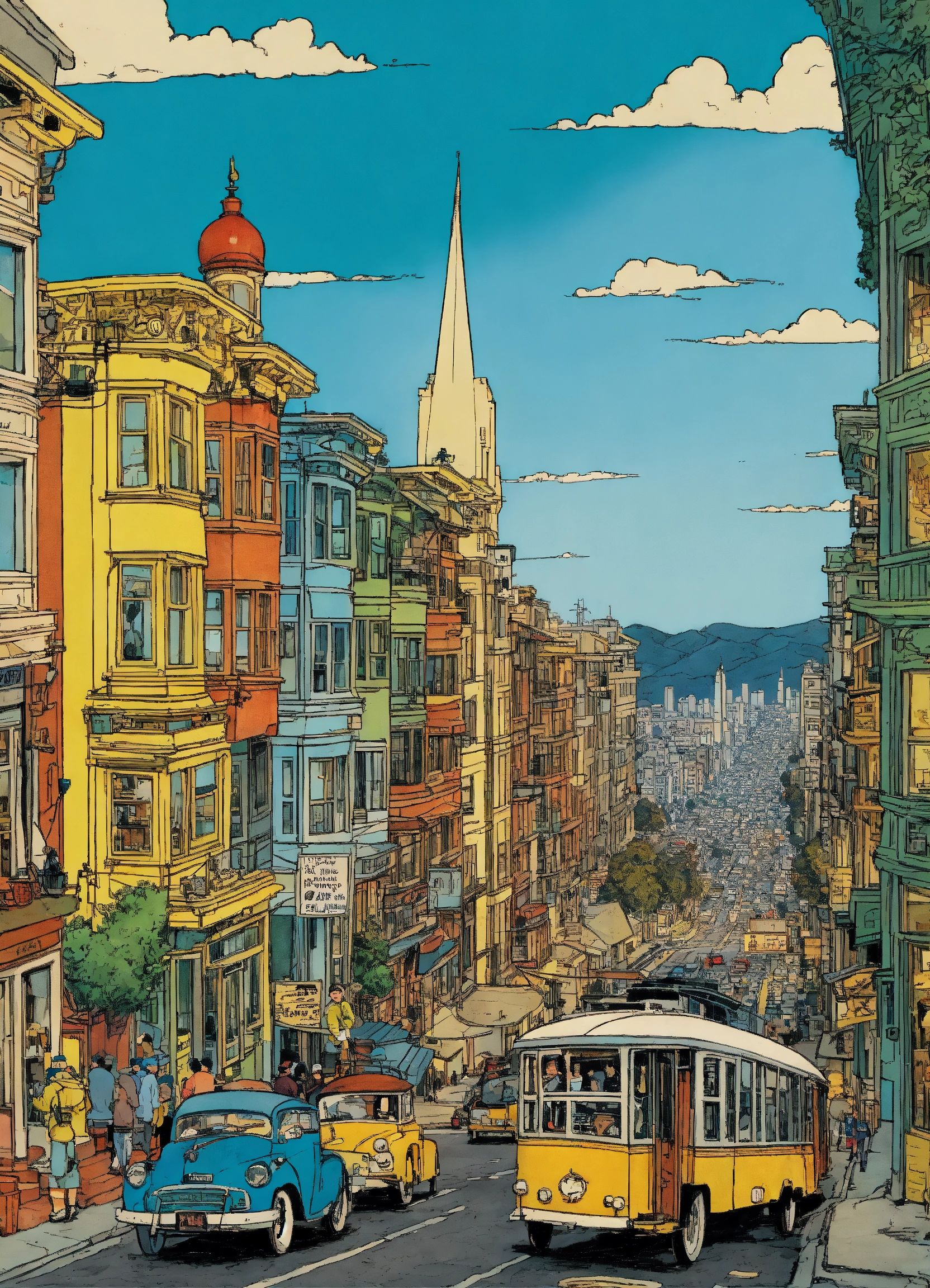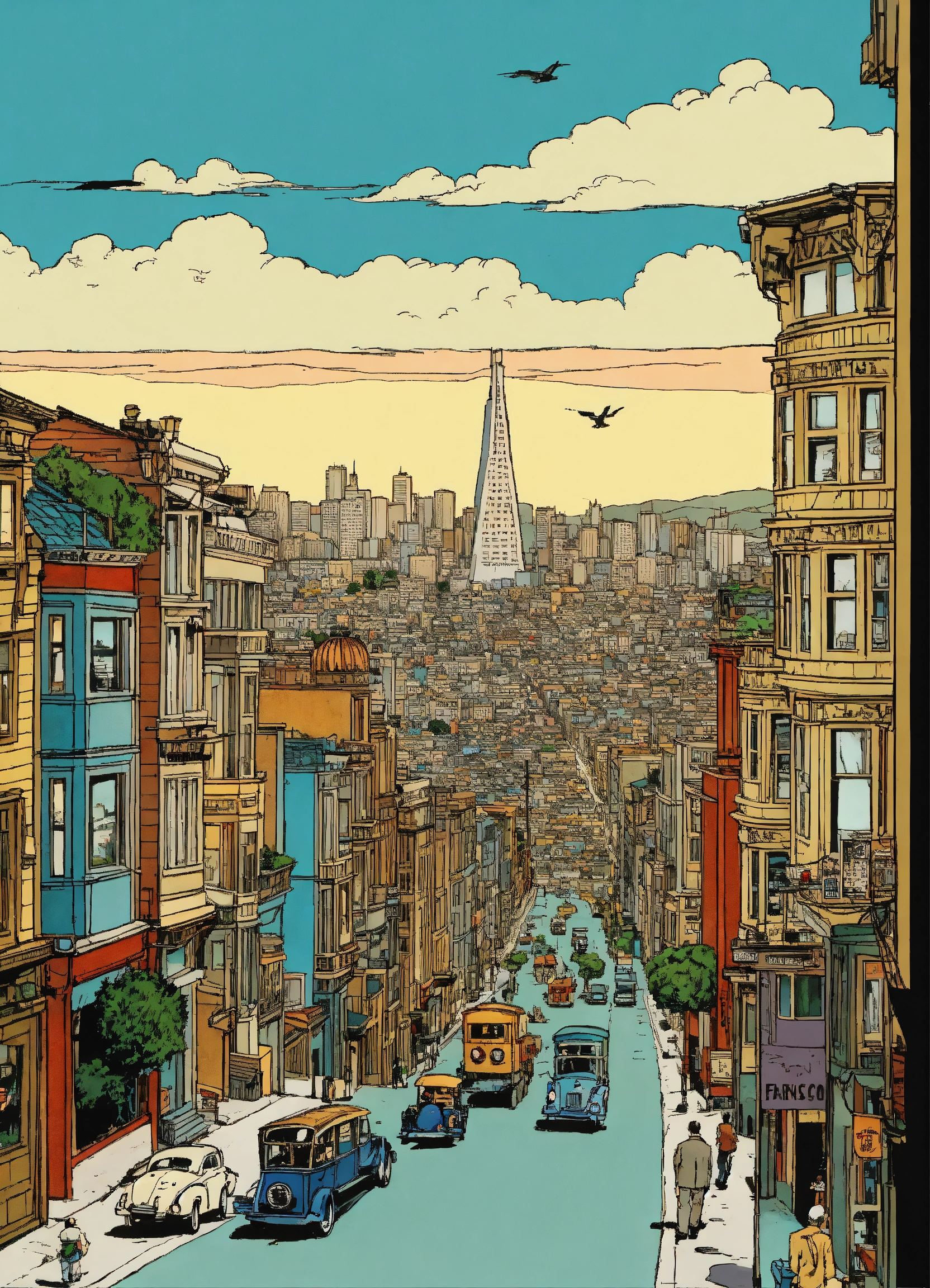 Beautiful san francisco, illustrated by hergé, style of tin tin comics, pen and ink., beautiful colors, attention to detail