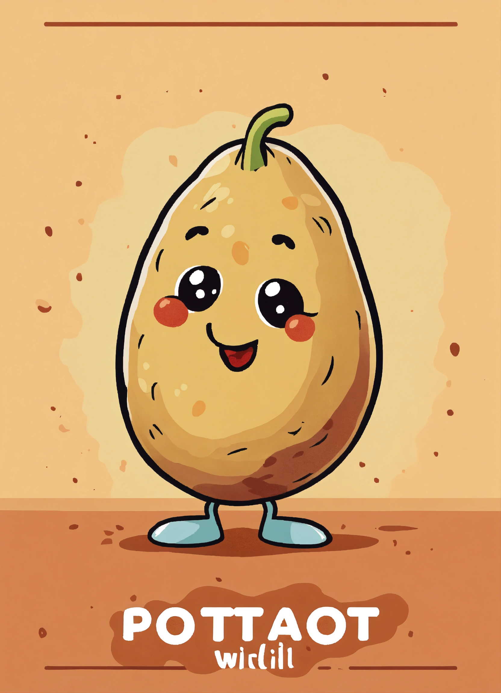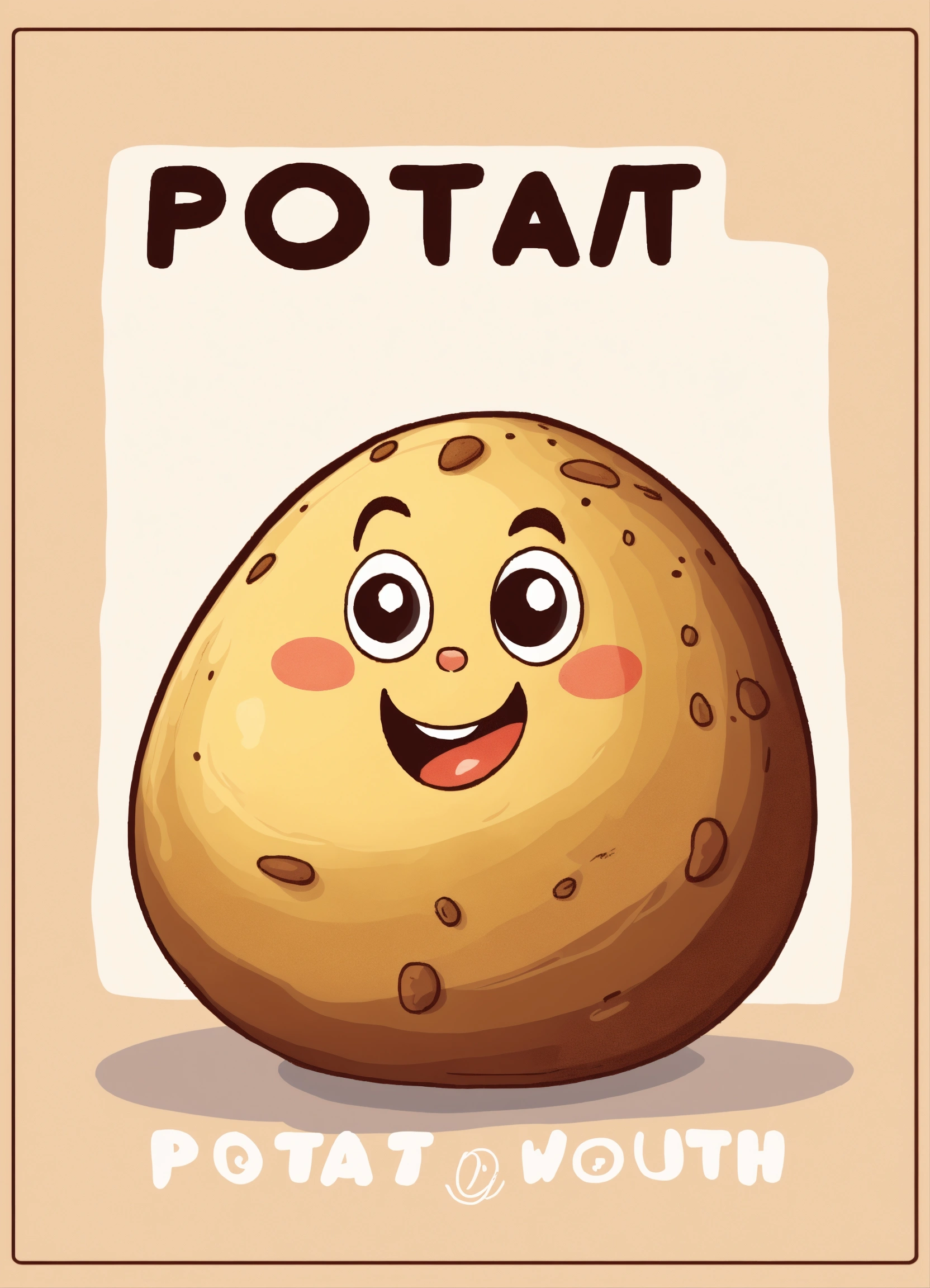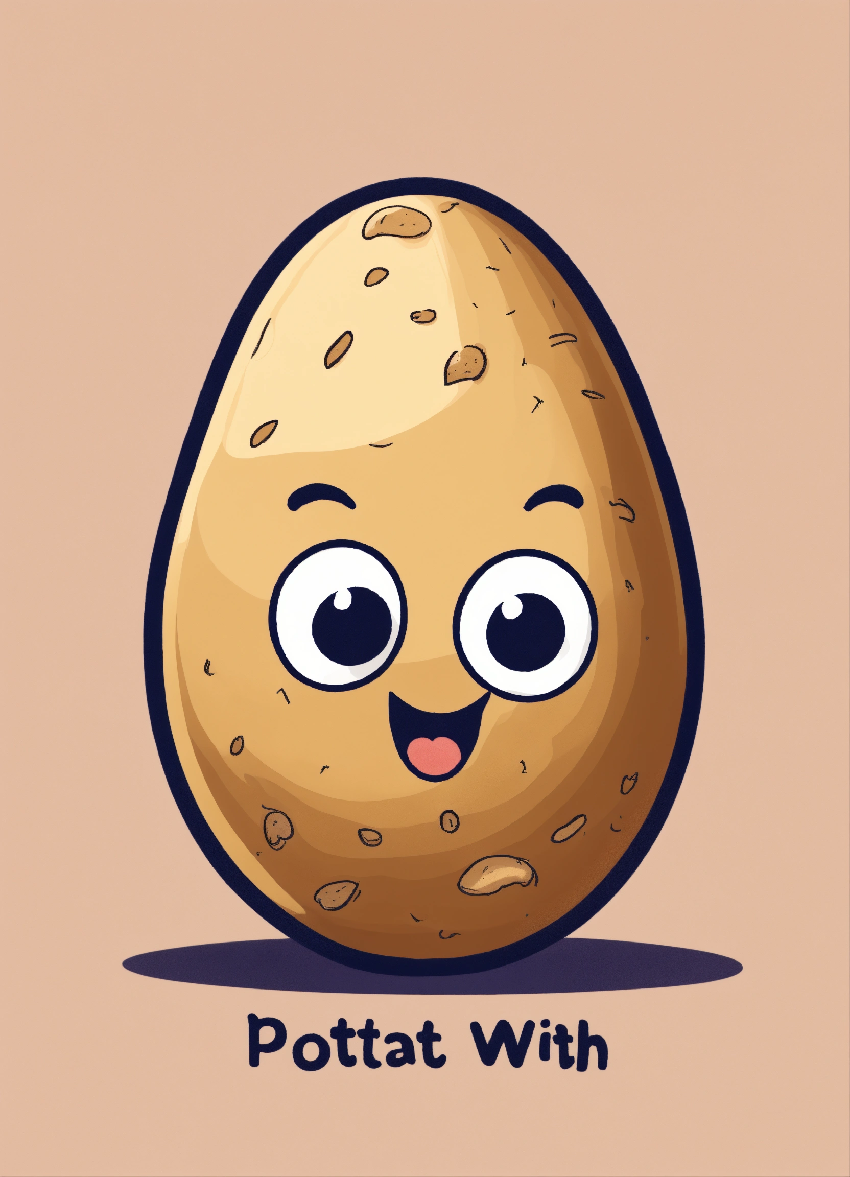 A simple cartoon cute baby potato on its side with text above that says potat with white background