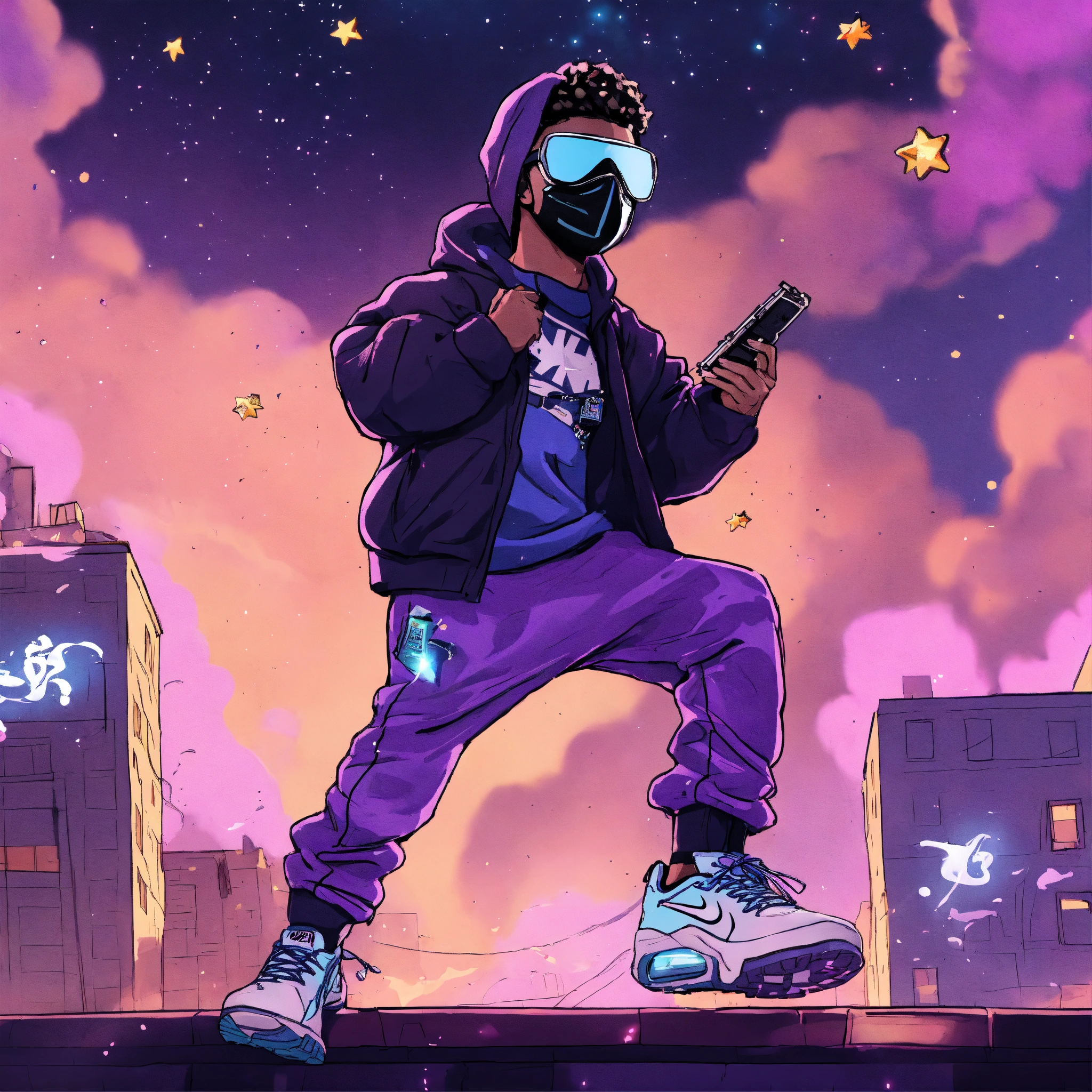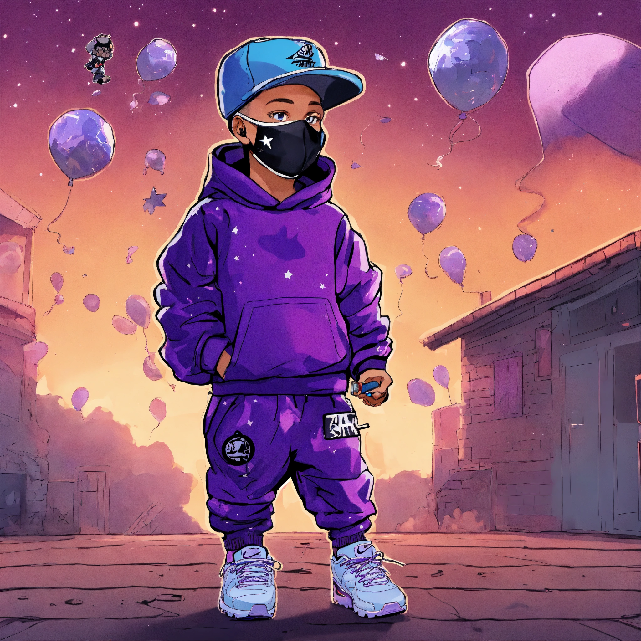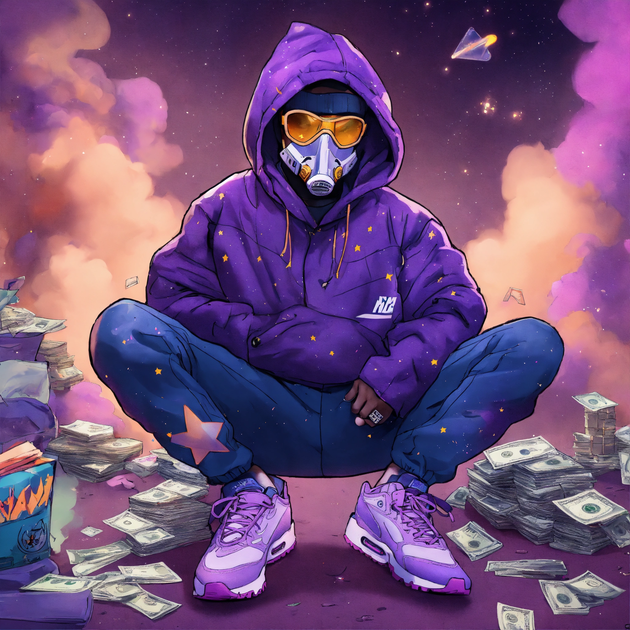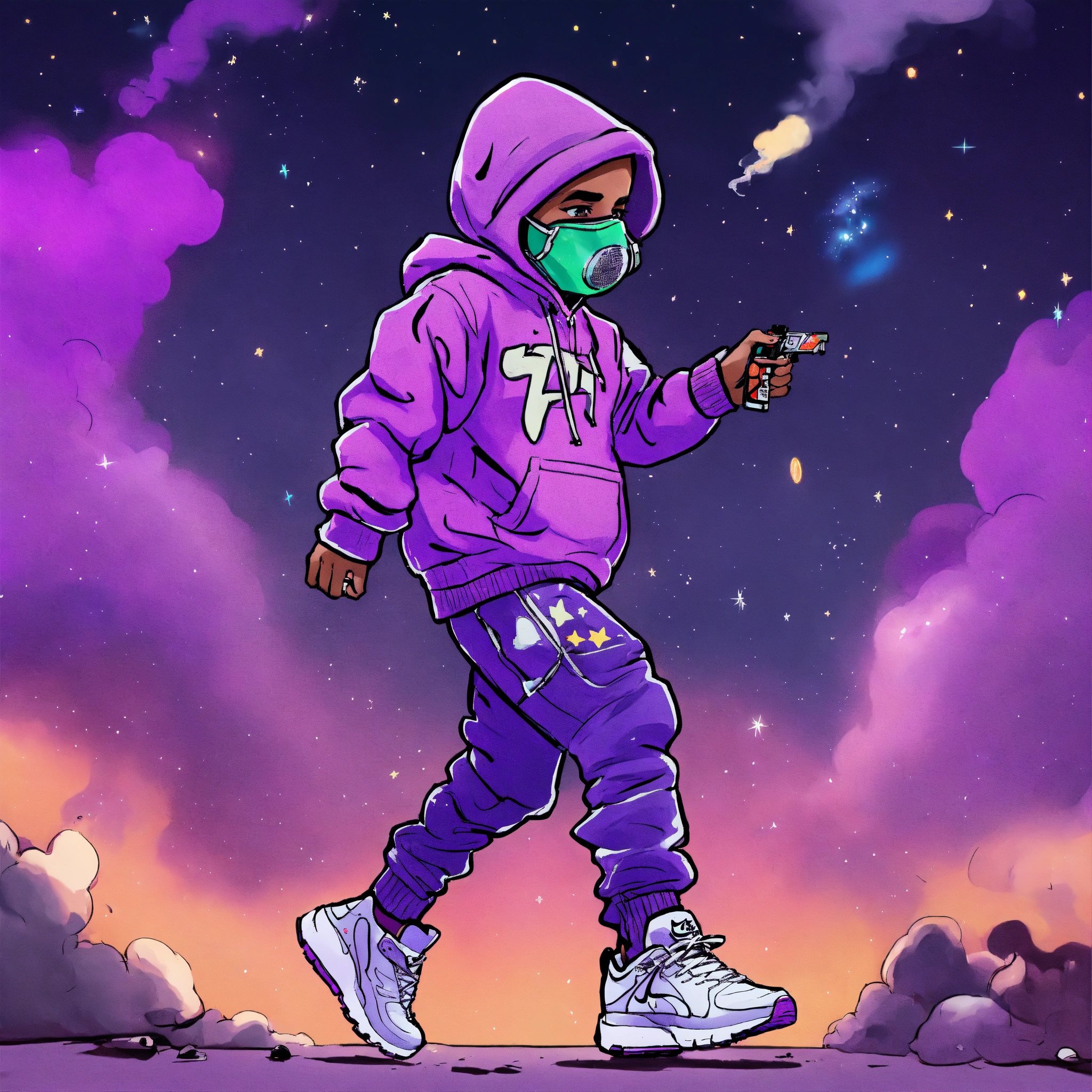 Criminal kid, german rapper, fully masked, jogging pants, nike air max plus, pistol, drawing, art, 4k, cartoon style, bundles of money, ghetto, galaxy, stars, smoke, purple