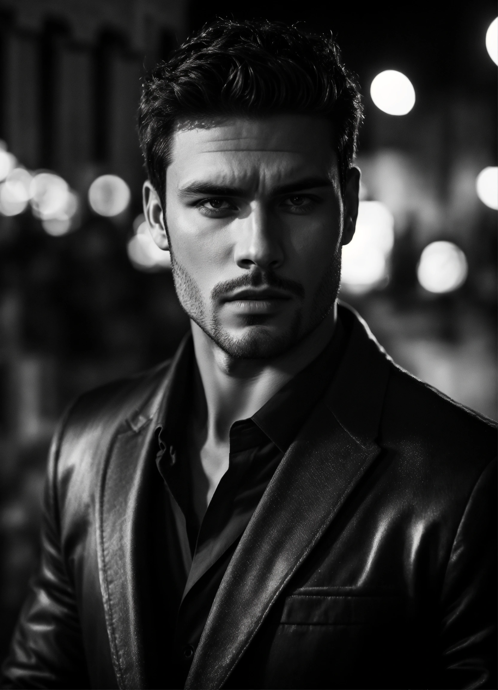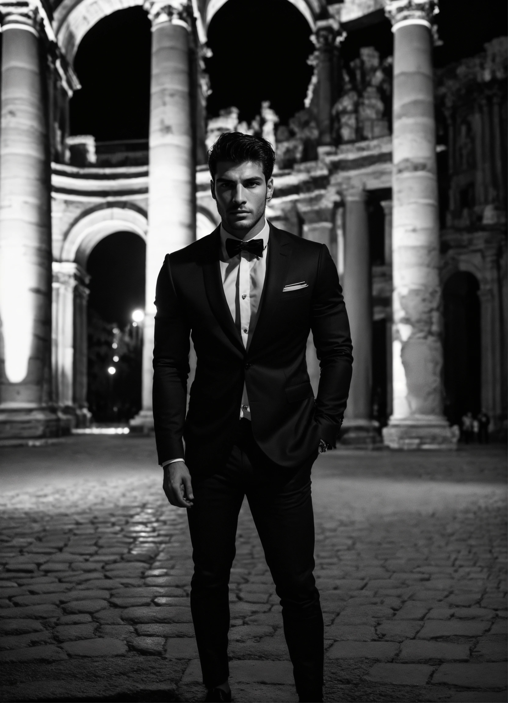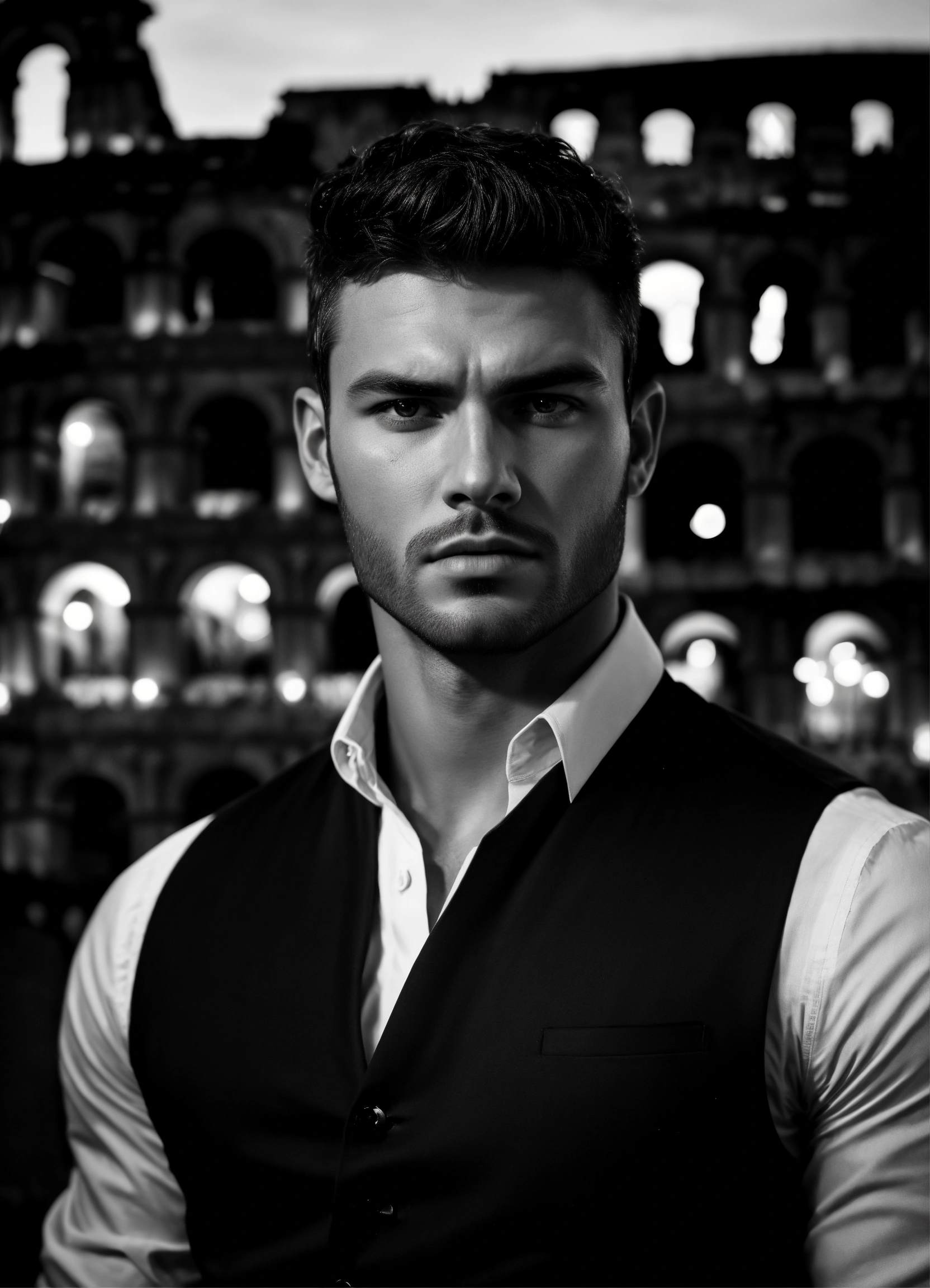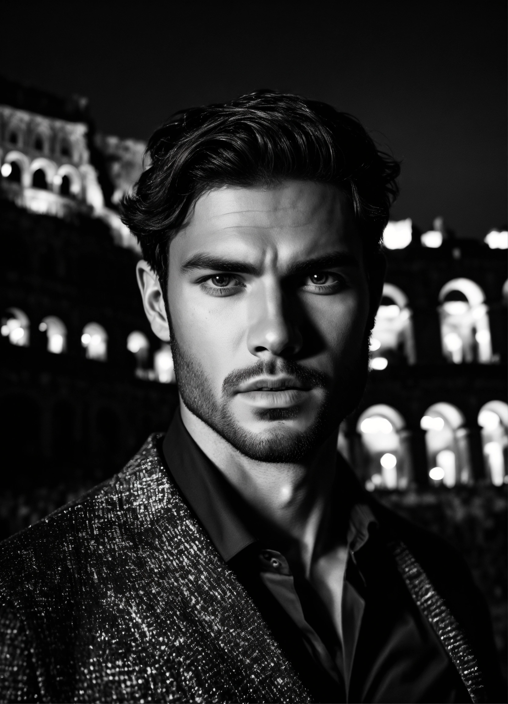 Photo of male model gonçalo teixeira, black and white, realistic, portrait, not painted, very detailed faces, skin with pores, 4k, dark suit, skin not smoothed, desire in the eyes, glowering, looking into the camera, dark shirt. colosseum in rome in full view at night as background