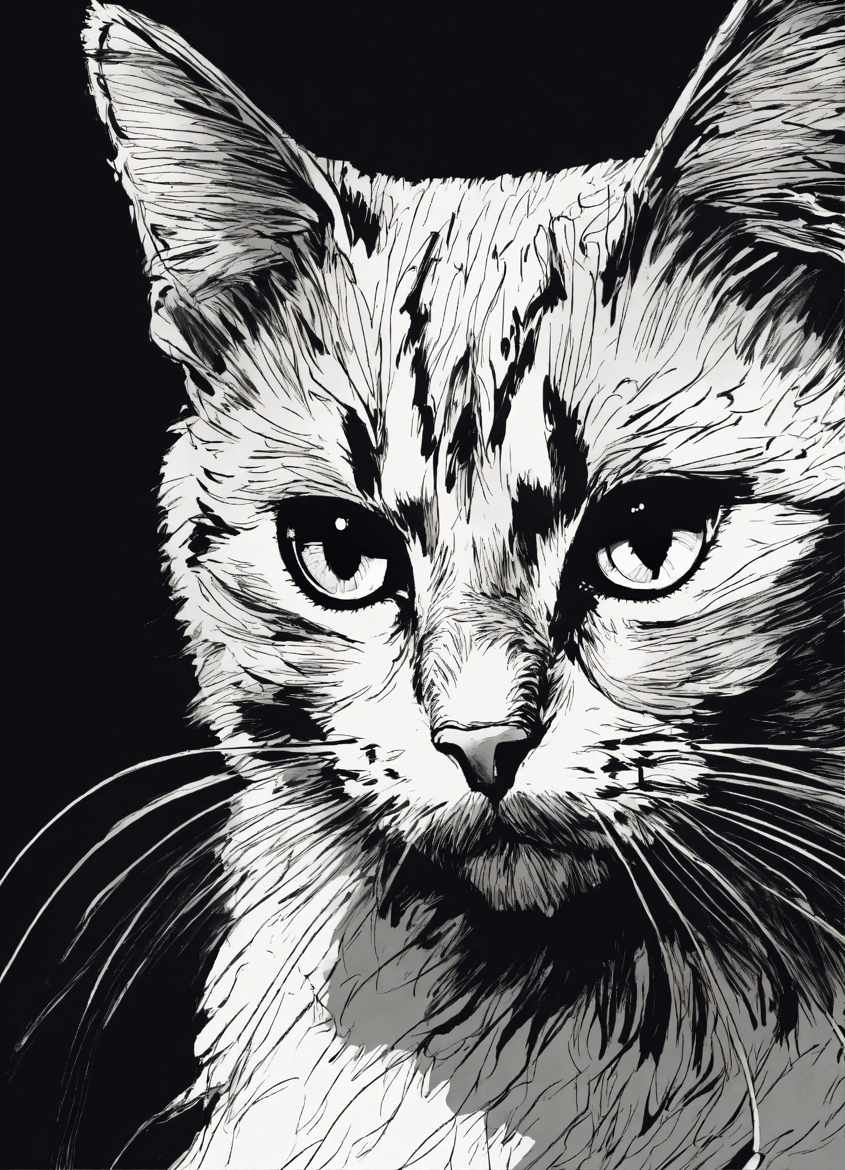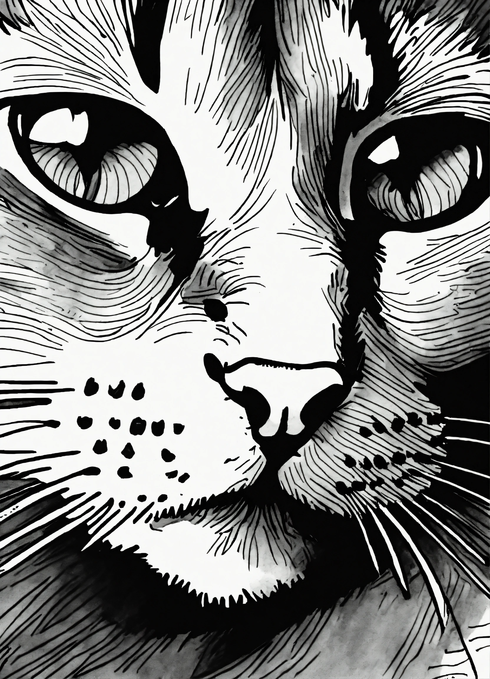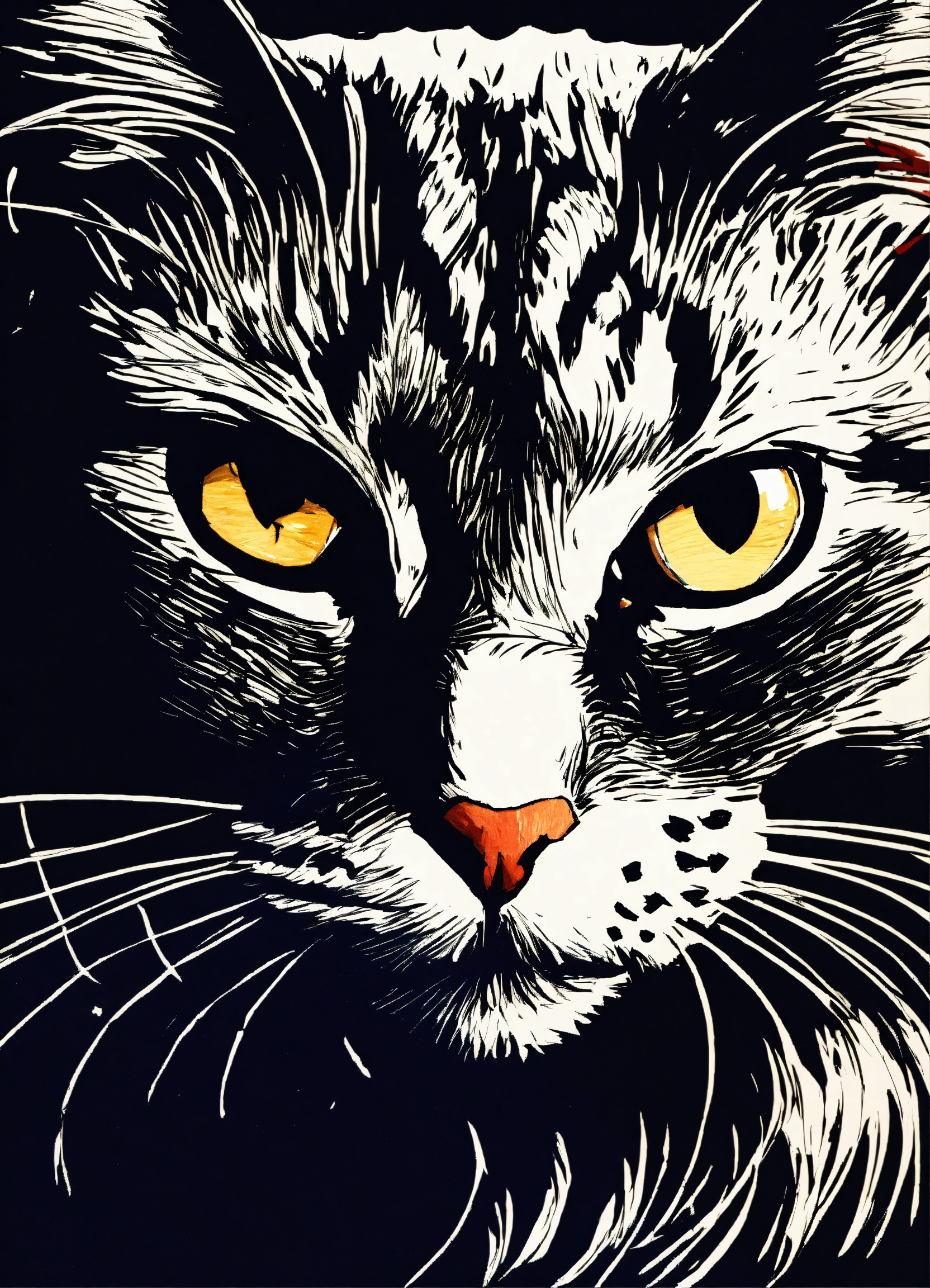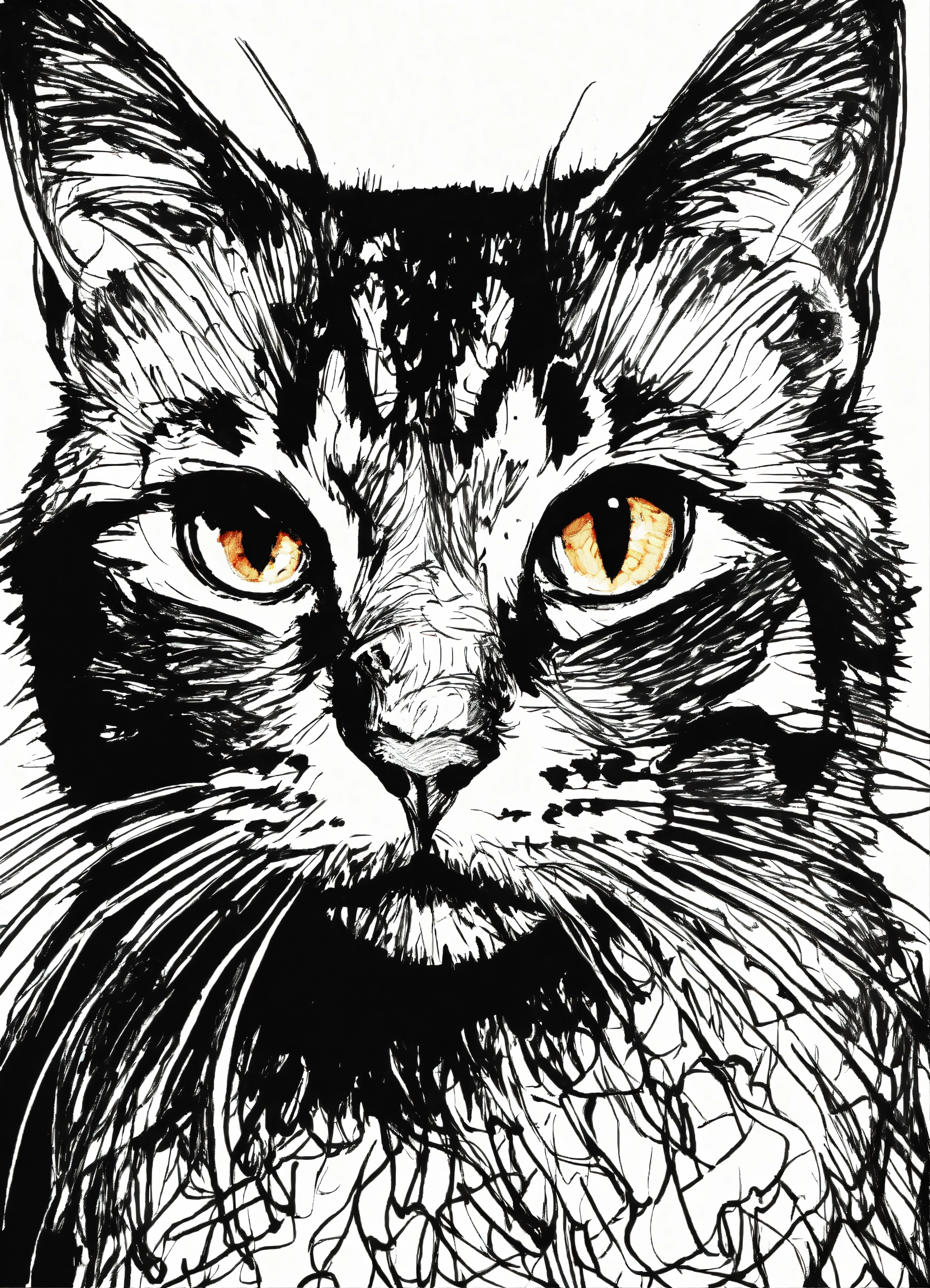 Scratchy pen strokes, blind contour, fisheye perspective closeup, beautiful cat, s face in darkness, stark hatch shaded sketchy scribbly, ink, strong angular shapes, woodcut shading, pen strokes, pouty lips, hungry eyes, minimalist realistic, anime proportions, distorted perspective