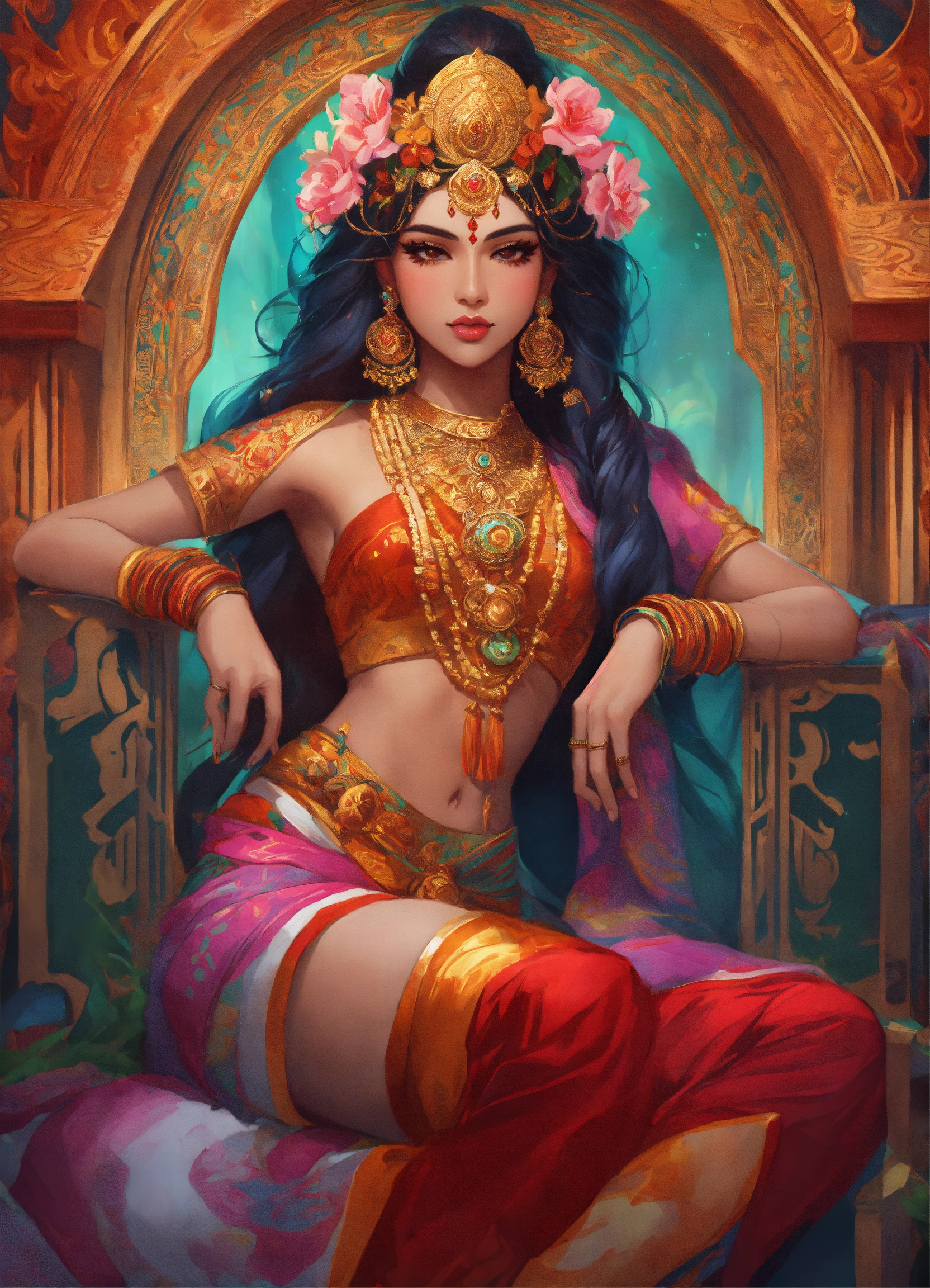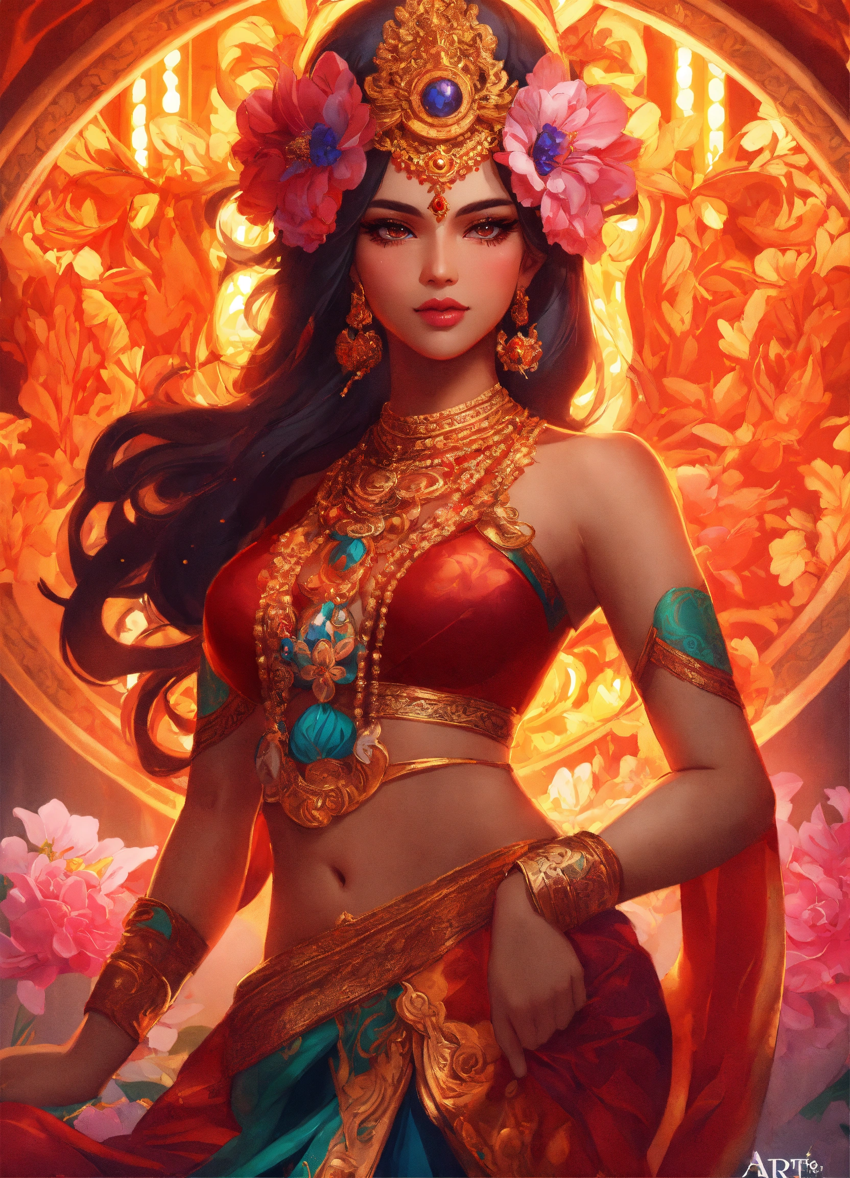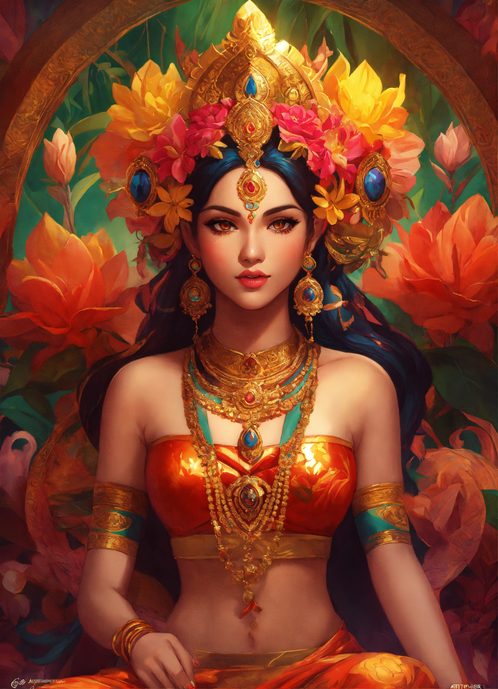 Portrait of goddess devi sri, javanese, legs, intricate, vibrant colors, fair skin, maximalist, 8k photo, animestyle, by artgerm, trending on artstation