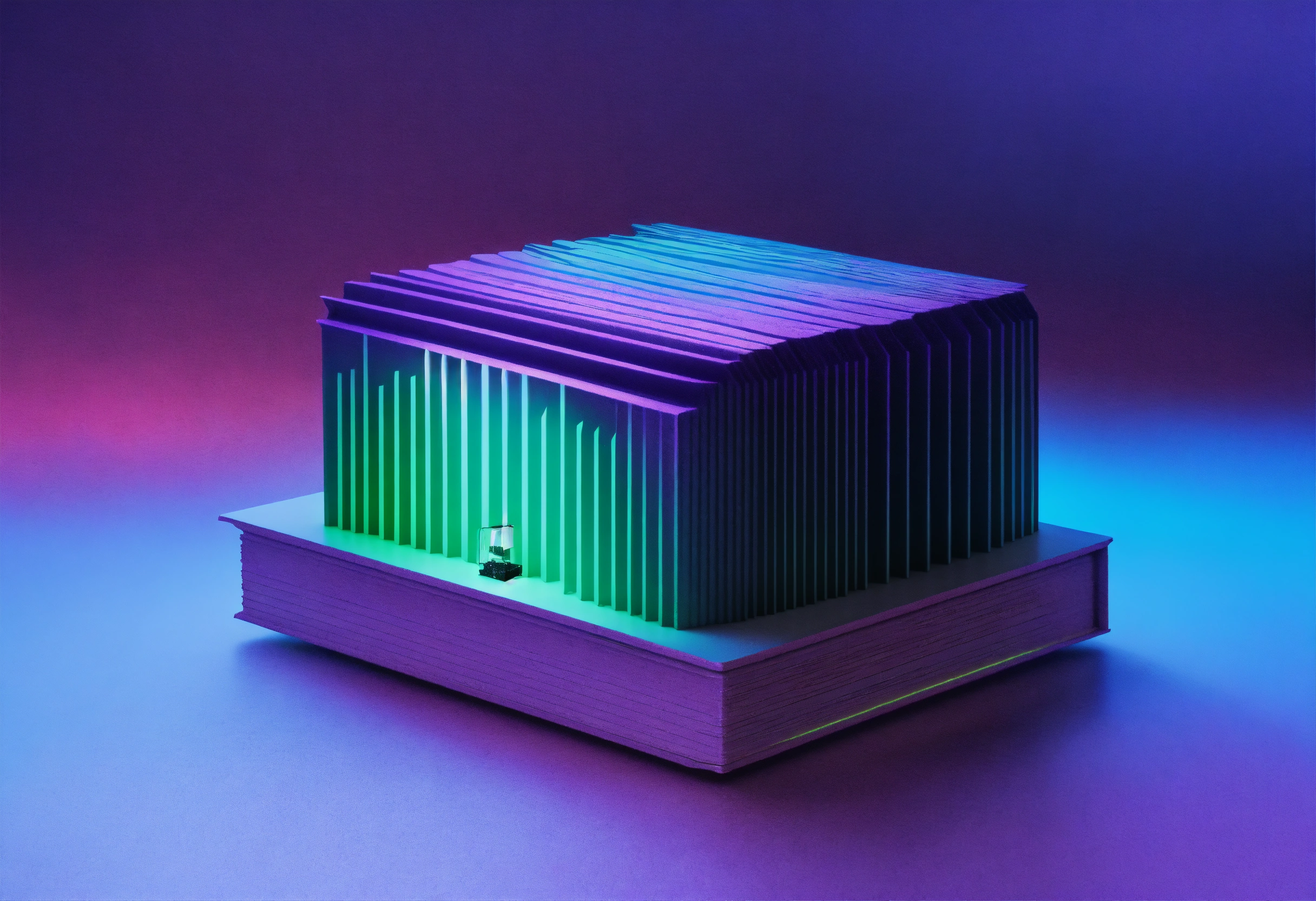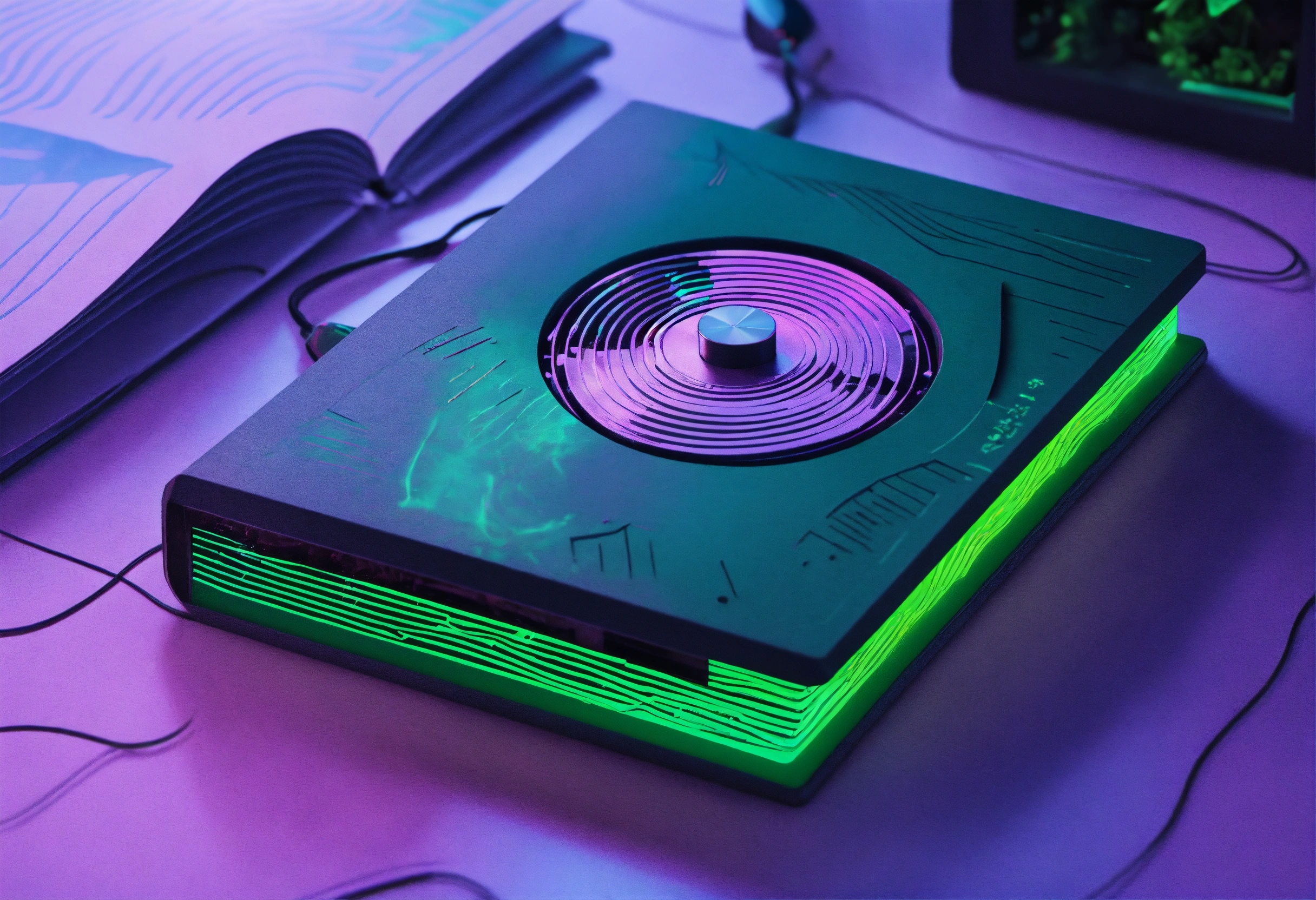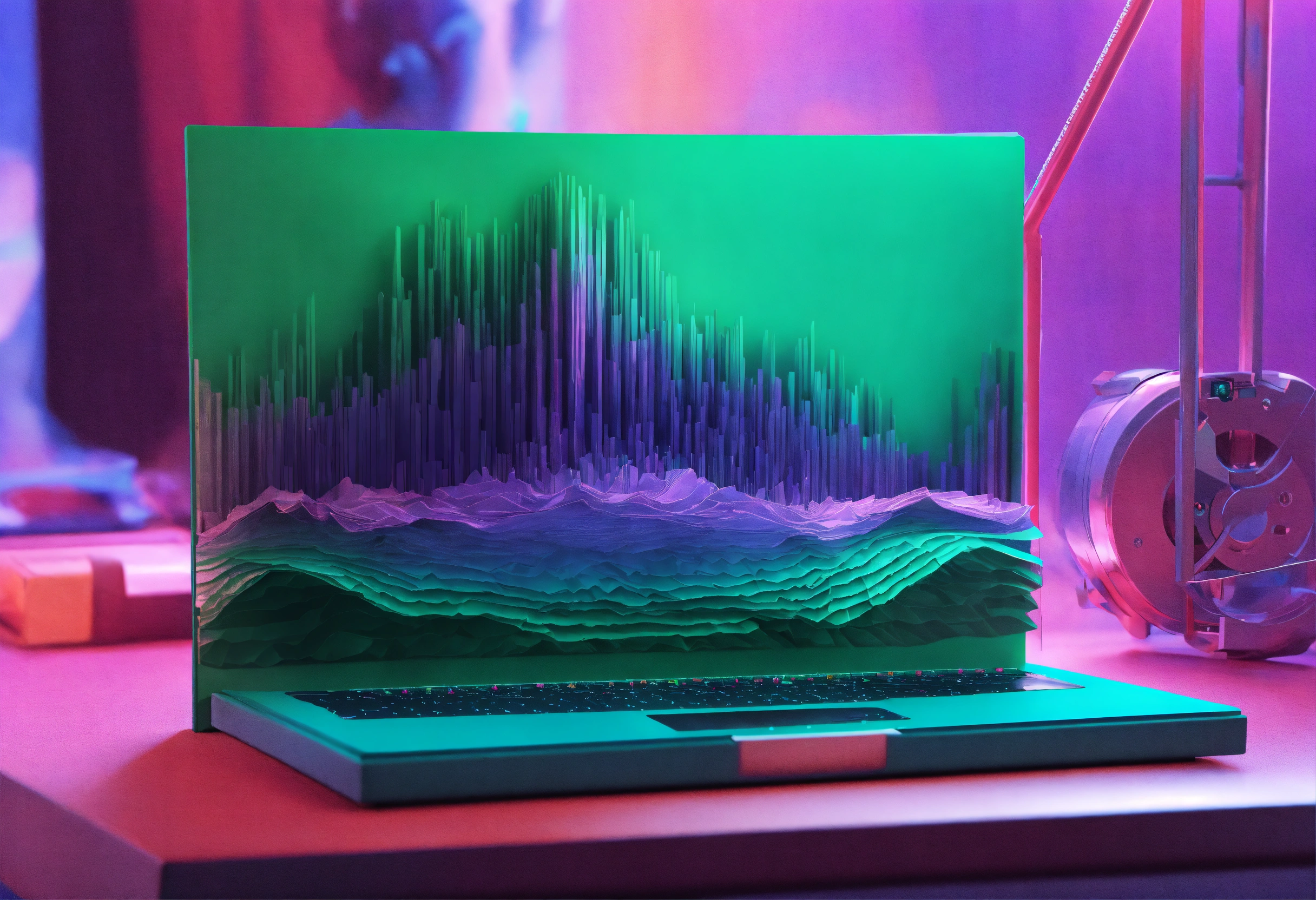 3d render of an audio spectrogram emerging from the cover of a multi-spine obsidian notebook. medium-sized centered. by martine johanna and simon stalenhag and chie yoshii and casey weldon and wlop dynamic, particulate, intricate, smooth, sharp focus, 8 k, octane render, purple and green ambient light