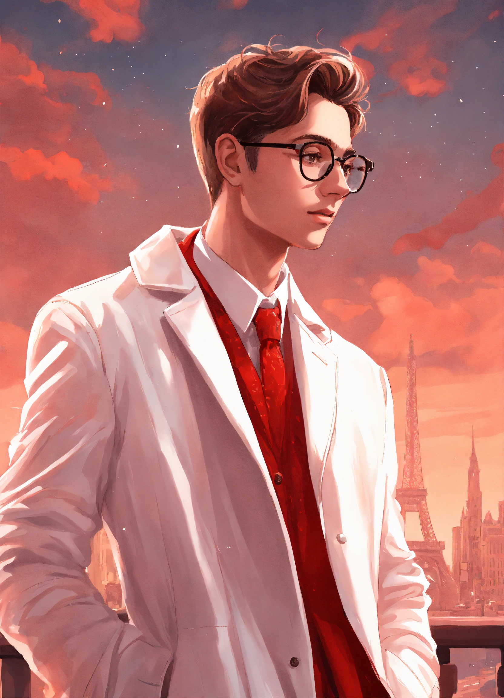Young and beautiful optical boy, glasses, white coat, standing, full figure. talk to a beautiful lady dressed in red, ultra detailed illustration in soft pastel colors, cartoon mode. on the background whites with glasses