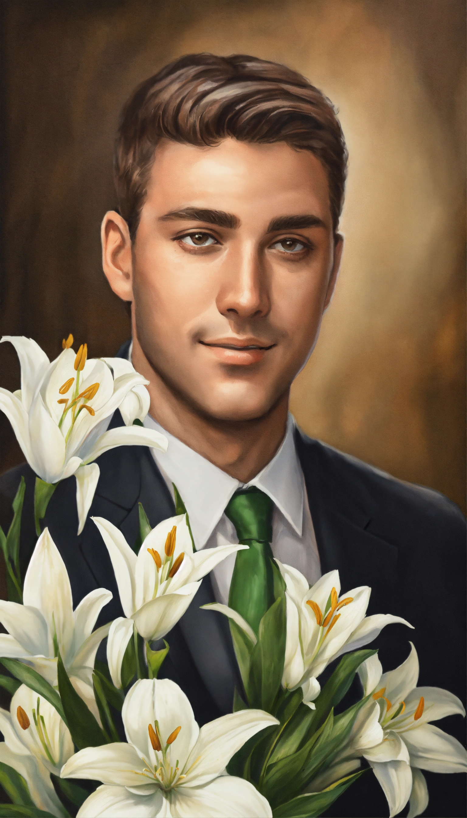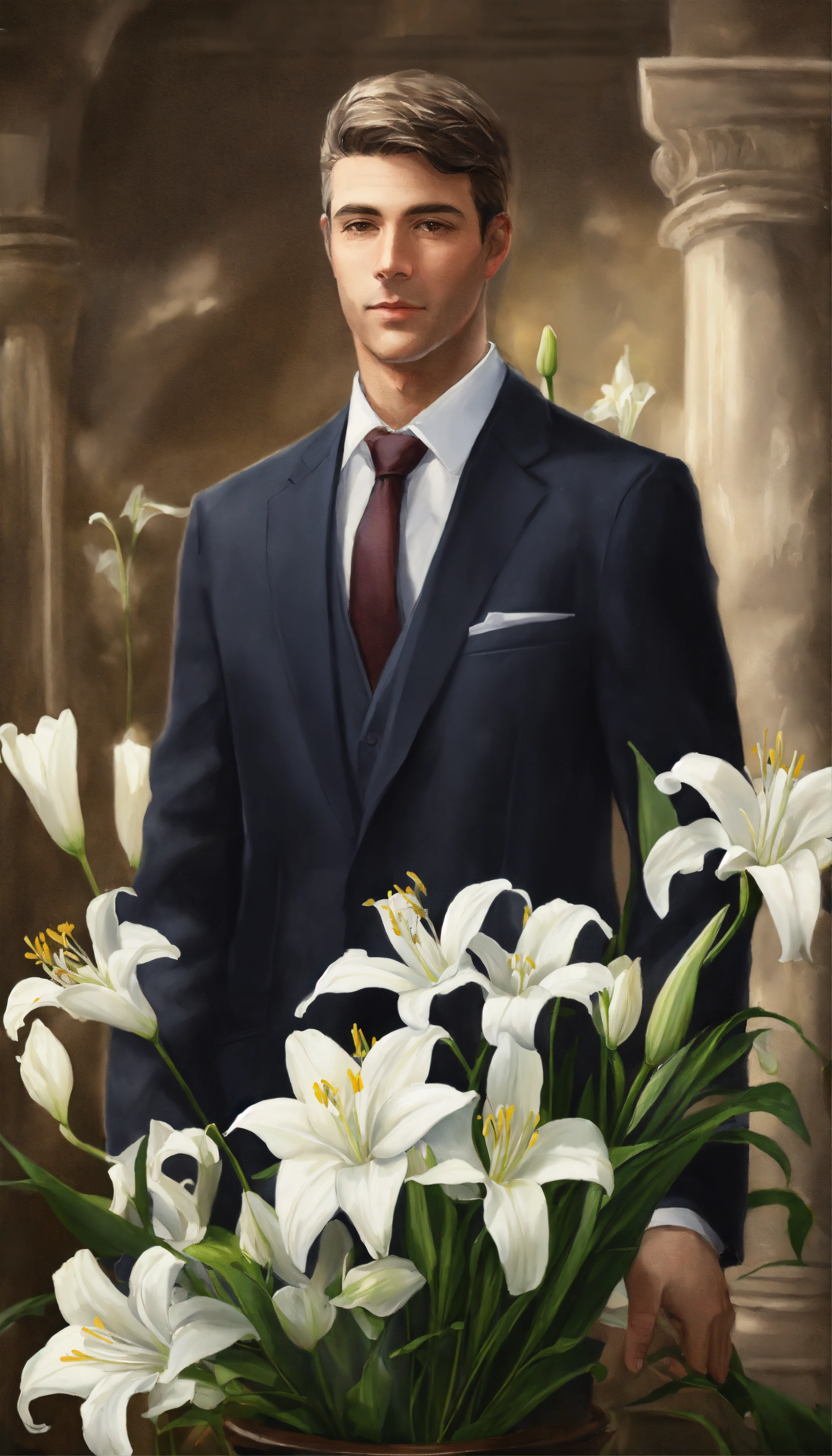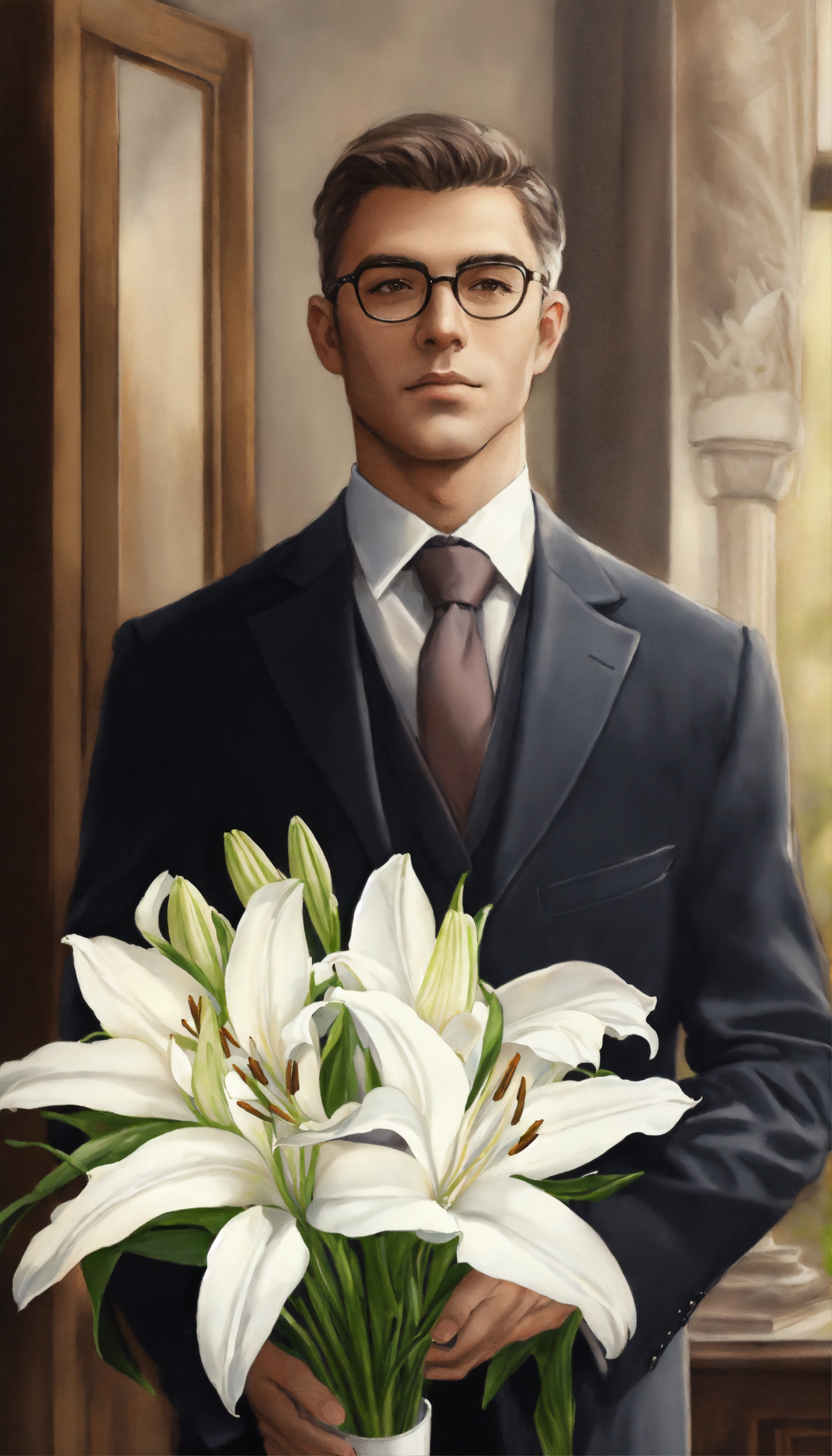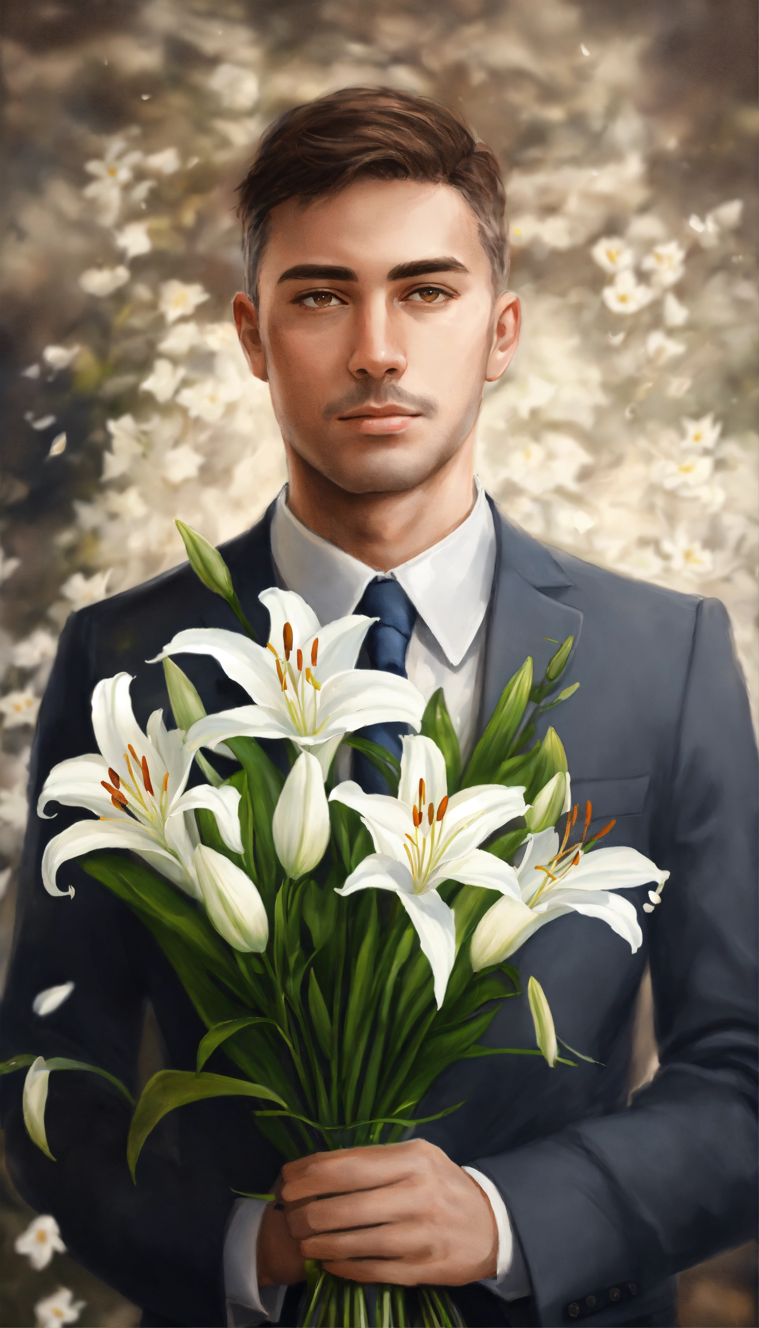 Drawing of a lawyer man with a bouquet of white lilies realistic