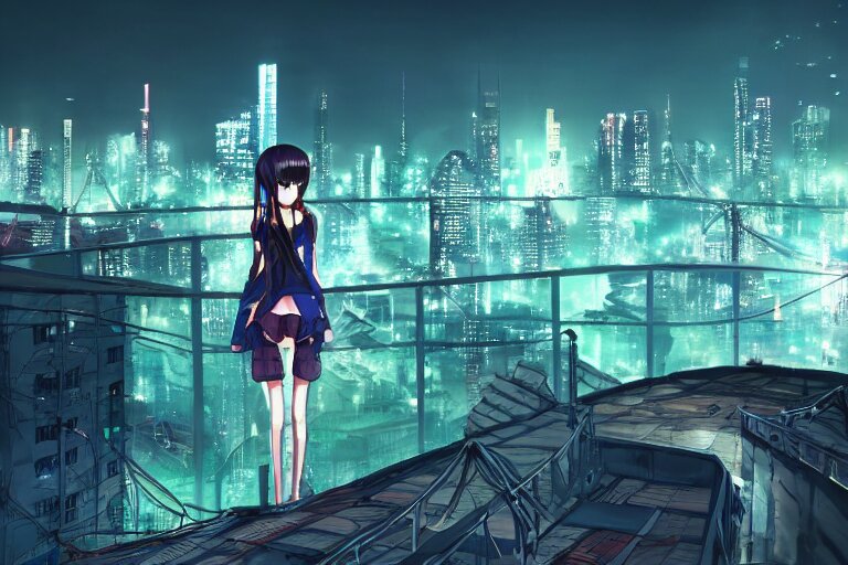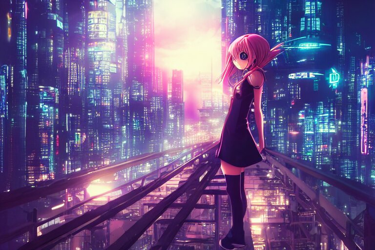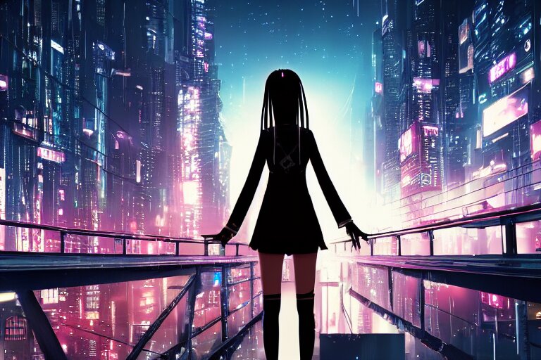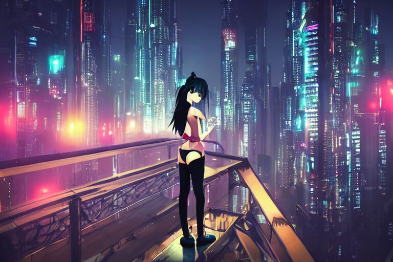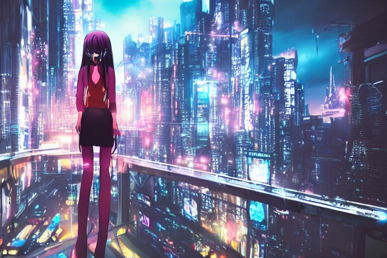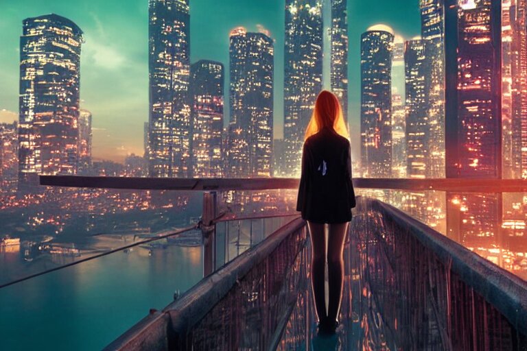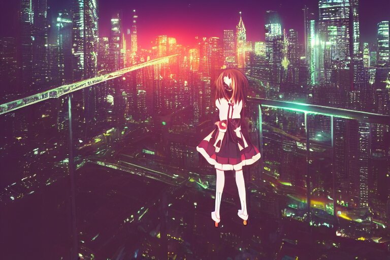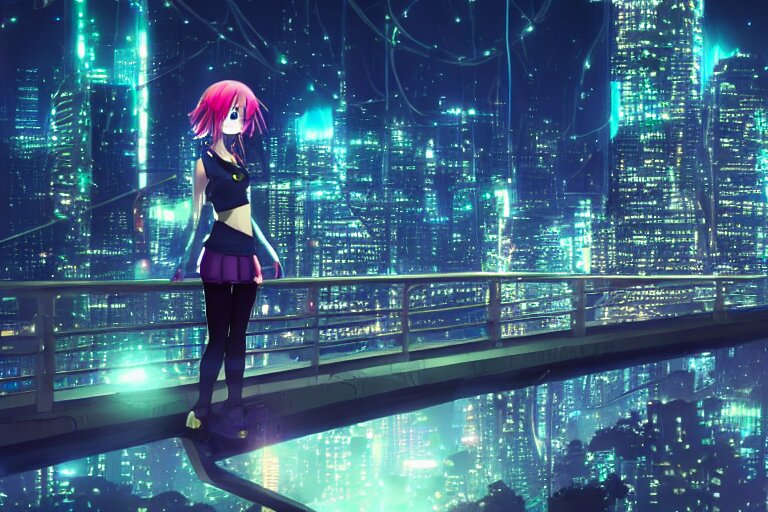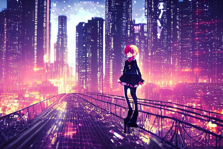 A beautiful picture of anime girl standing on top of a bridge over a city at night