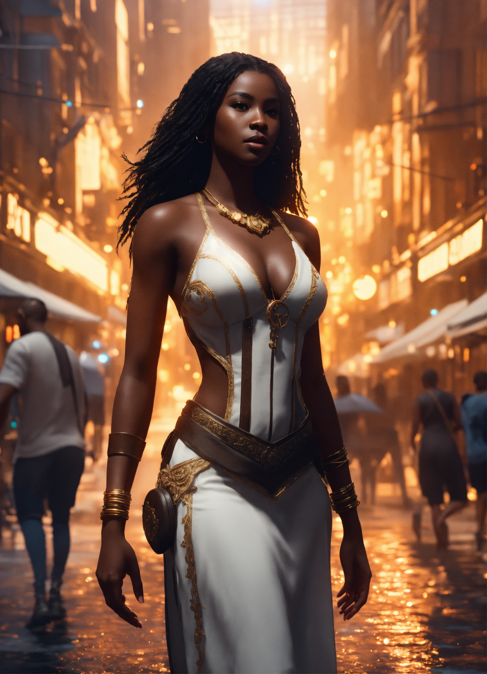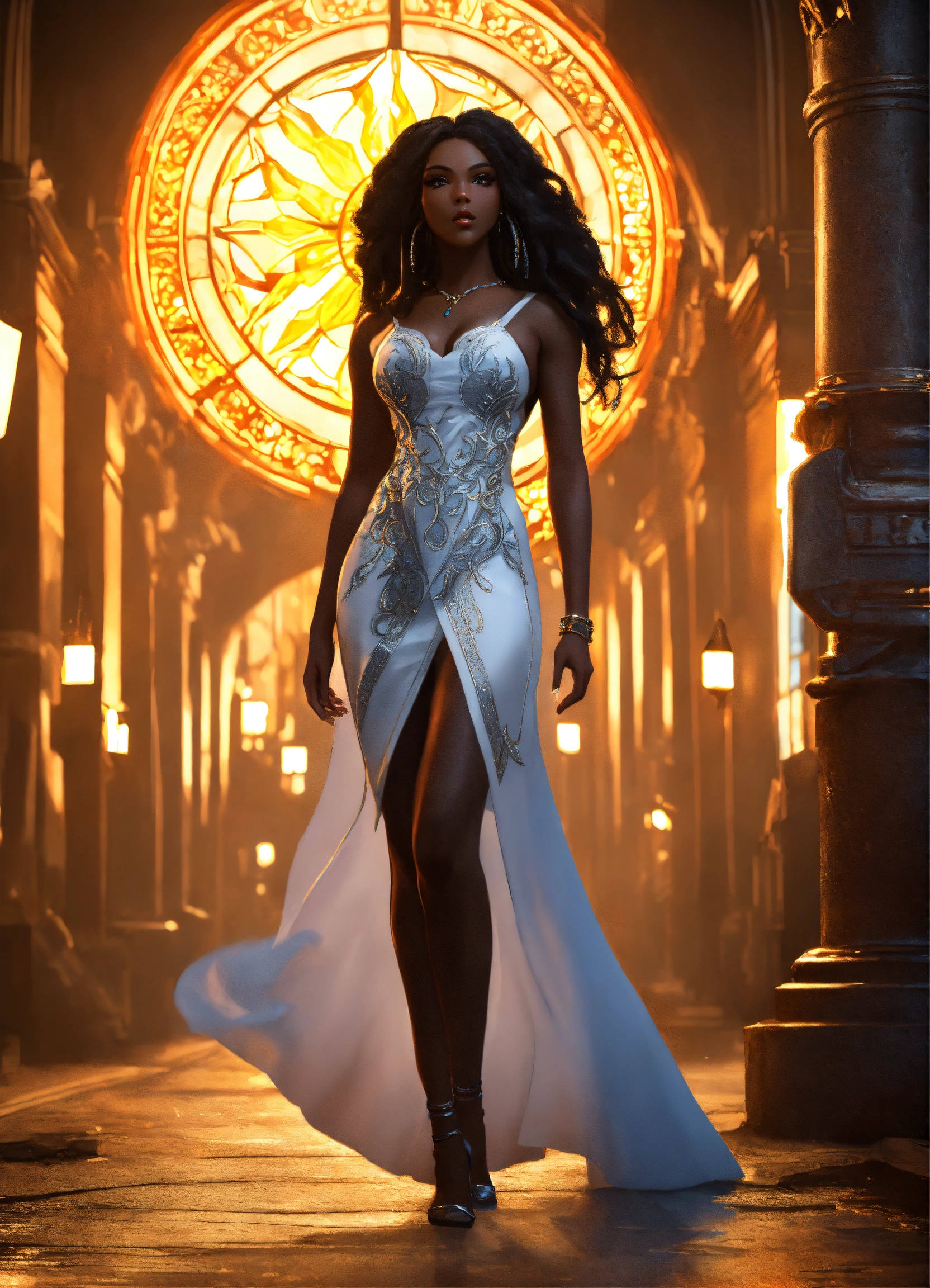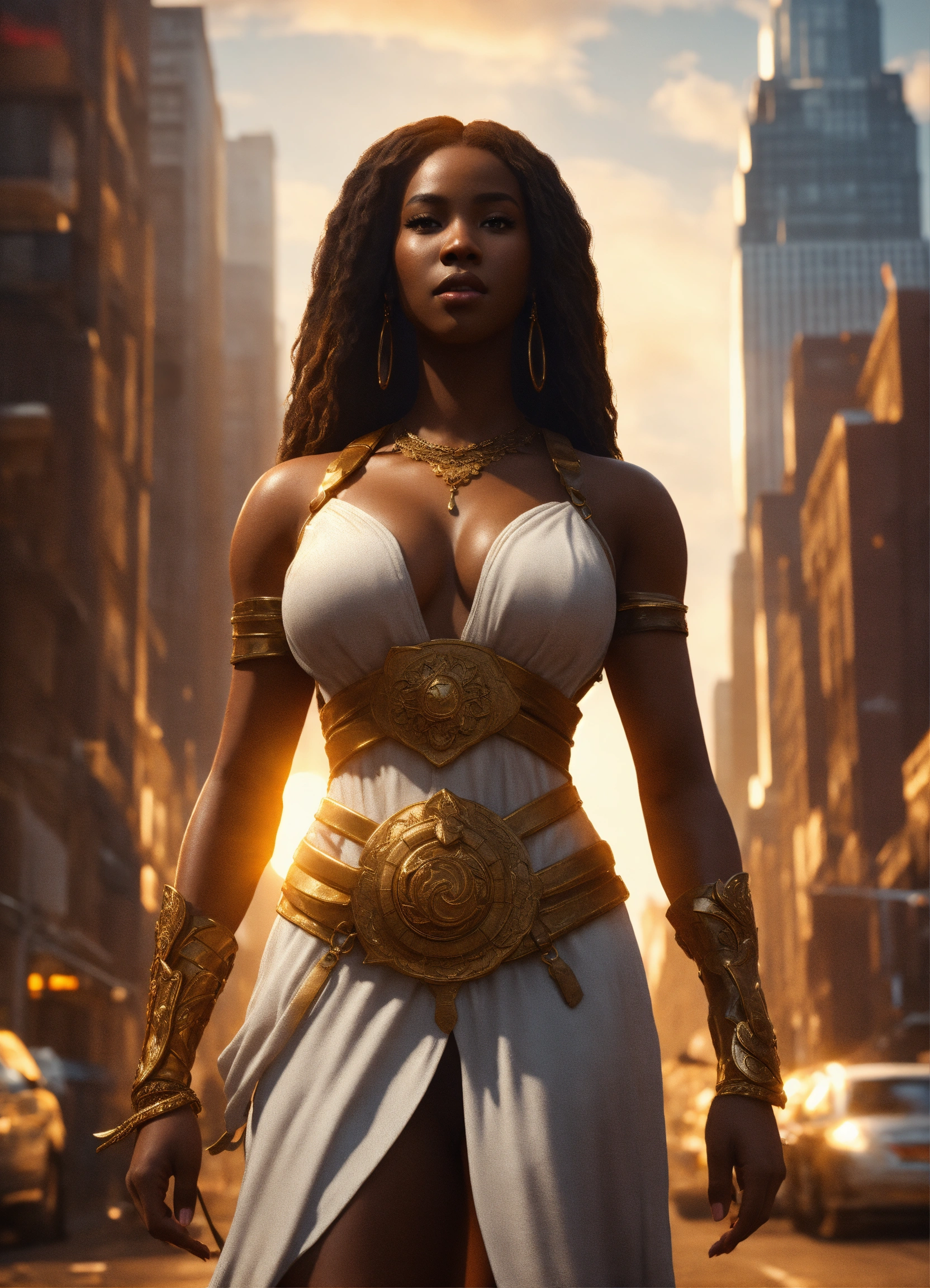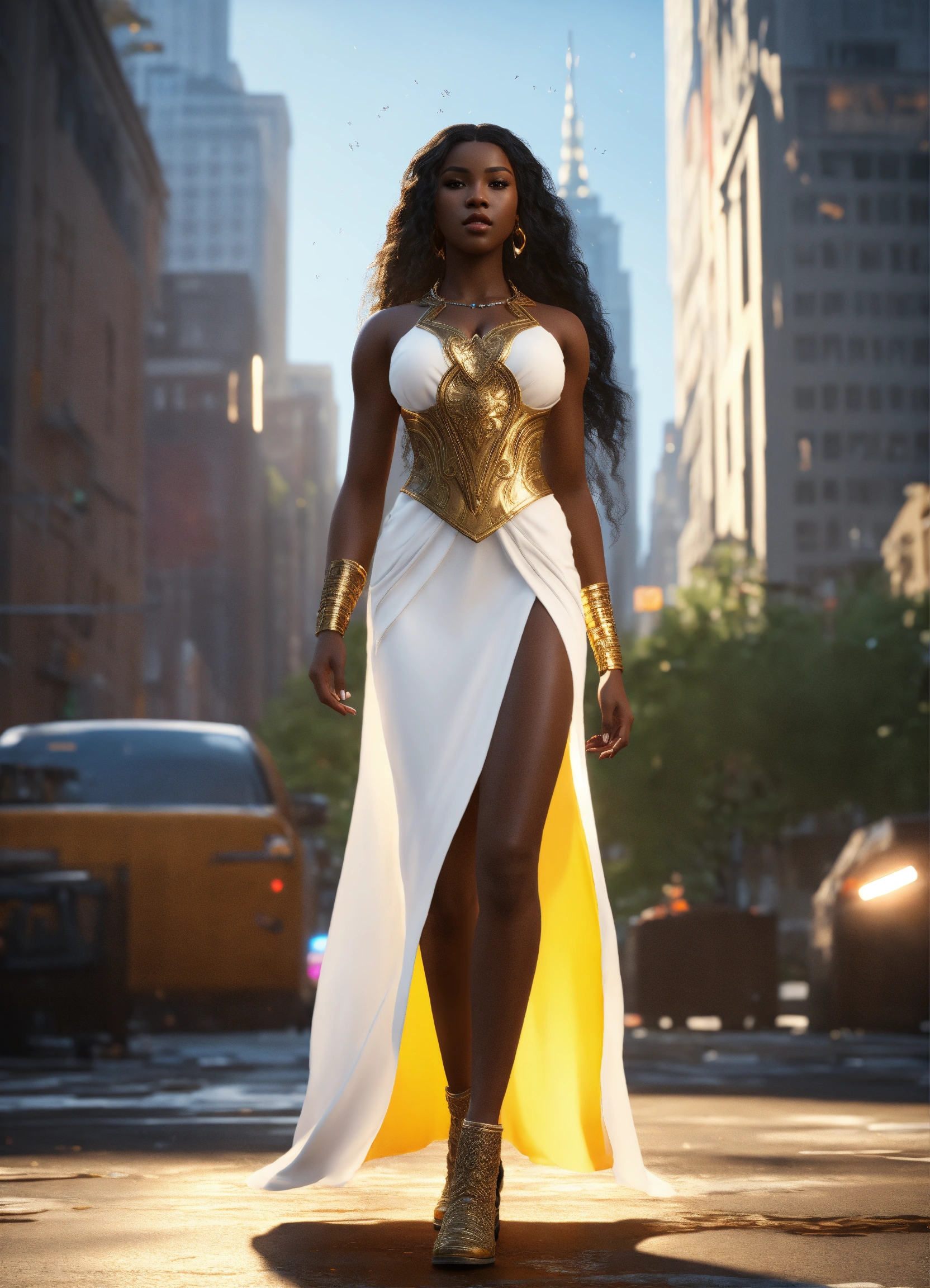 Full body of a beautilul, gorgeous dark skin, shapely black female goddess of war with long flowing hair, perfect dark skin, perfect face, full lips most beautiful woman in the world, shapely hour-glass figure, a a dark skin hero wearing a white sun dress, in new york city, full body, 8k resolution concept art portrait dynamic lighting hyperdetailed intricately detailed splash art trending on artstation unreal engine 5 volumetric lighting