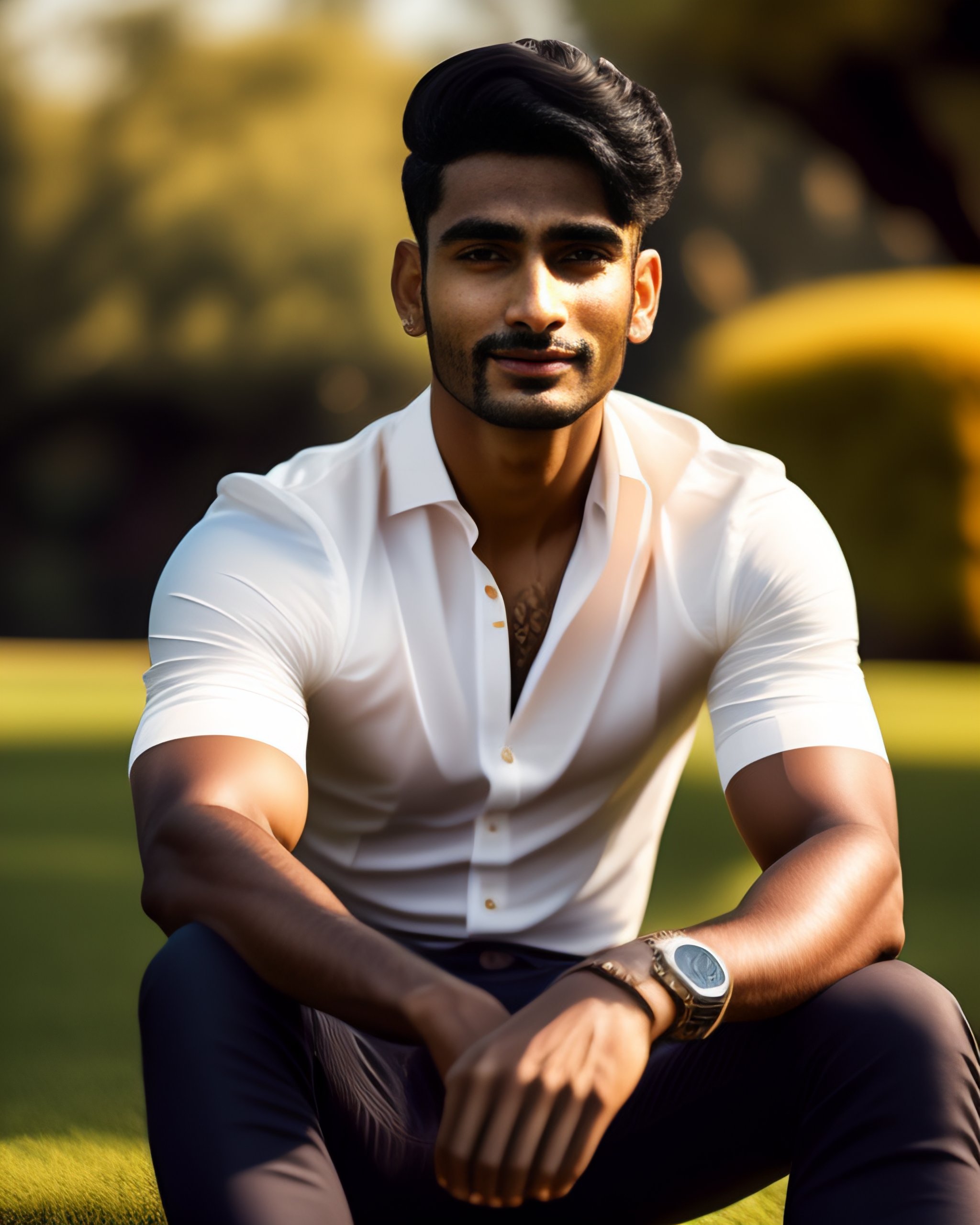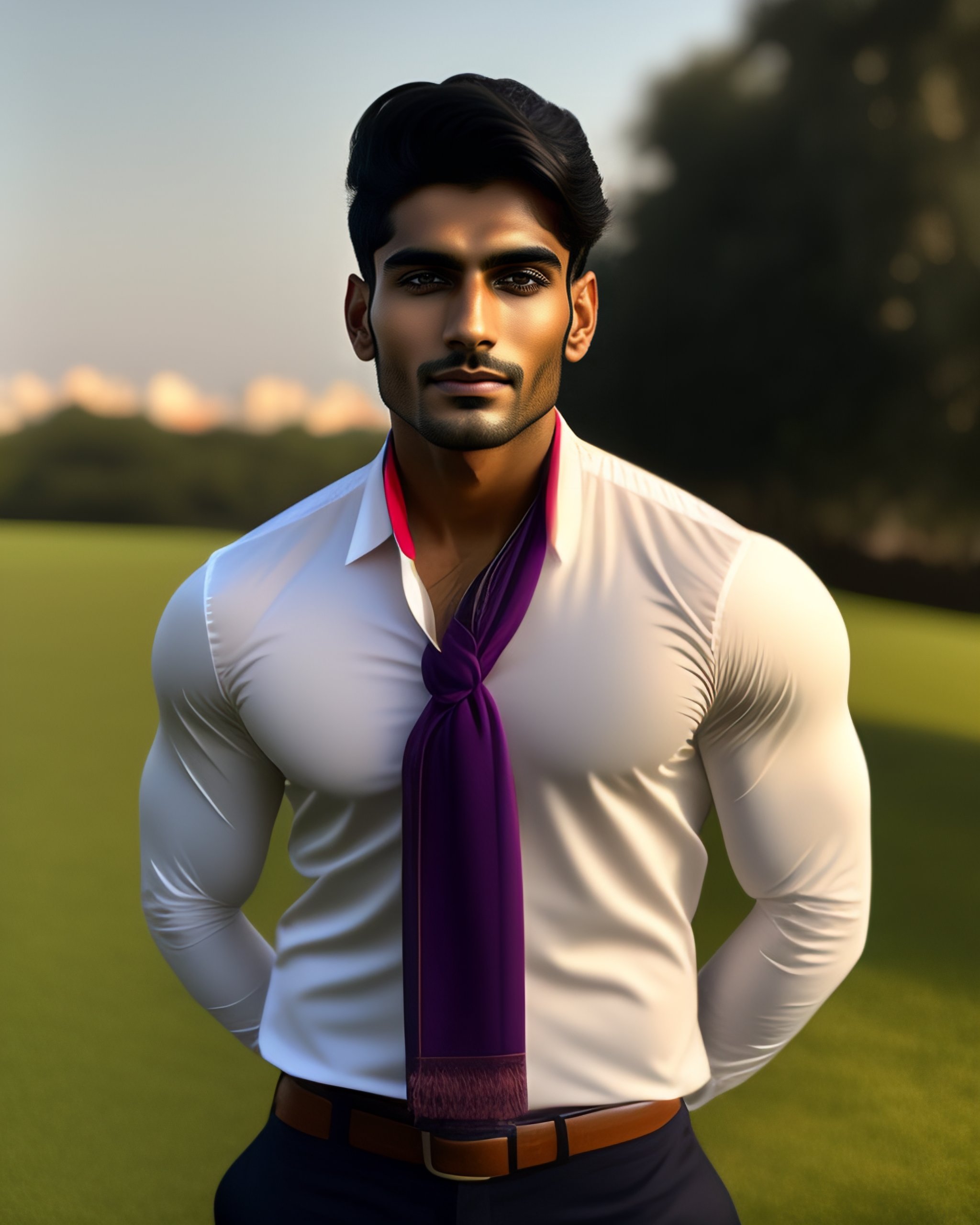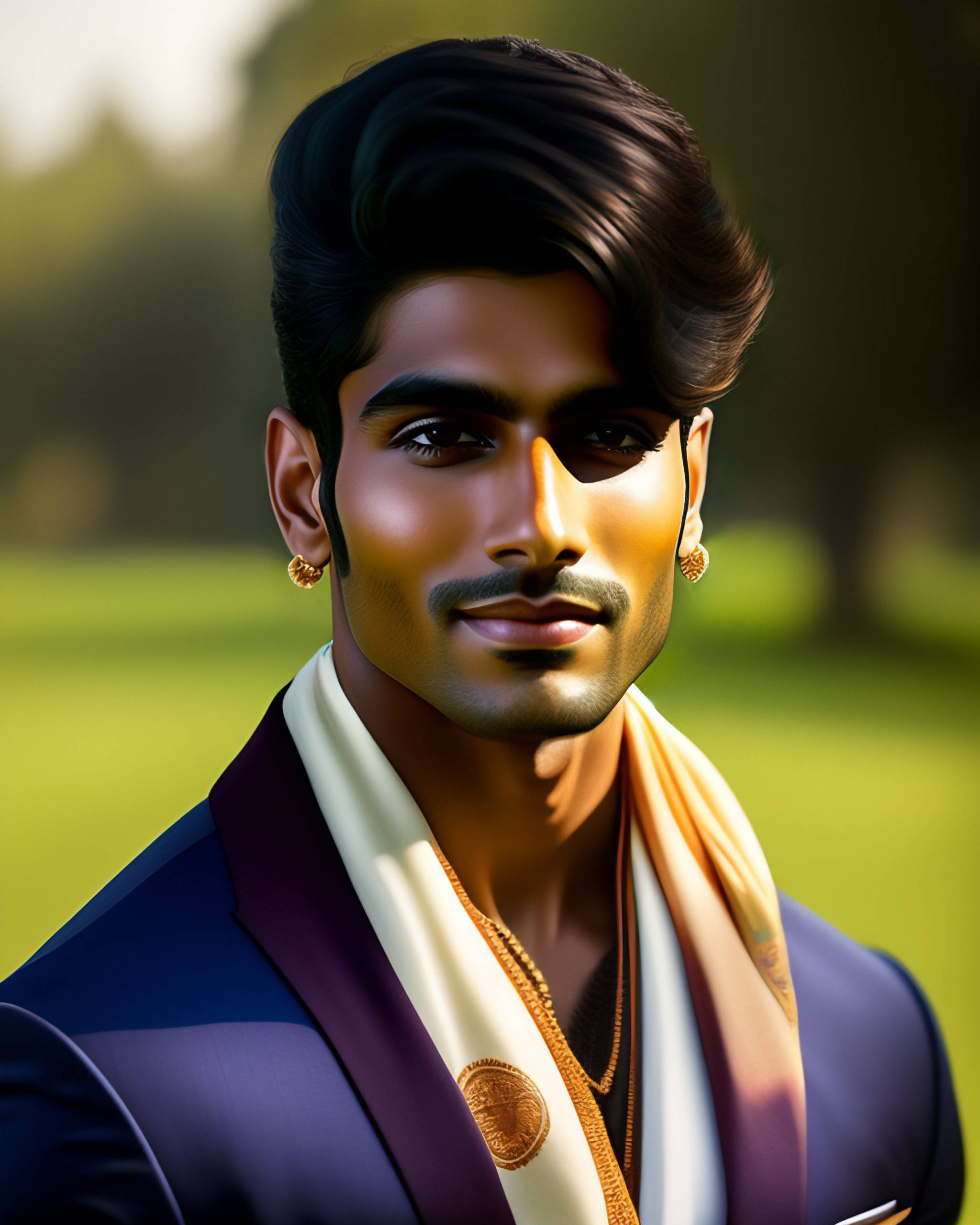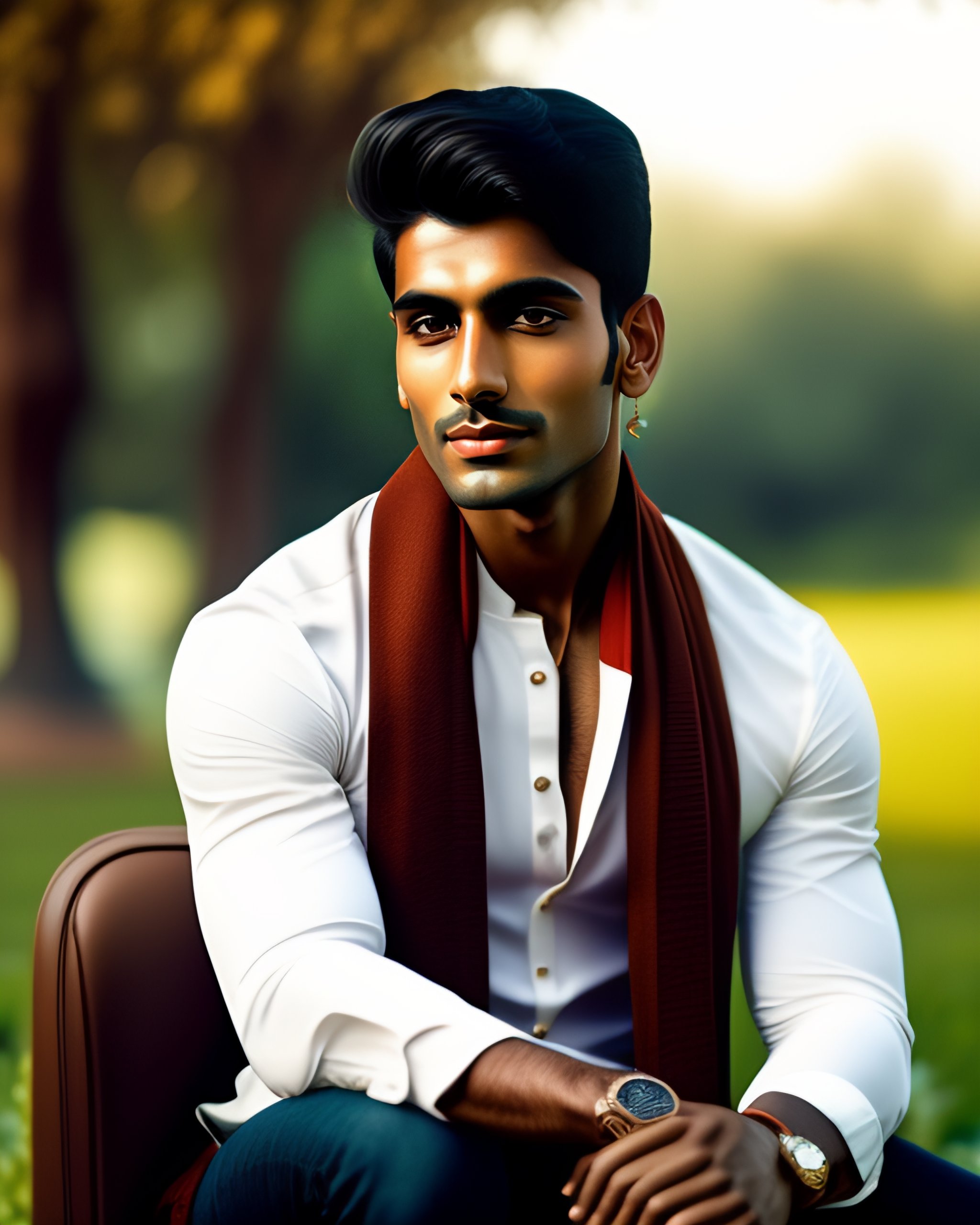A slim handsome indian boy with smooth brown skin wearing a shirt and an elegant scarf sat on the grass posing for a picture at daytime, natural location, beautiful portrait, intricate frame, tender depiction, detailed, sharp focus, clear lighting, joyful, classical oil painting