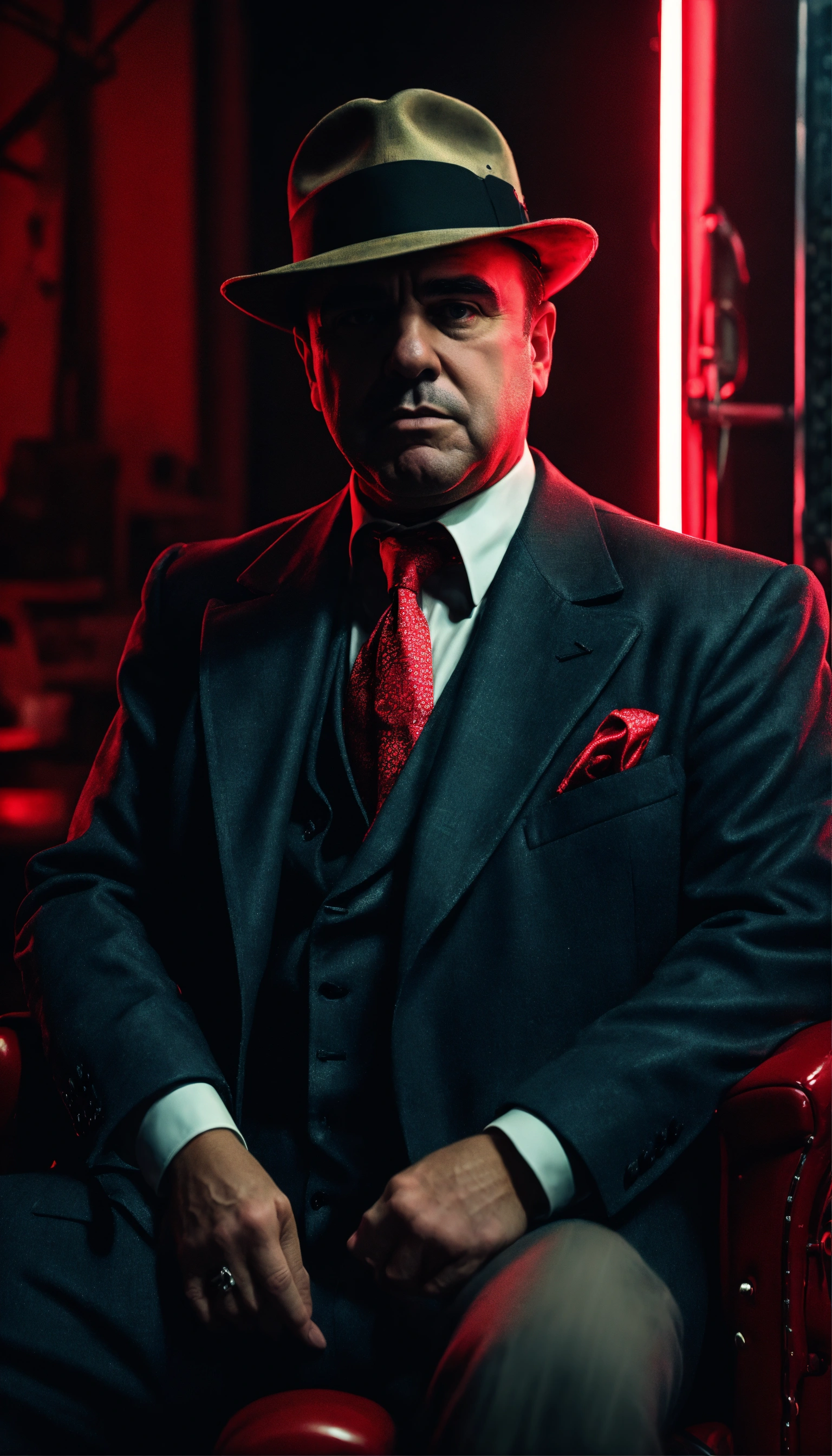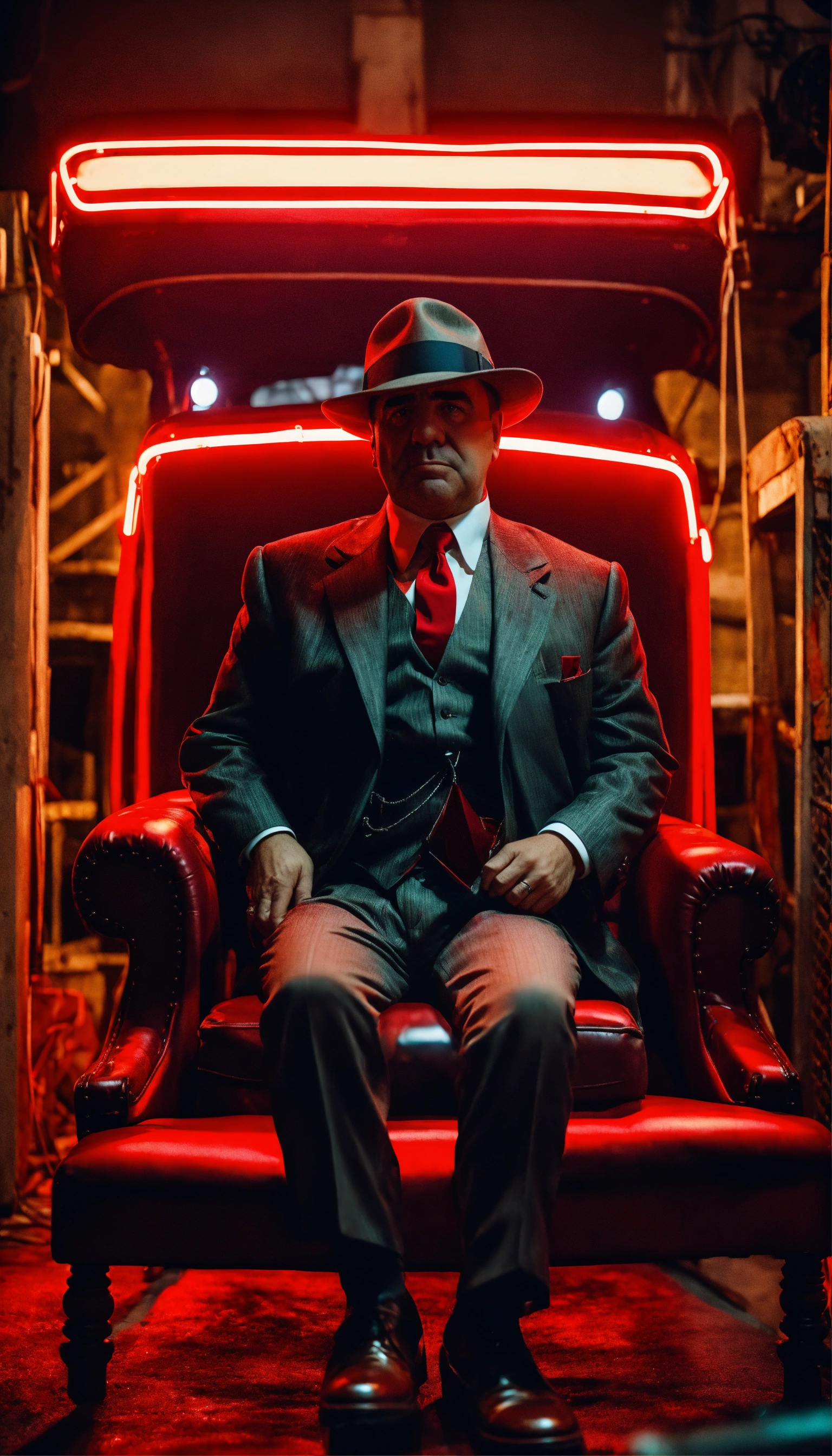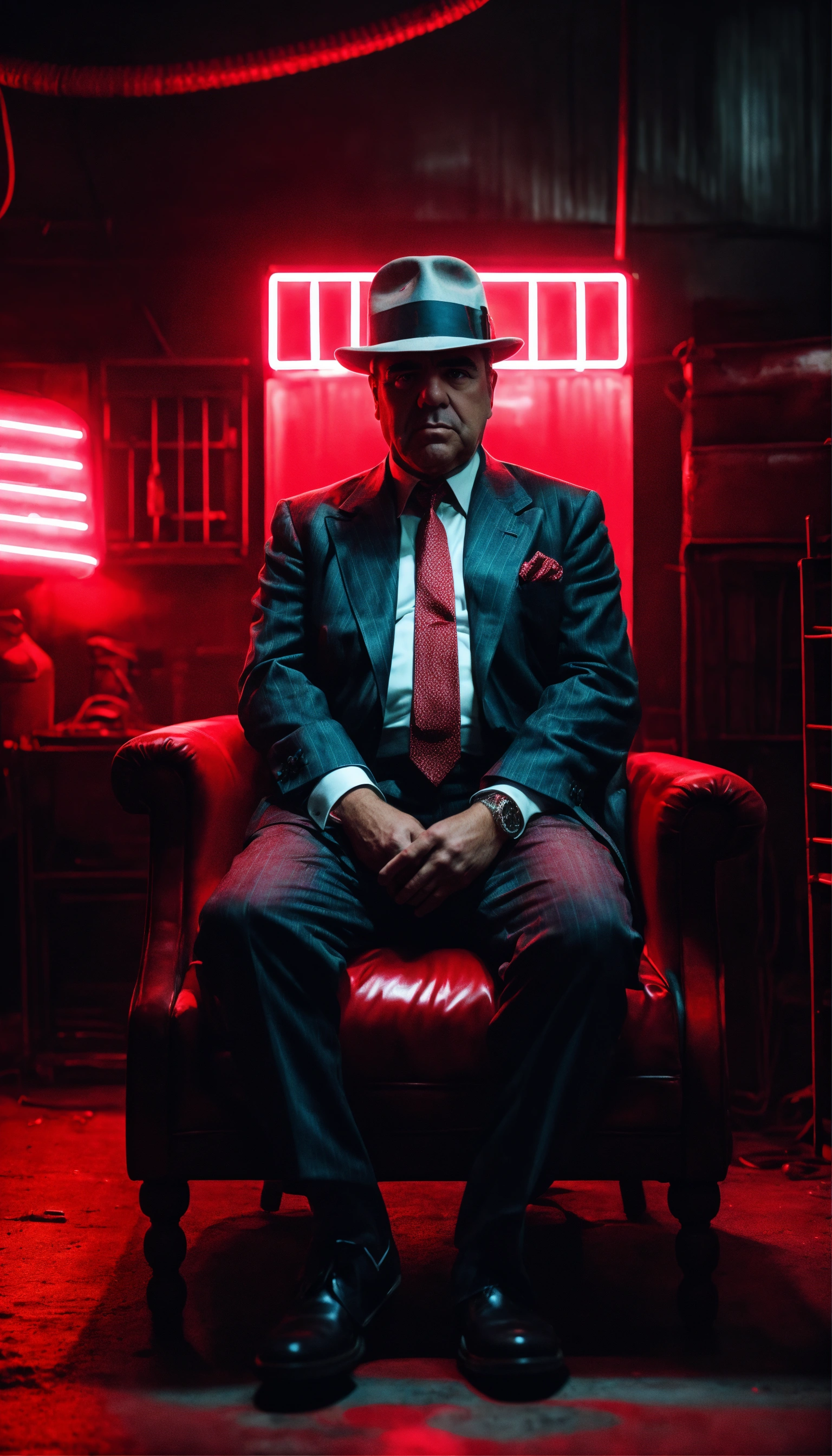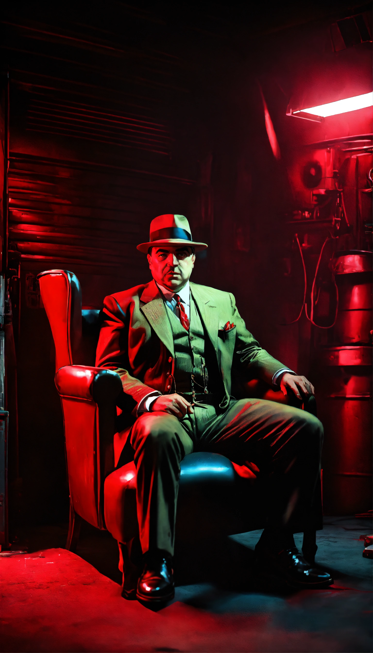 Portrait realistic of al capone old seat on a chair in a darkness garage face infront the camera with large angle with red neon 8k high quality