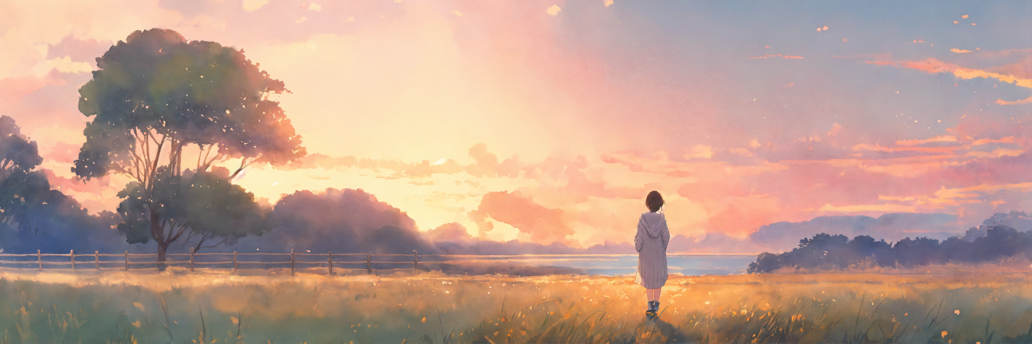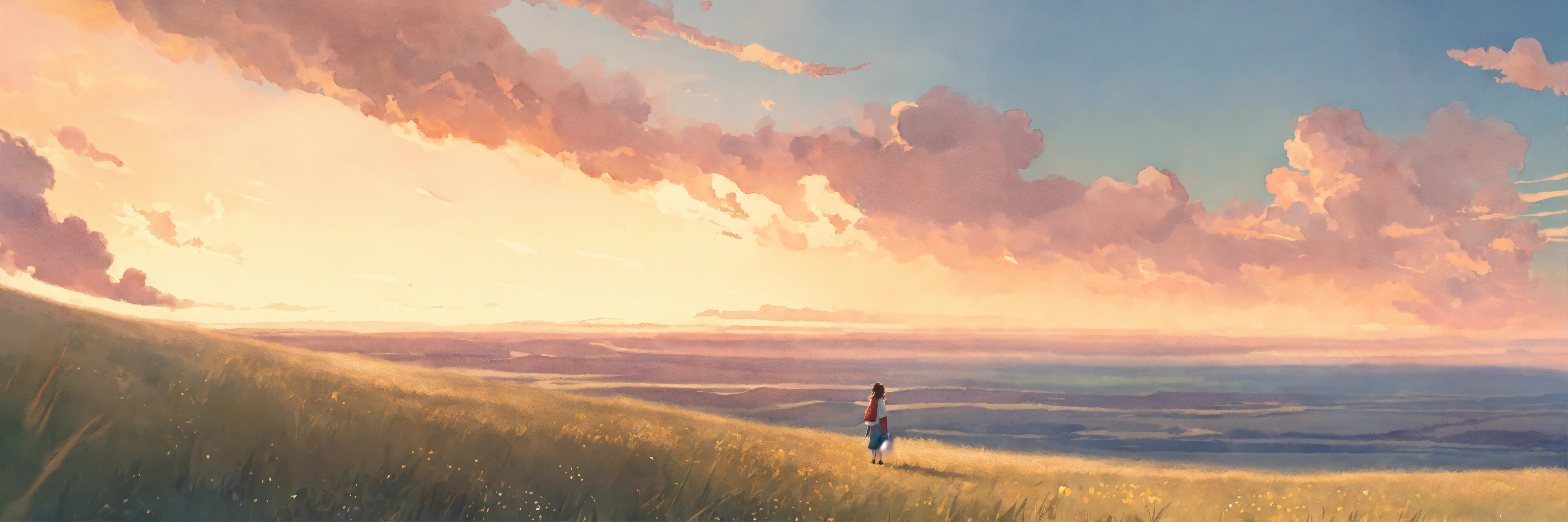Full body watercolor illustration of aa minuscule 20 years old women standing in the middle of an immense magical setting, facing backwards, centered, small figure in large landscape, wearing a long boho sweater, comfortable, stylish, chic, no makeup, effortless, relaxed, casual, laid-back, beautiful light sky, low saturation, muted colors, animation, fantasy art, by makoto shinkai