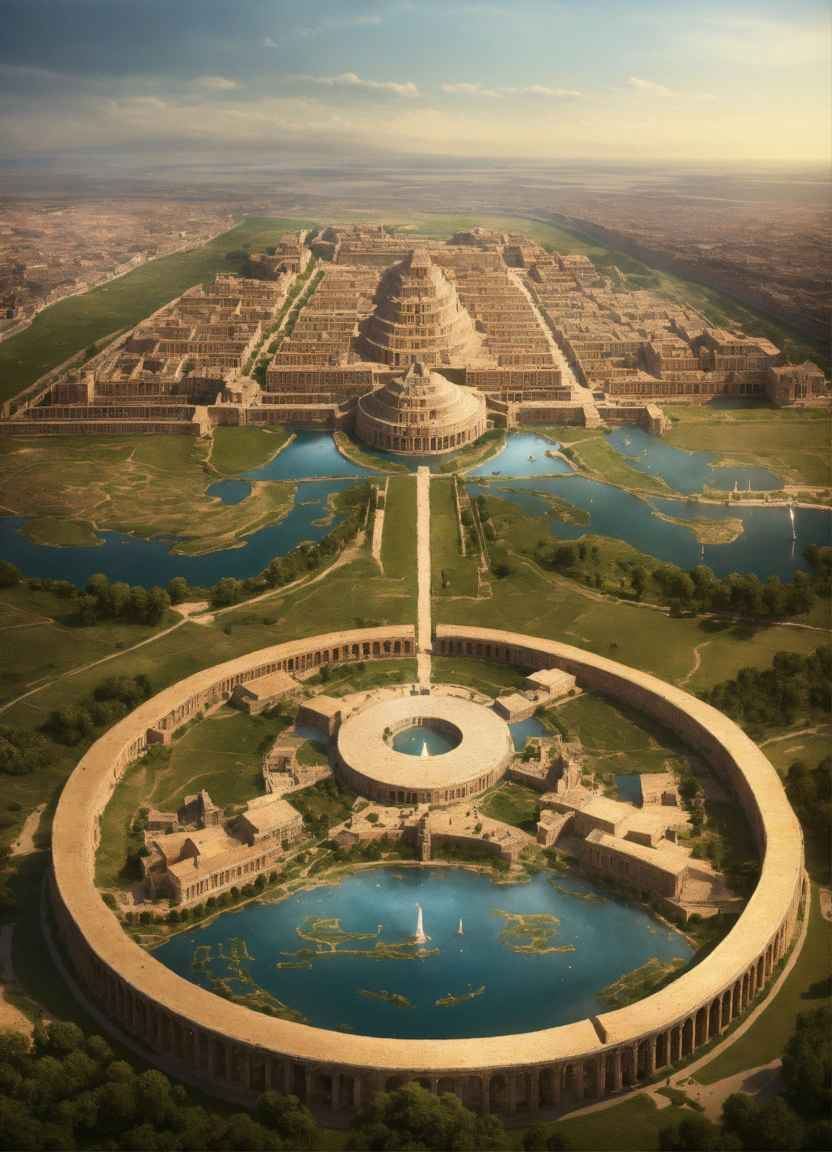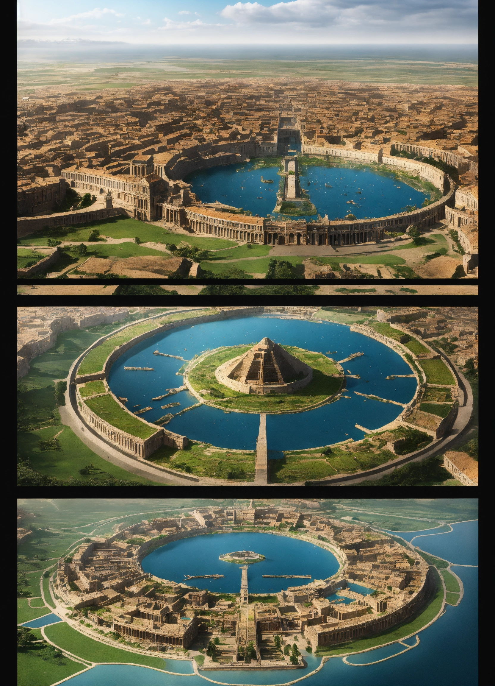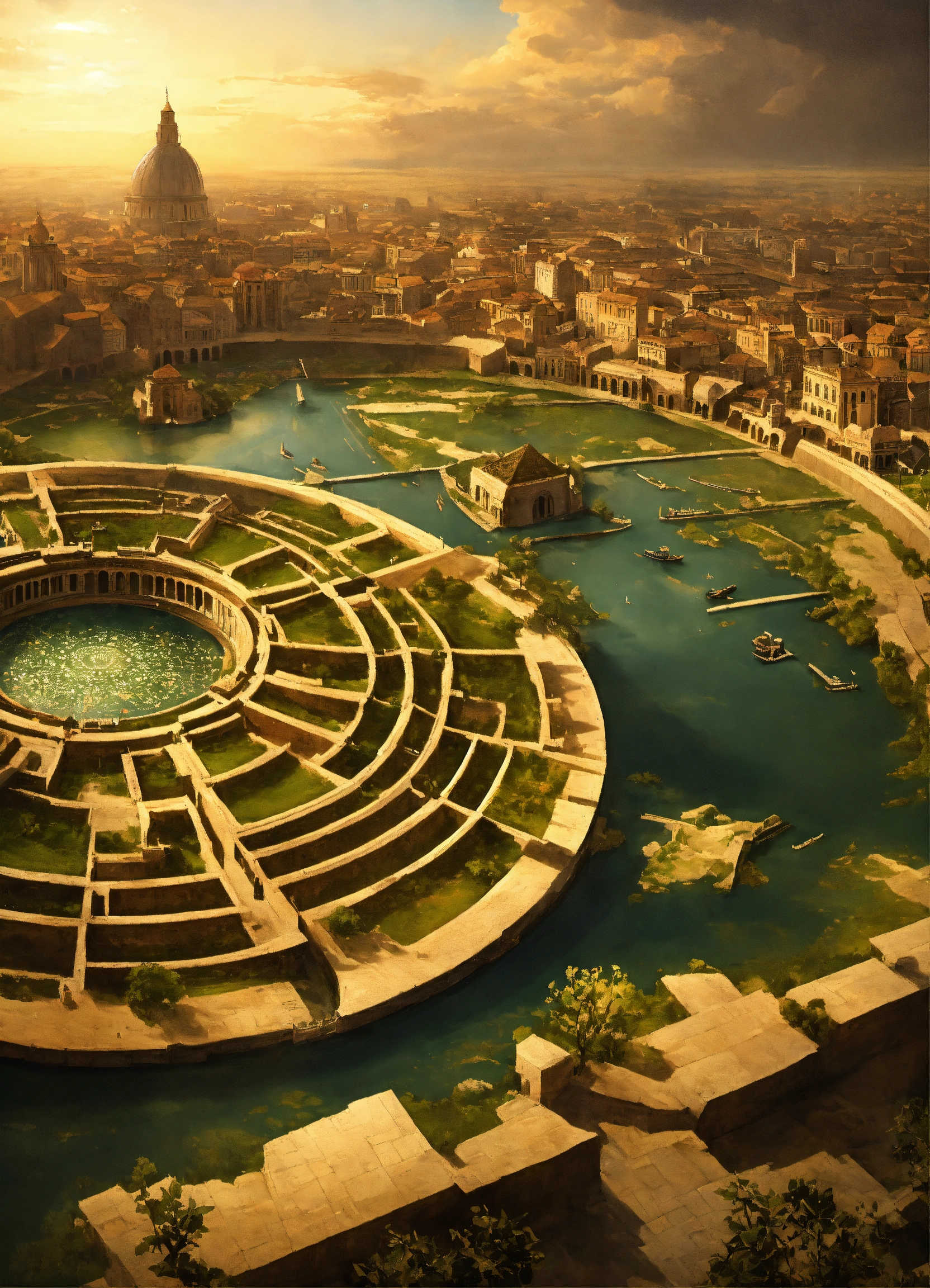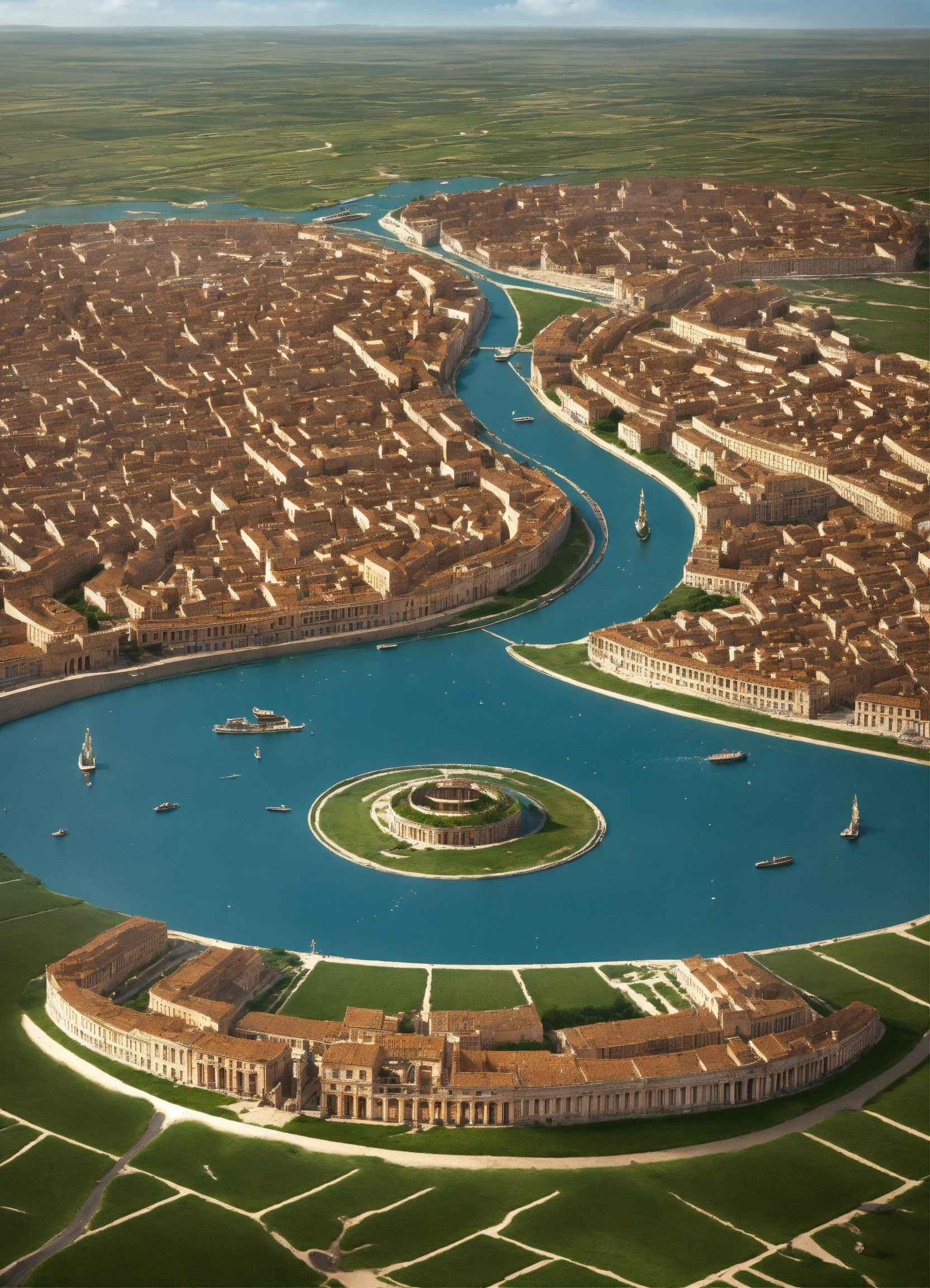 Modern roman city surrounded by a large ring of water, the ring was connected to the ocean with a four canals at each of the four corners, canals also ran inward from the main ring to the city center, outside of the capital city there were huge fields designed for farmers to grow food for the city’s population, at the city center a pyramid stood