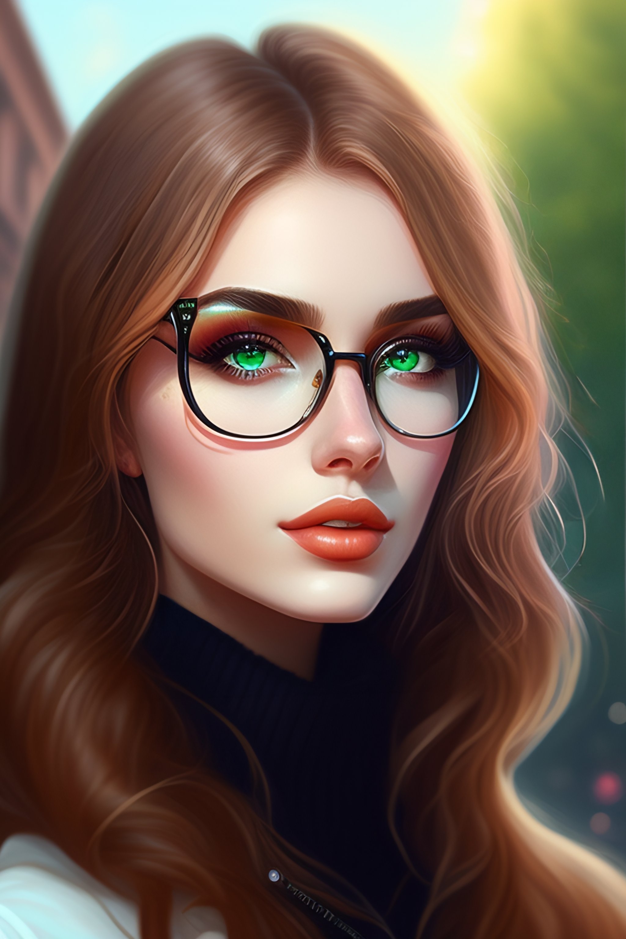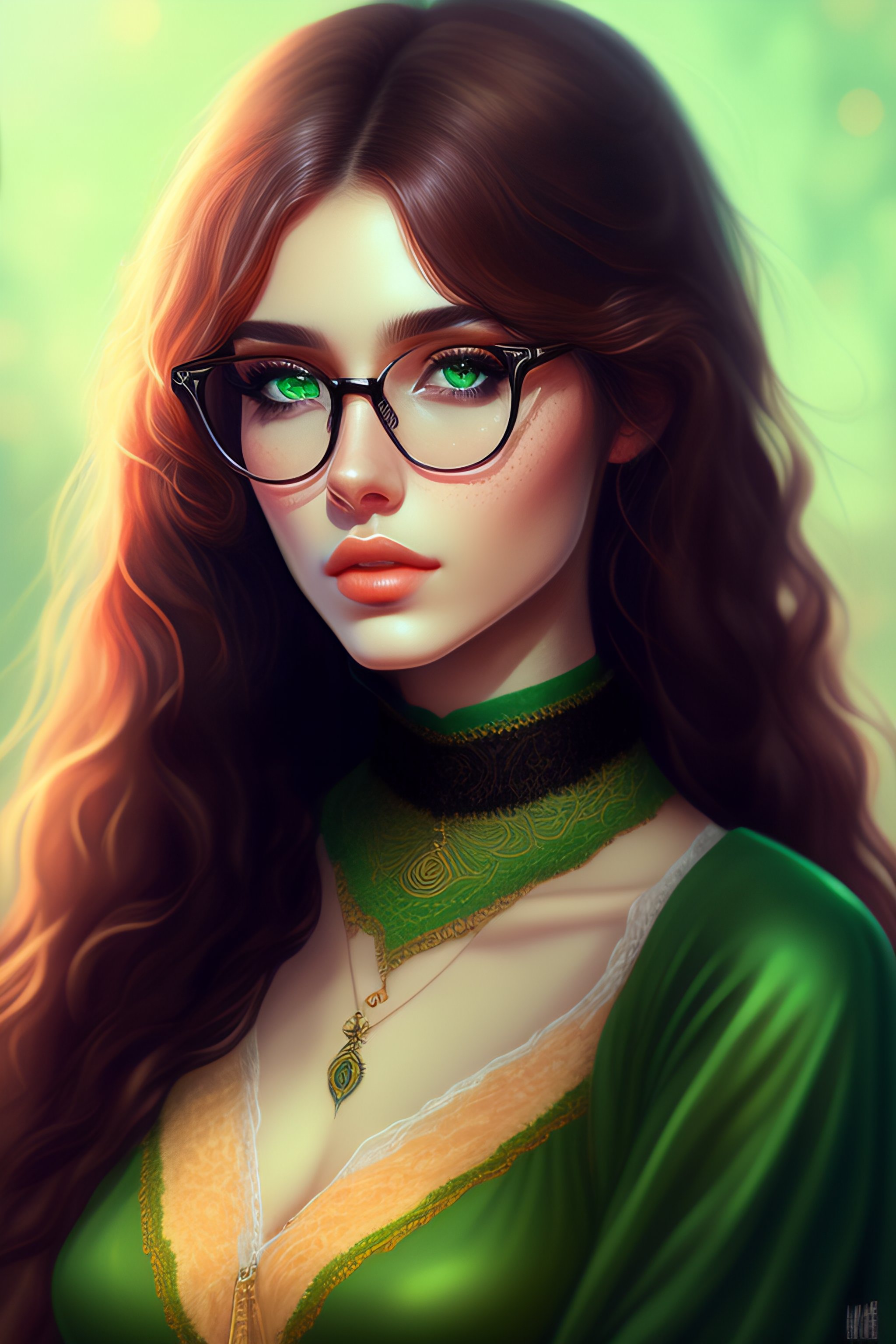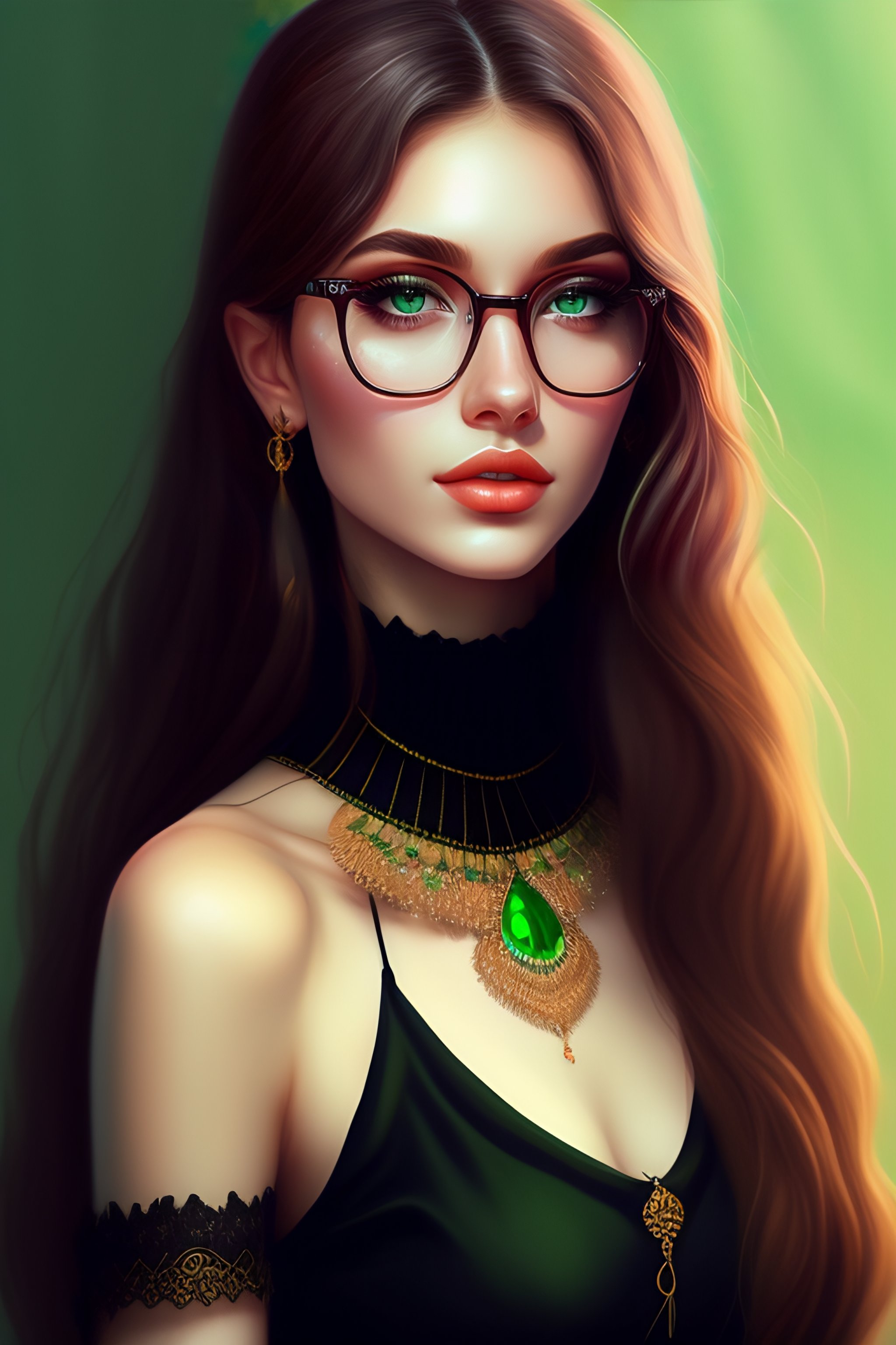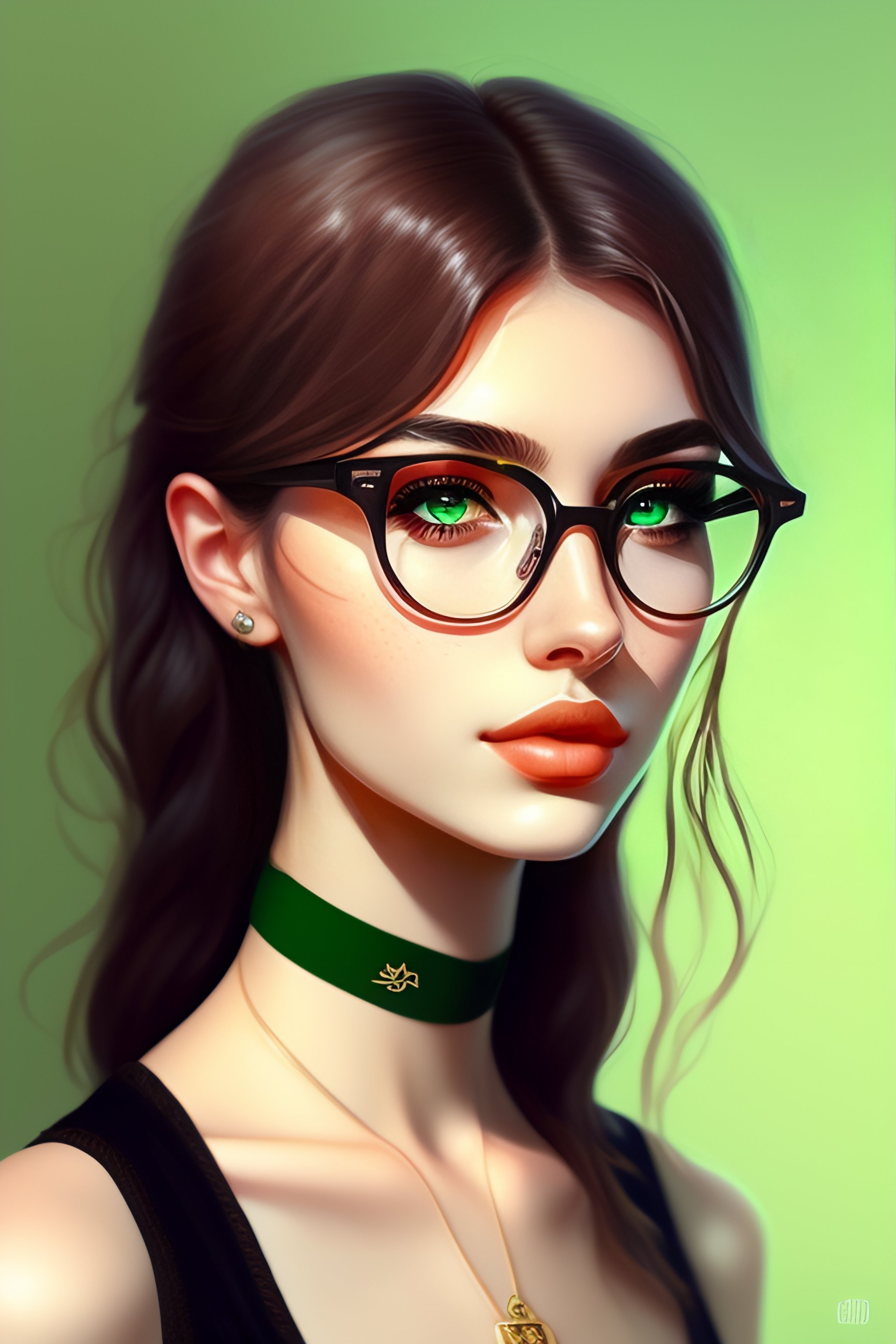 Hungarian, e-girl, aesthetic, round glasses, medium length straight hair, brown hair, black clothing, light green eyes, school clothing, beautiful eyes, beautiful lips, gothic, full body, slim, stylish, freckles, 8k, high detail, highly detailed, digital painting, digital art