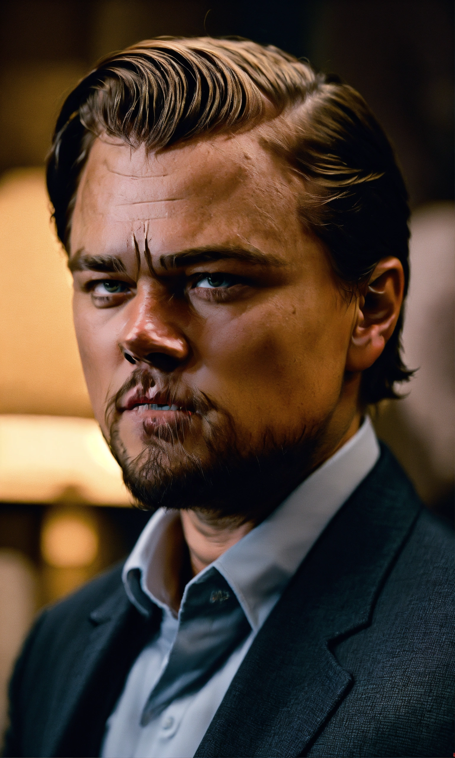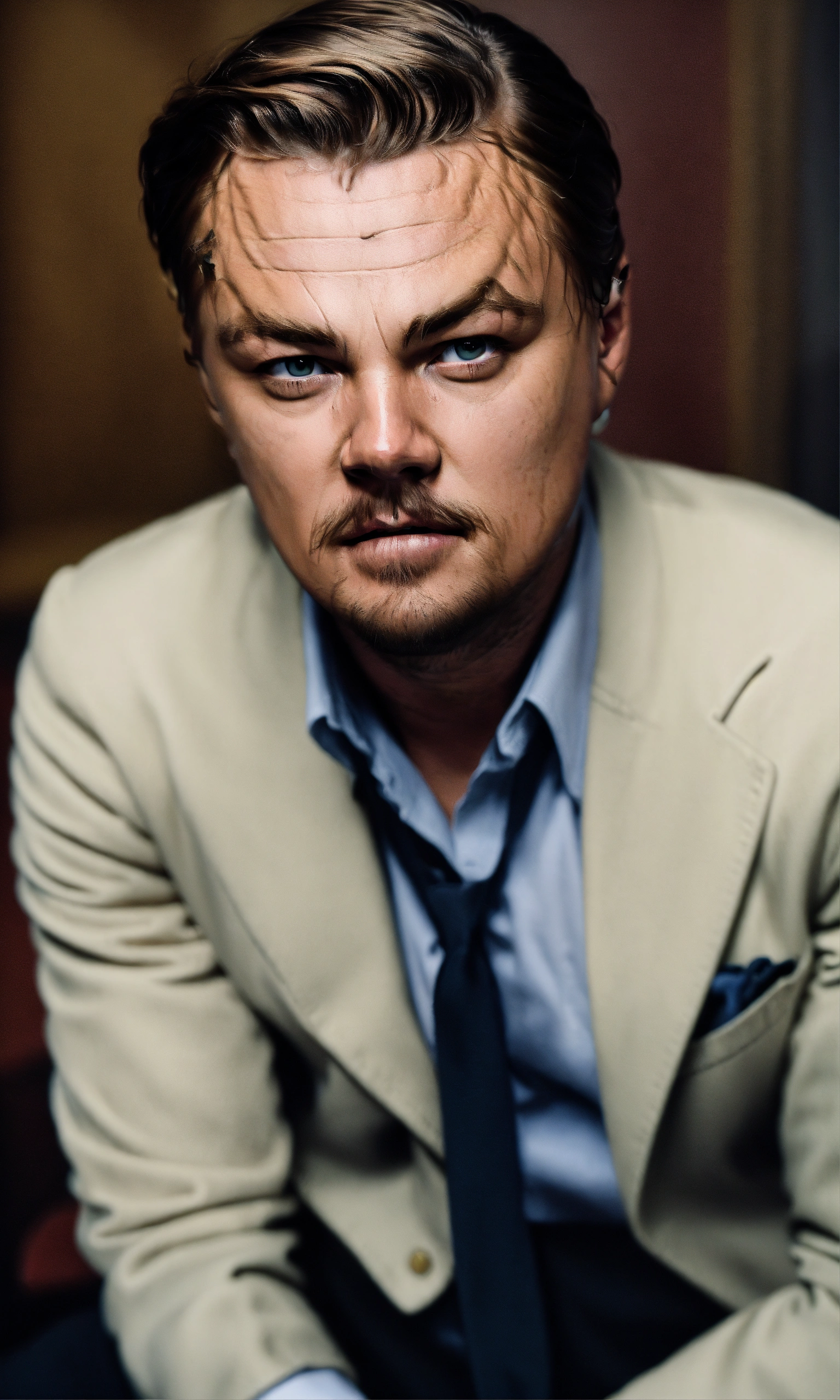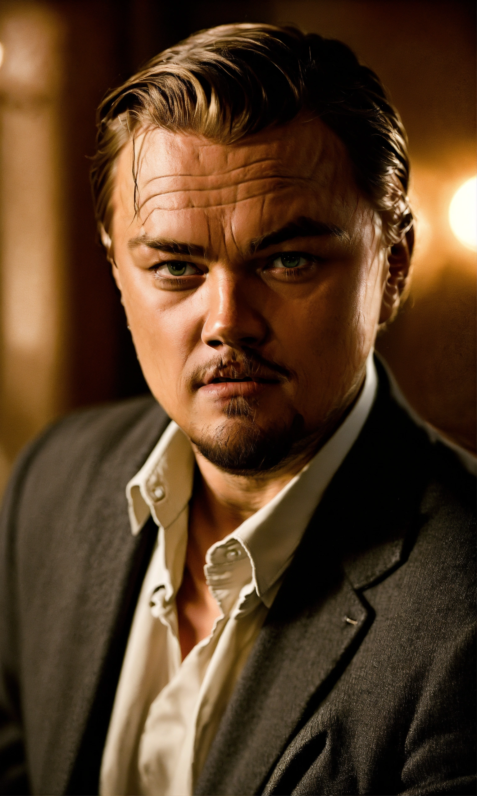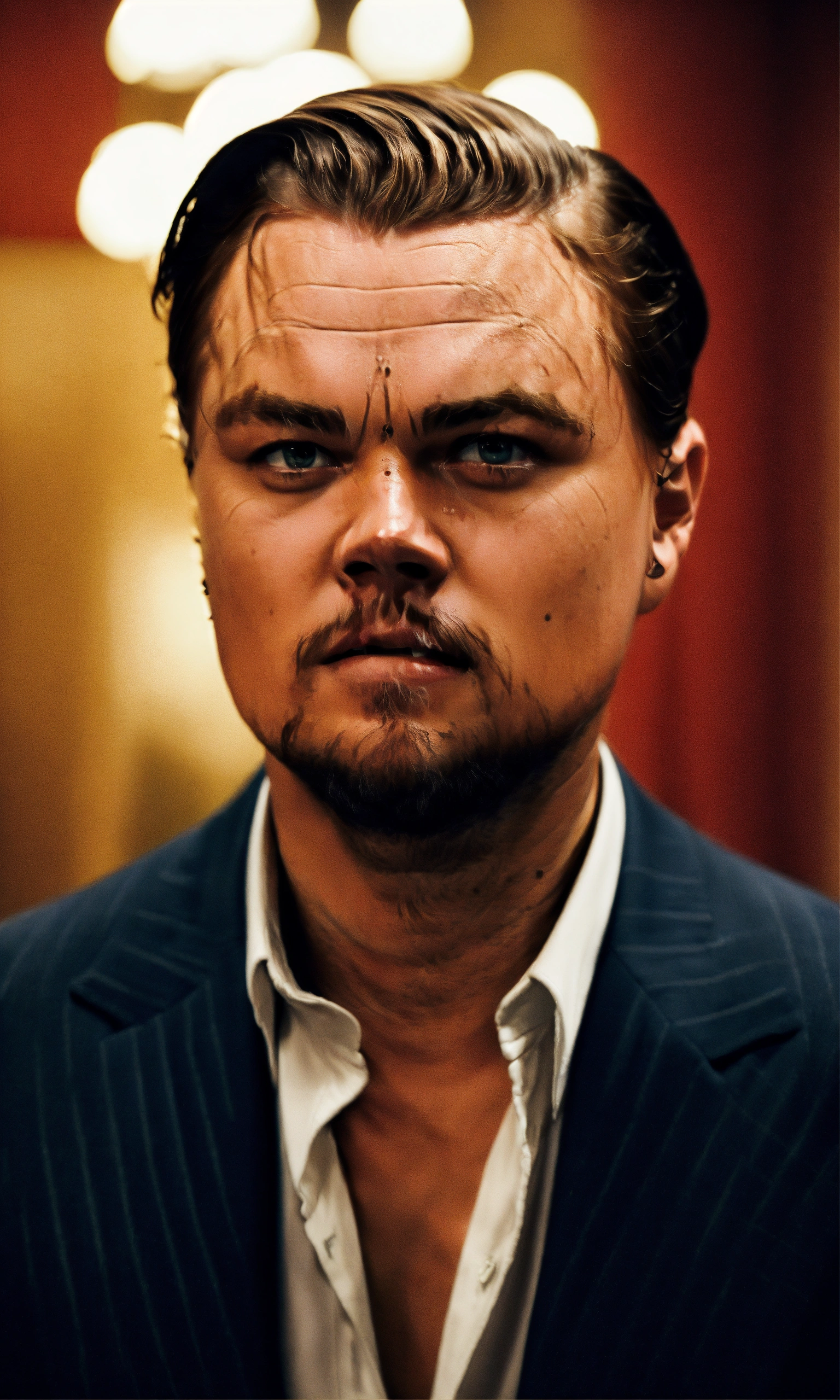 In this compelling image, we see leonardo dicaprio, the iconic actor, captured in a moment of intensity and passion.
