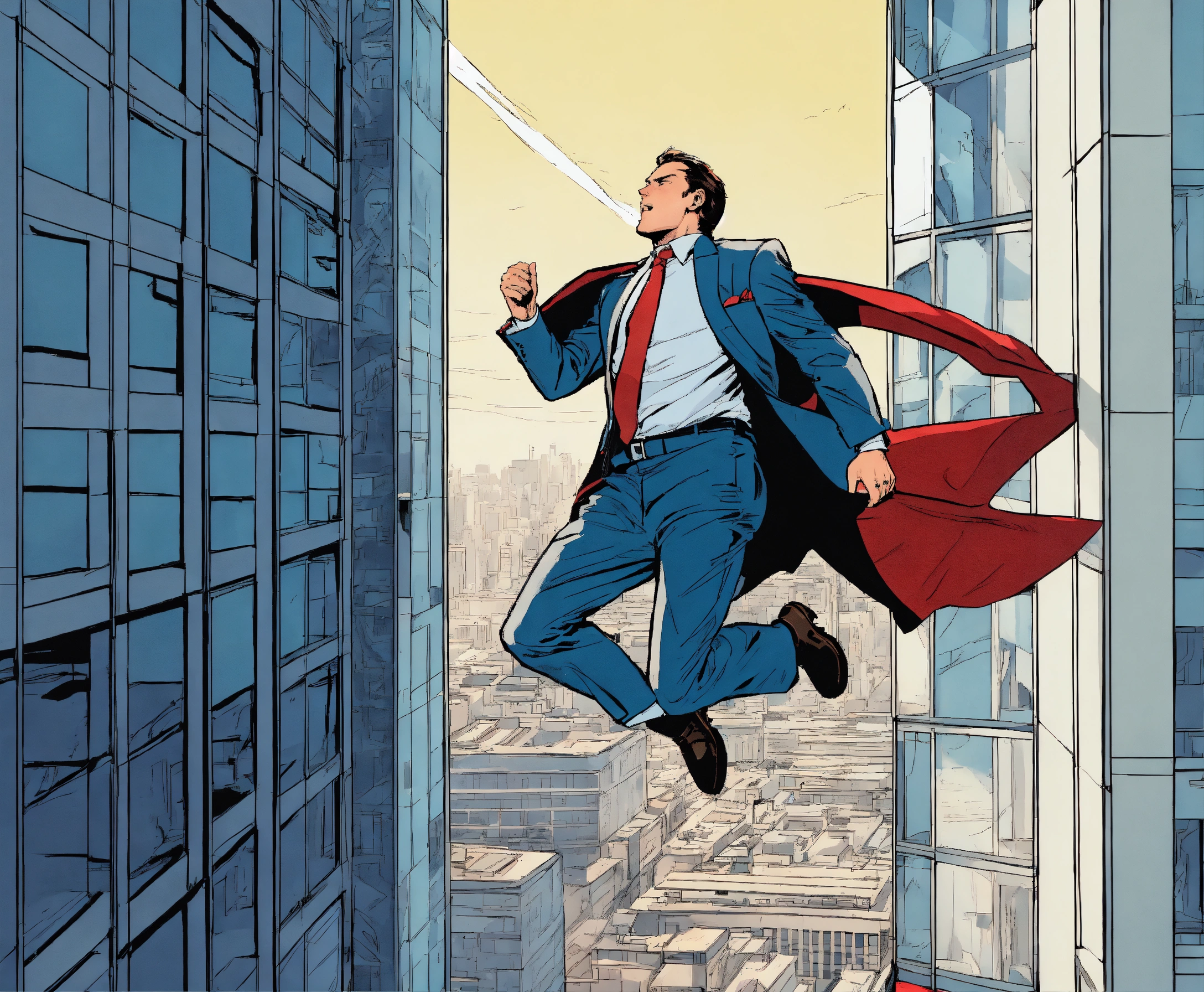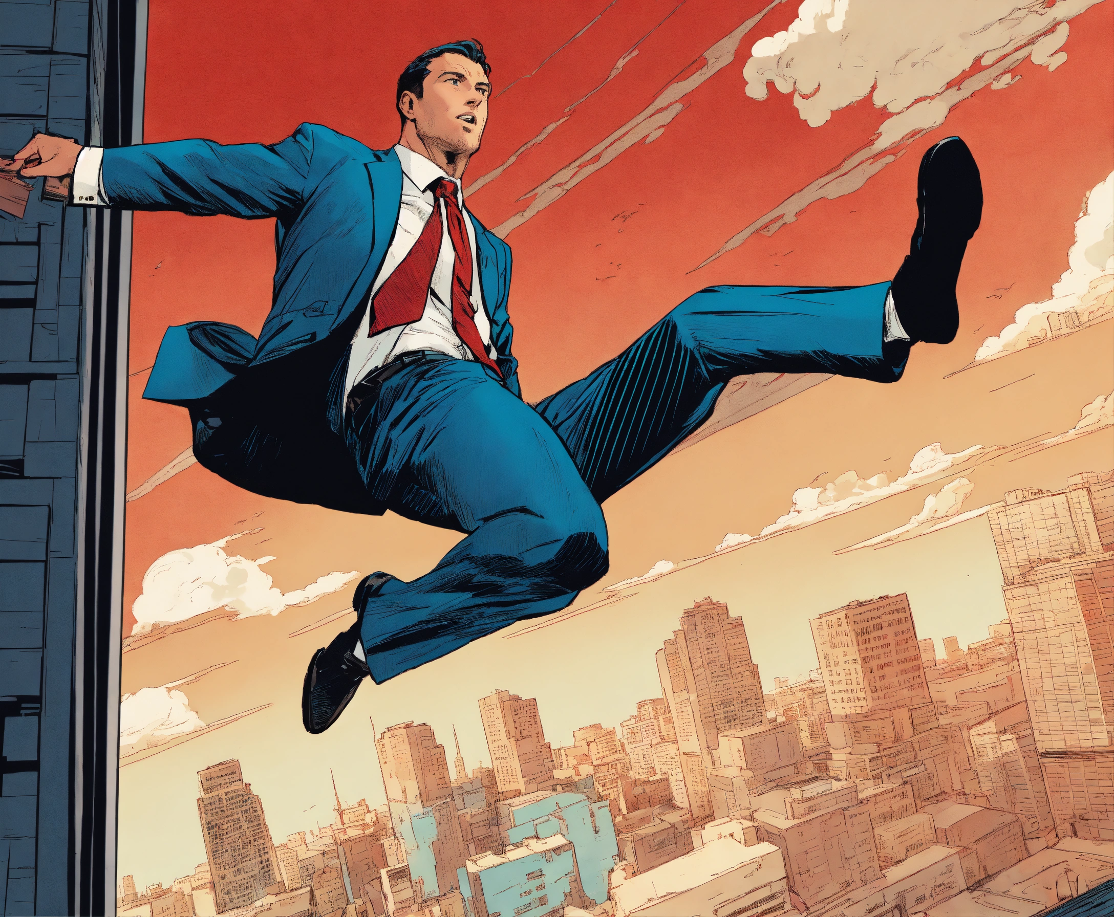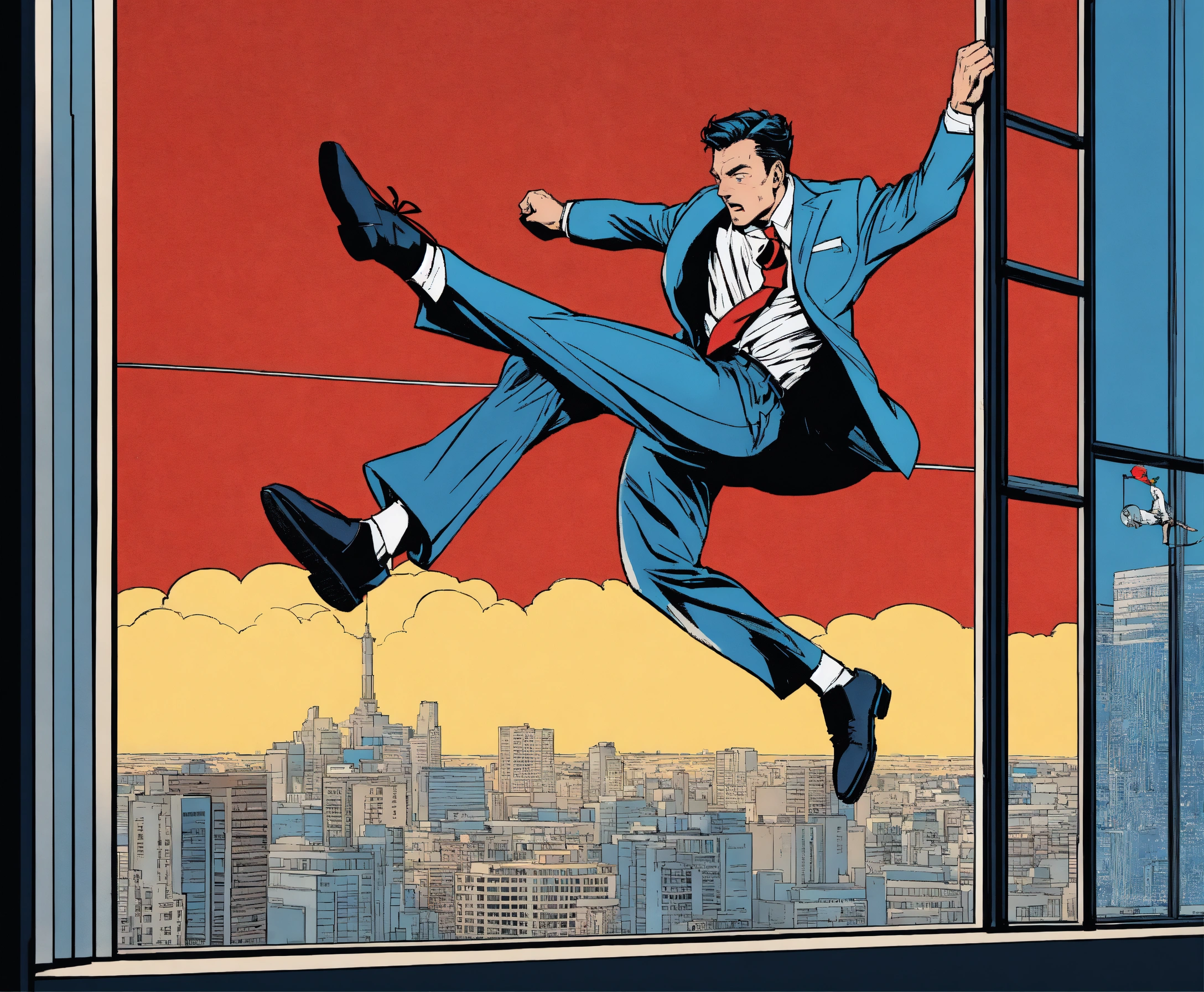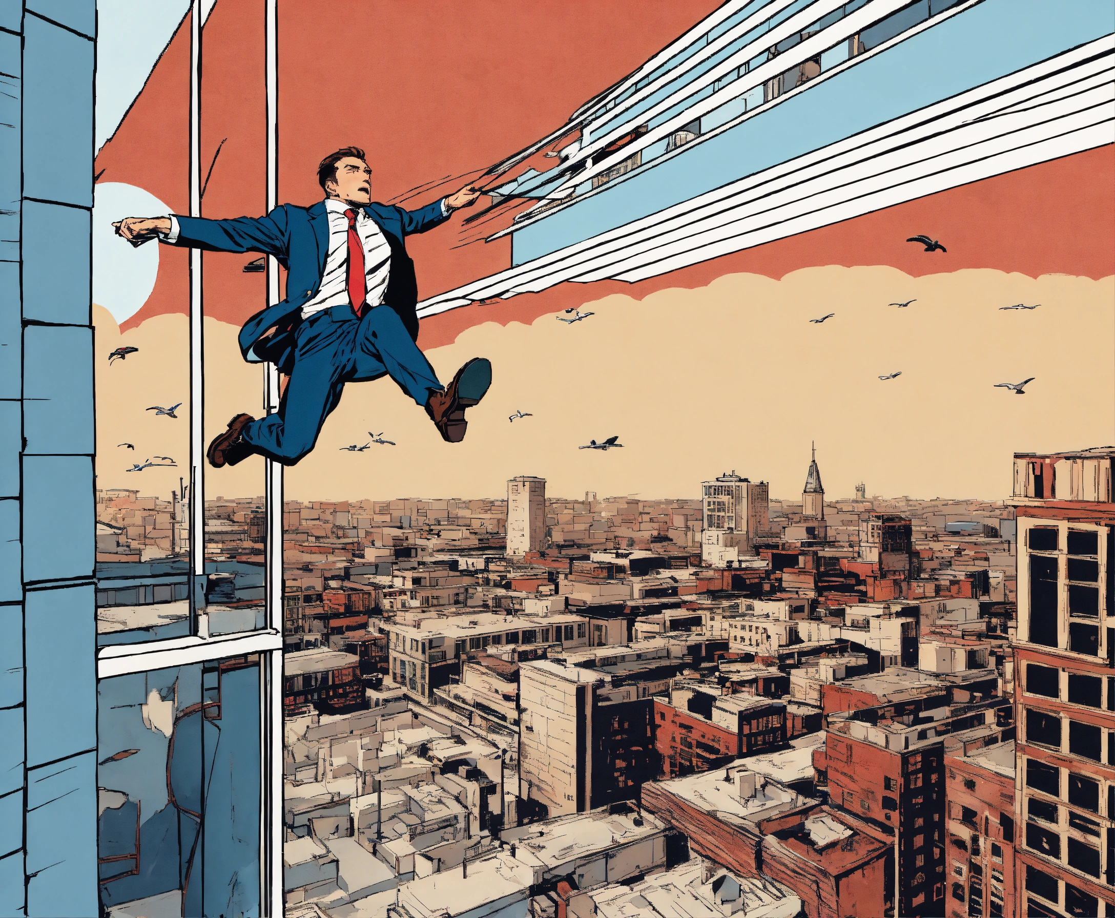 A man fell out of a window at a great height. a man in flight, he's in a suit and tie. comic book style color white blue mi red