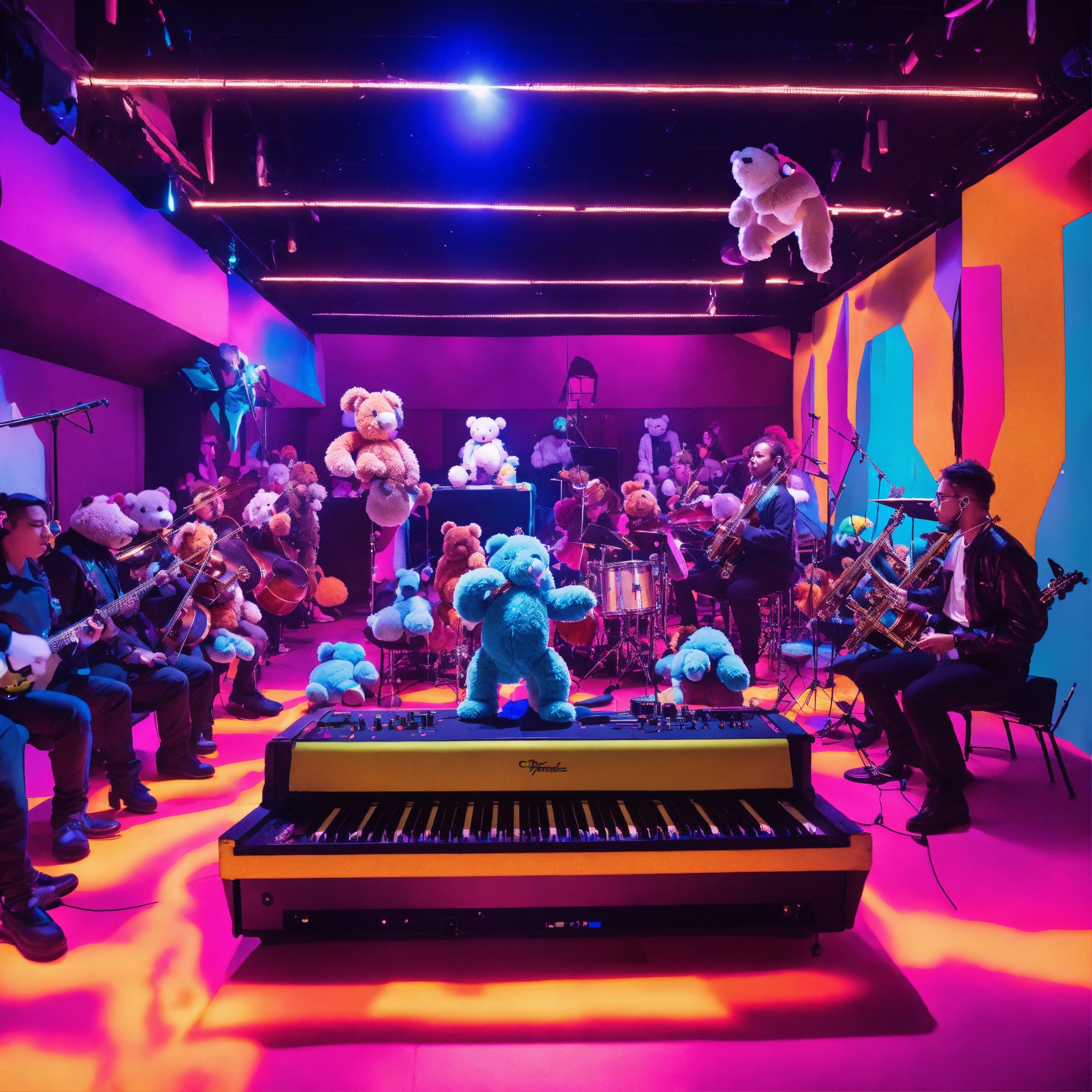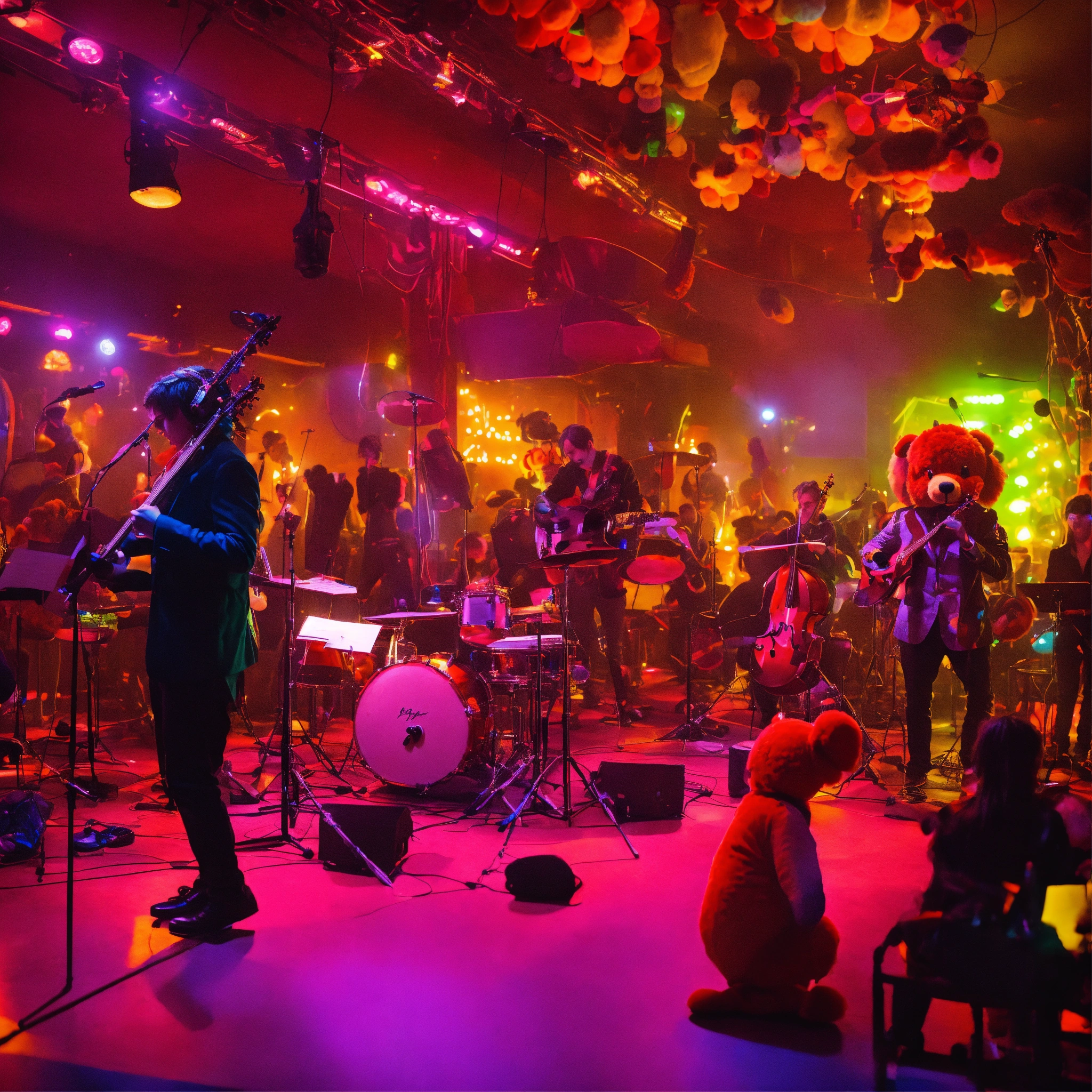 A cyborg orchestra playing a concert in front of a bunch of stuffed animals in a nightclub