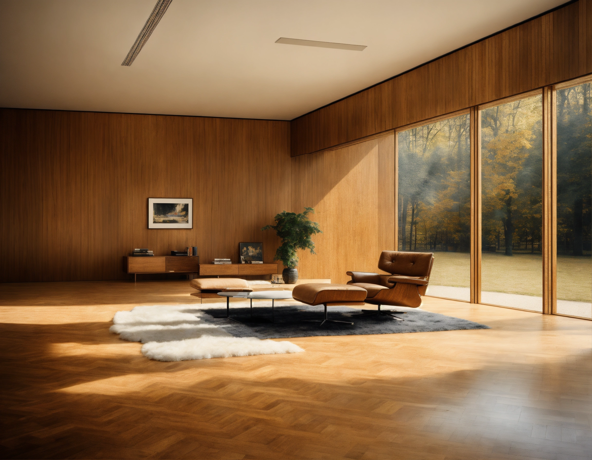 Ludwig mies van der rohe living-room like new national gallery berlin on wood background photorealistic