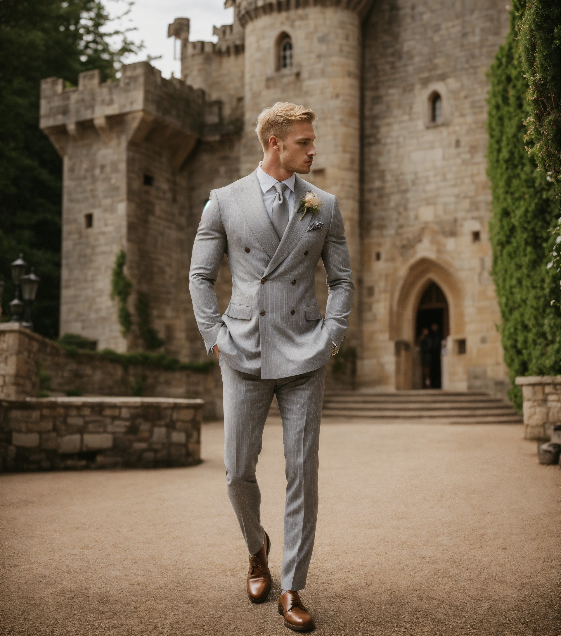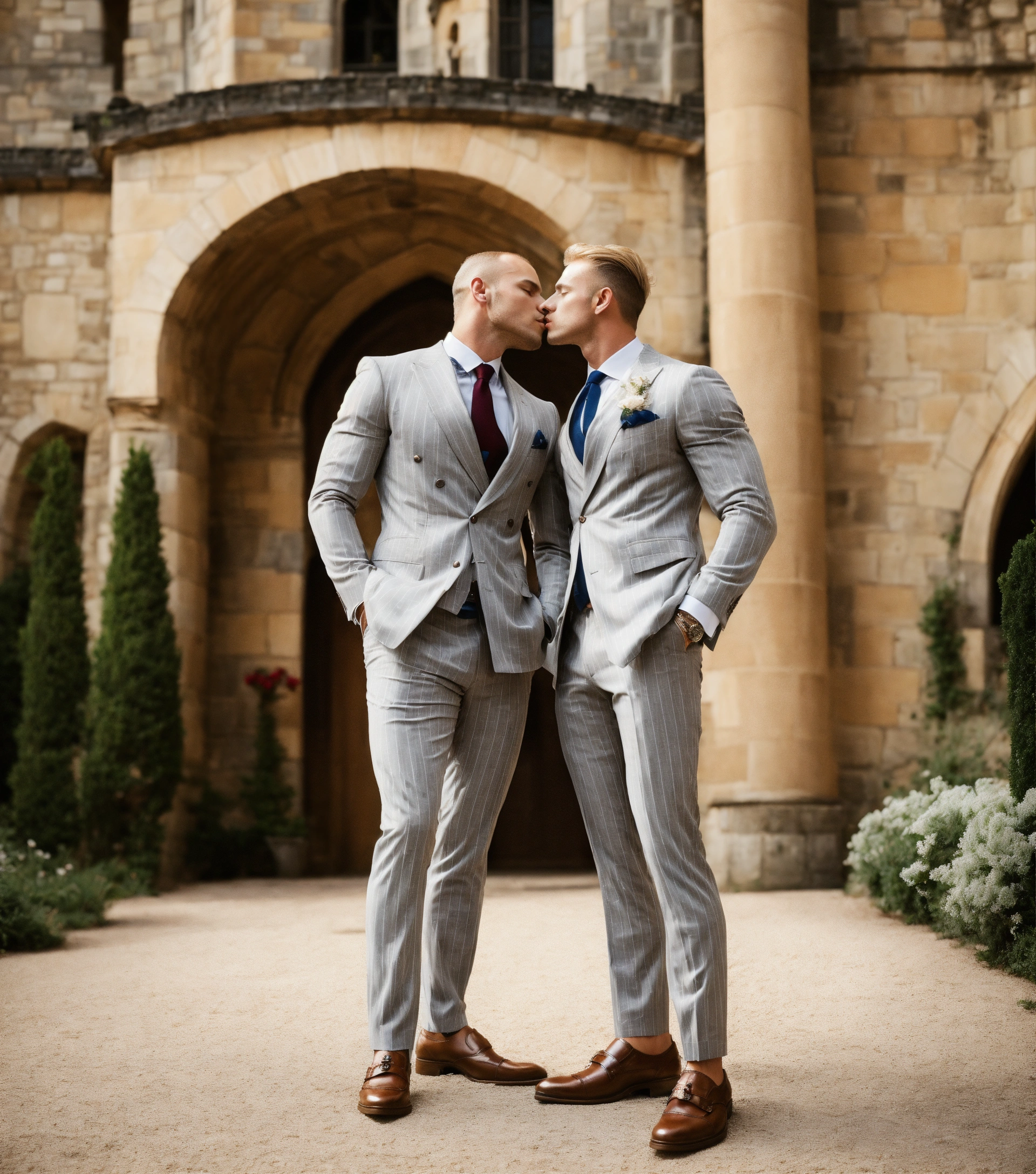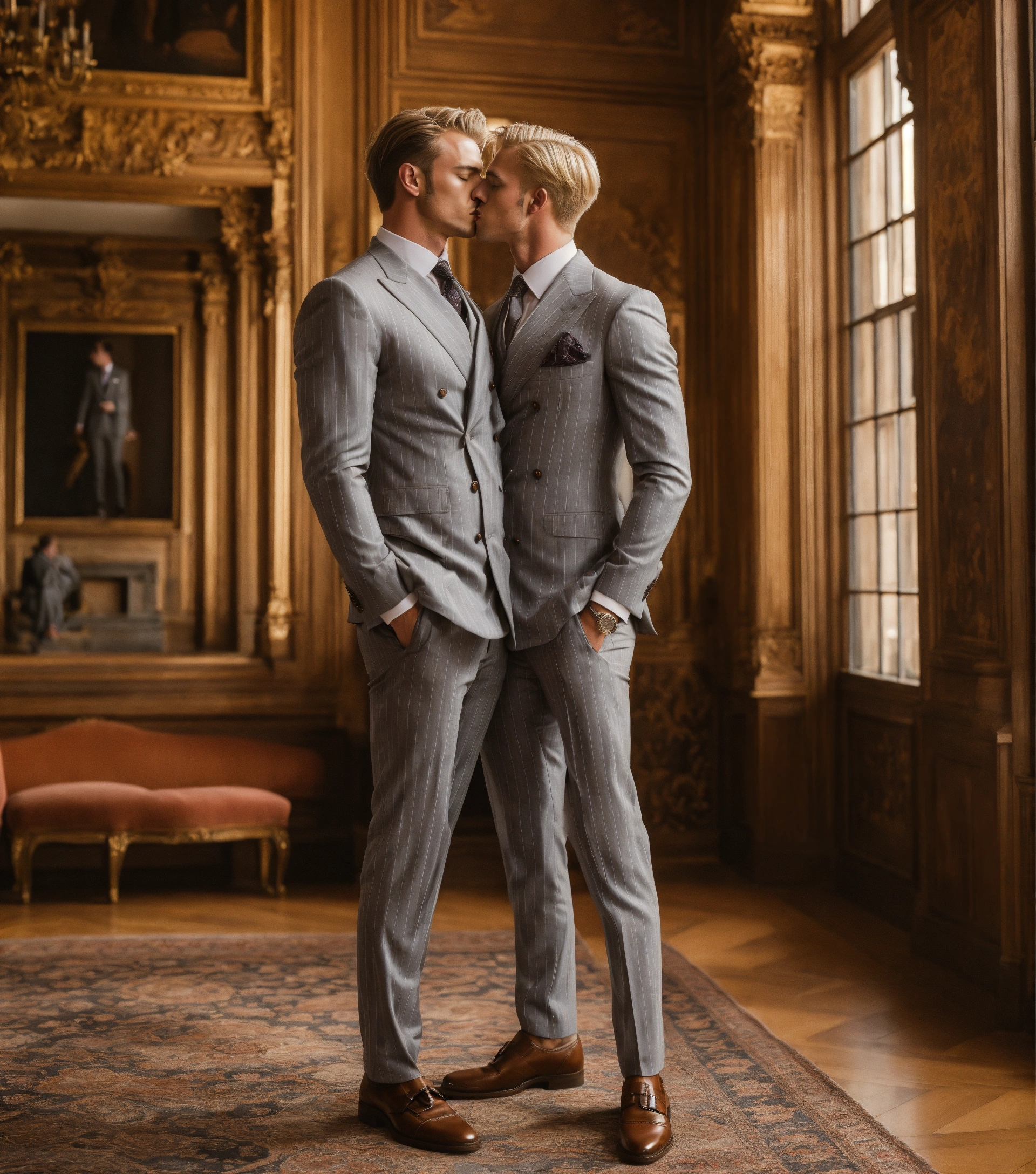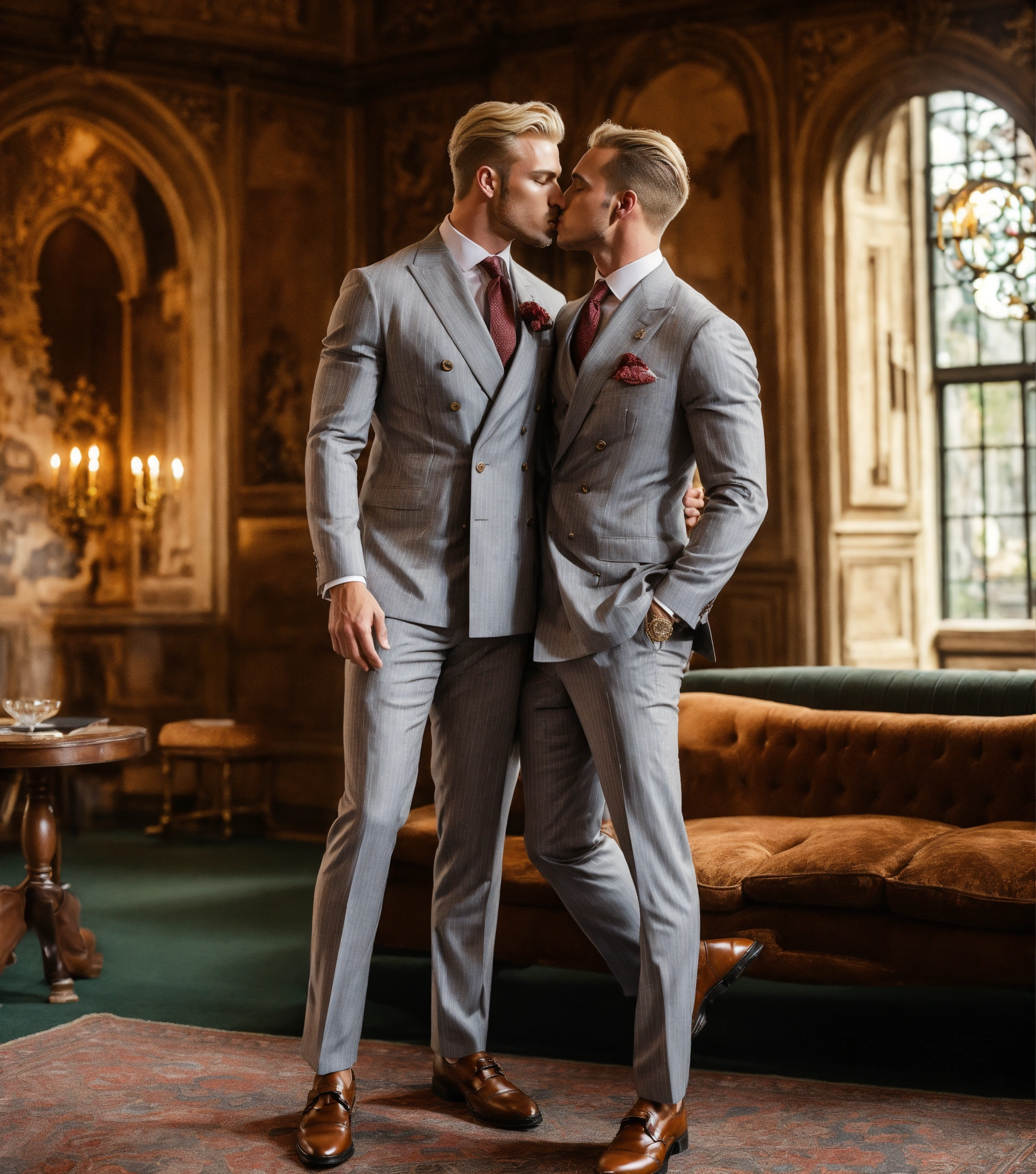 Two blonde muscled gentlemen in light grey pinstripe double breasted suit, large shoulders, brown monkstrap shoes, kissing in a castle.