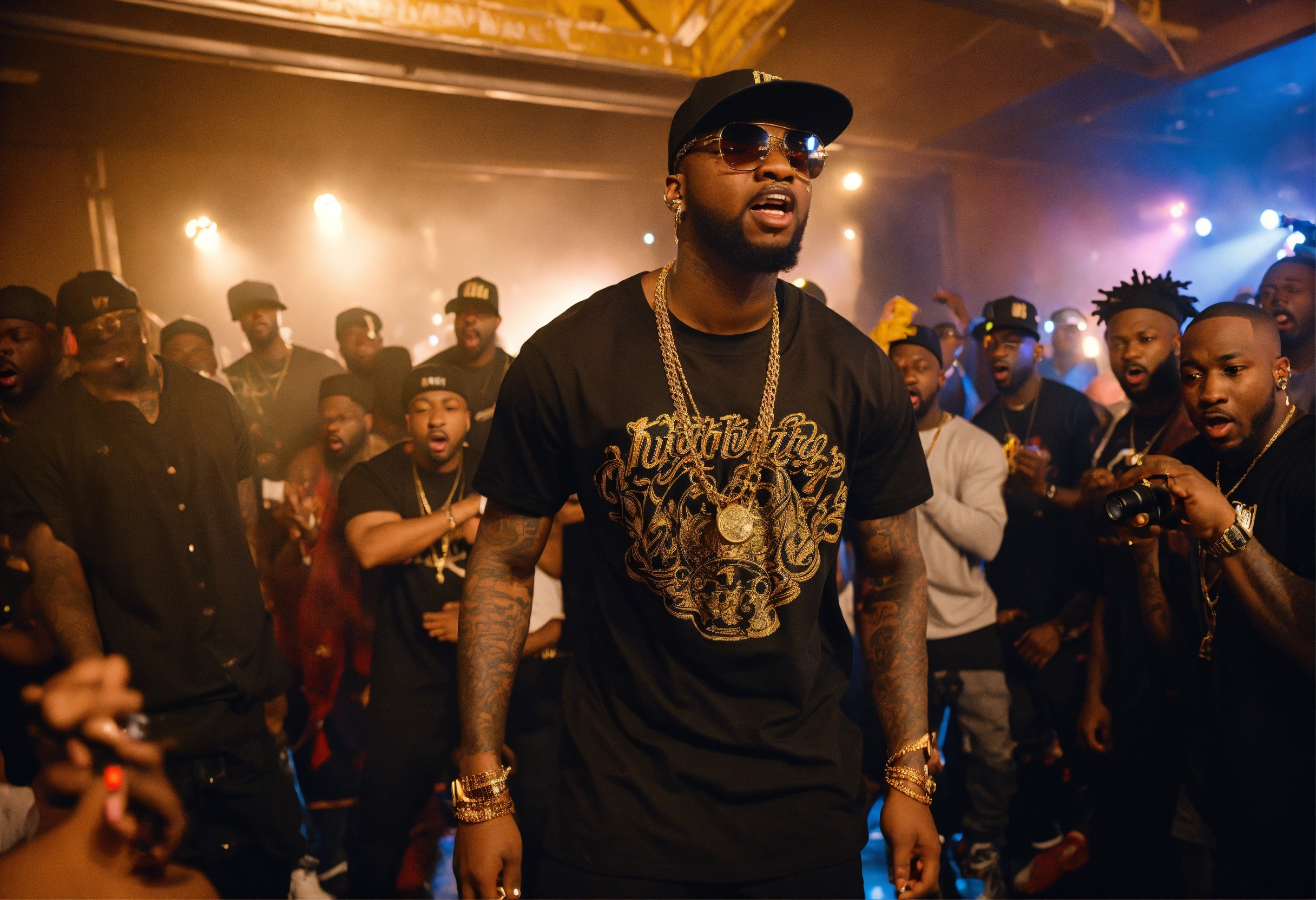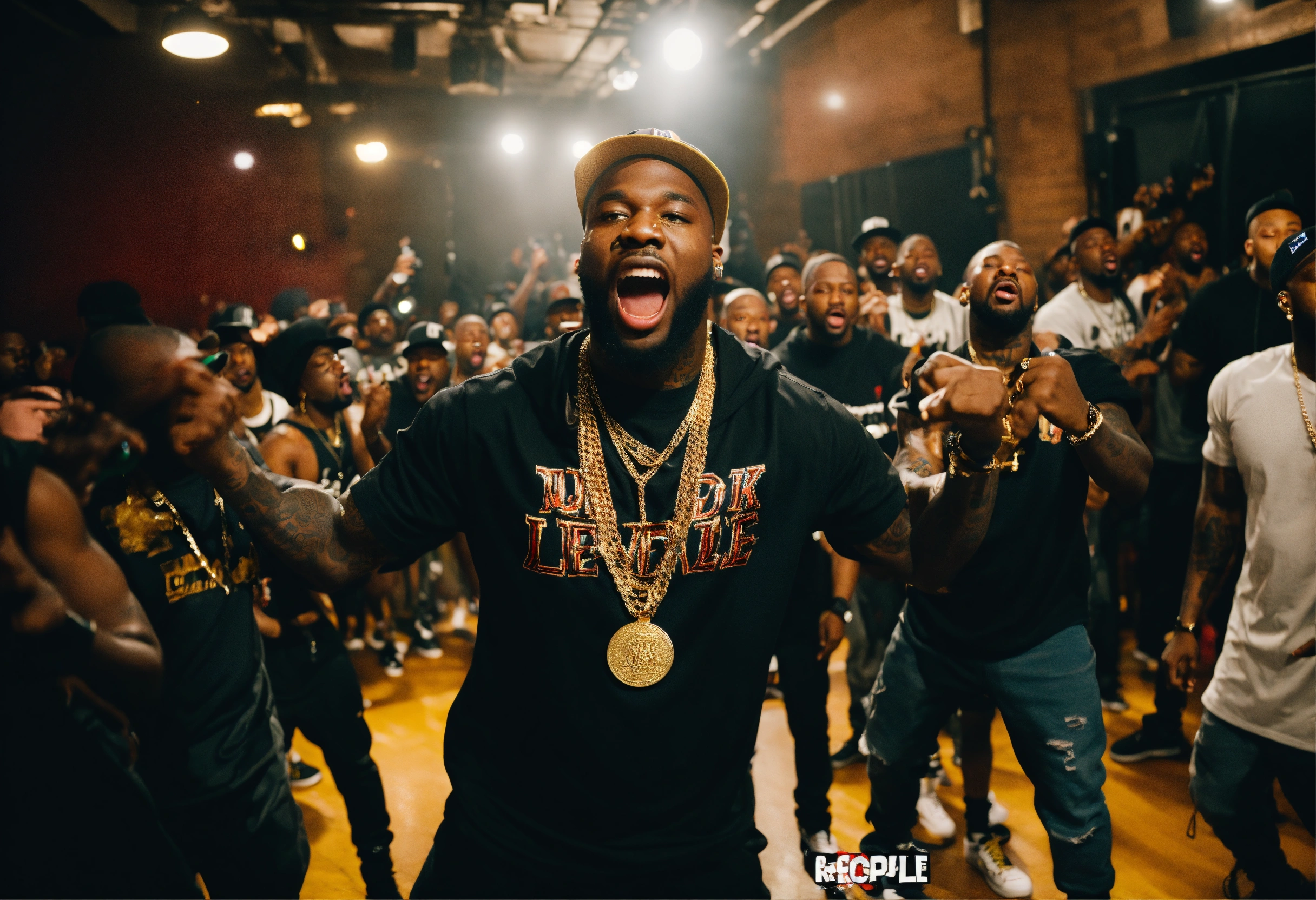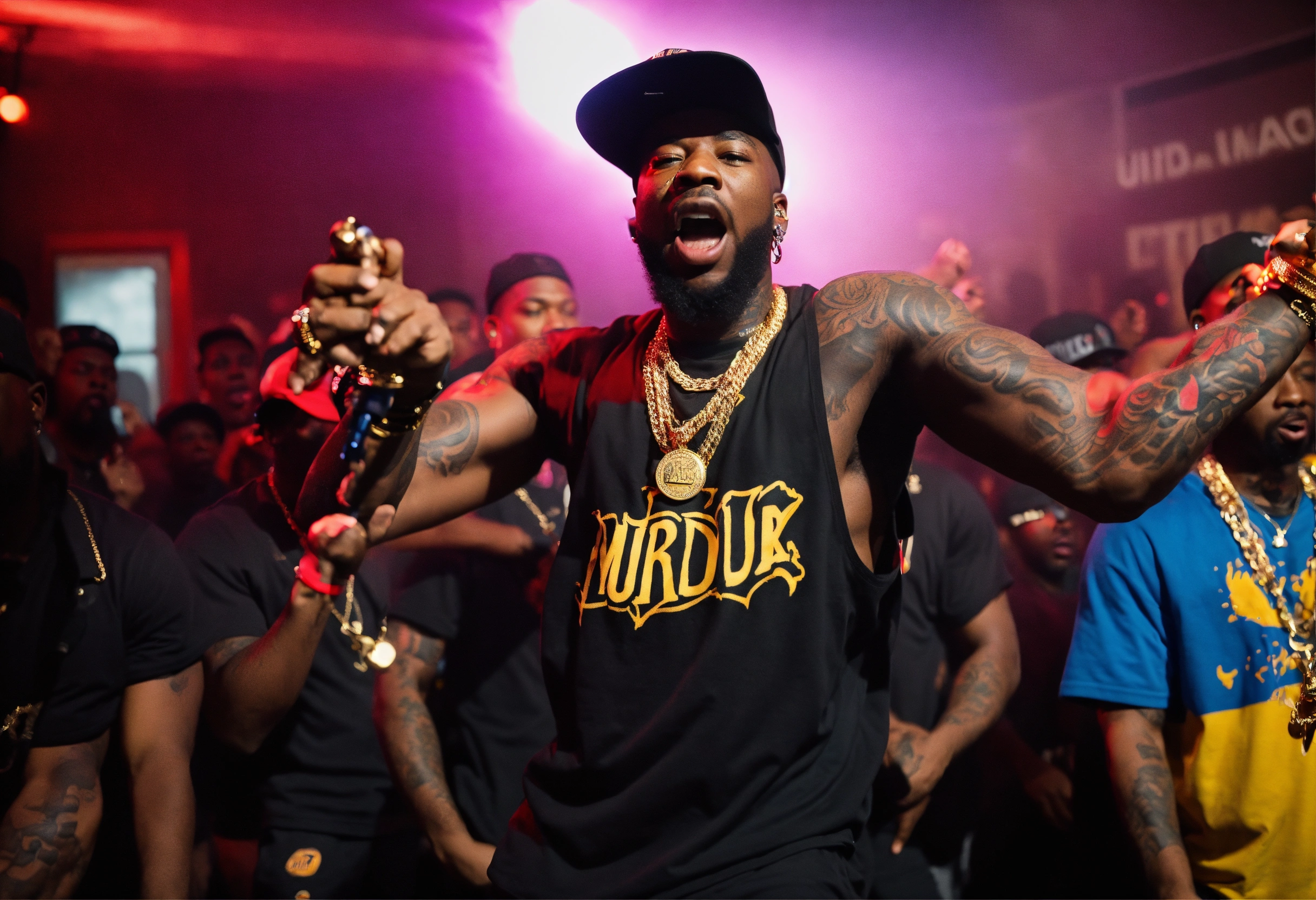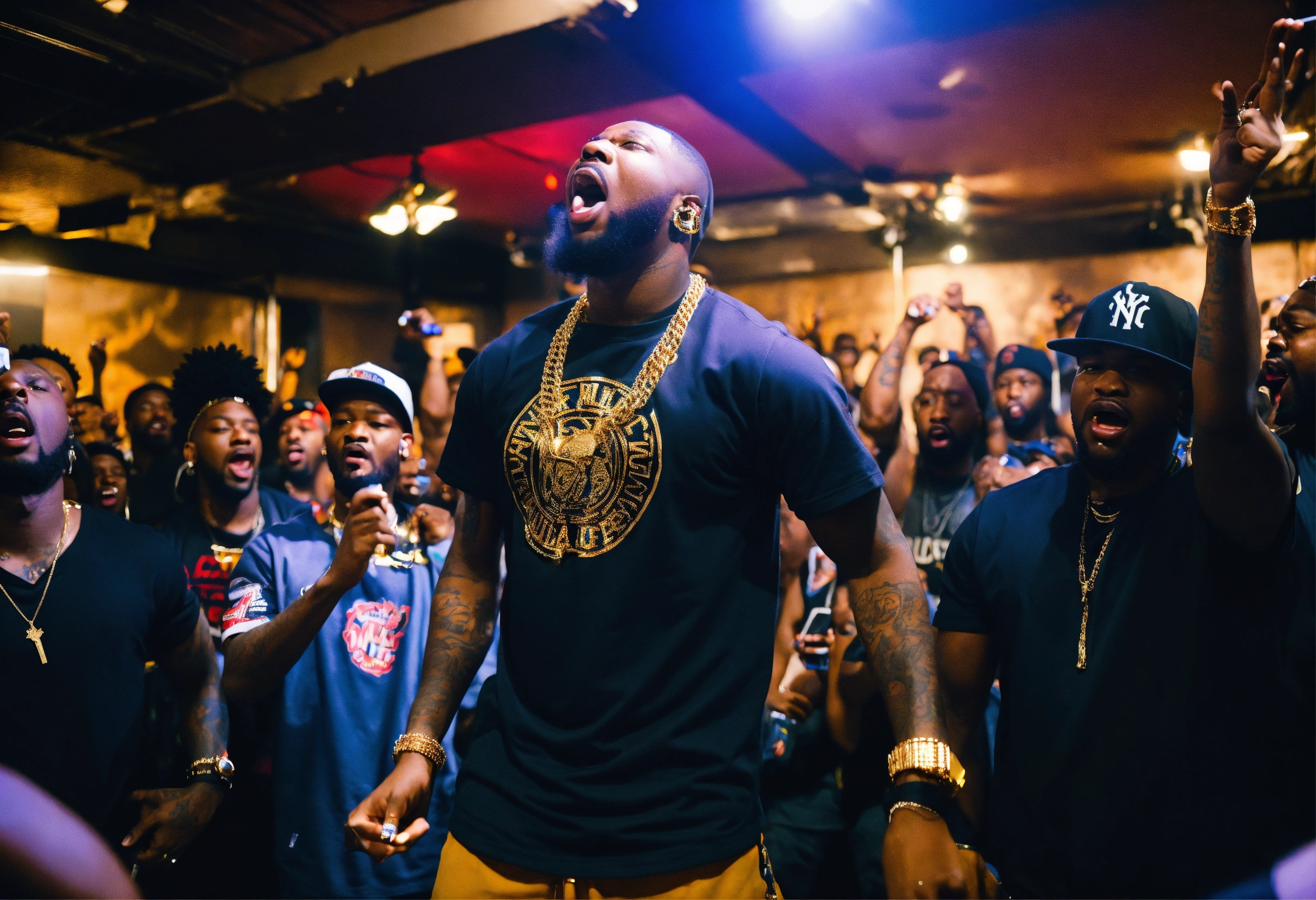 Full body shot black battle rapper "murda mook" battling in url ultimate rap league harlem new york people cheering in the background talking, epic details 8k, super high quality, tattoo, gold neckless, canon eos 5d, burst out screaming, background.
