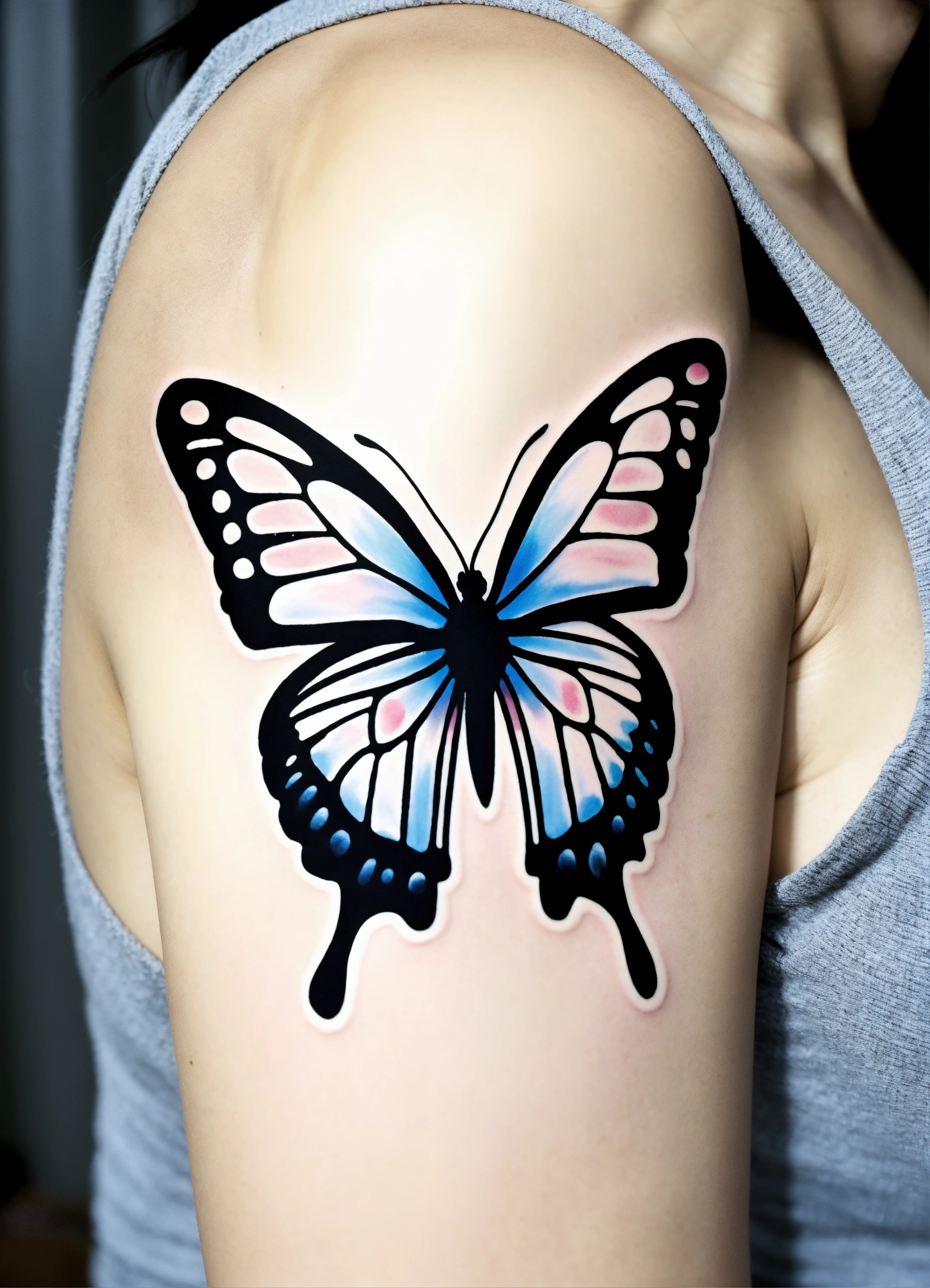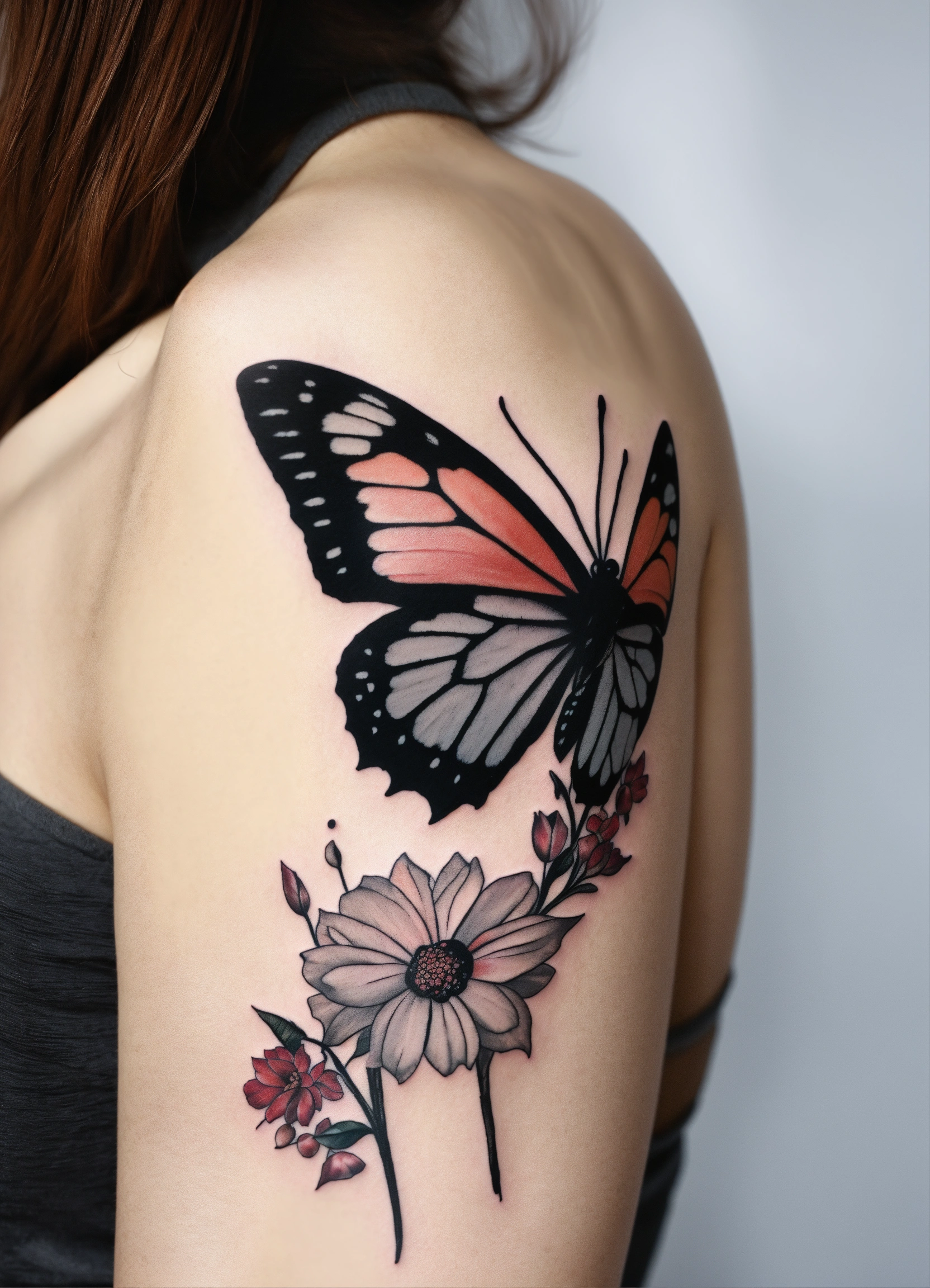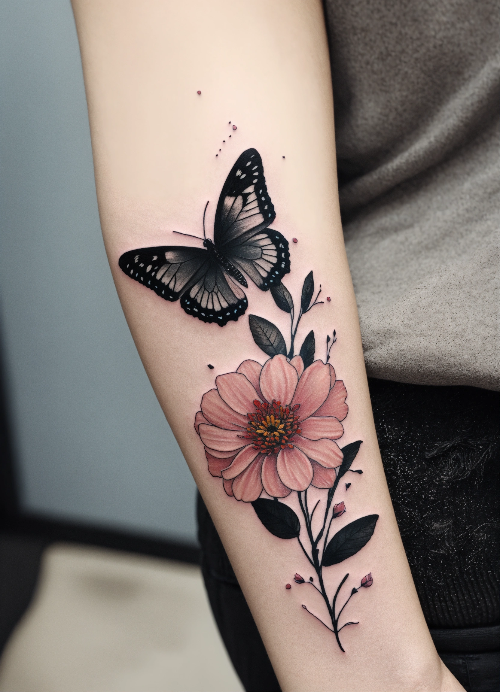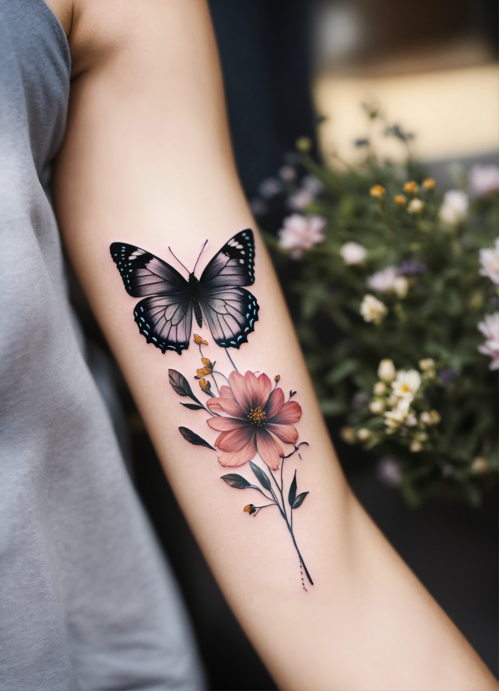 Black grey butterfly minimalist flowers colors little tattoo arm woman