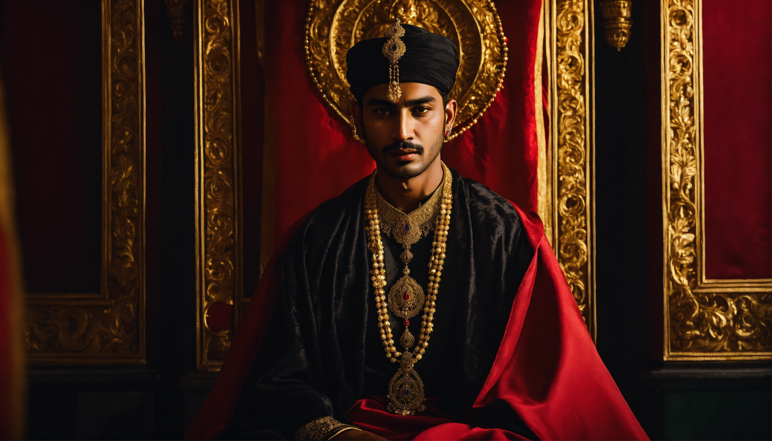 Dramatic portrait of a young and handsome diabolical south asian ruler with a hypnotic stare dressed in black and redceremonial robes and ornate gold jewellery in a dimly lit palace chamber in the evening