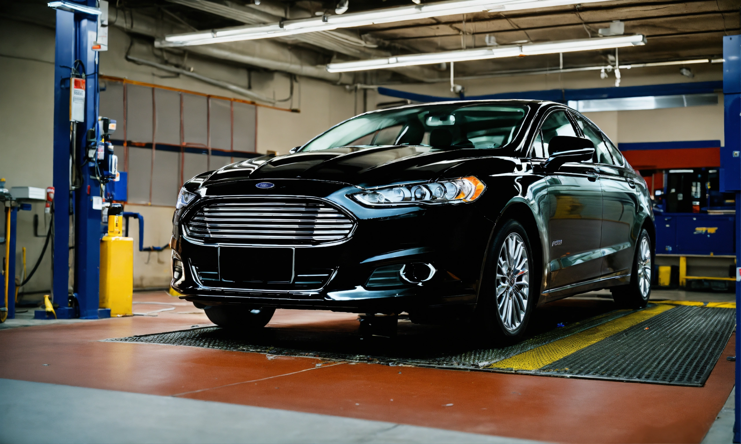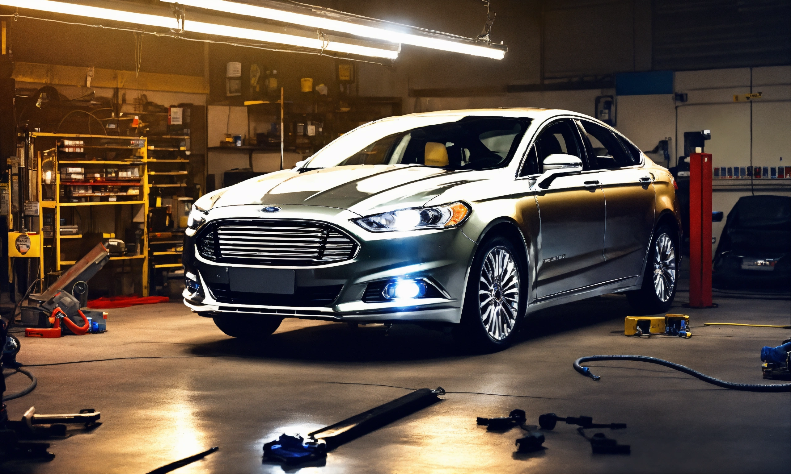 Car repair, the car is at the service station, the lights is being replaced, the car is a 2015 ford fusion, realistic photo taken with a nikon camera