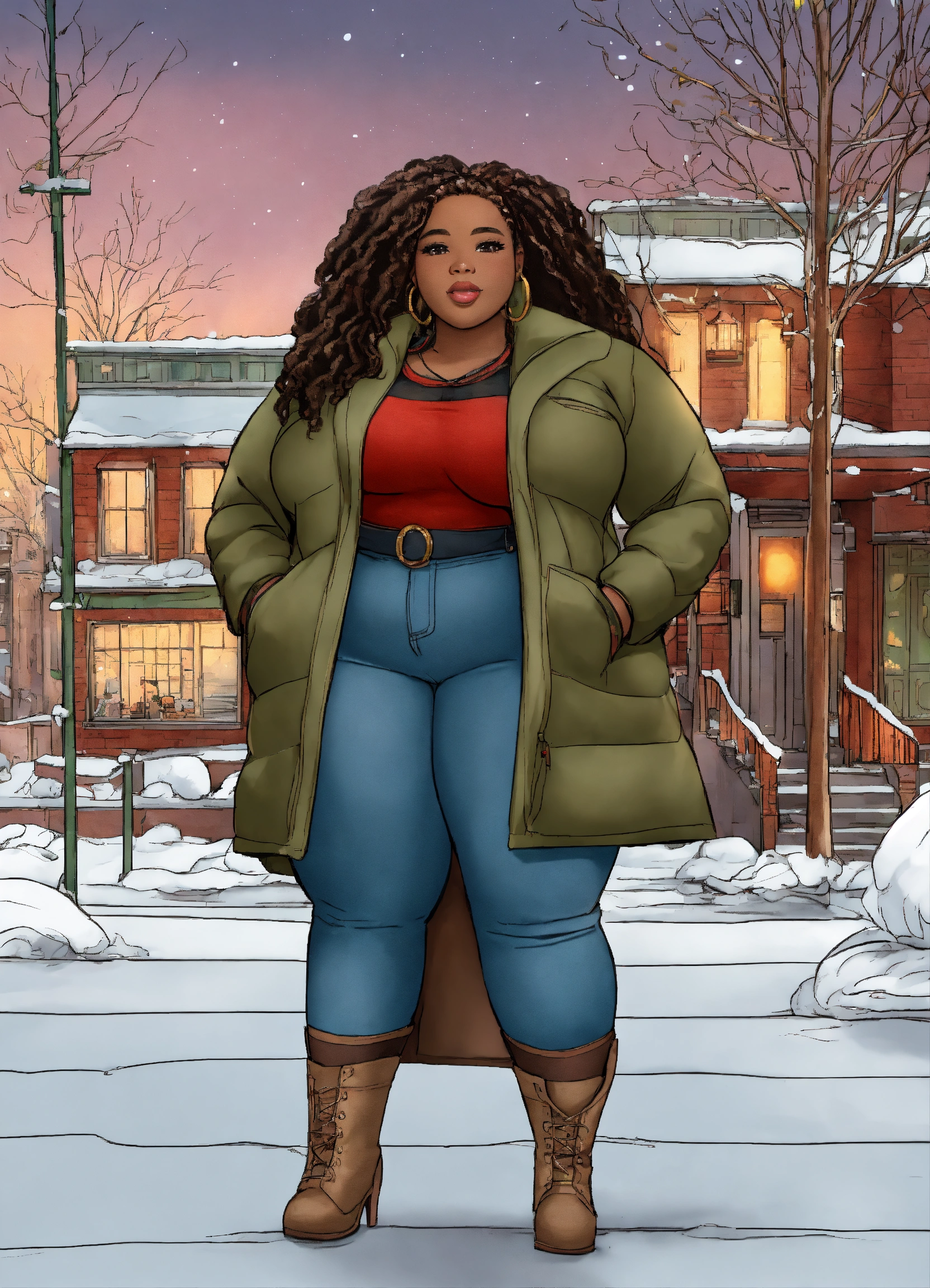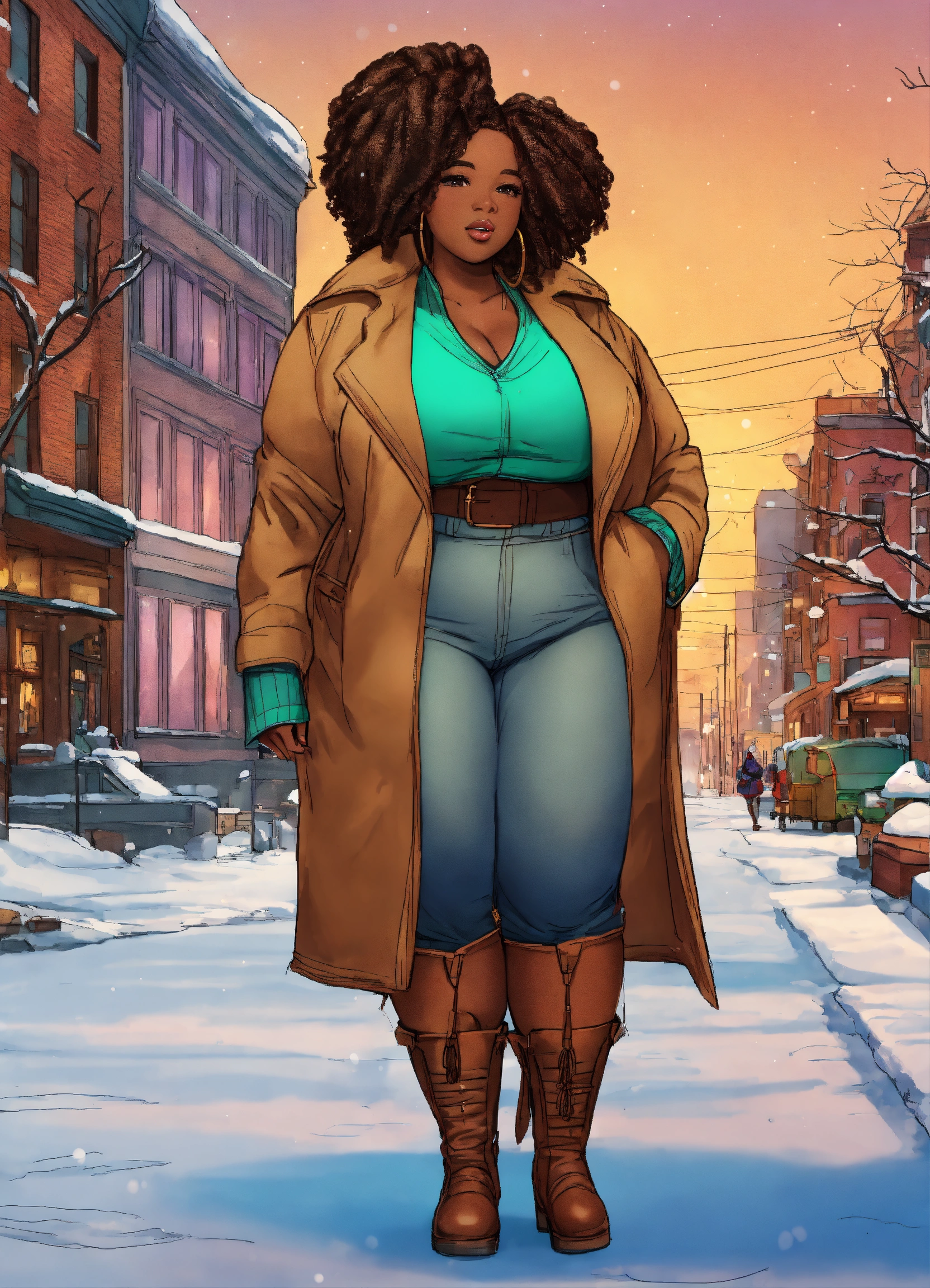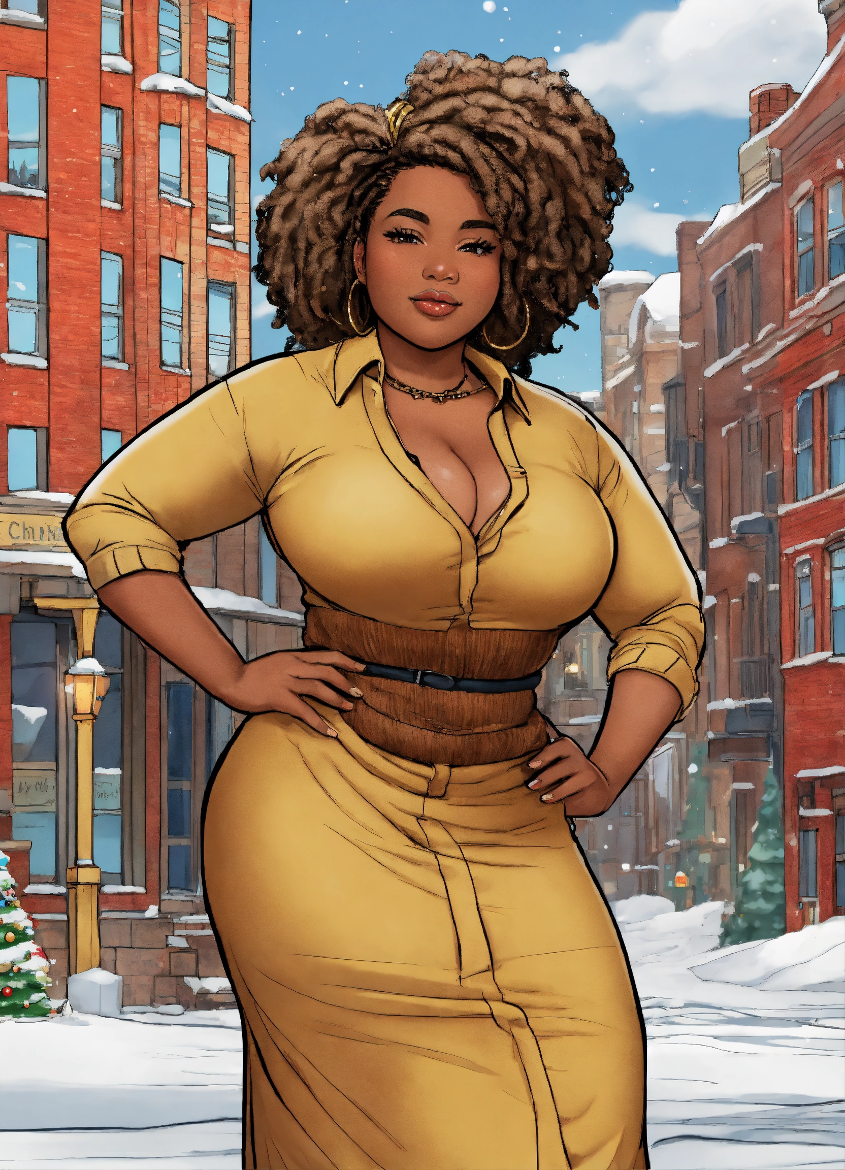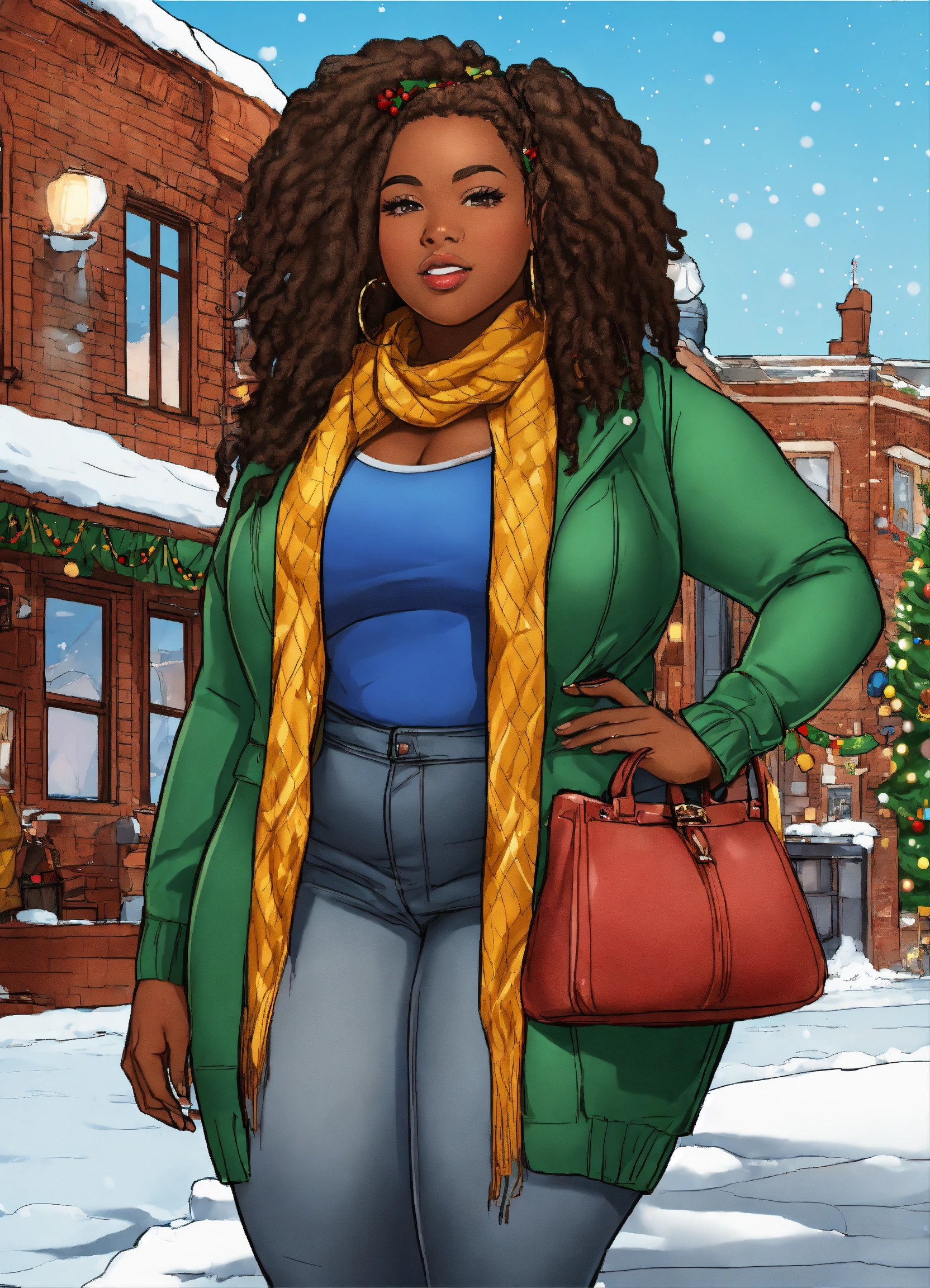 African american west african features fully clothed well proportioned full figured woman, realistic healthy glossy well defined loc’d hair texture, full body shot, urban big city winter christmas scene theme rule of thirds centered subject placement, storybook, cartoon, intricate detail line drawing, coloring book style