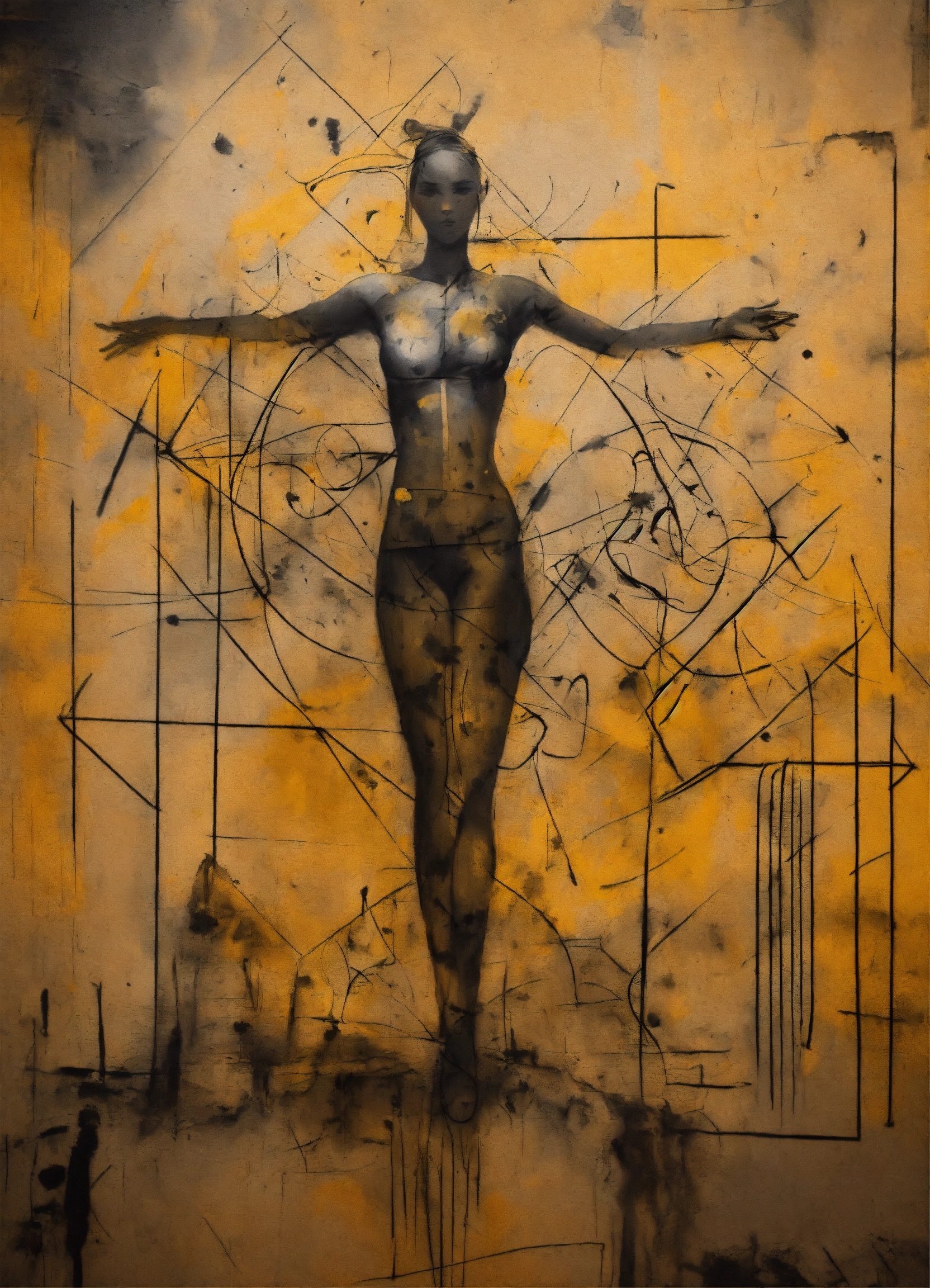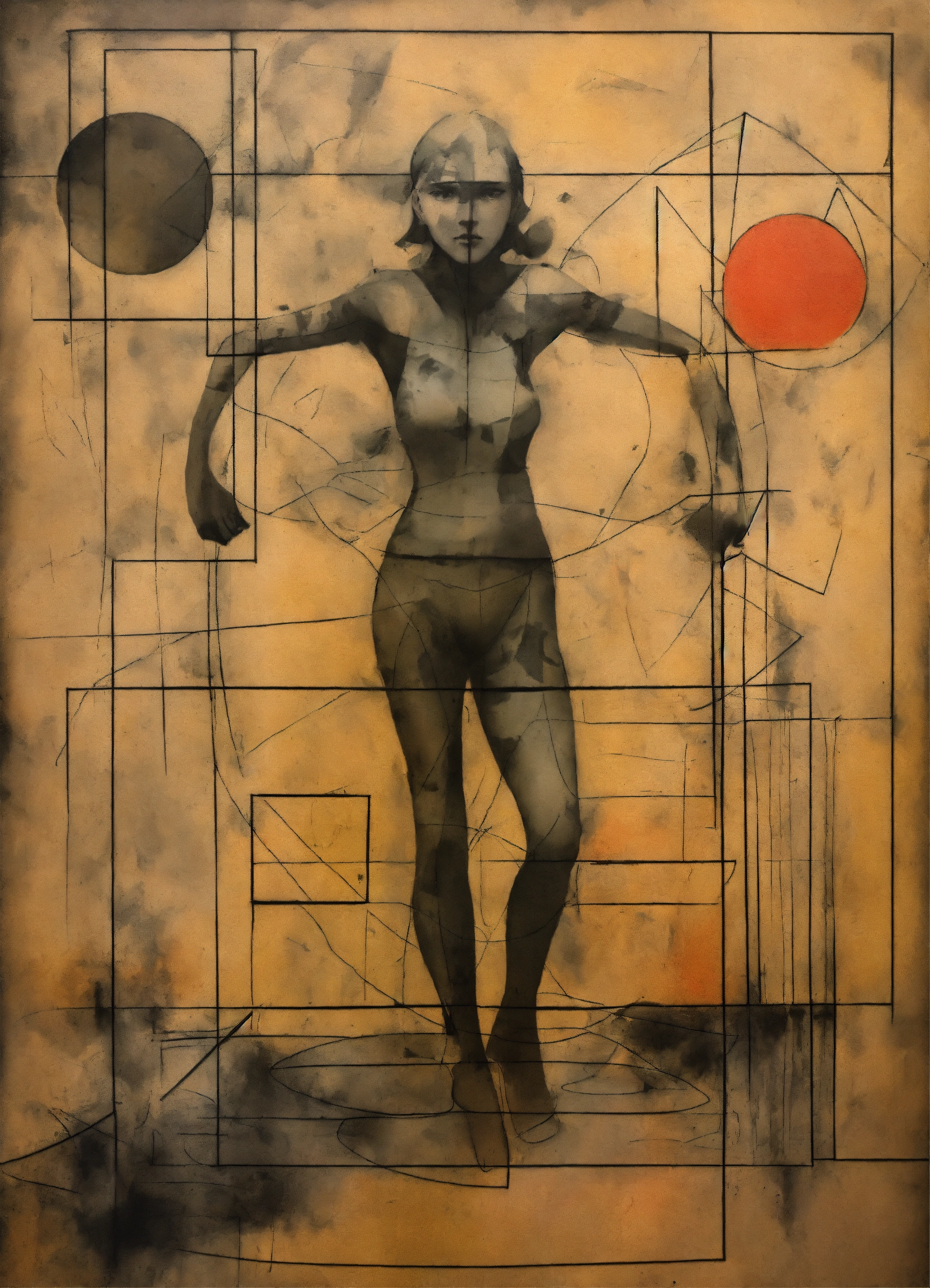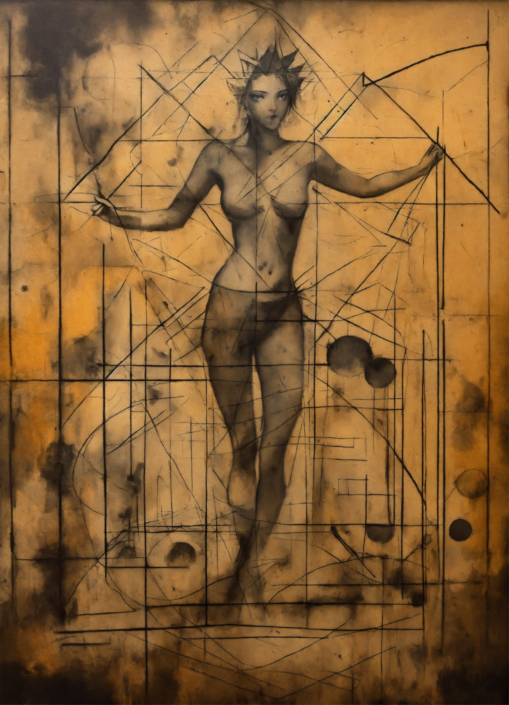Create the outline of personification of chaos, painted with a few charcoal smudges. in the background there are three geometric figures overlaps. all on a grunge wall.