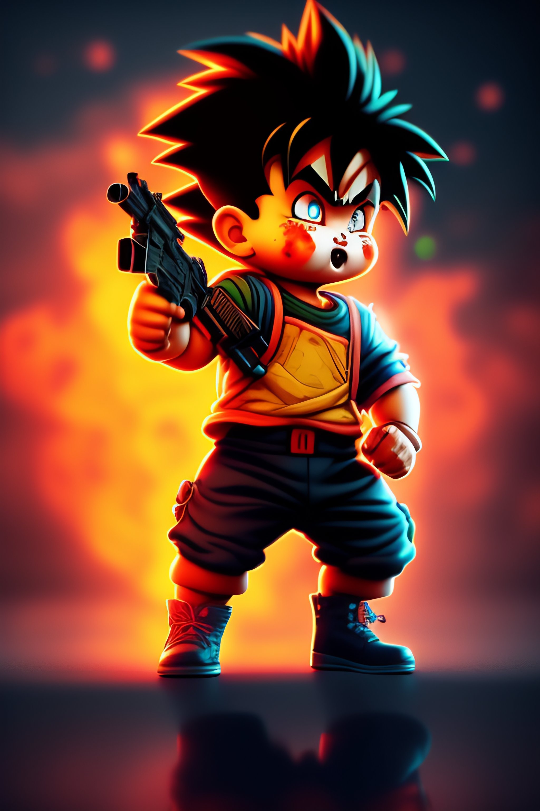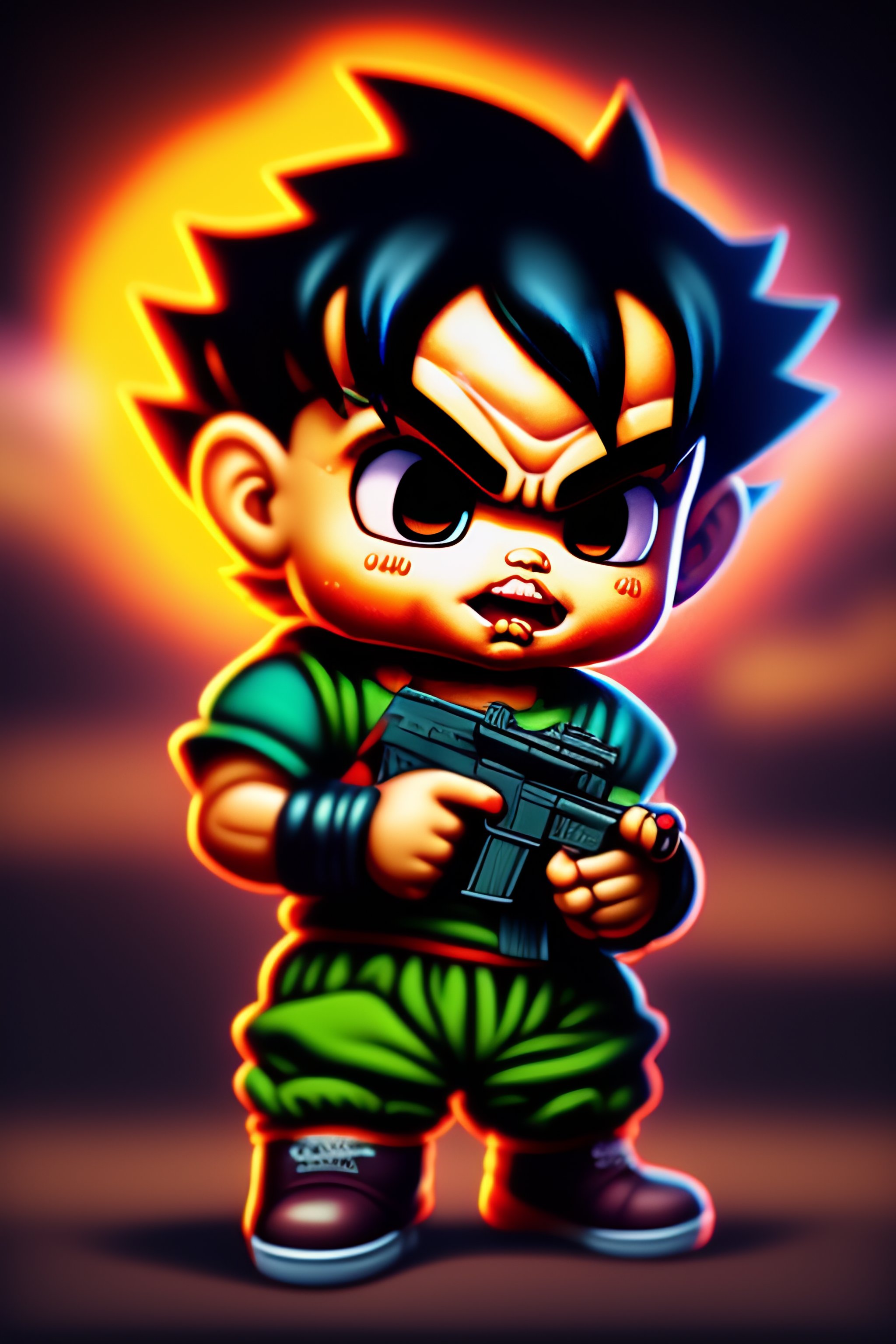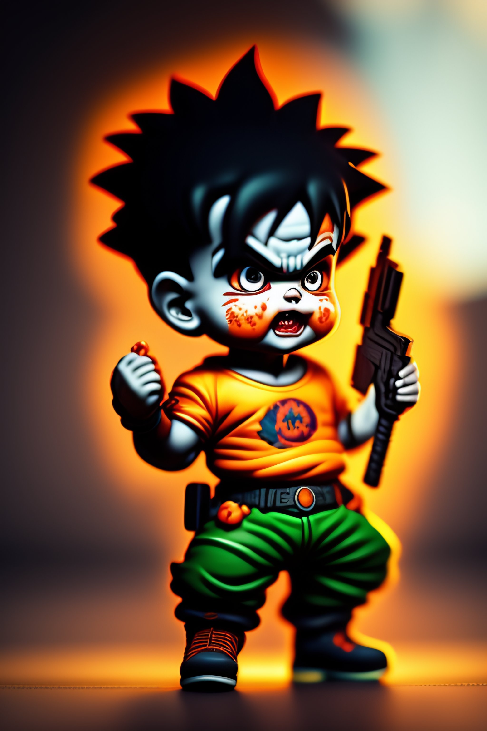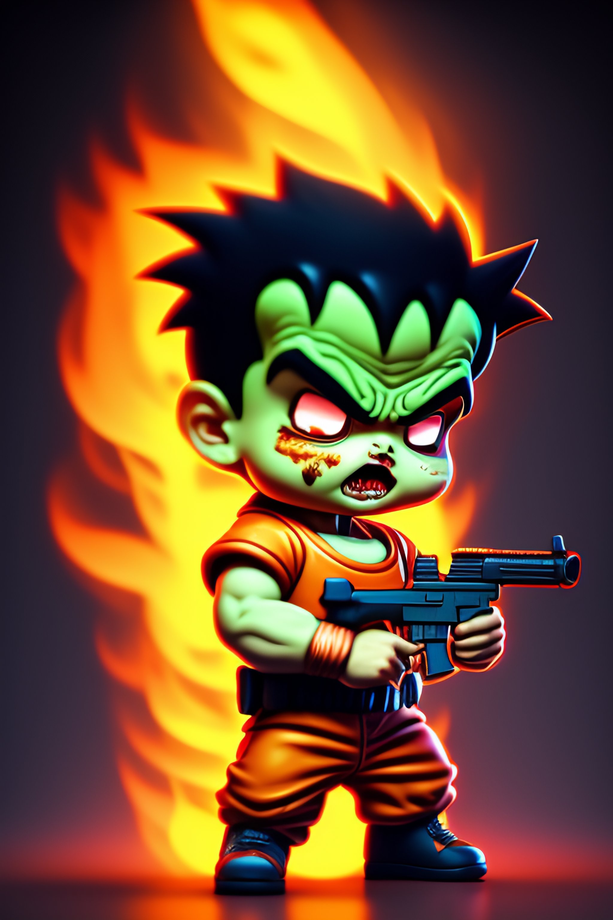 A zombie baby goku with a gun