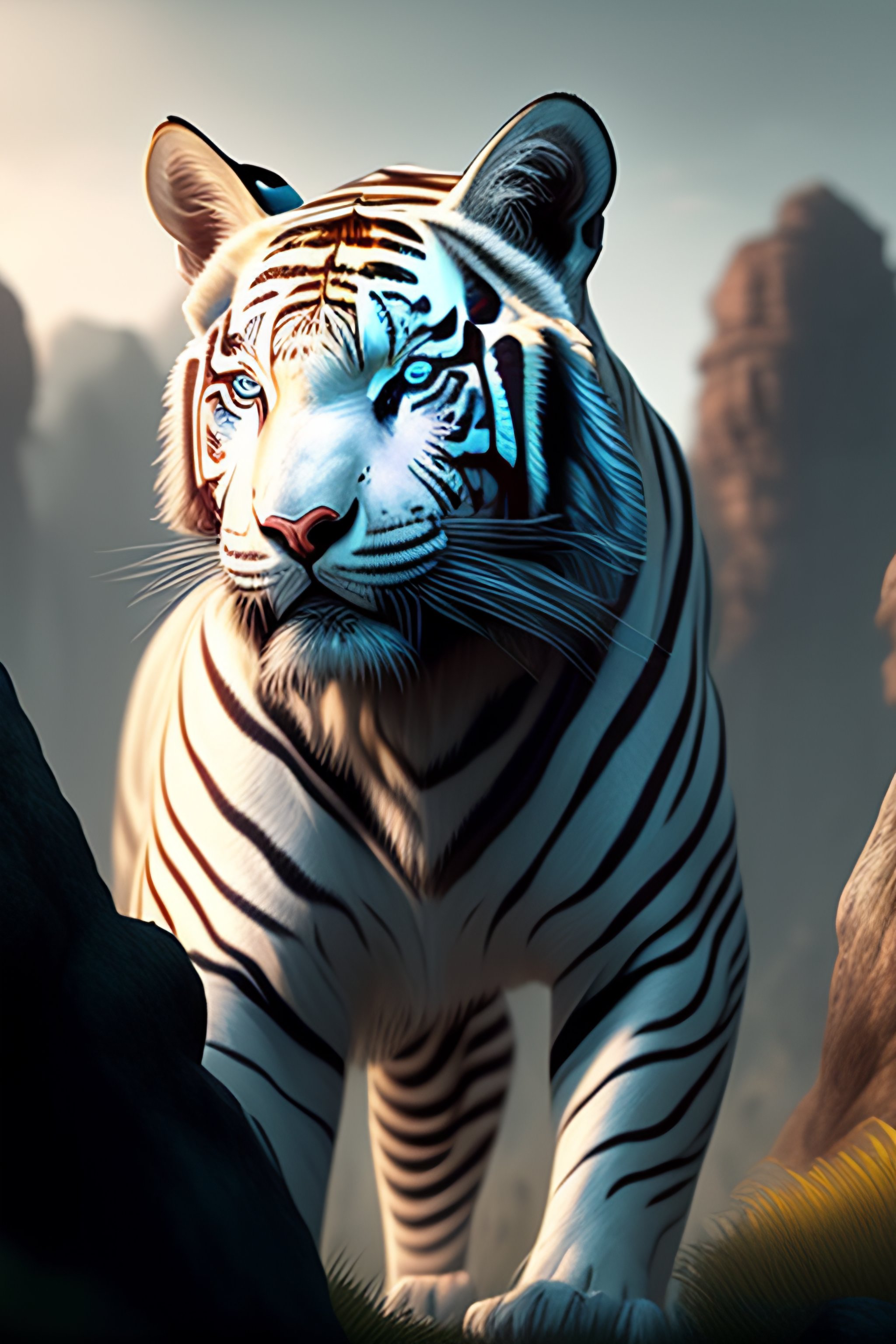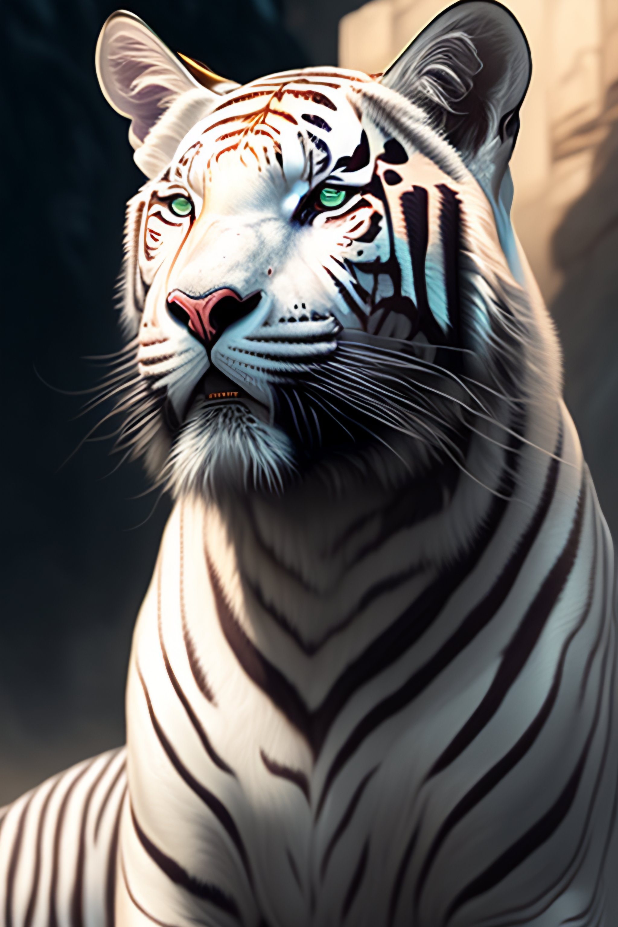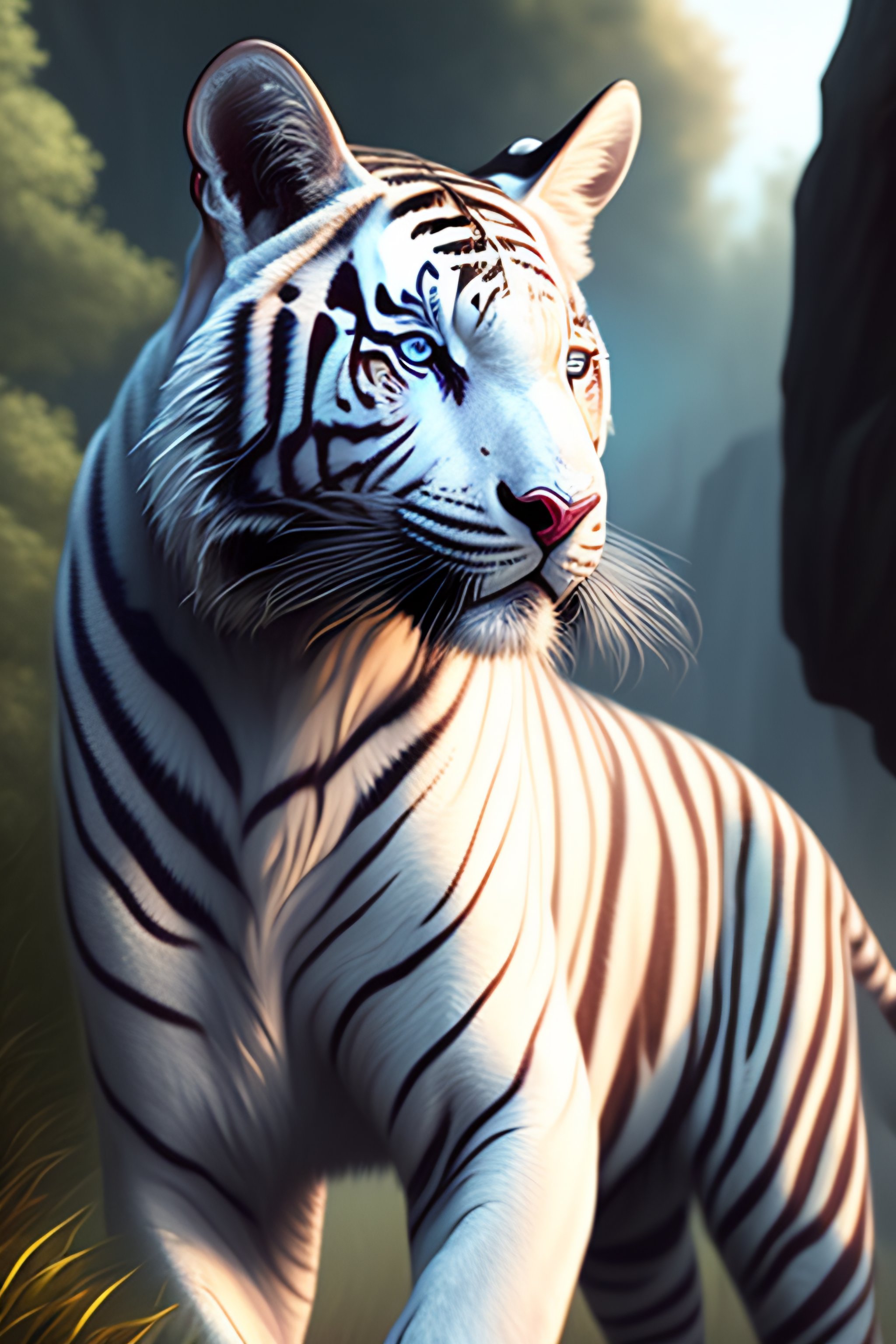 A white tiger, highly detailed face, full body, fantasy art, monster art, in the style of greg rutkowski, illustration, epic, fantasy, intricate, hyper detailed, artstation, concept art, smooth, sharp focus, ray tracing