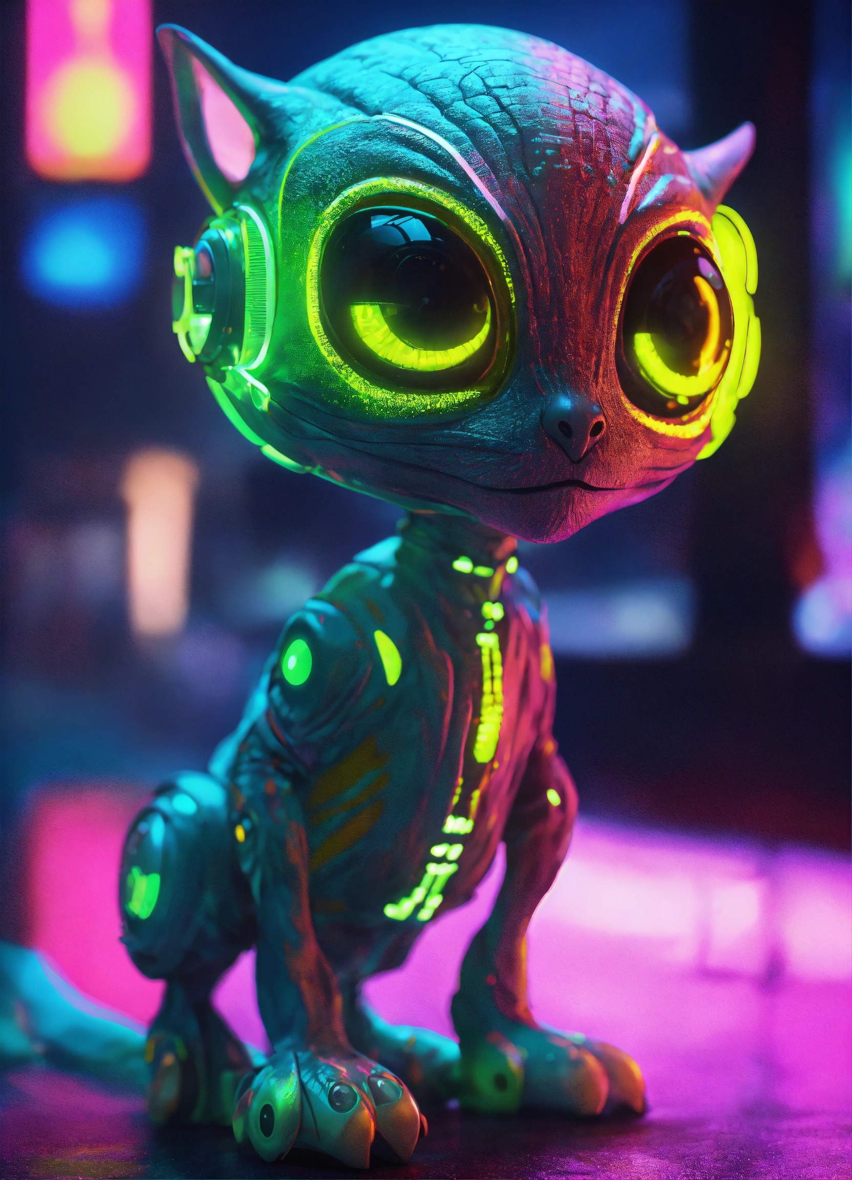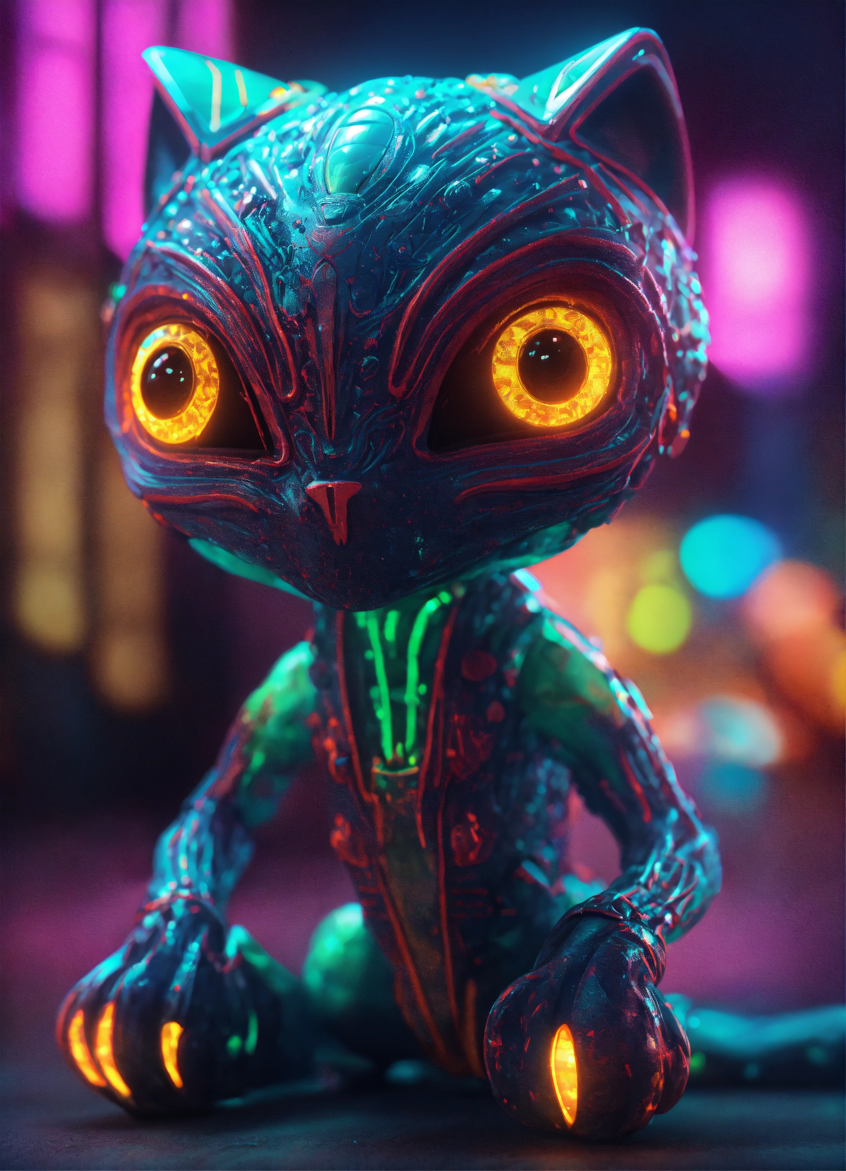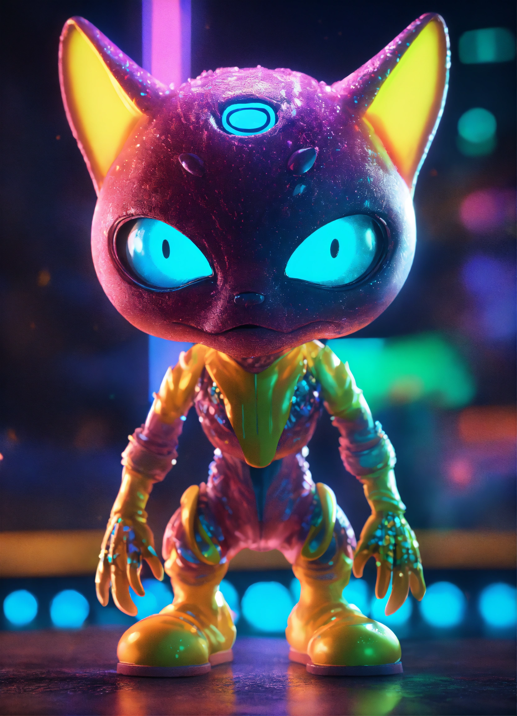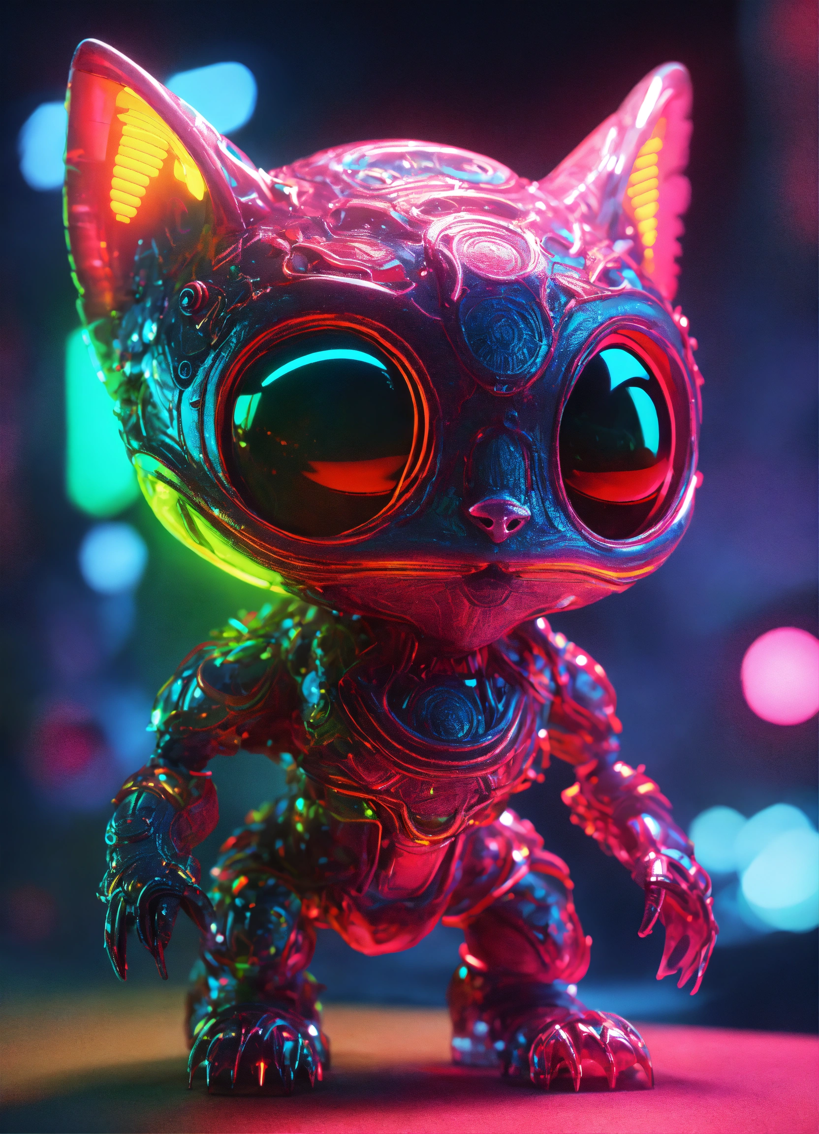 Gelly cute alien monster, full-body, neon glow colors, highly intricate details, 3d, cgi, realistic light, trending on cgsociety, glowing eyes, facing camera, neon details, ultra realistic details, portrait, sci fi atmosphere, global illumination, shadows, octane render, 8 k, ultra sharp, cat mutation