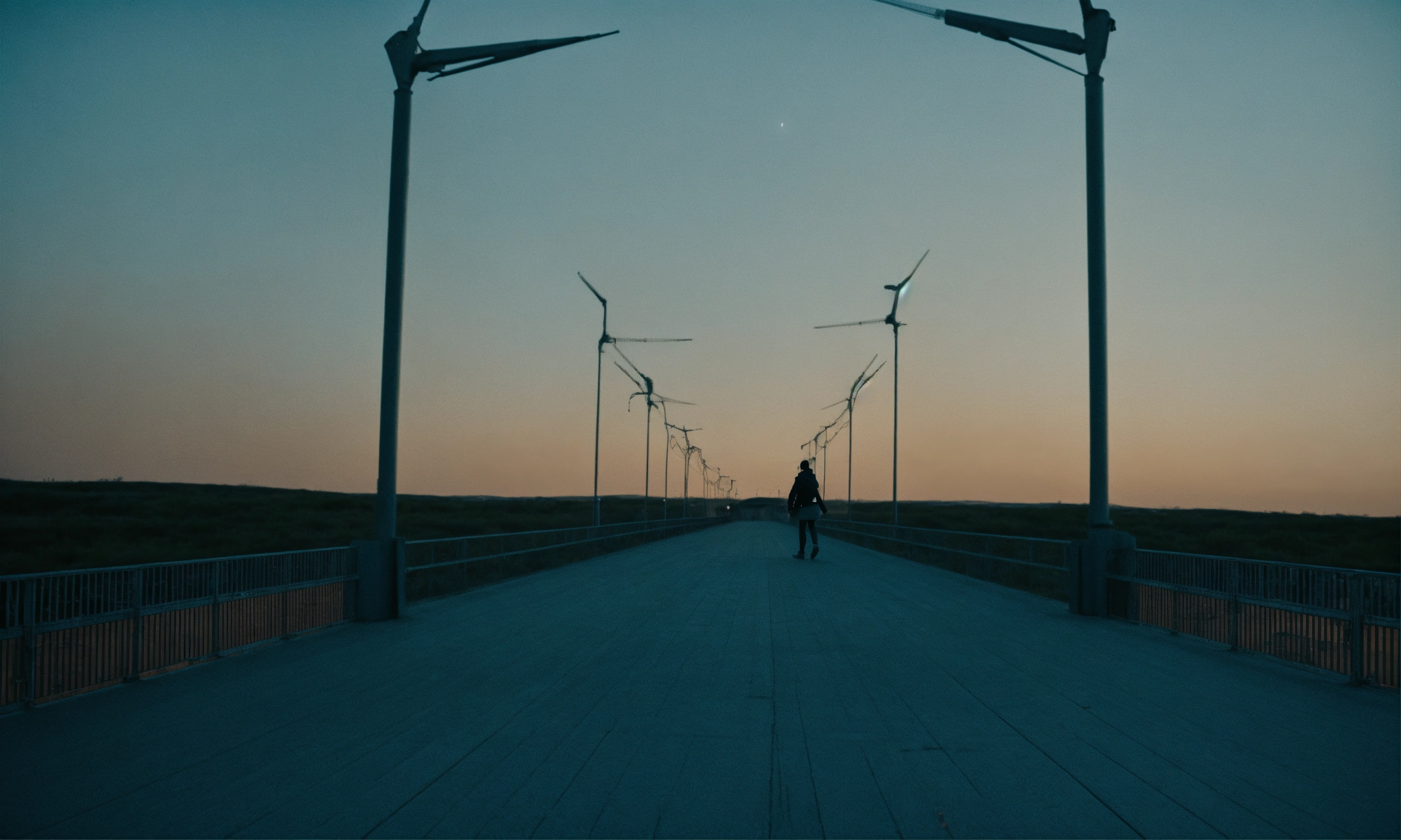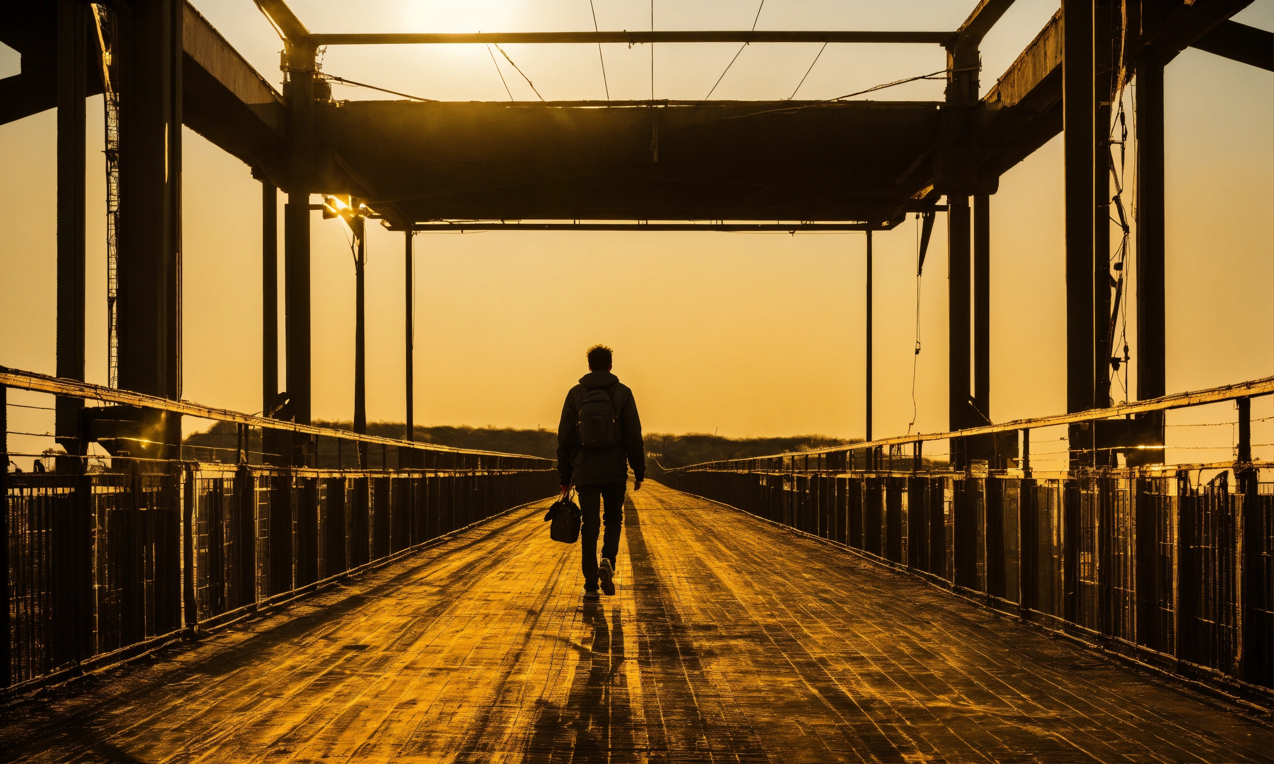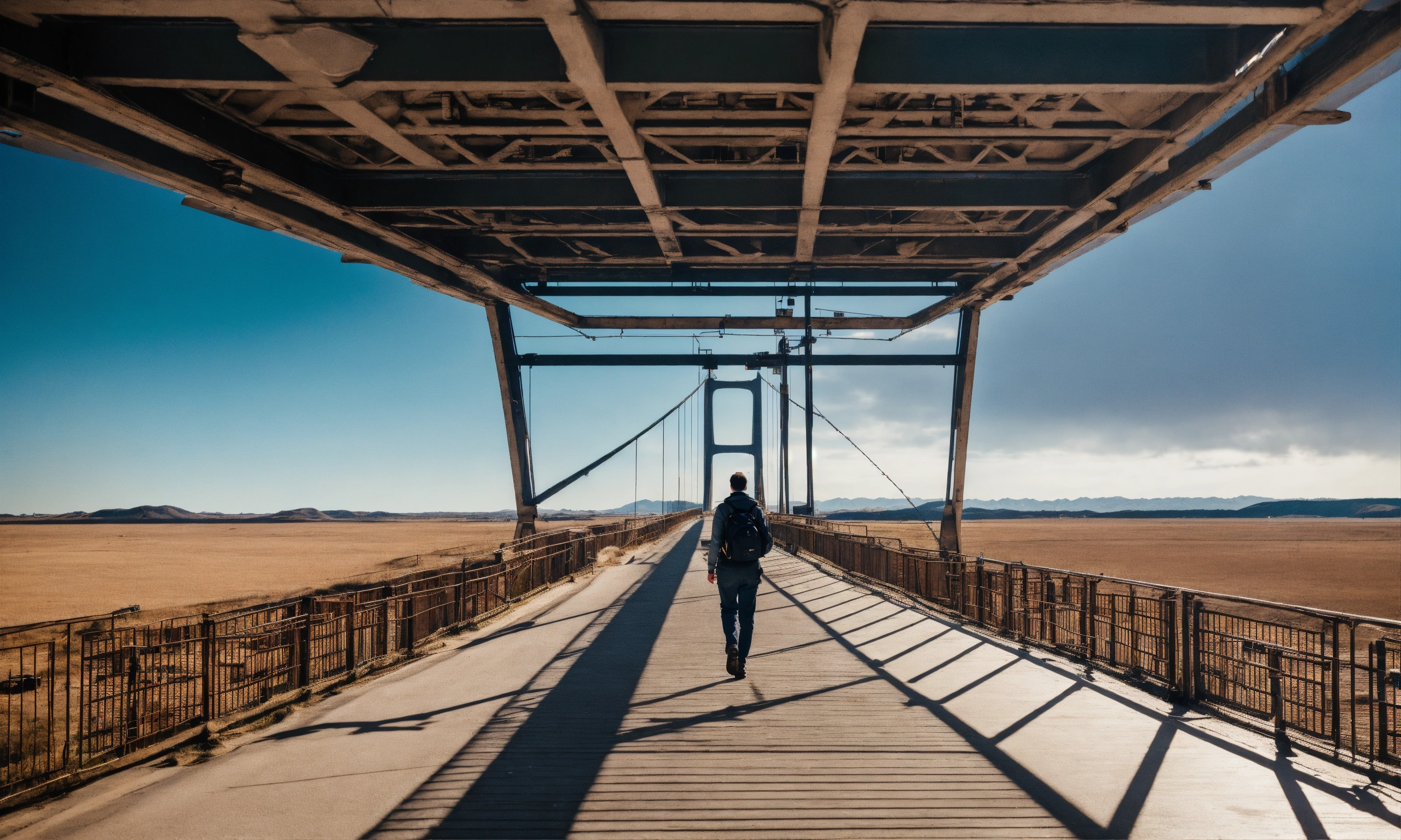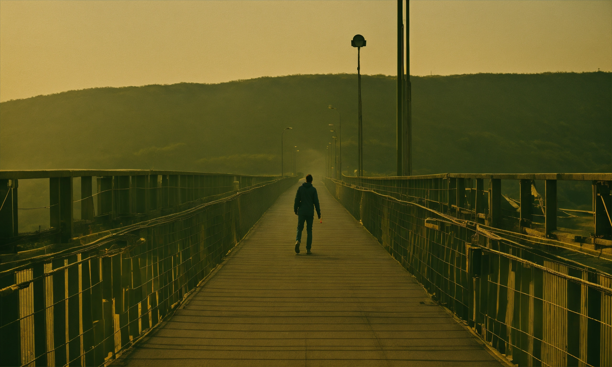 A space sout wearing person walking on deserted bridge, the bridge is asymetrcial, the camera is behind the person