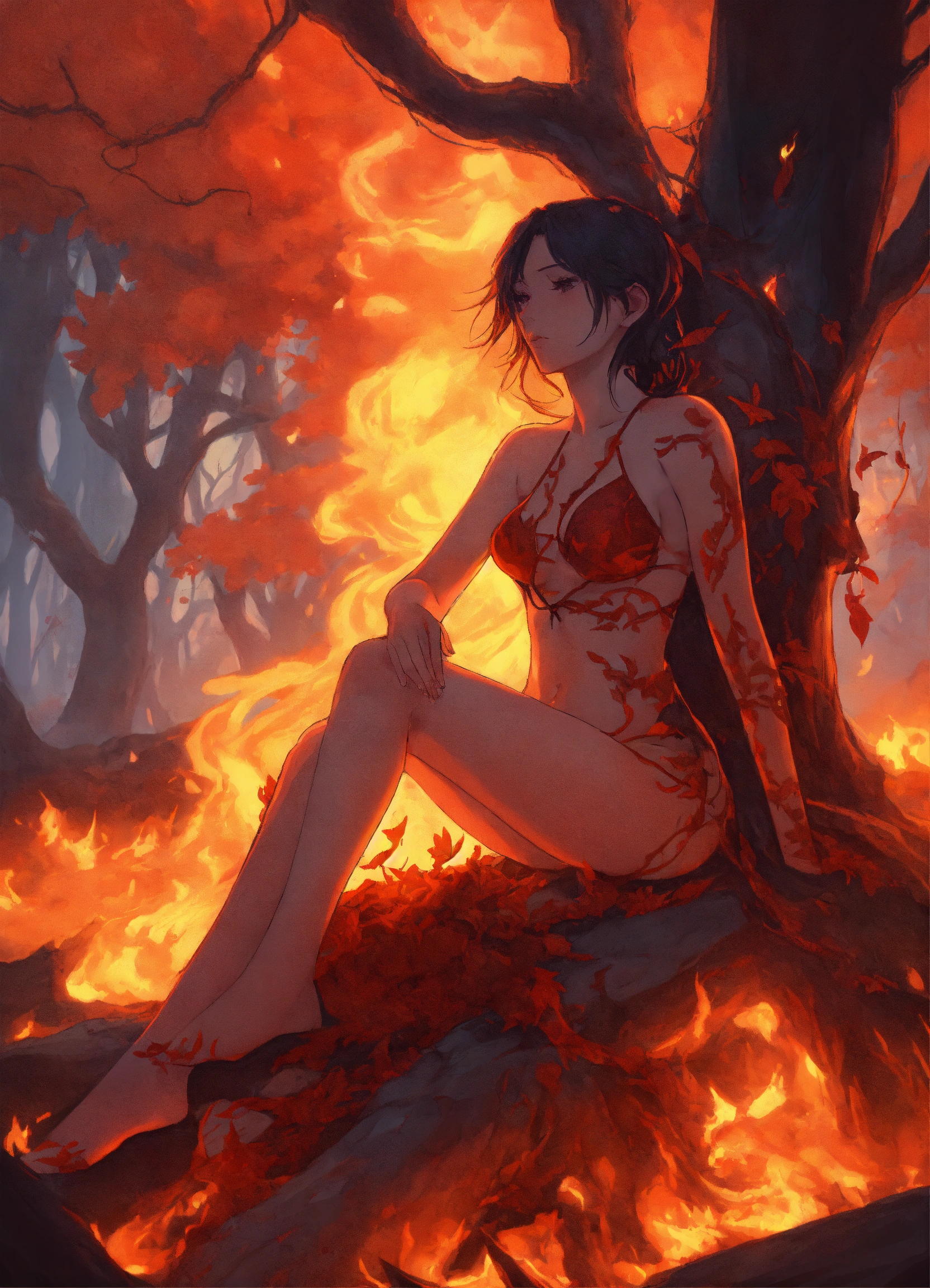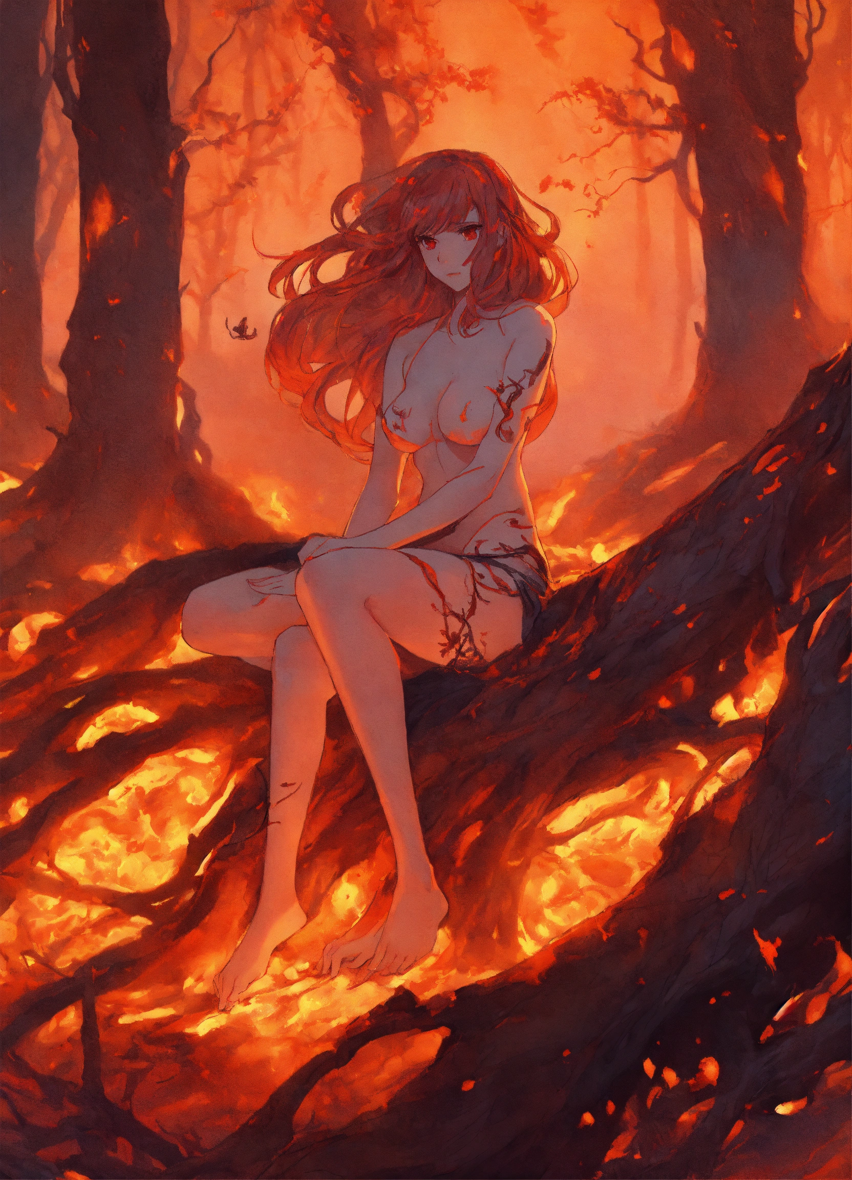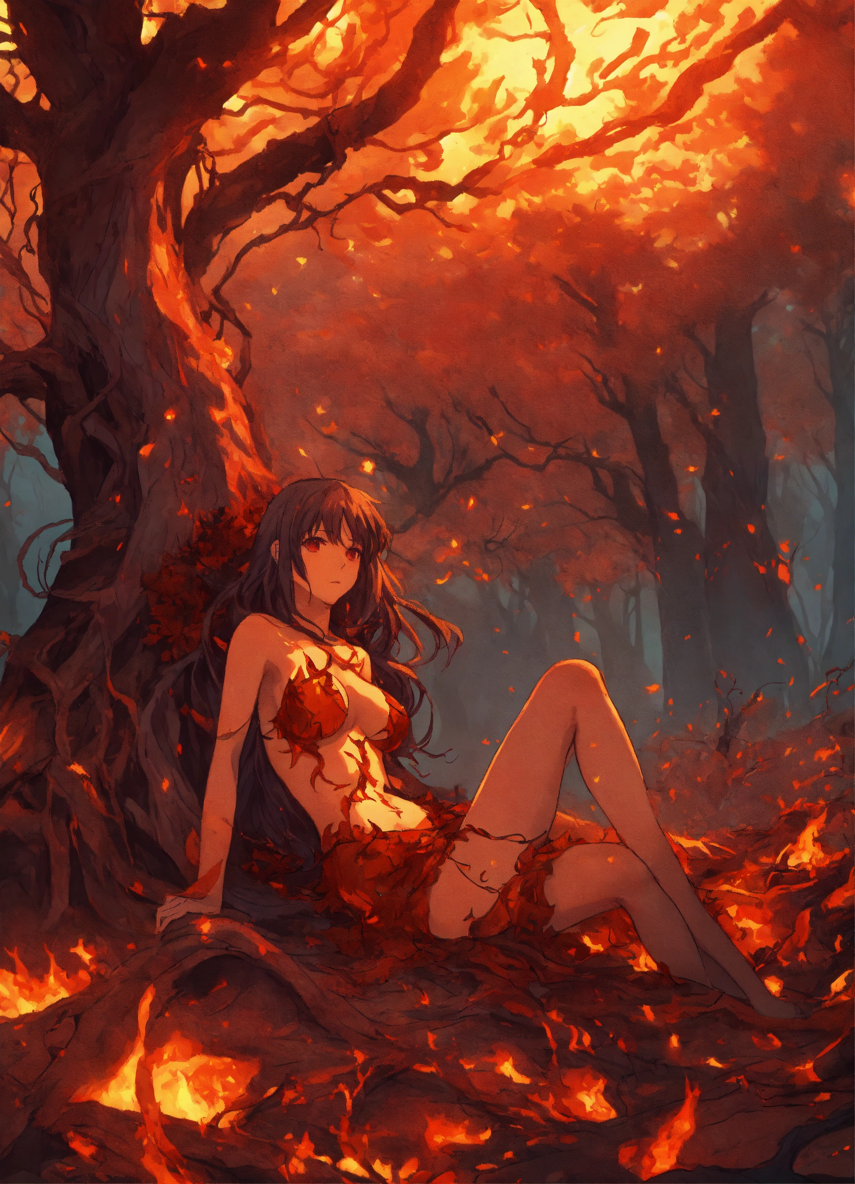 A beautiful, barely dressed woman reclining against a tree in a burning forest, her few bits of clothing the fiery vines extending from the ground, demons all around her among the remains of the trees, drawn in an anime like style