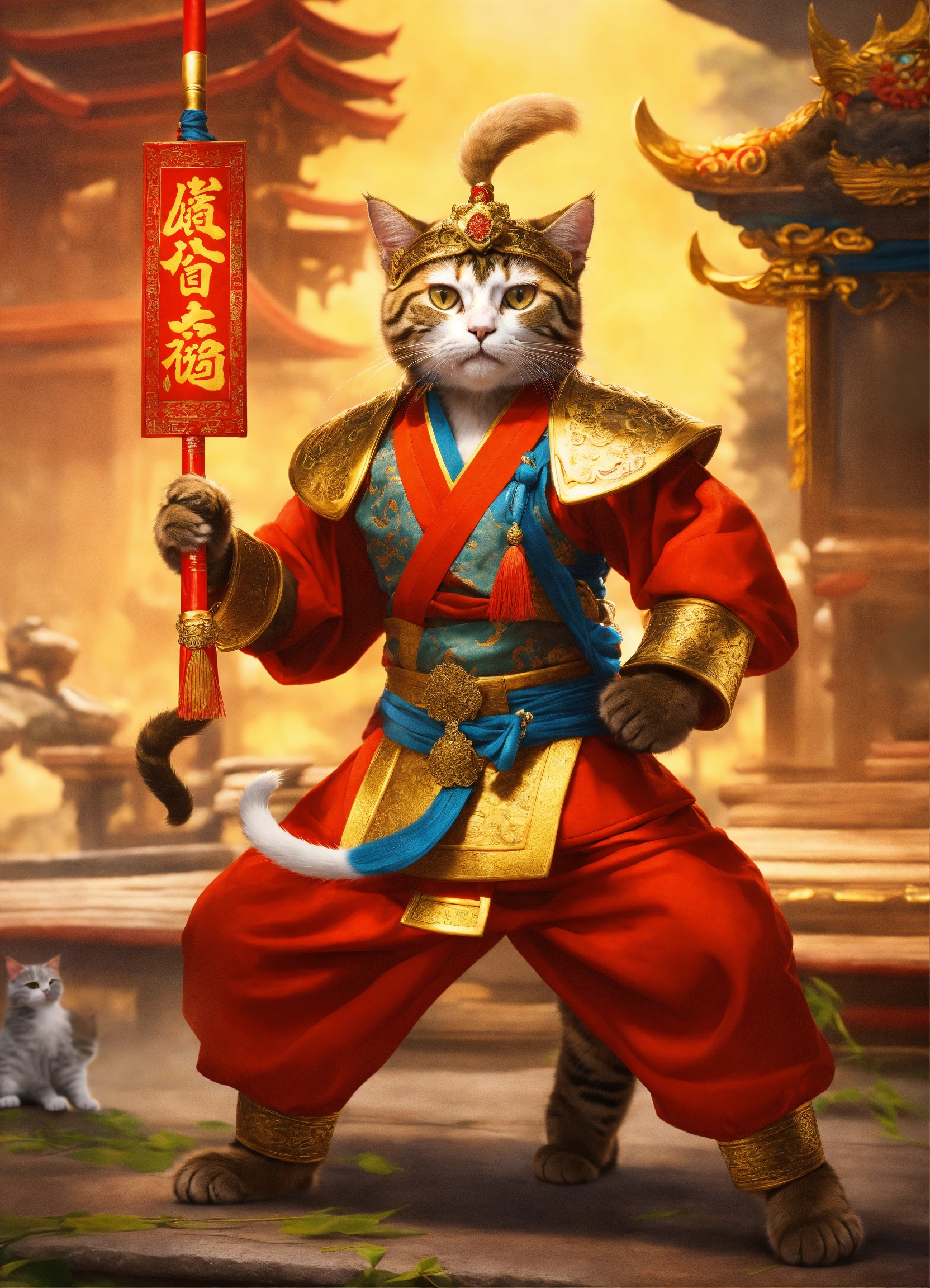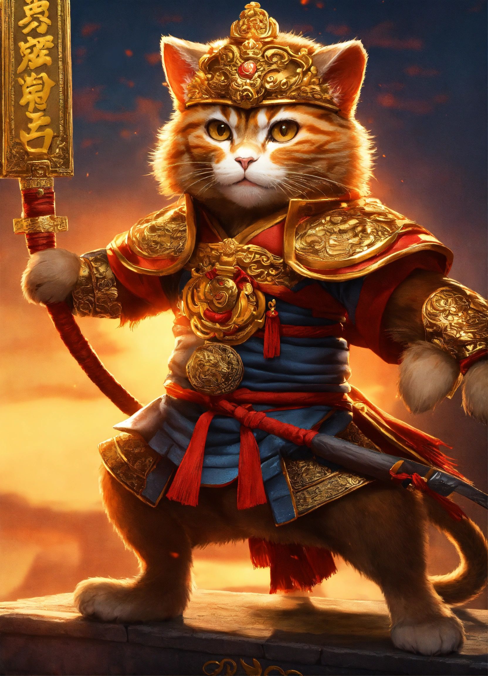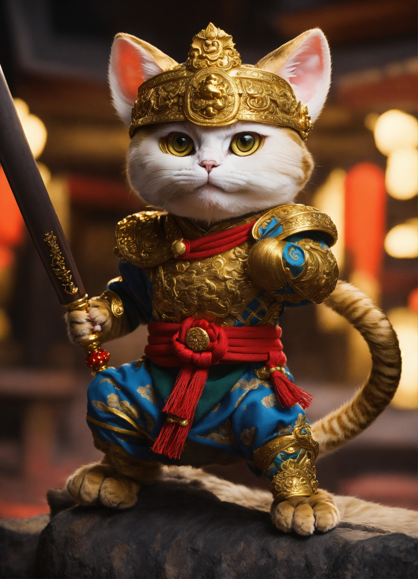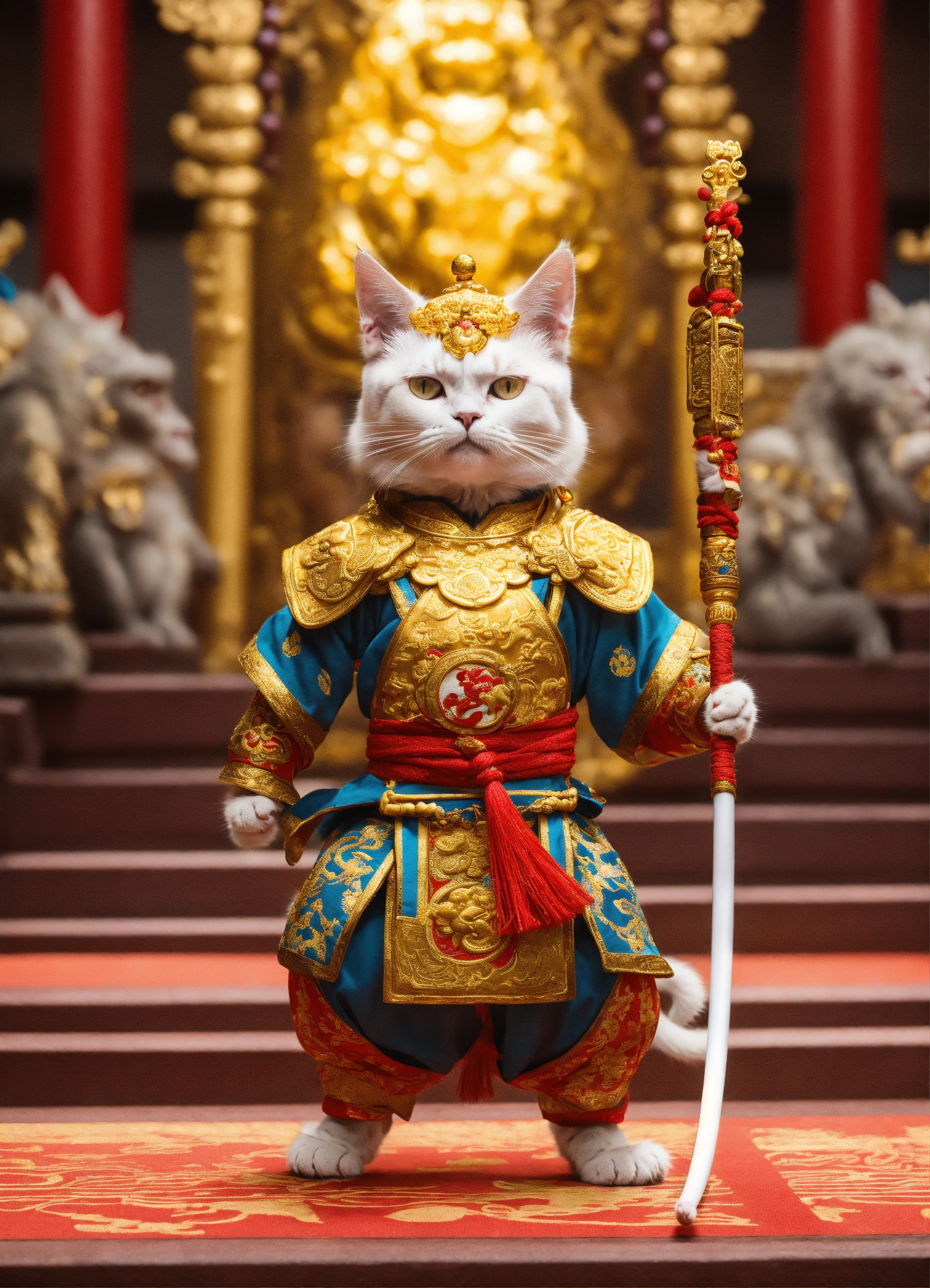 The monkey king cat mischievous and mighty this cat takes on the mantle of the monkey king, donning the iconic golden headband and wielding the ruyi jingu bang. its mischievous yet mighty presence captures the essence of the legendary character.